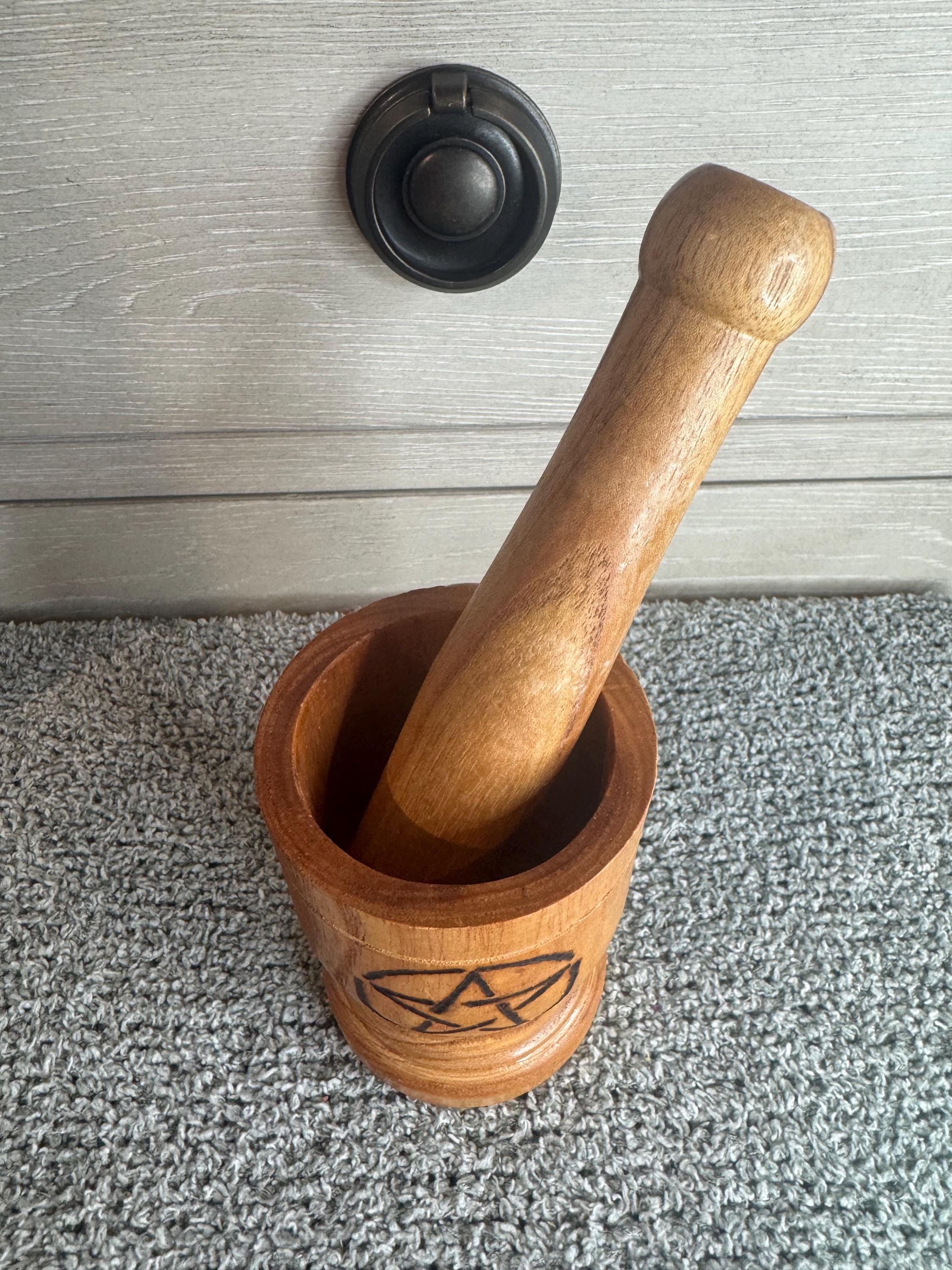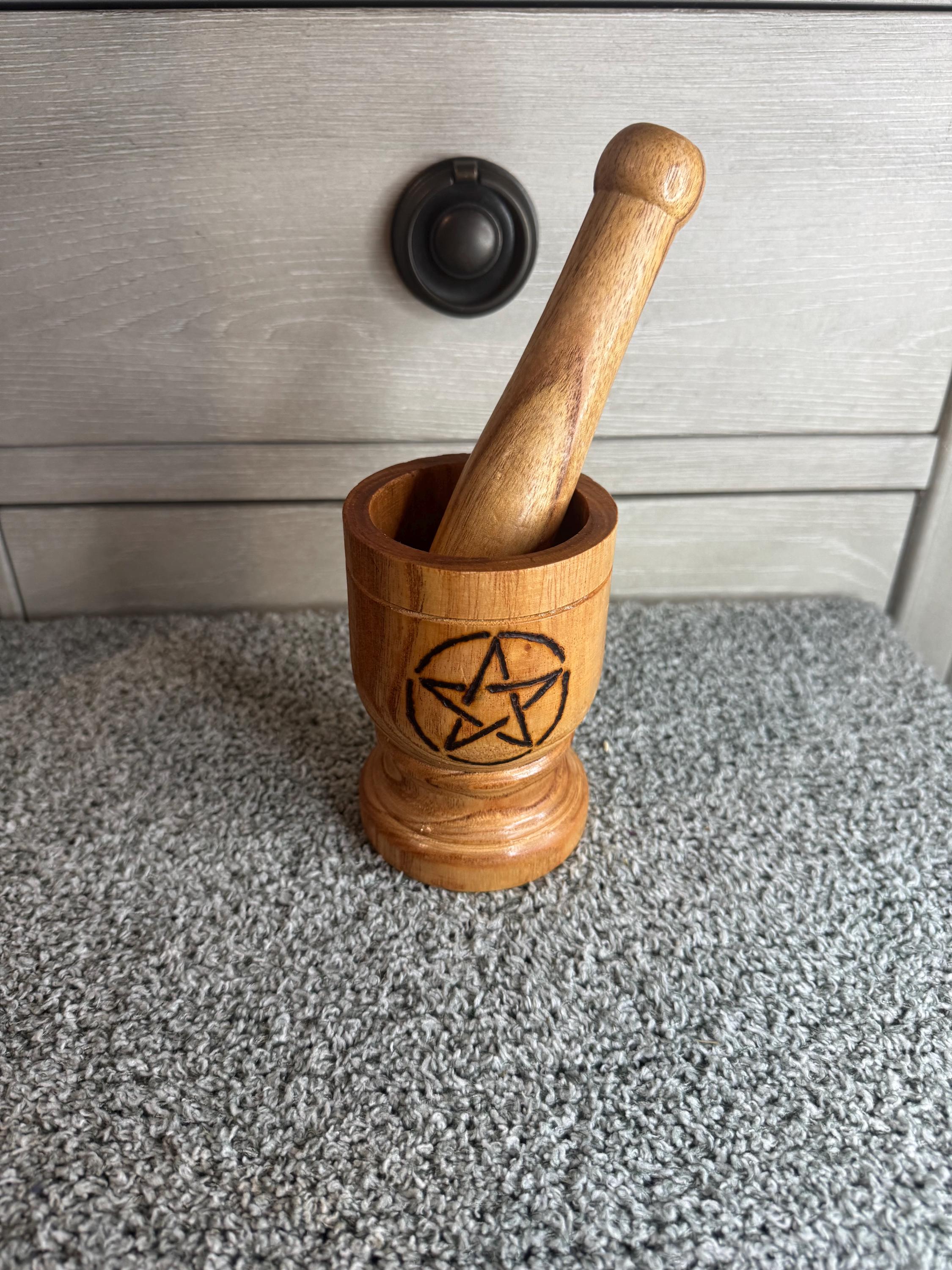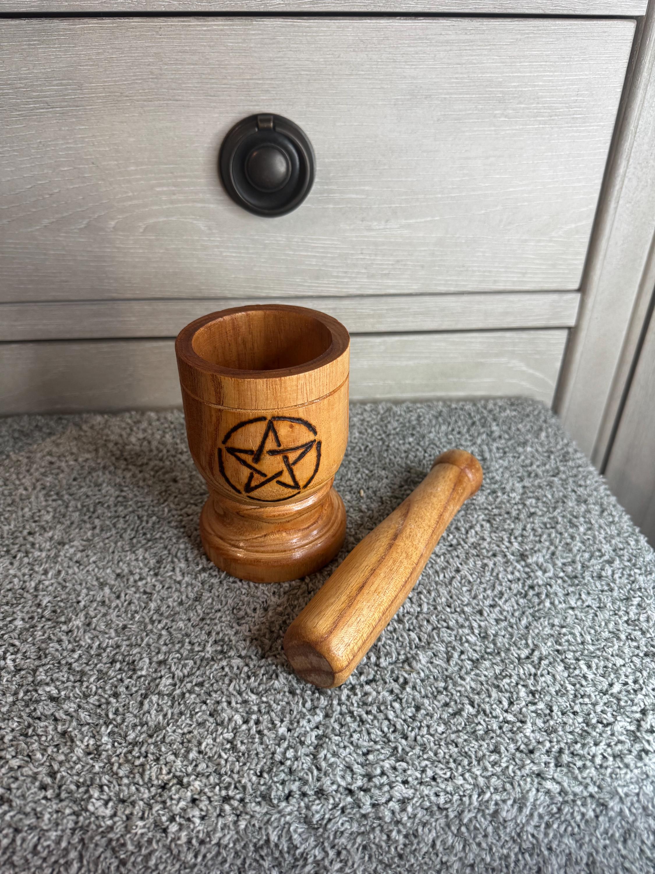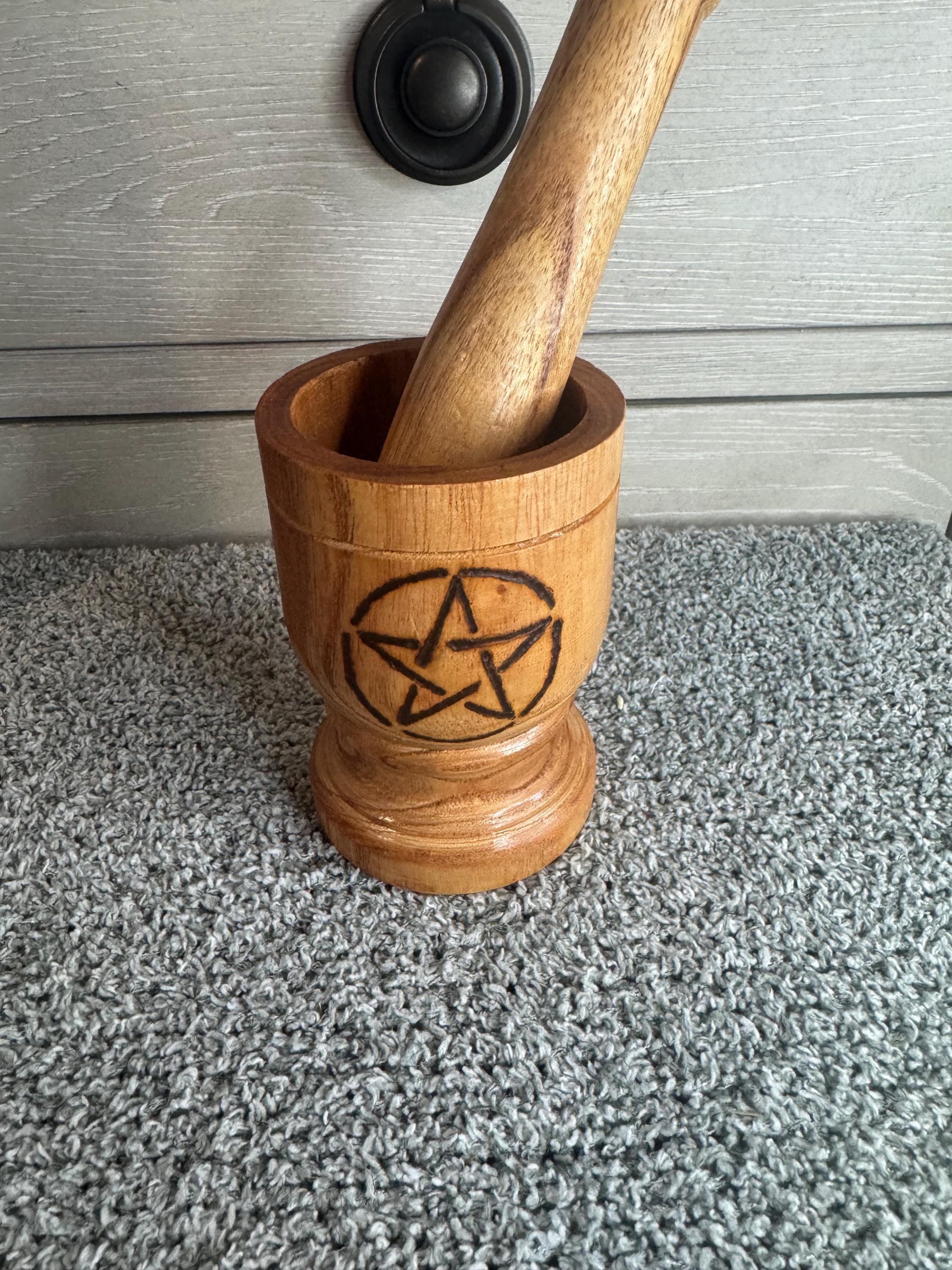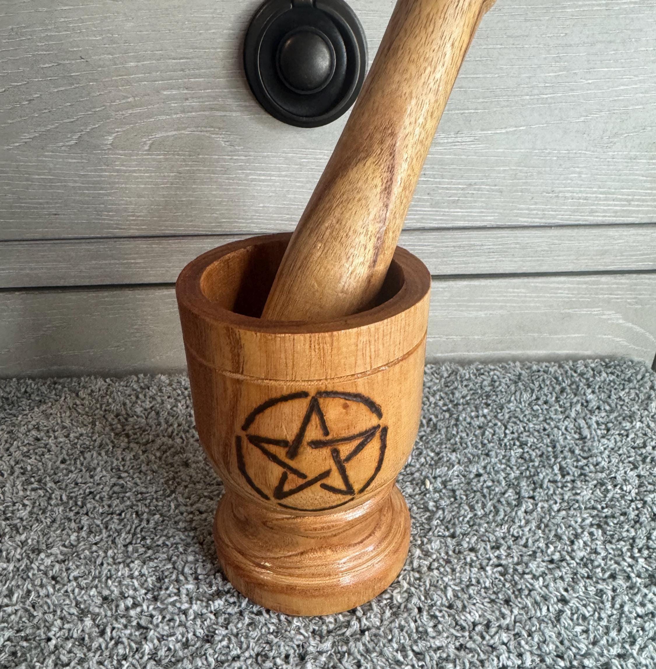 Wooden Mortar & Pestle Set with a Pentagram design on the front. Mortar and pestle sets are used for grinding spices, herbs, and other ingredients. This wooden mortar & pestle set is compact and adaptable measuring 3.5" in diameter, this mortar & pestle offers the perfect size for various food preparations, with a comfortable pestle included for easy operation. Crafted from natural polished wood, it combines beauty and functionality with a classic look. Great for dried herbs. Blessed Be!