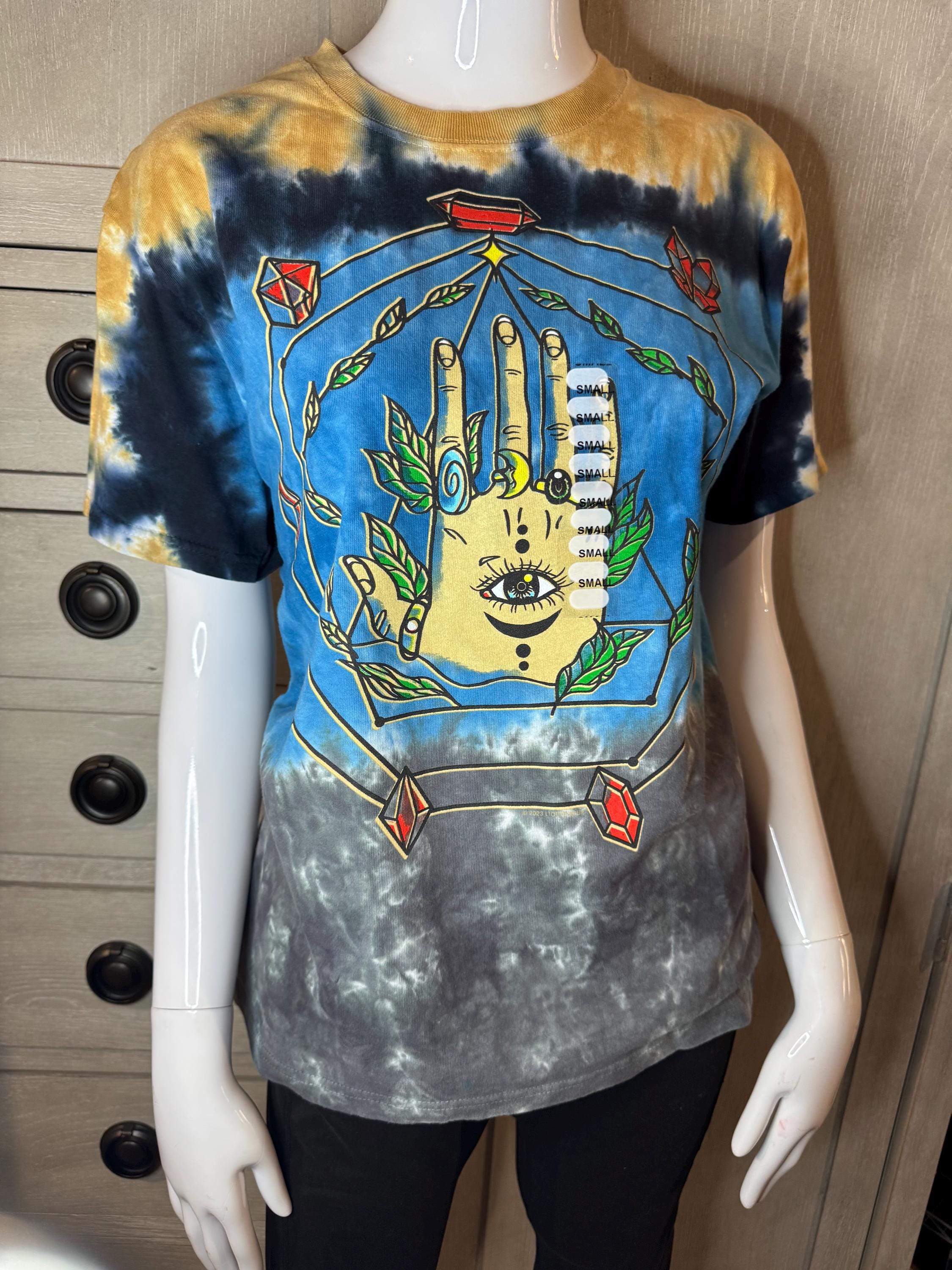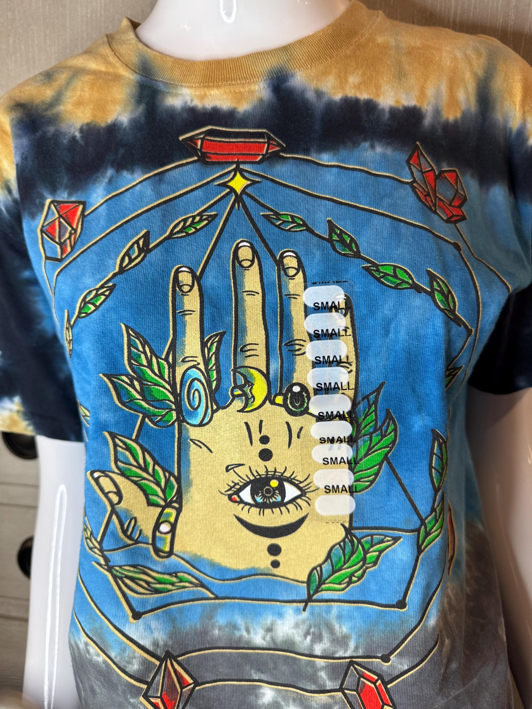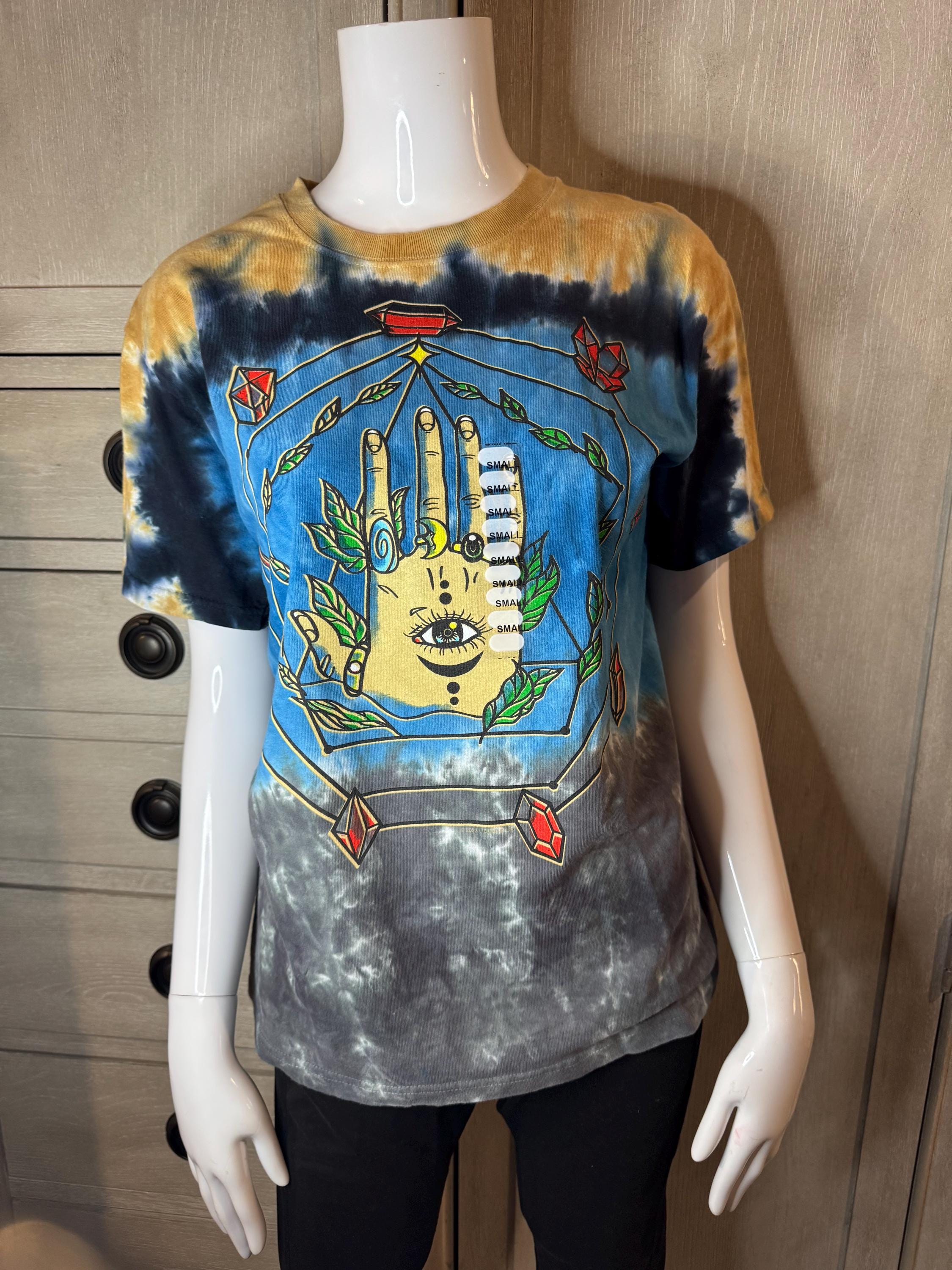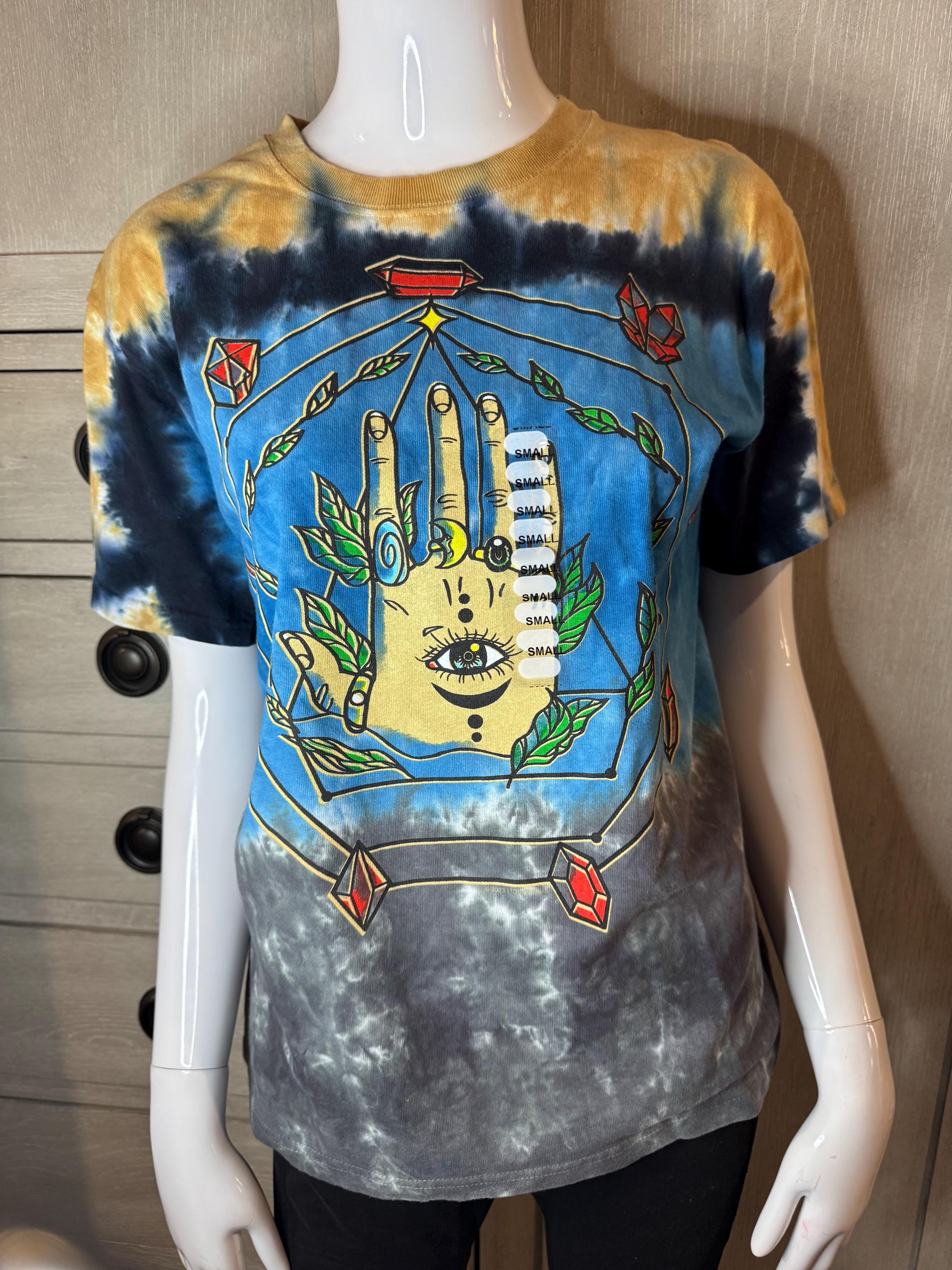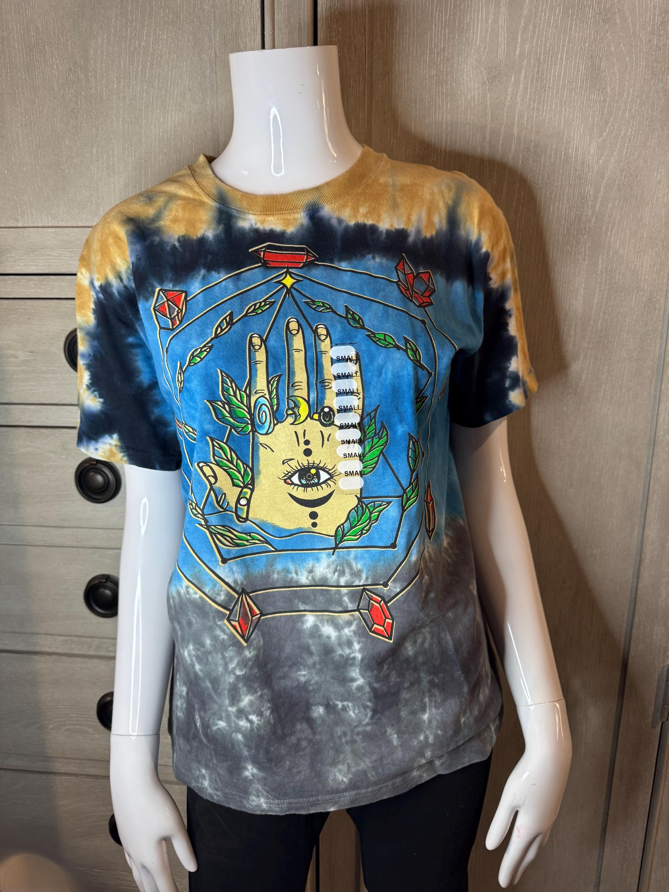 NEW Earthbound Size Small Tye Dye T-Shirt. Short Sleeve, round neck, and colors are gray, blue, dark blue, and gold tye dye.