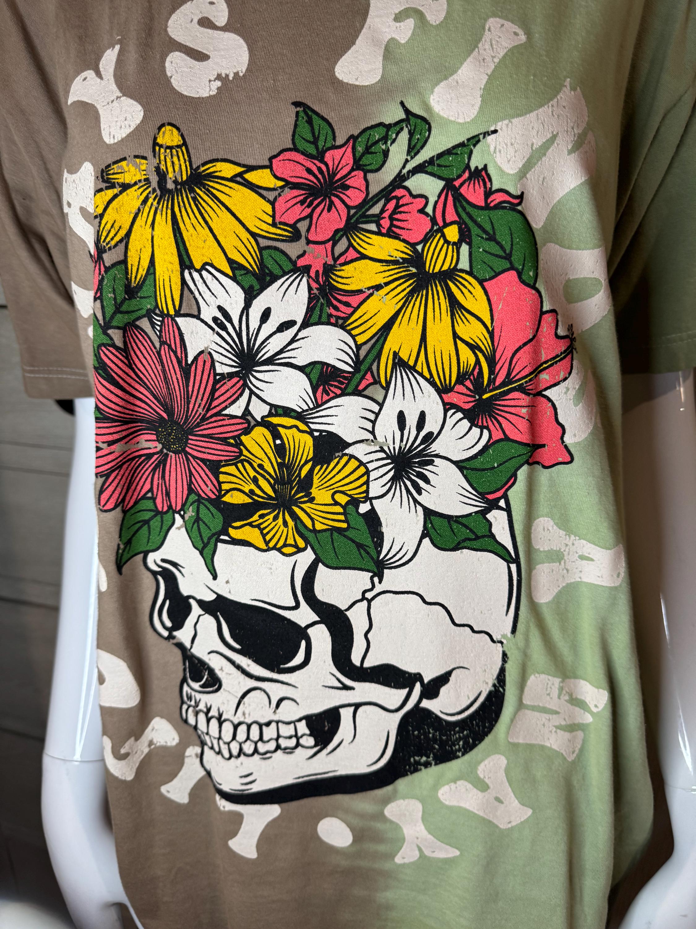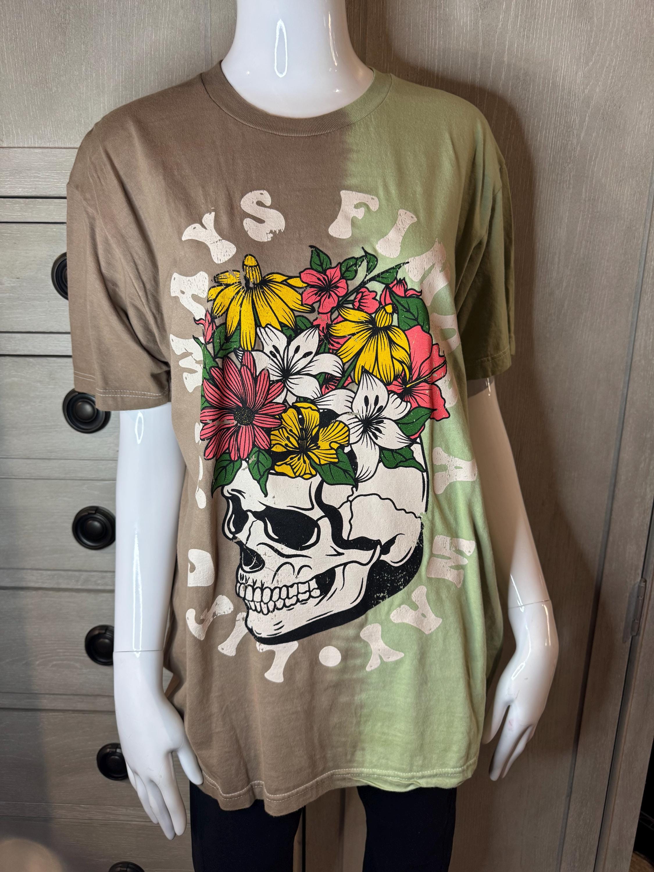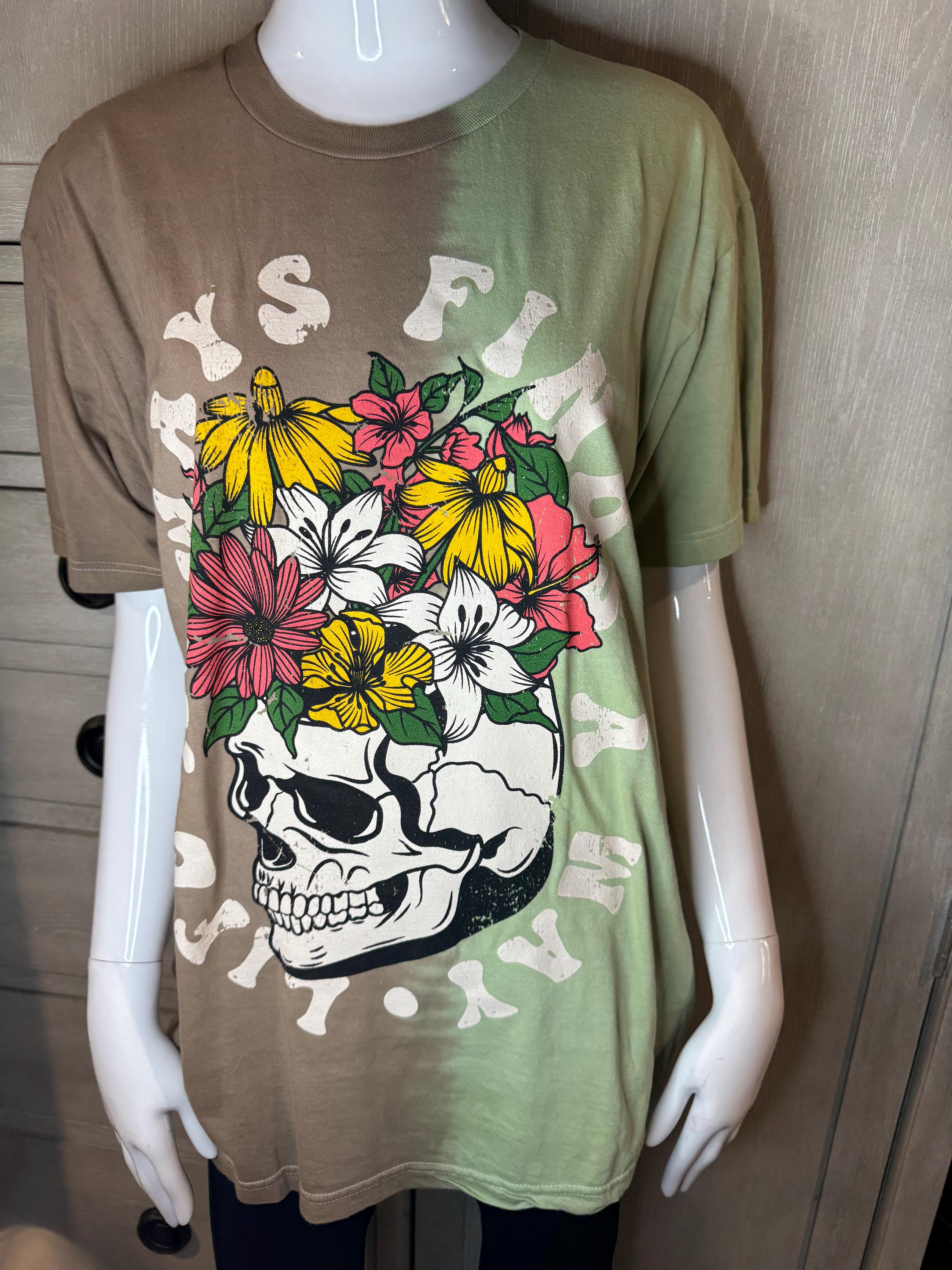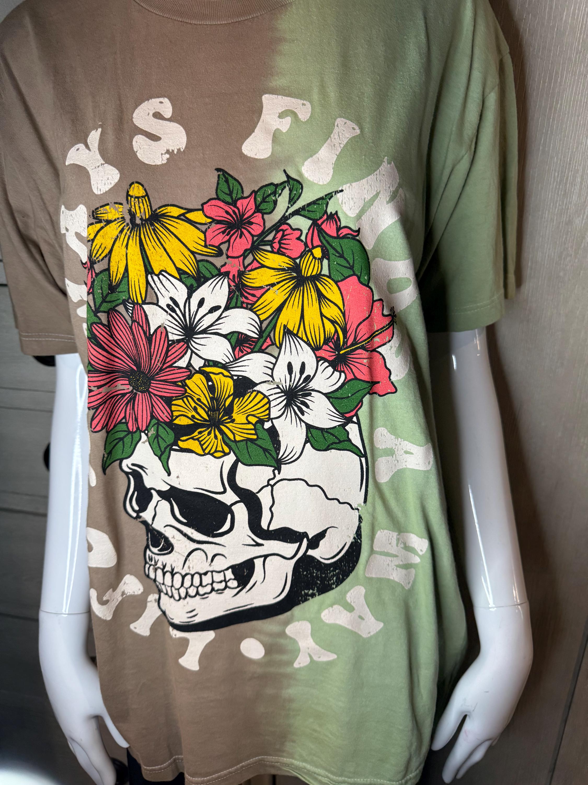 Women's Size Medium Tye Dye Earthbound T-Shirt. Round neckline, short sleeves, says "Live Always Finds A Way, and has a skull with flowers, and is tan and light green tye dye. NEW 100% Cotton.