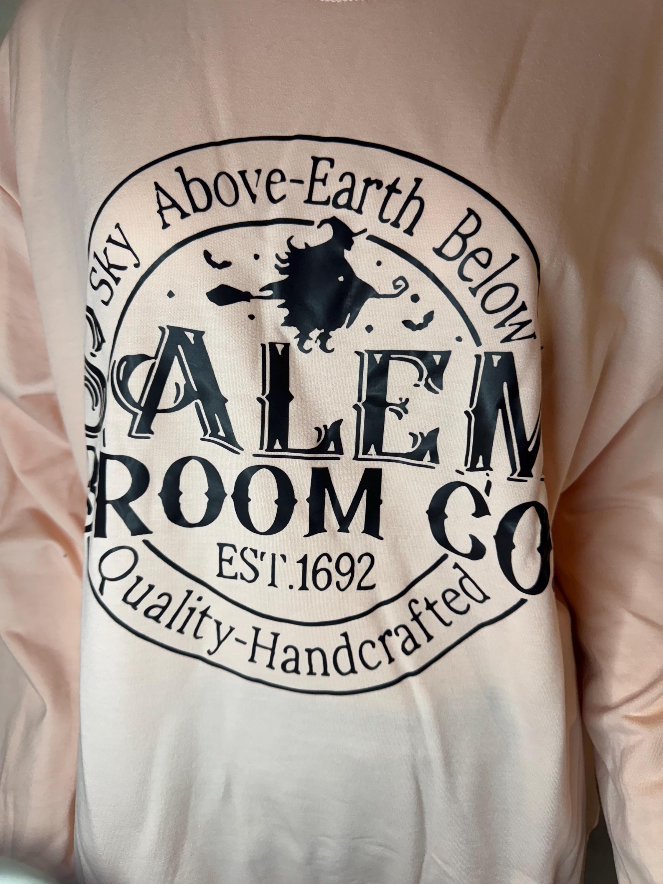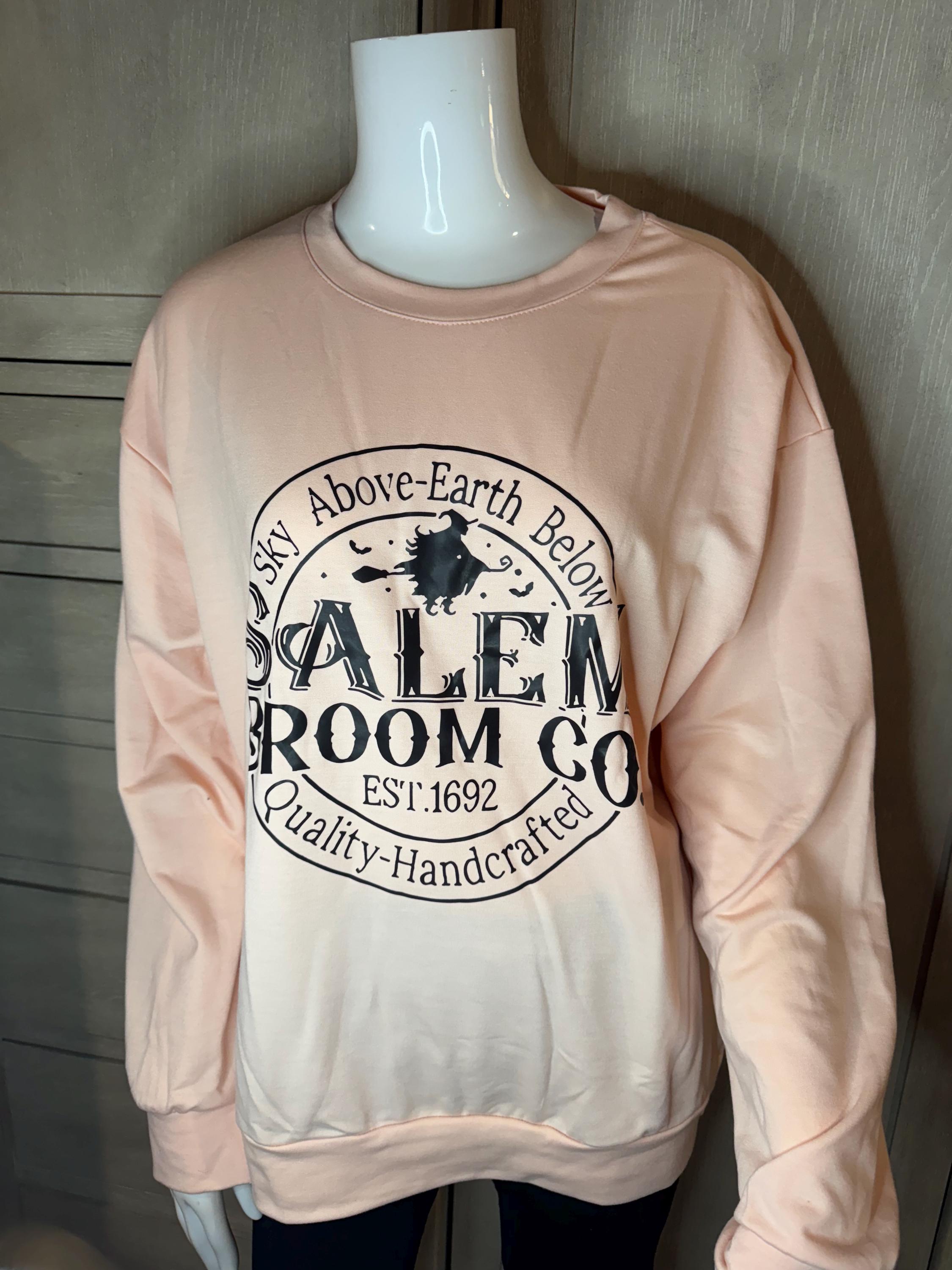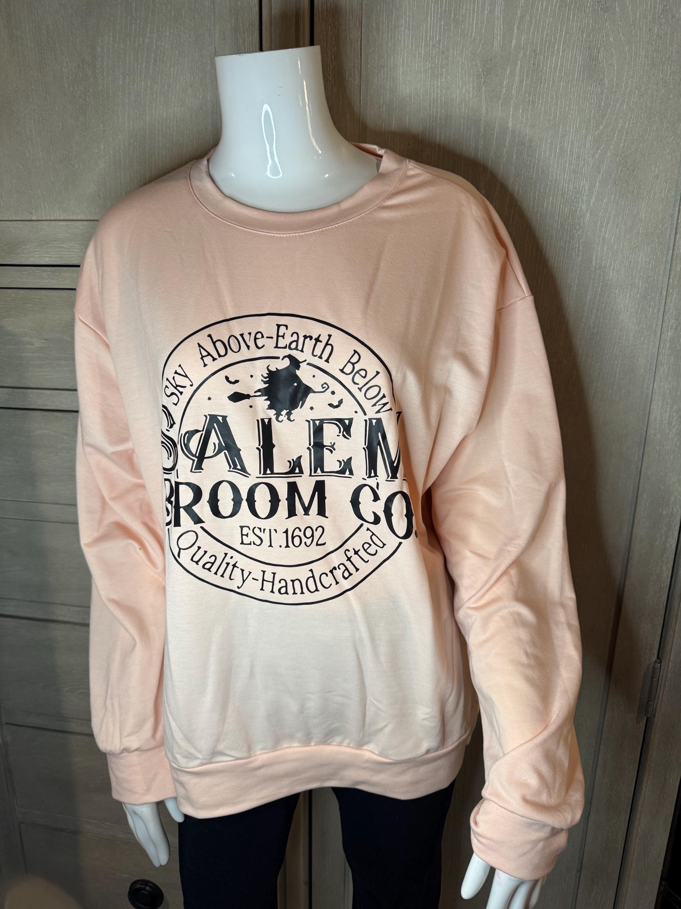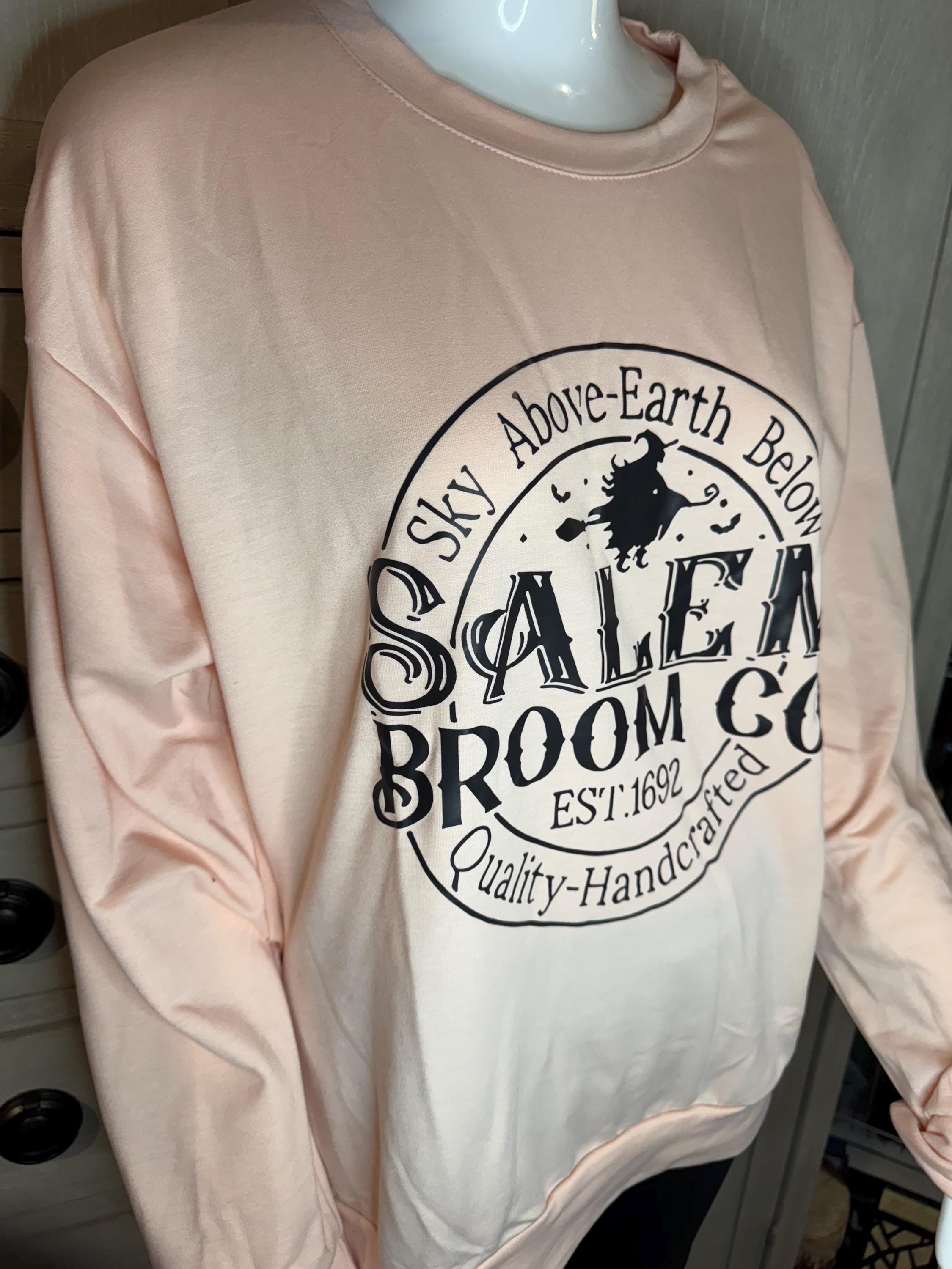 Womens Long Sleeve Peach Color Sweatshirt, round neckline, long sleeve, Says Sky Above-Earth Below Salem Broom Co. in black letters. NEW 100% Polyester.
