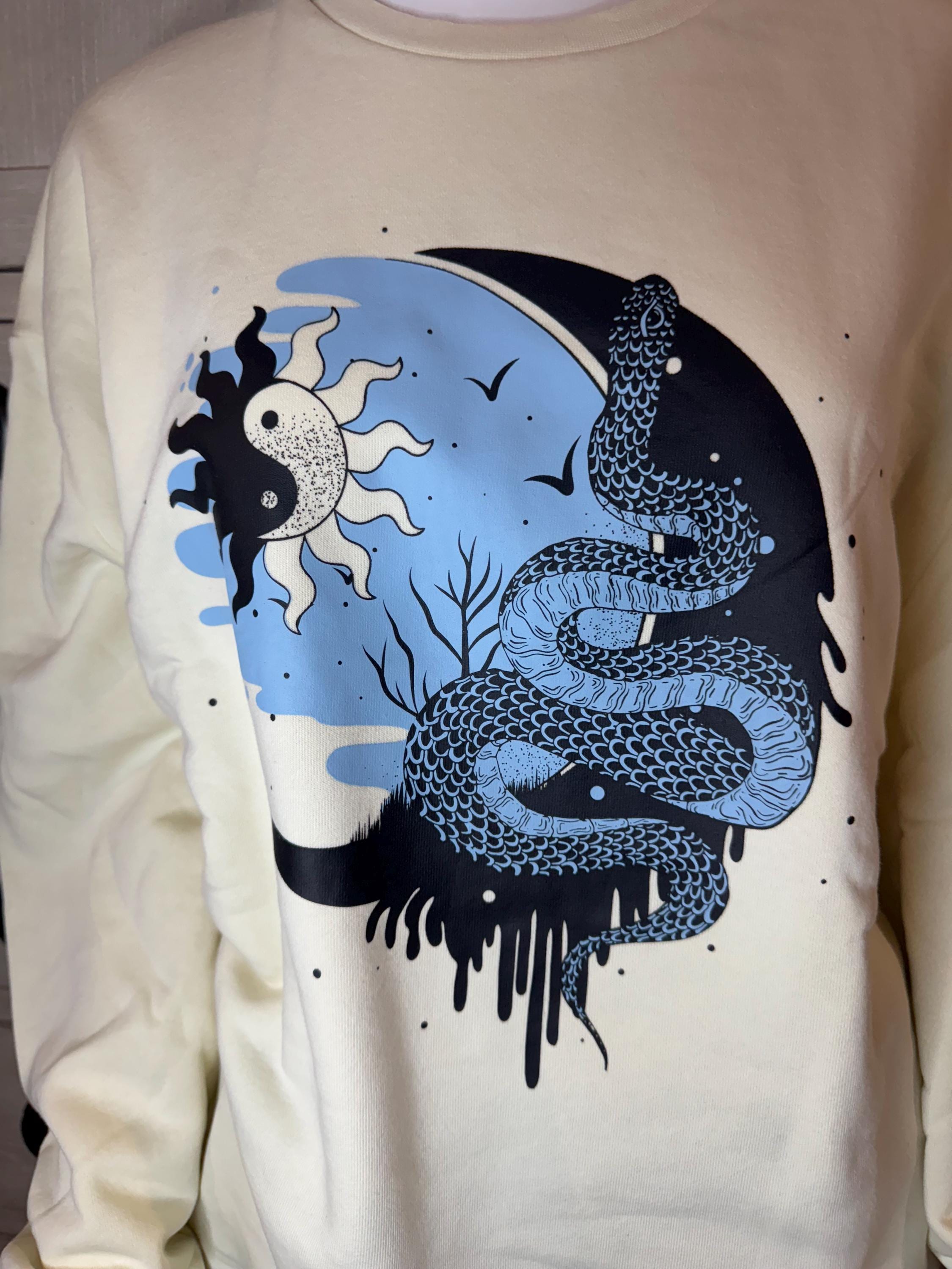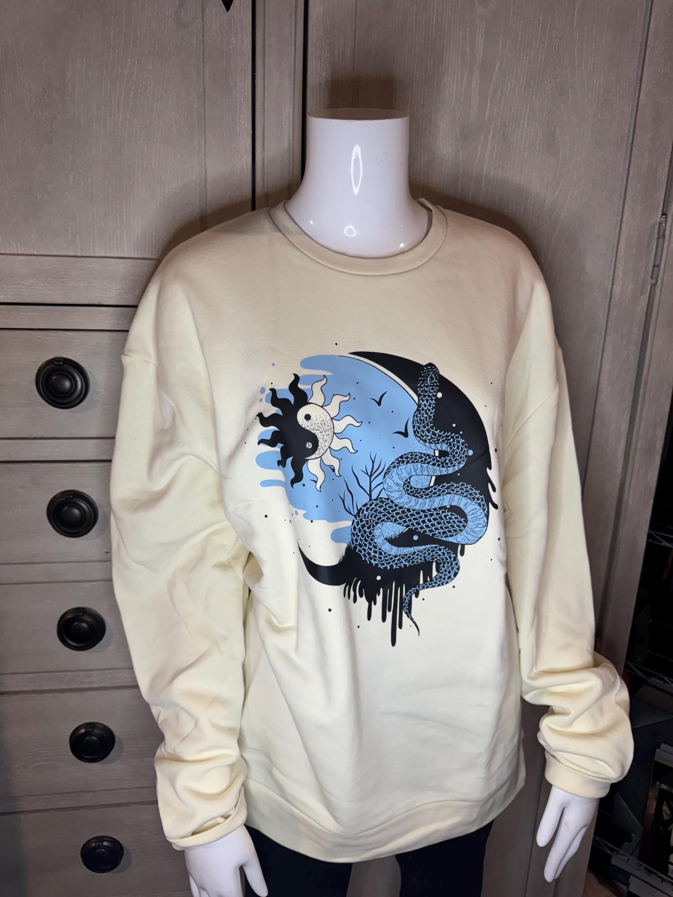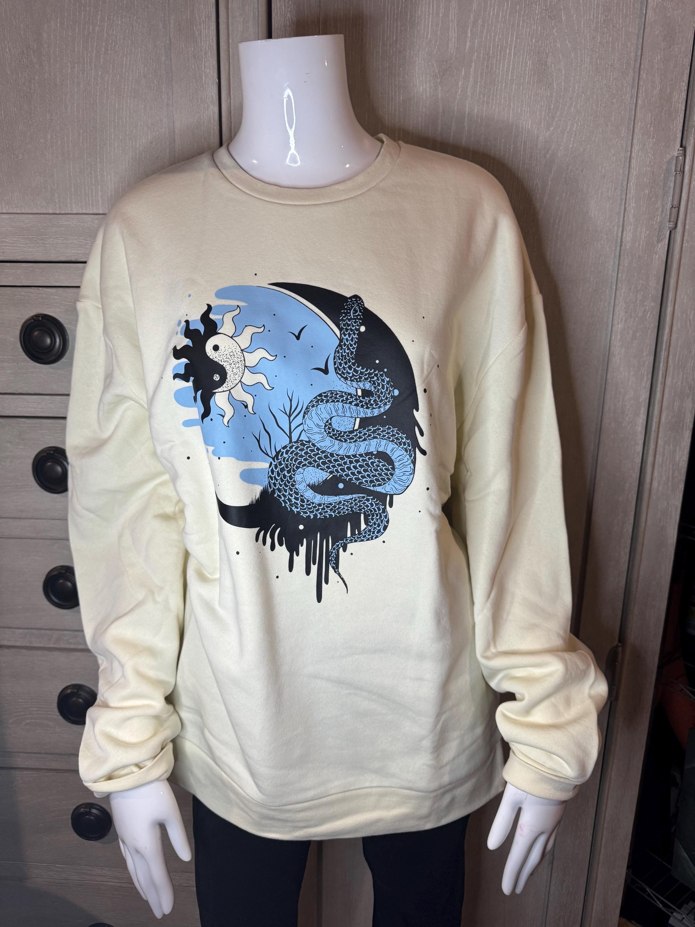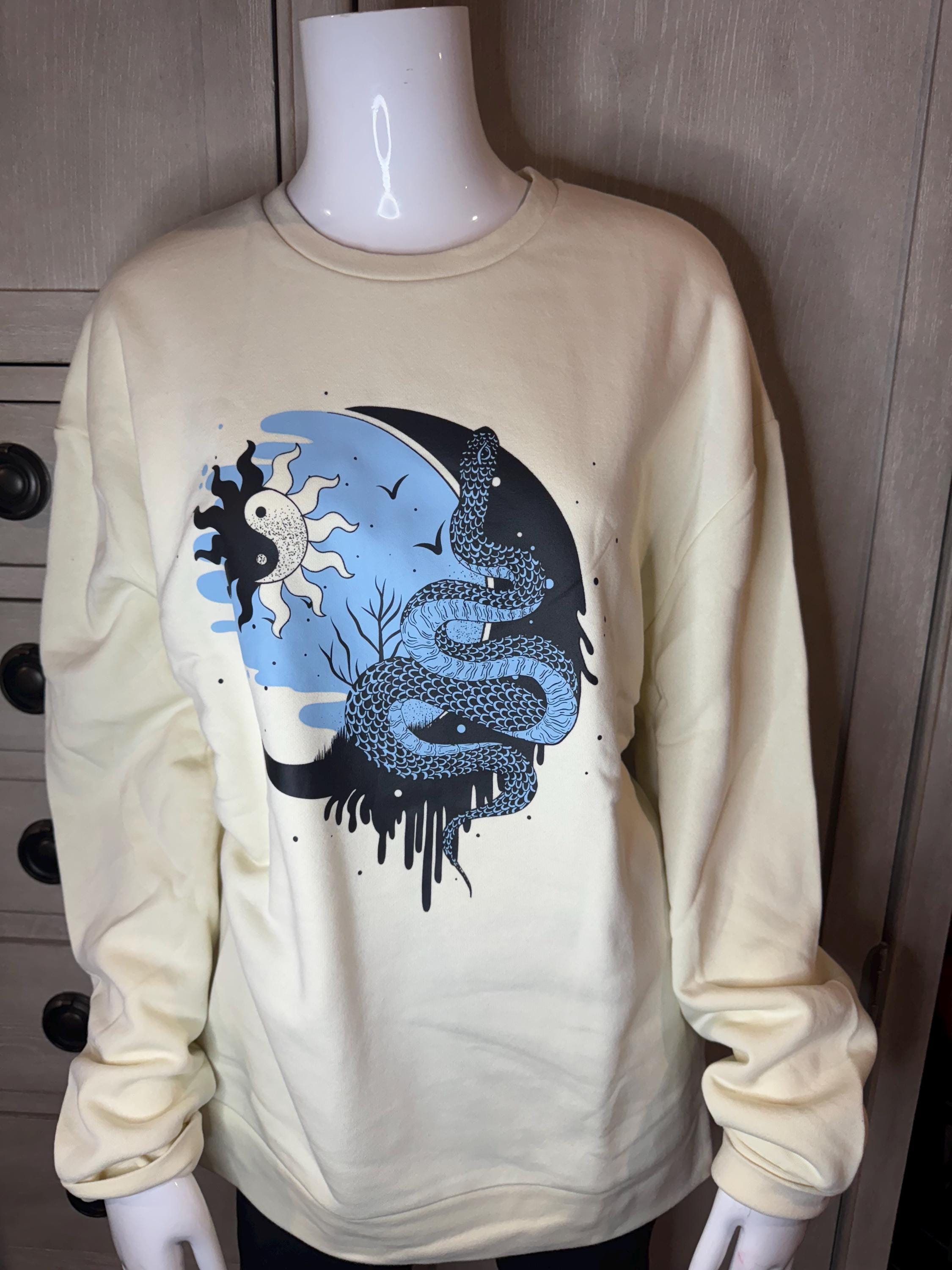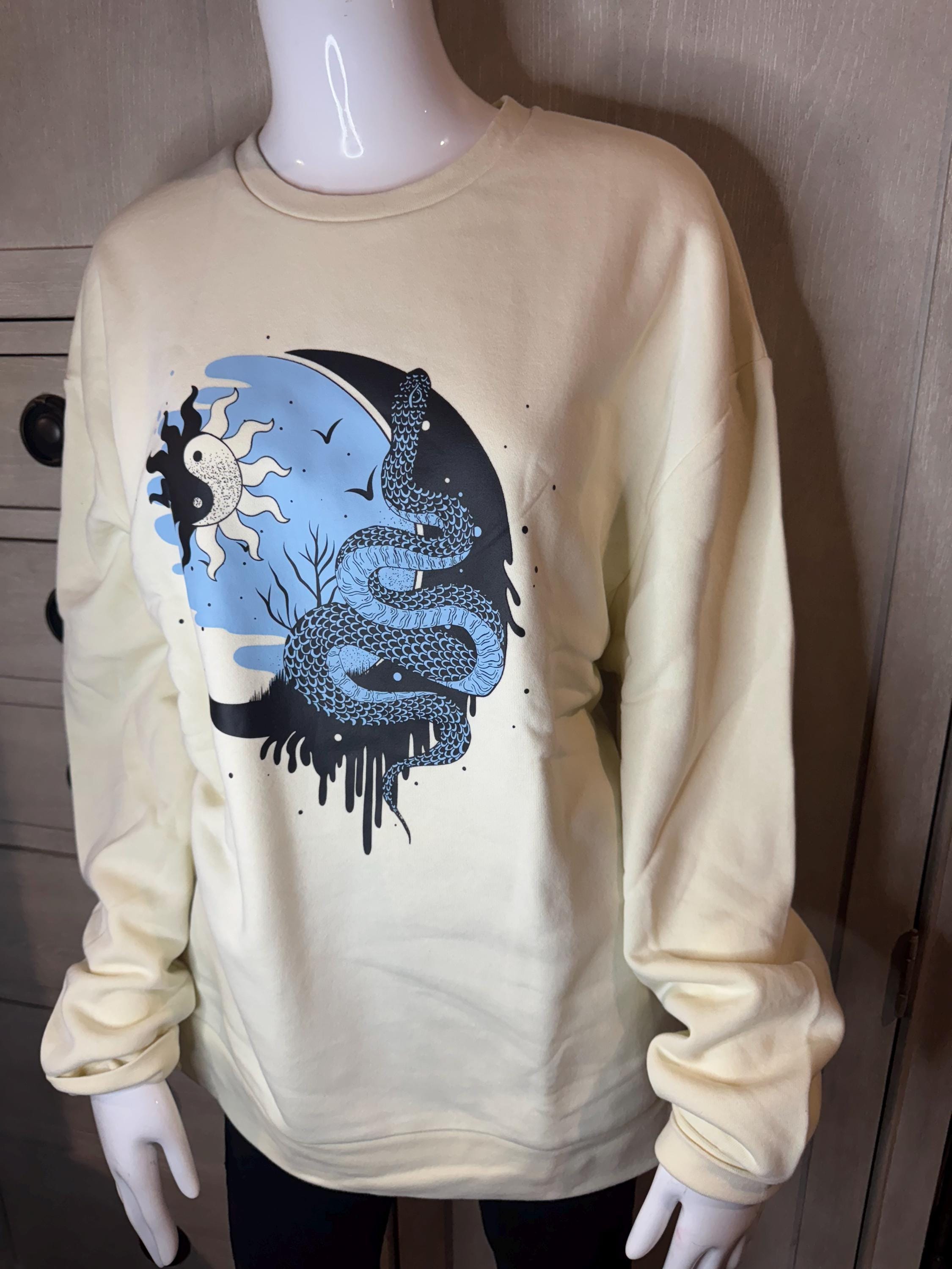 Womens NEW Cream Earthbound Pullover Sweatshirt. 100% Cotton, Round Neckline, Long Sleeve, has a snake, crescent moon, and sun on the front. Blessed Be!