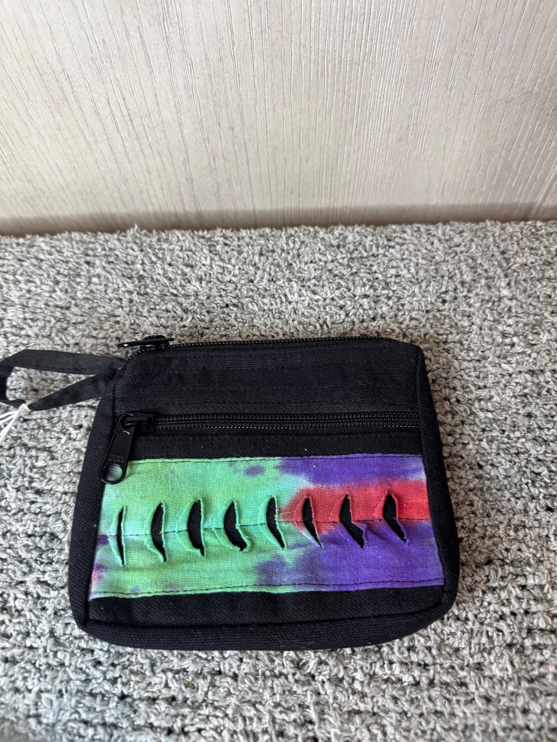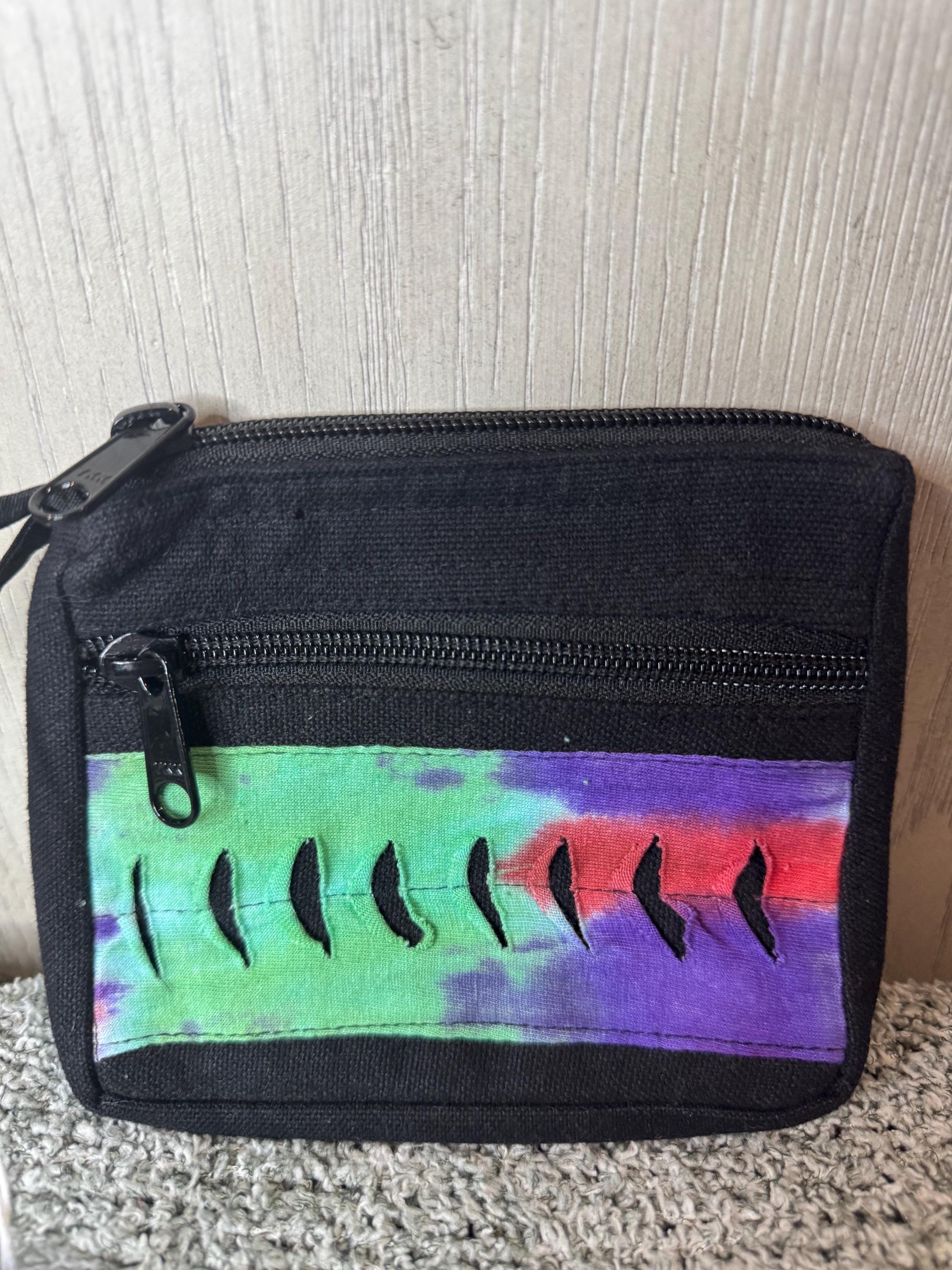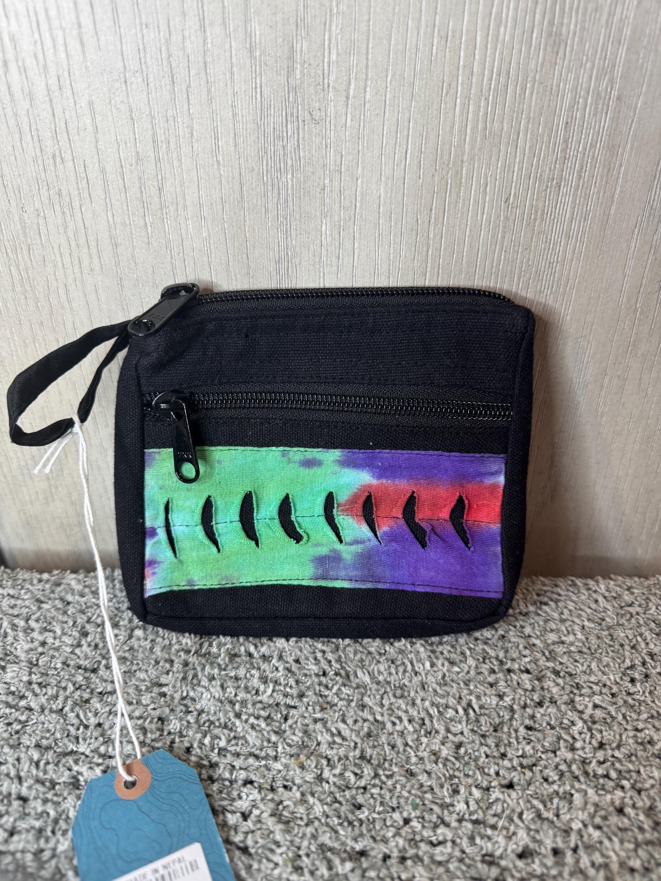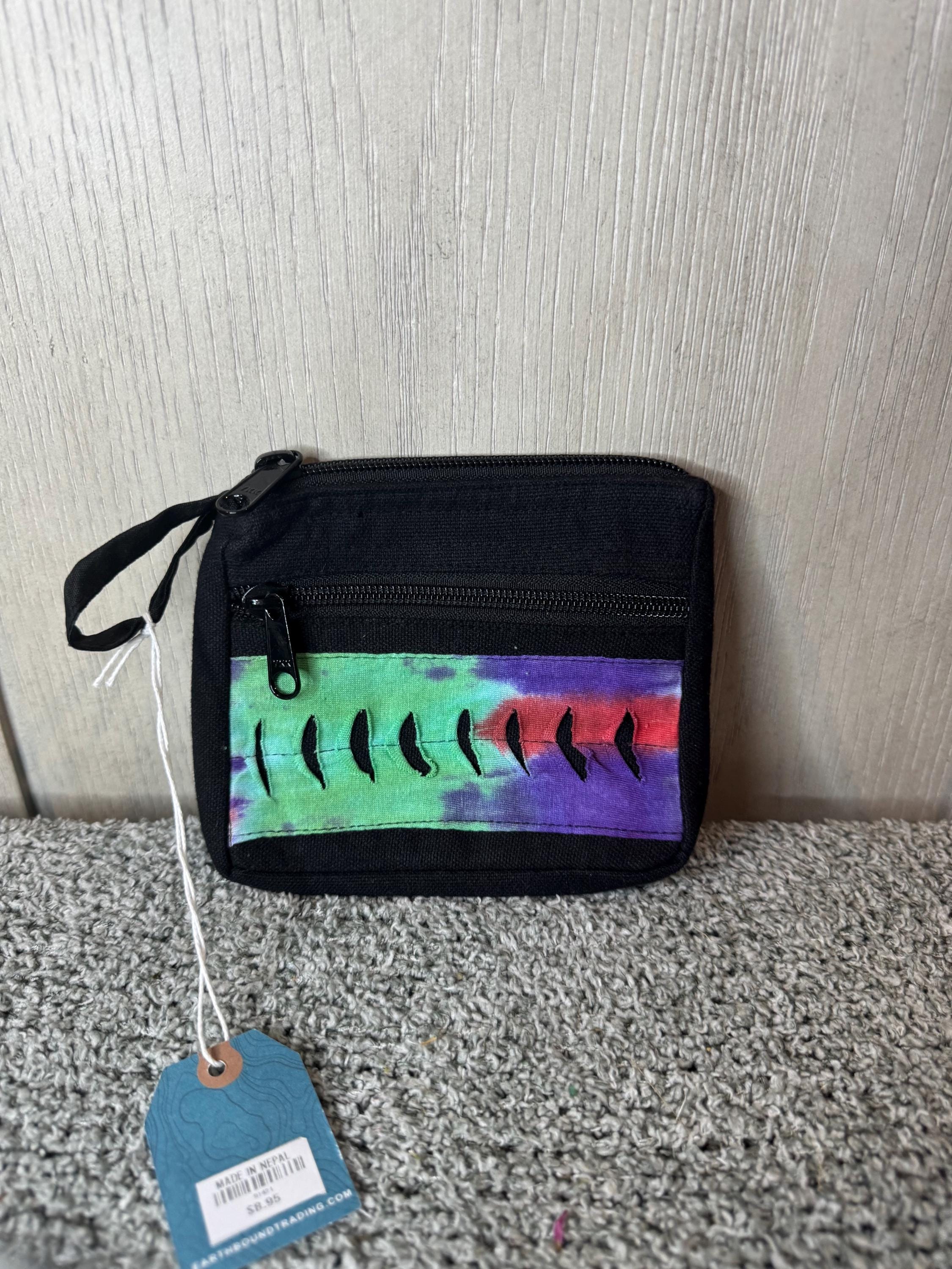 Earthbound Cotton Black and Tye Dye Zipper Coin Purse. Has 2 zipper Compartments, Solid Black in the back, New, Cotton, and measures approximately 5" Long and 6" Wide.