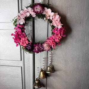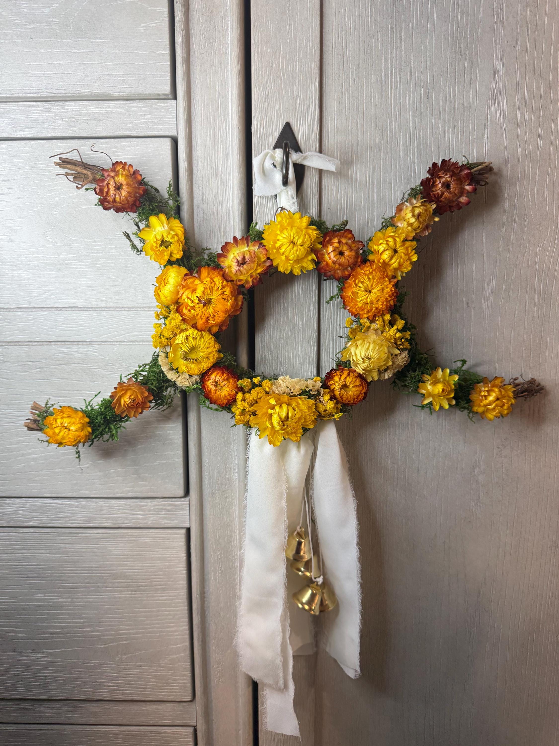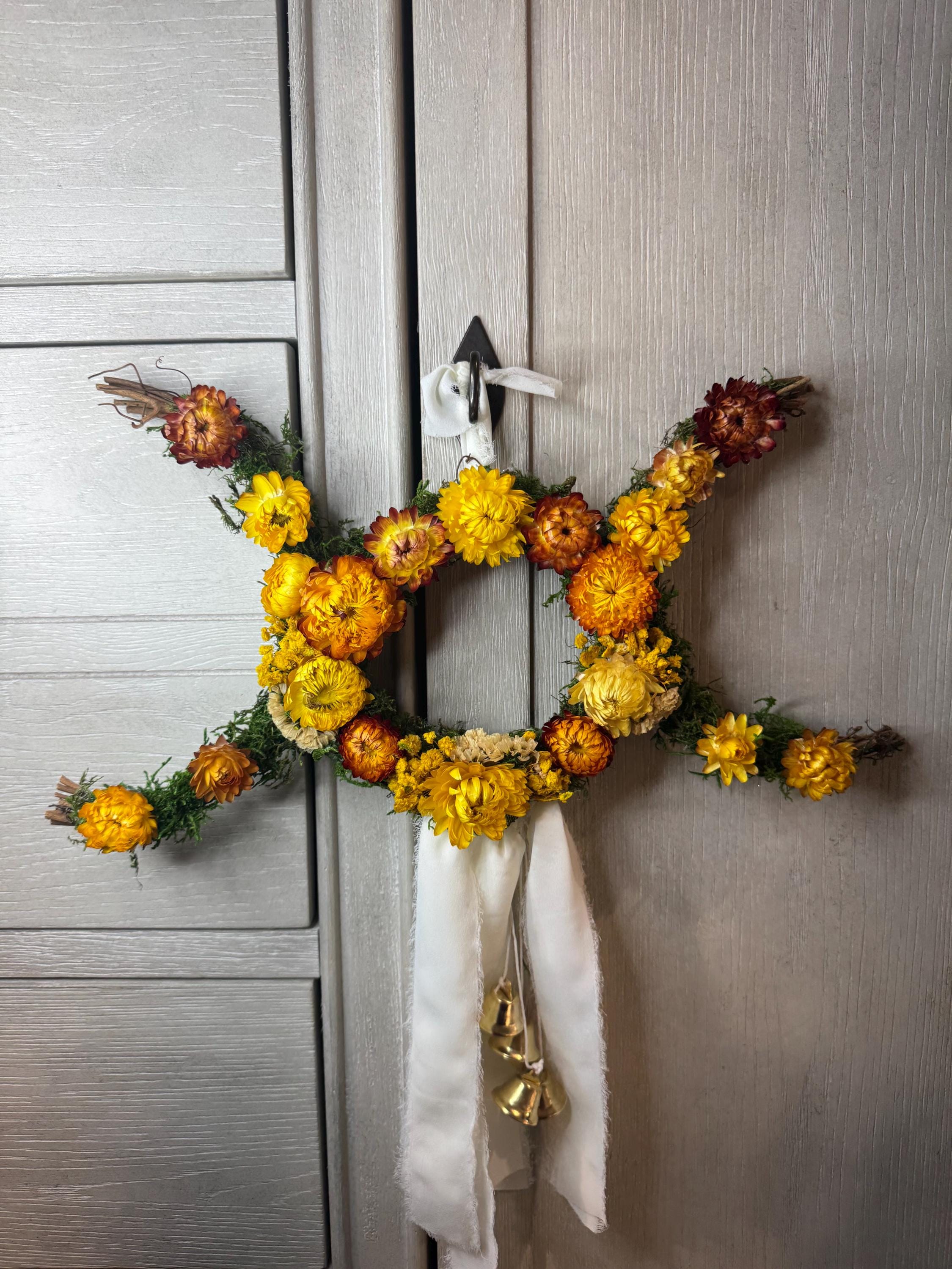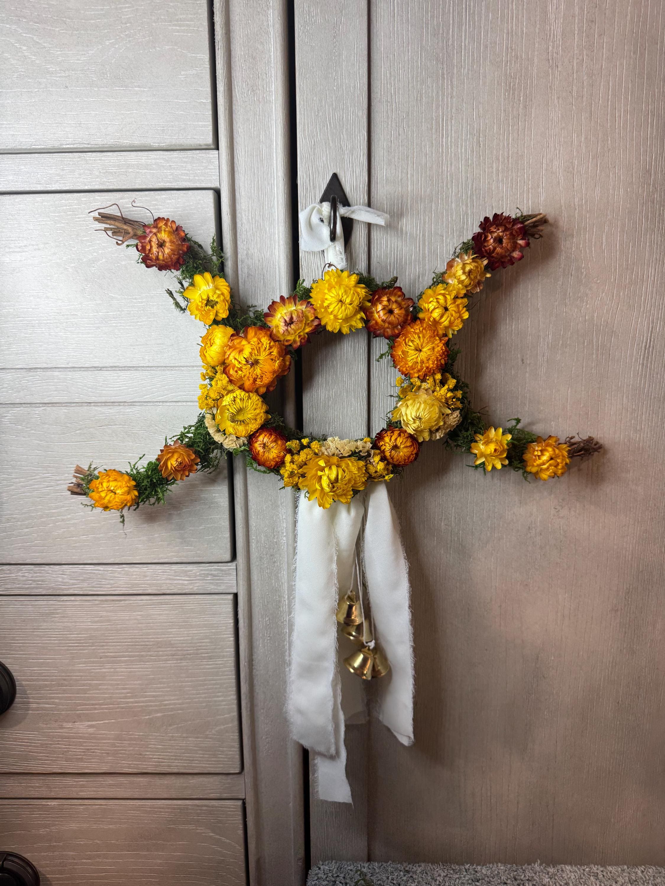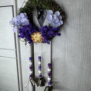 Triple Moon Wreath made with real dried flowers, and witch bells. Measures approximately 15" Long and 8" tall. Triple Moon symbol represents the Triple Goddess and the eternal cycle of birth, life, and death, Commonly found in Wiccan and Pagan traditions. It symbolizes the three phases of womanhood-the Maiden (youth), the Mother (fertility), and the Crone (Wisdom) Blessed Be!
