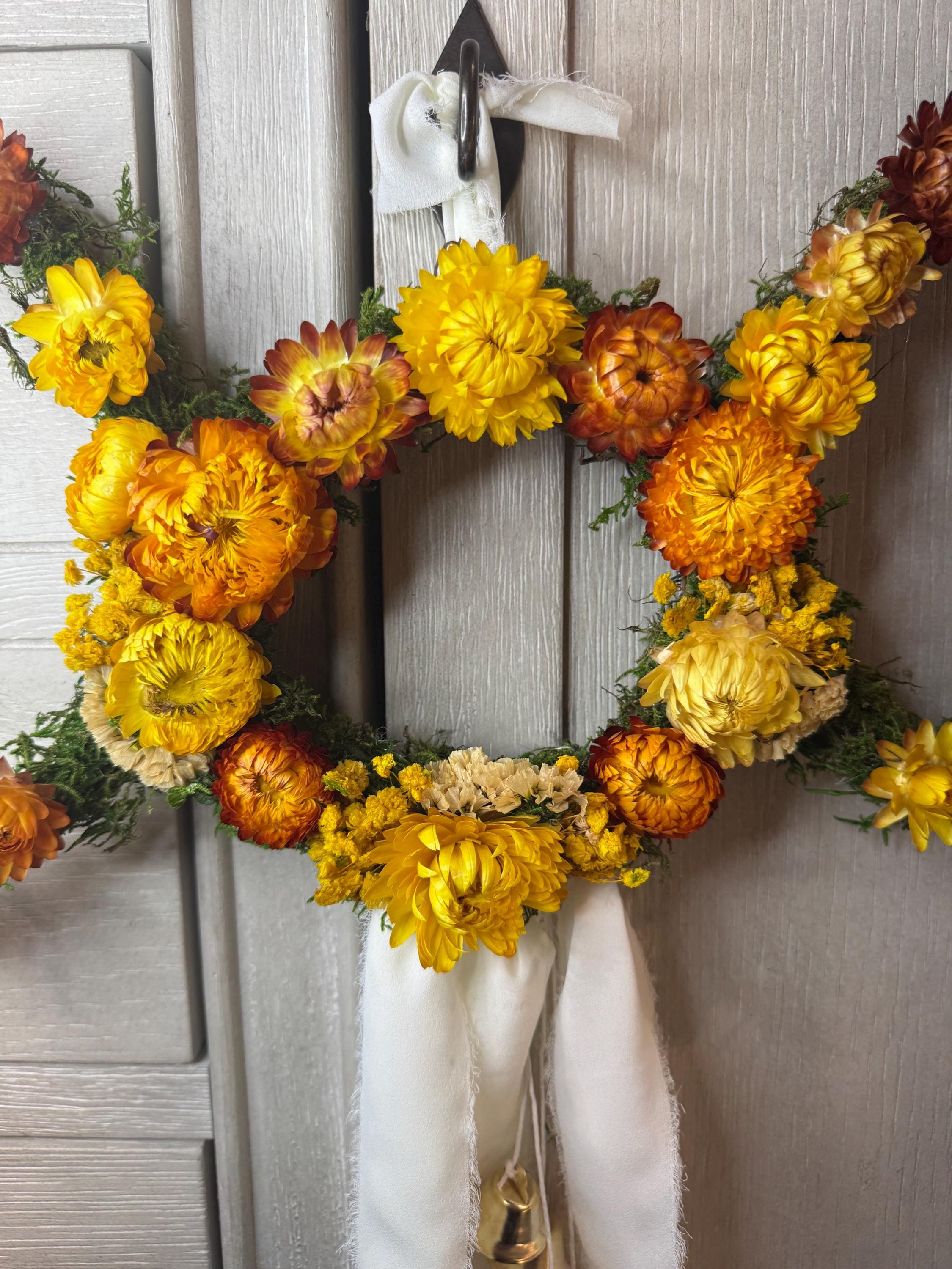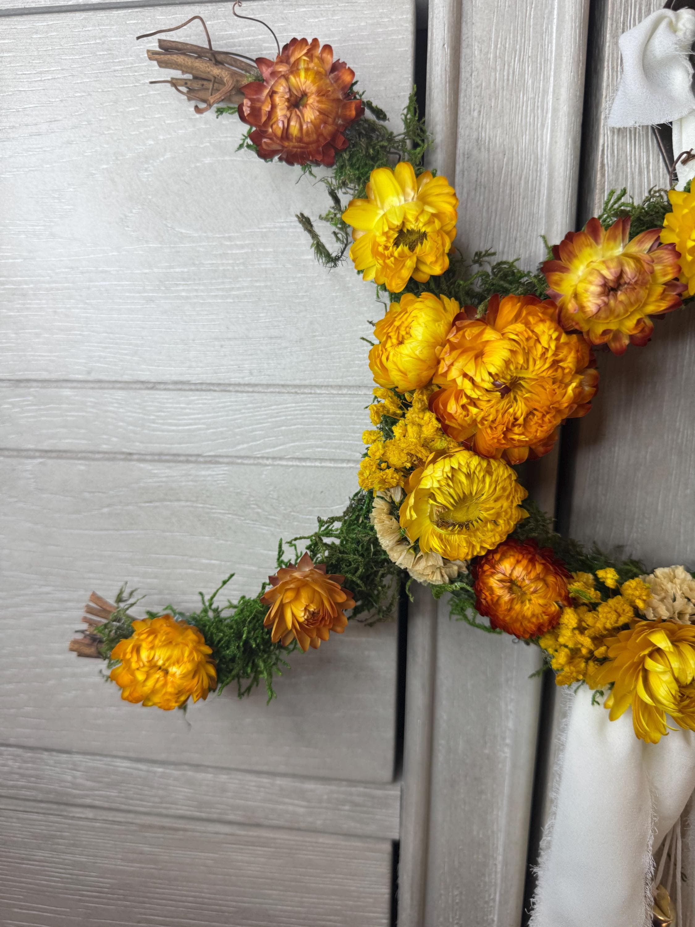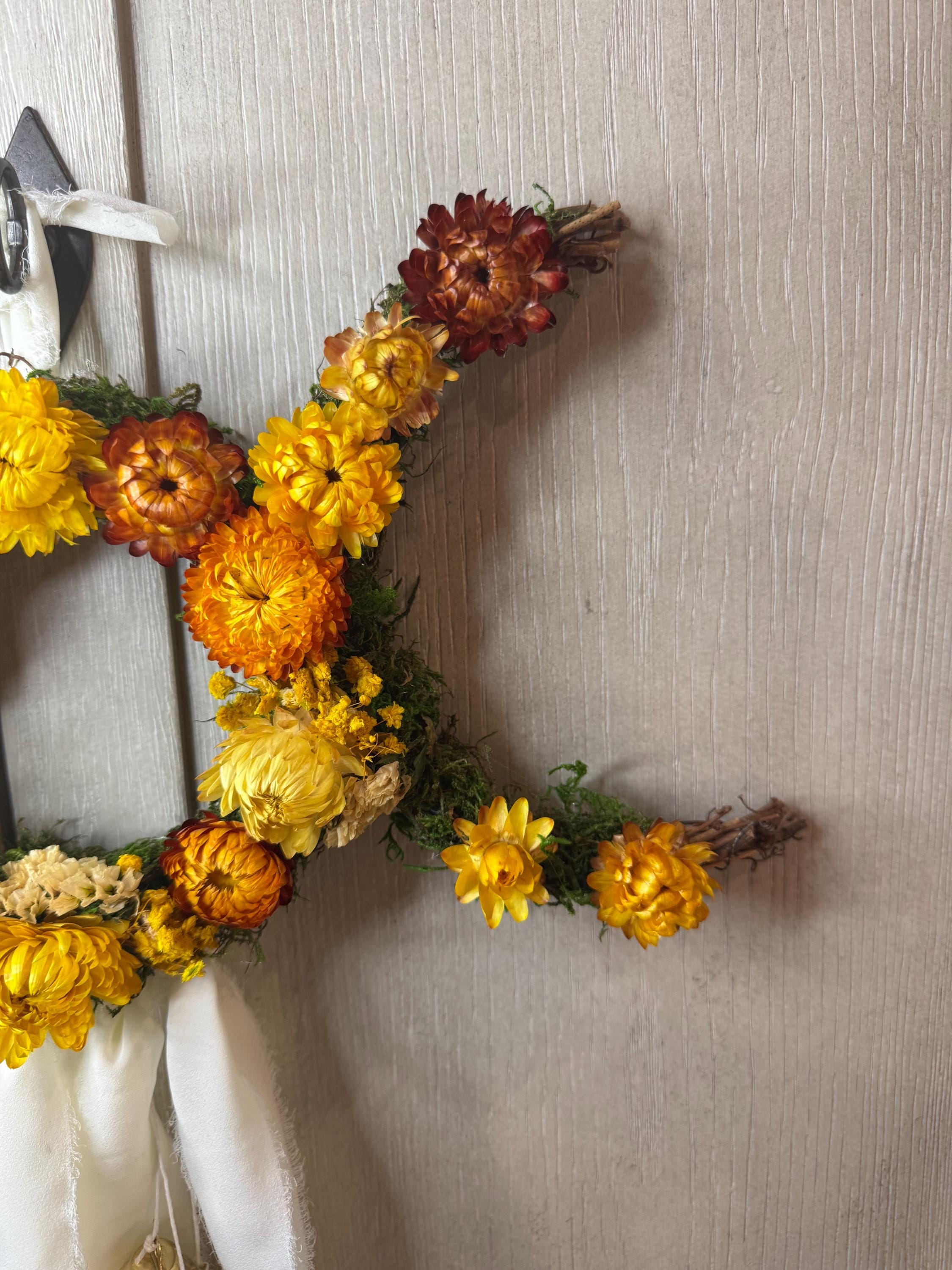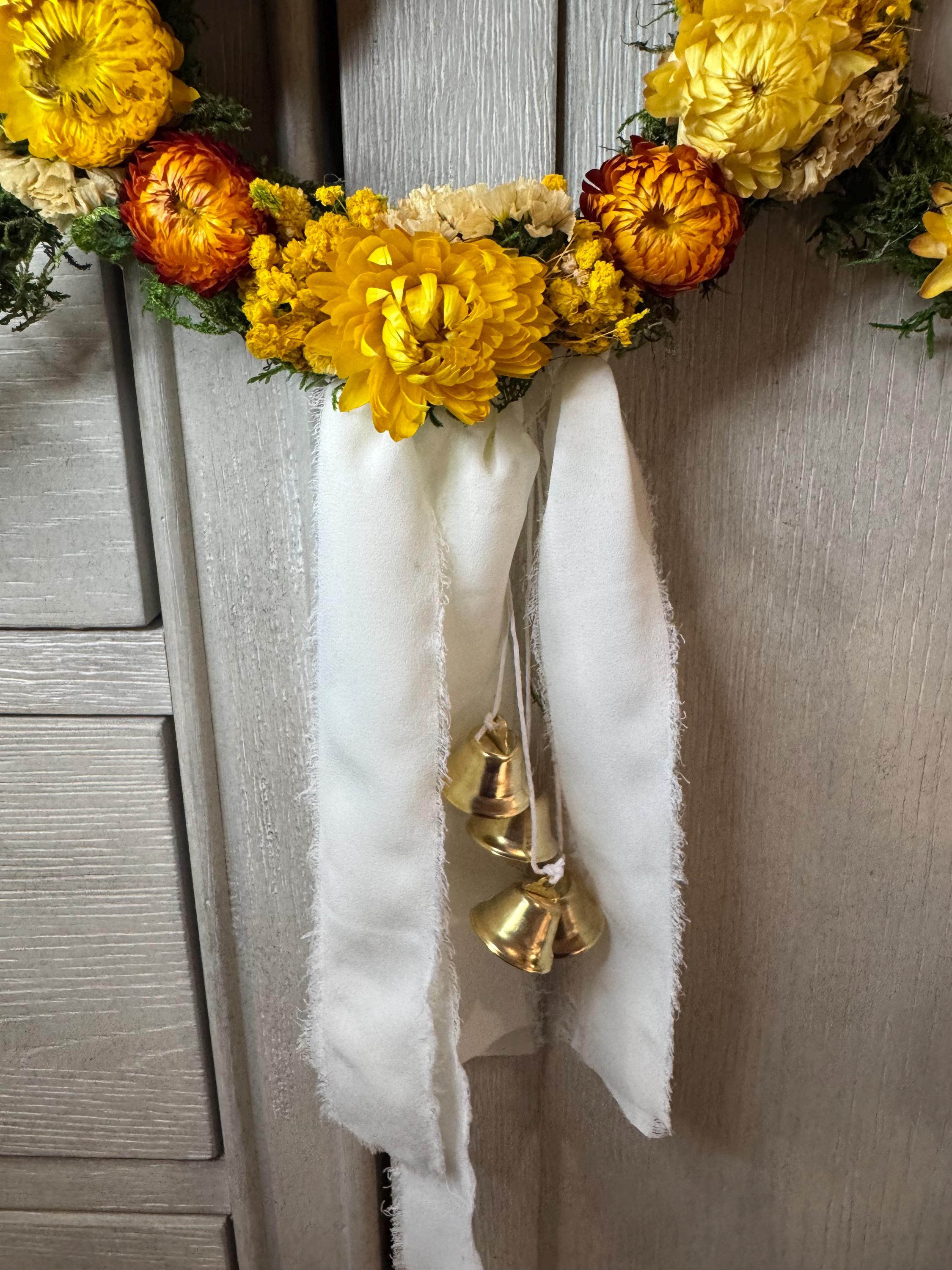 Triple Moon Wreath made with real dried flowers, and witch bells. Measures approximately 15" Long and 8" tall. Triple Moon symbol represents the Triple Goddess and the eternal cycle of birth, life, and death, Commonly found in Wiccan and Pagan traditions. It symbolizes the three phases of womanhood-the Maiden (youth), the Mother (fertility), and the Crone (Wisdom) Blessed Be!