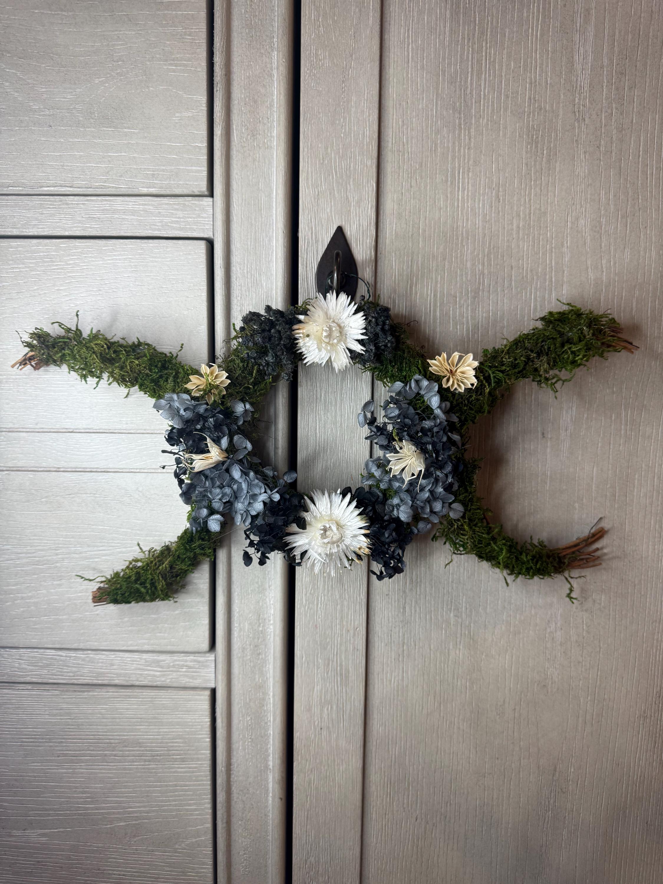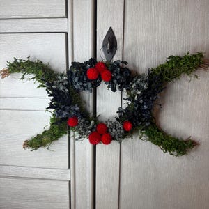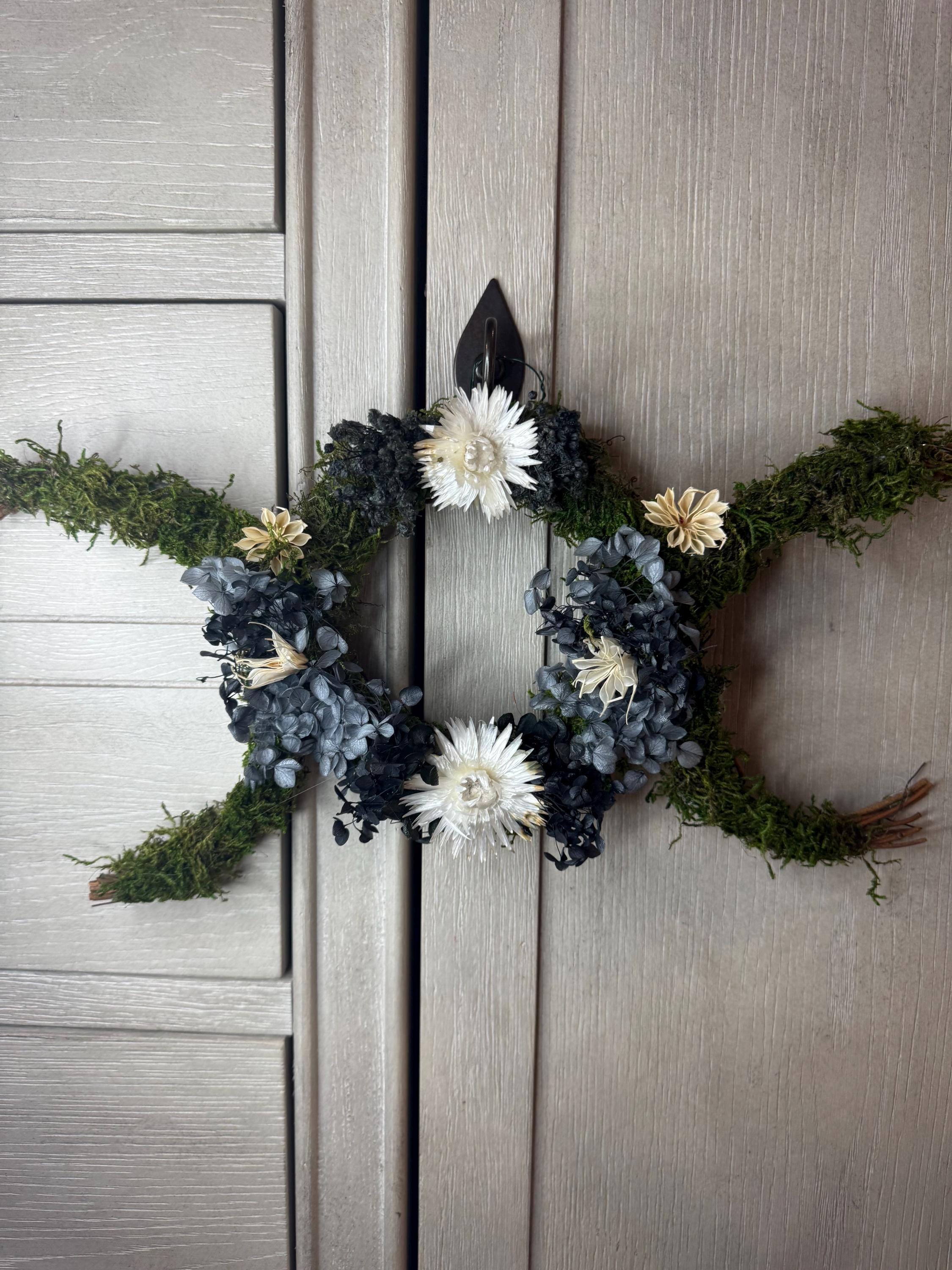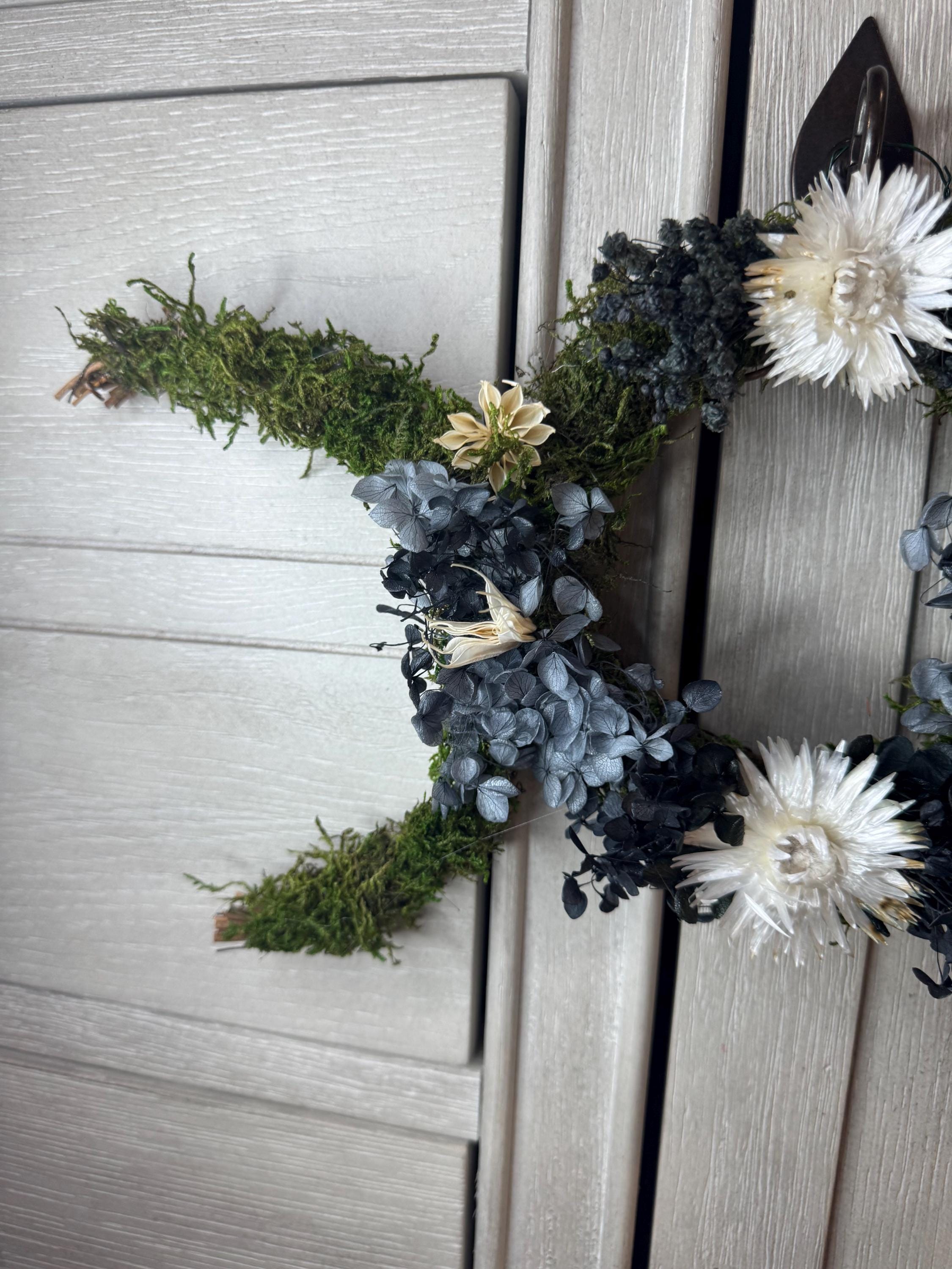 Black, White, Gray Real Dried Flower Triple Moon Wreath. Measures approximately 15" Long and 8" Tall. Triple Moon symbol represents the Triple Goddess and the eternal cycle of birth, like, and death, commonly found in wiccan and Pagan traditions. It symbolizes the three phases of womanhood - the Maiden (youth), the Mother (fertility), and the Crone (wisdom). Blessed Be!