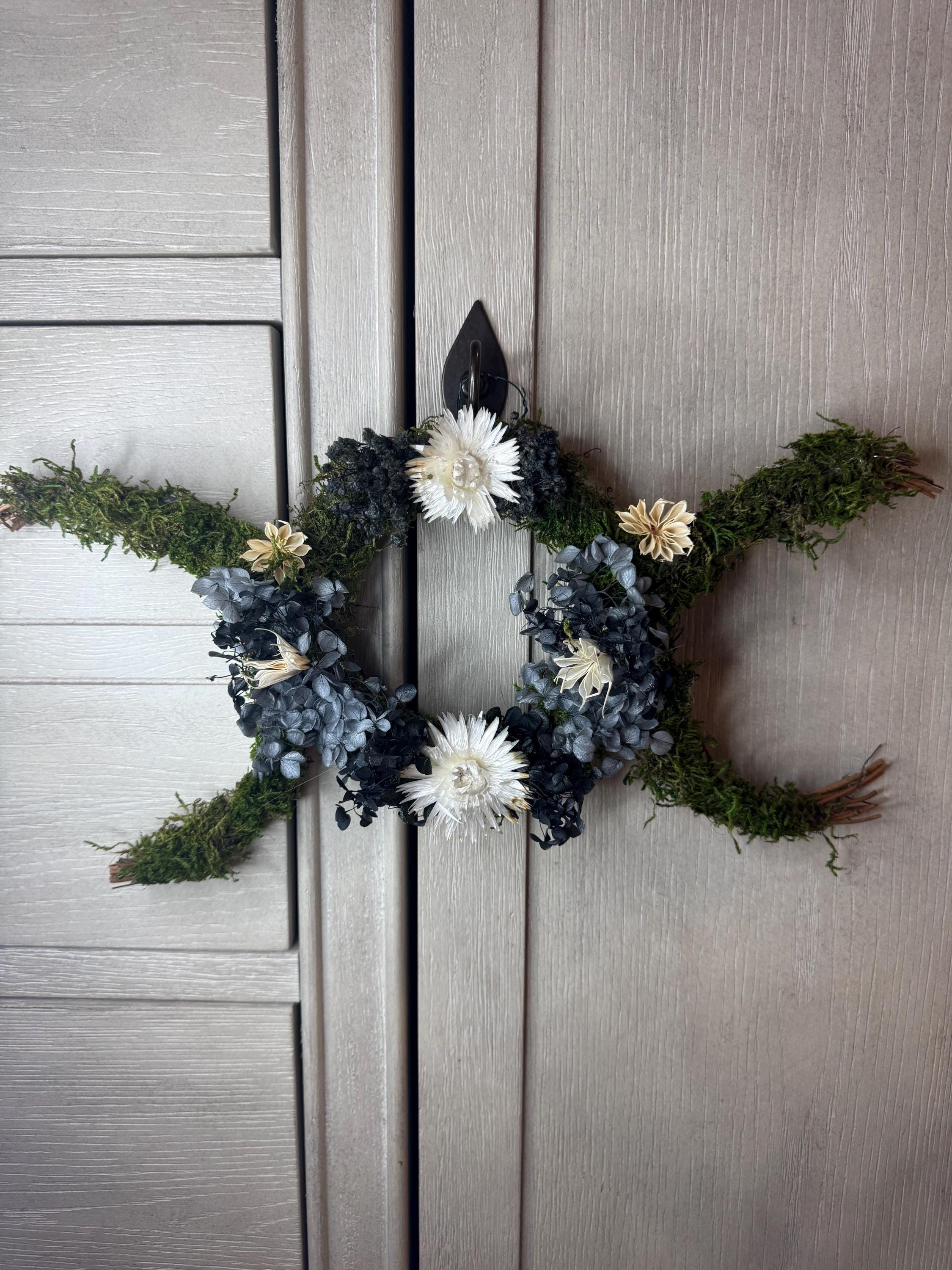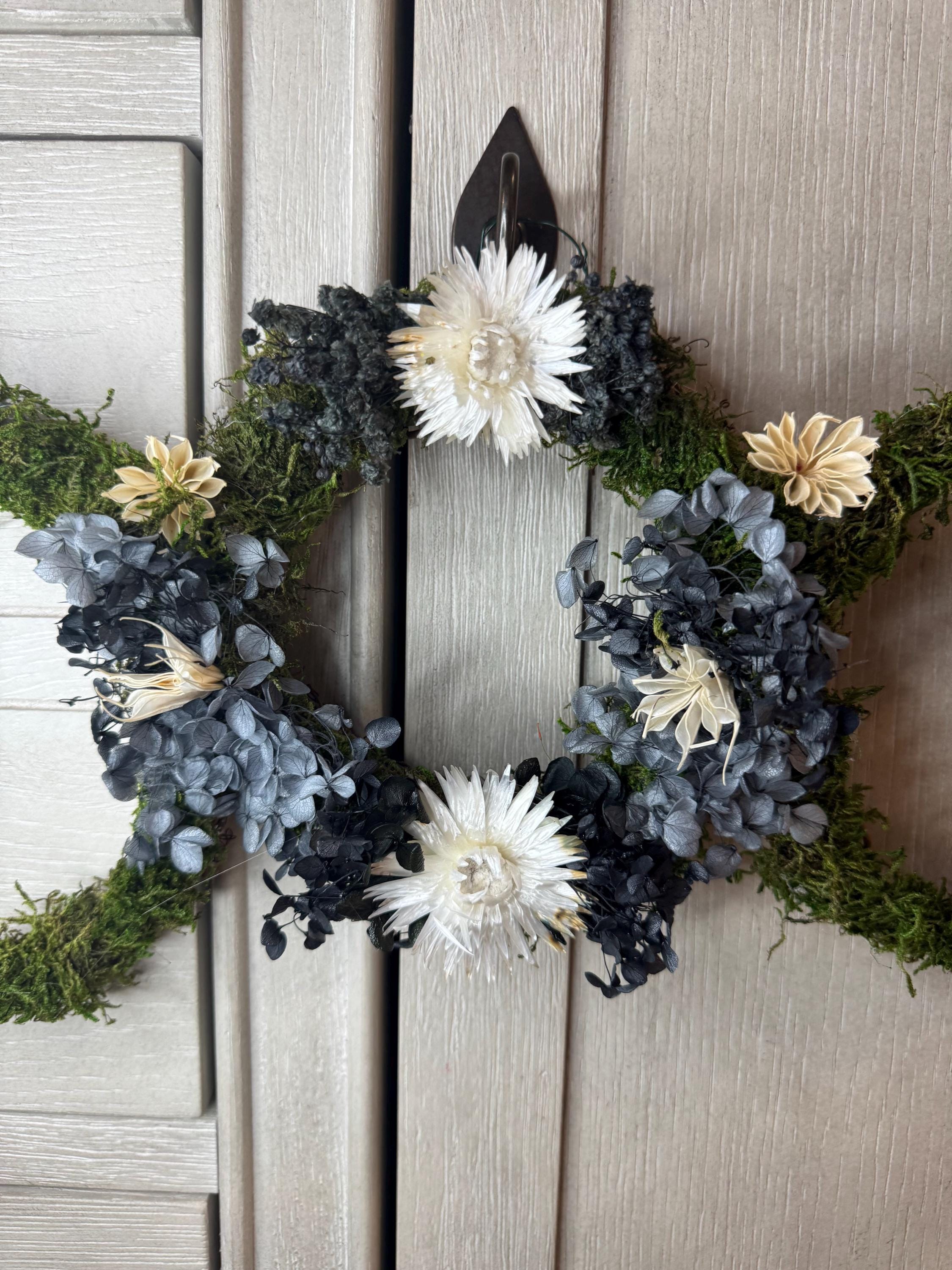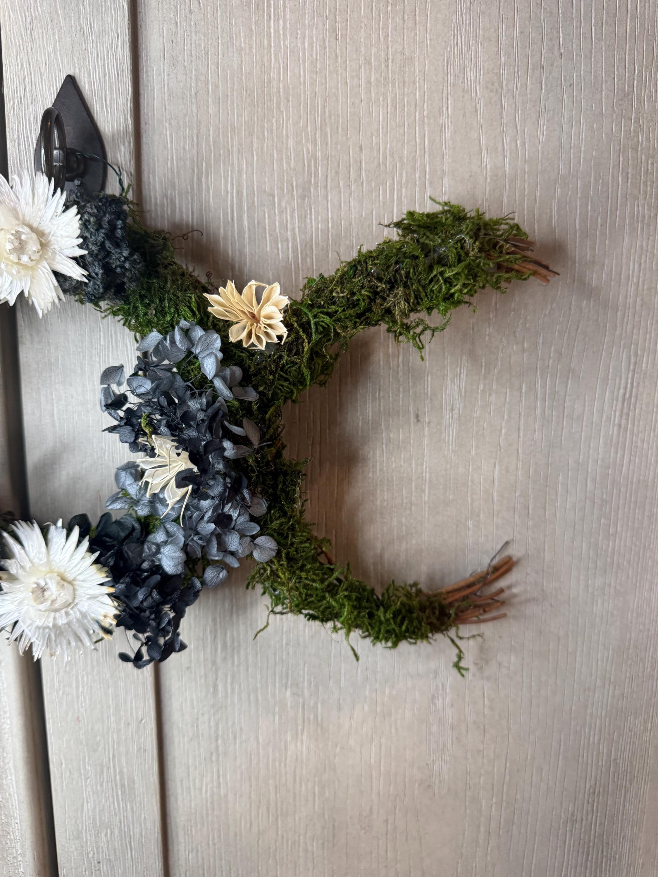 Black, White, Gray Real Dried Flower Triple Moon Wreath. Measures approximately 15" Long and 8" Tall. Triple Moon symbol represents the Triple Goddess and the eternal cycle of birth, like, and death, commonly found in wiccan and Pagan traditions. It symbolizes the three phases of womanhood - the Maiden (youth), the Mother (fertility), and the Crone (wisdom). Blessed Be!
