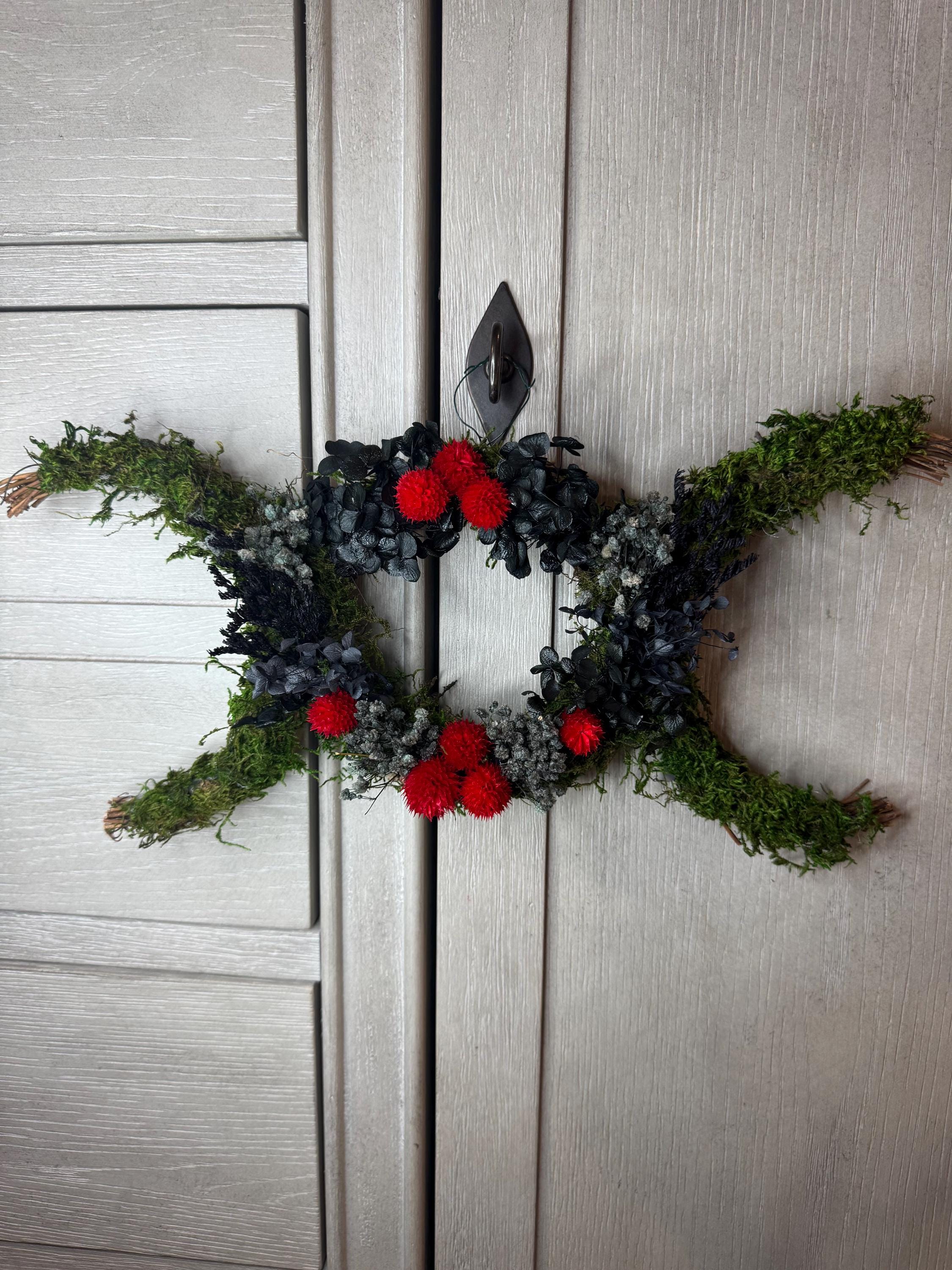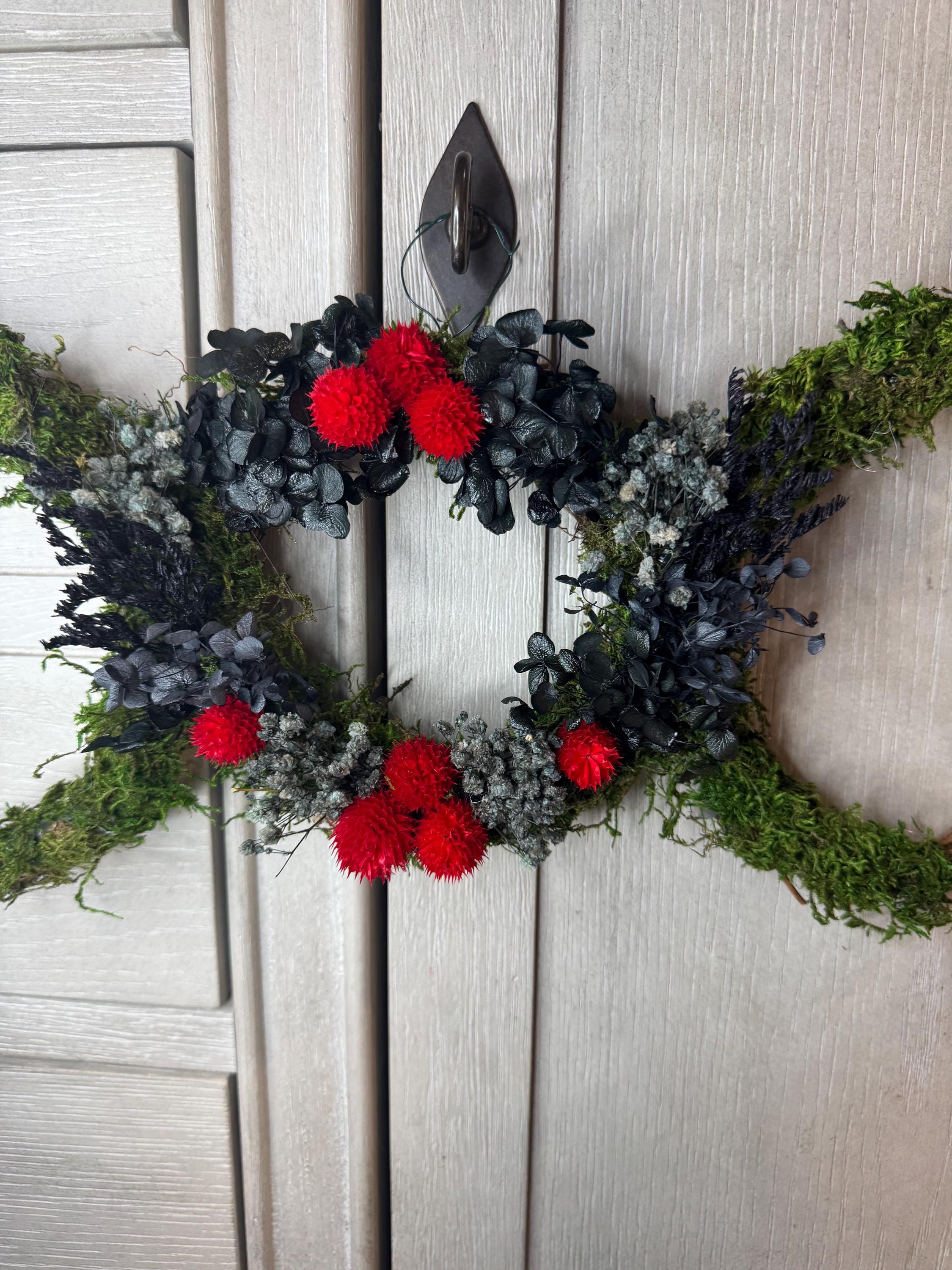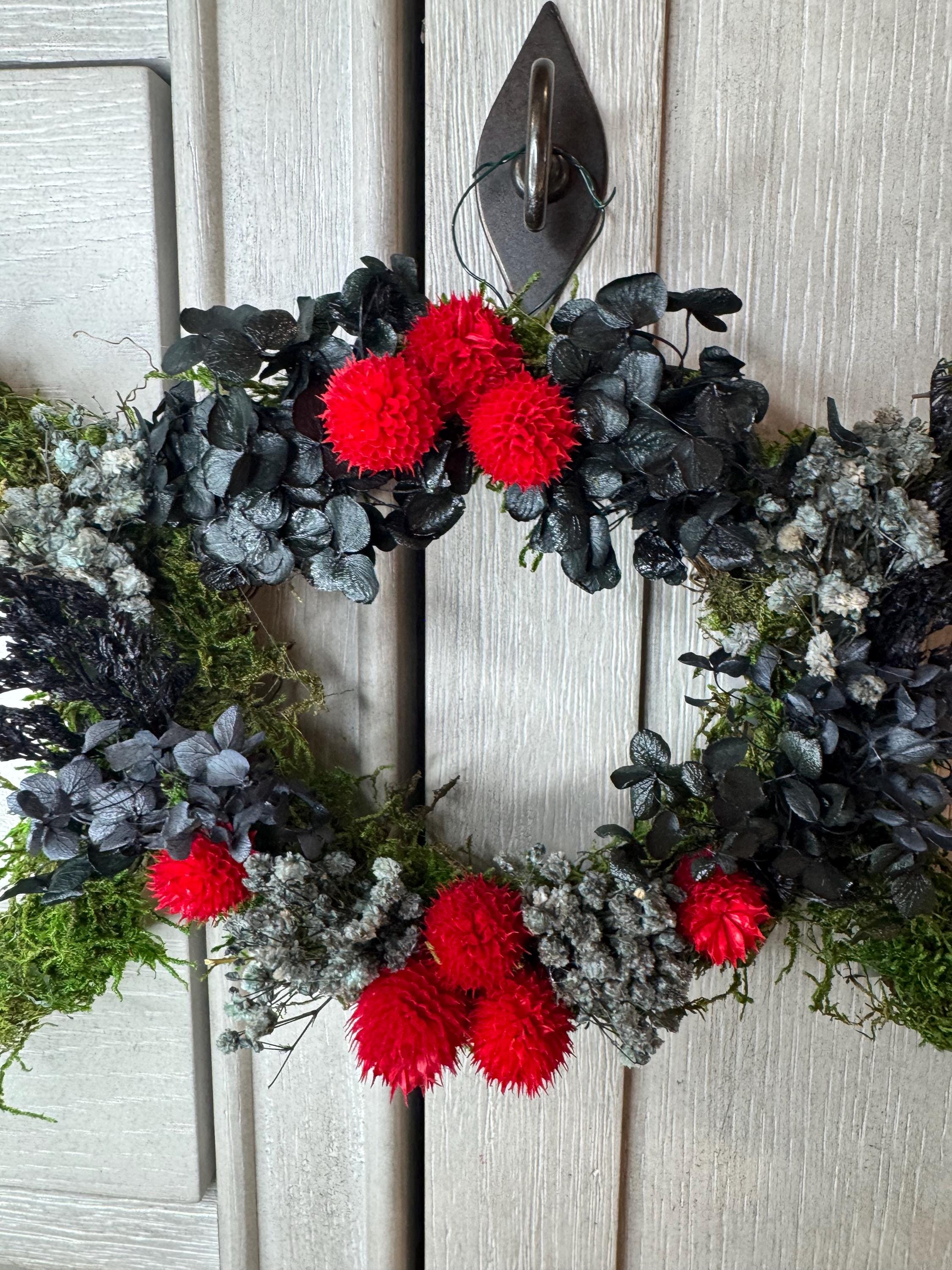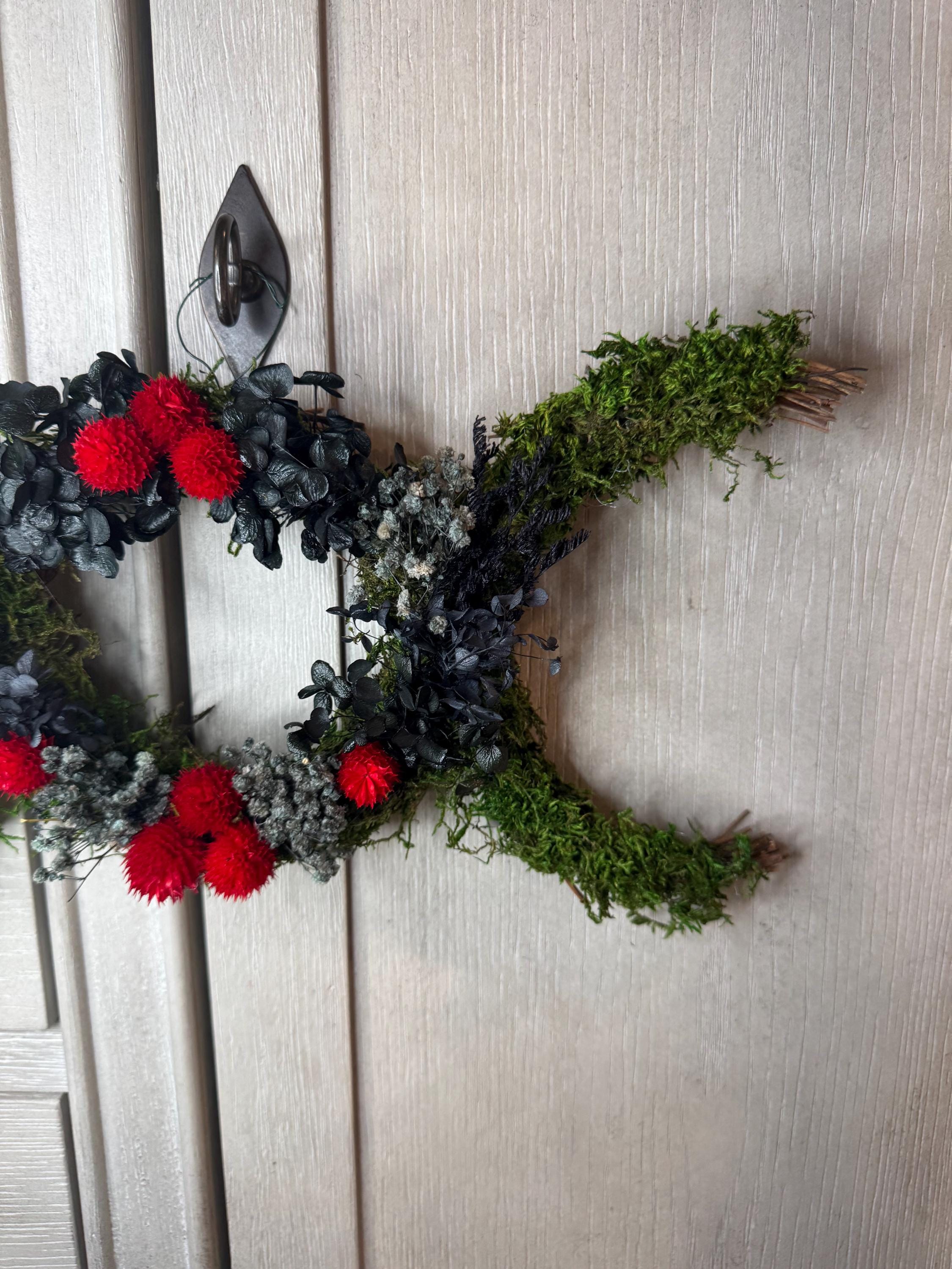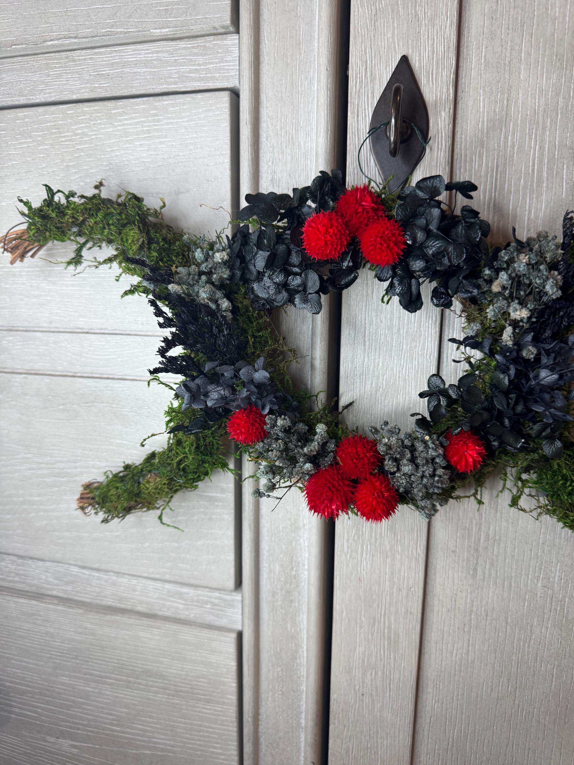 Black, Gray, Red Small Triple Moon Wreath made with grapevine and real dried Flowers. Measures approximately 15" Long and 8" Tall. Triple moon symbol represents the Triple Goddess And the eternal cycle of birth, life, and death, commonly found in Wiccan and Pagan traditions. It symbolizes the three phases of womanhood-the Maiden (youth), the Mother (fertility), and the Crone (wisdom). Blessed Be!