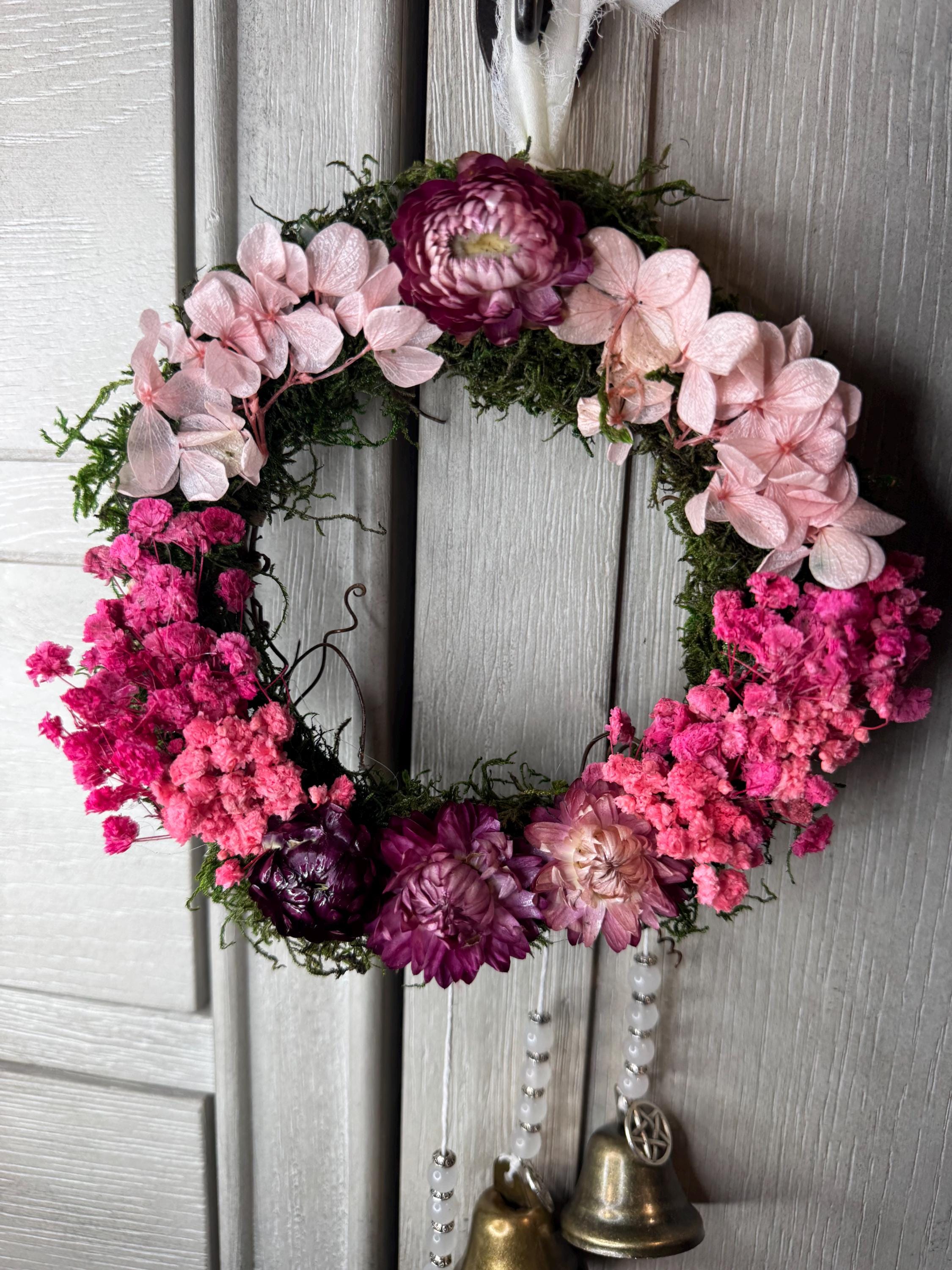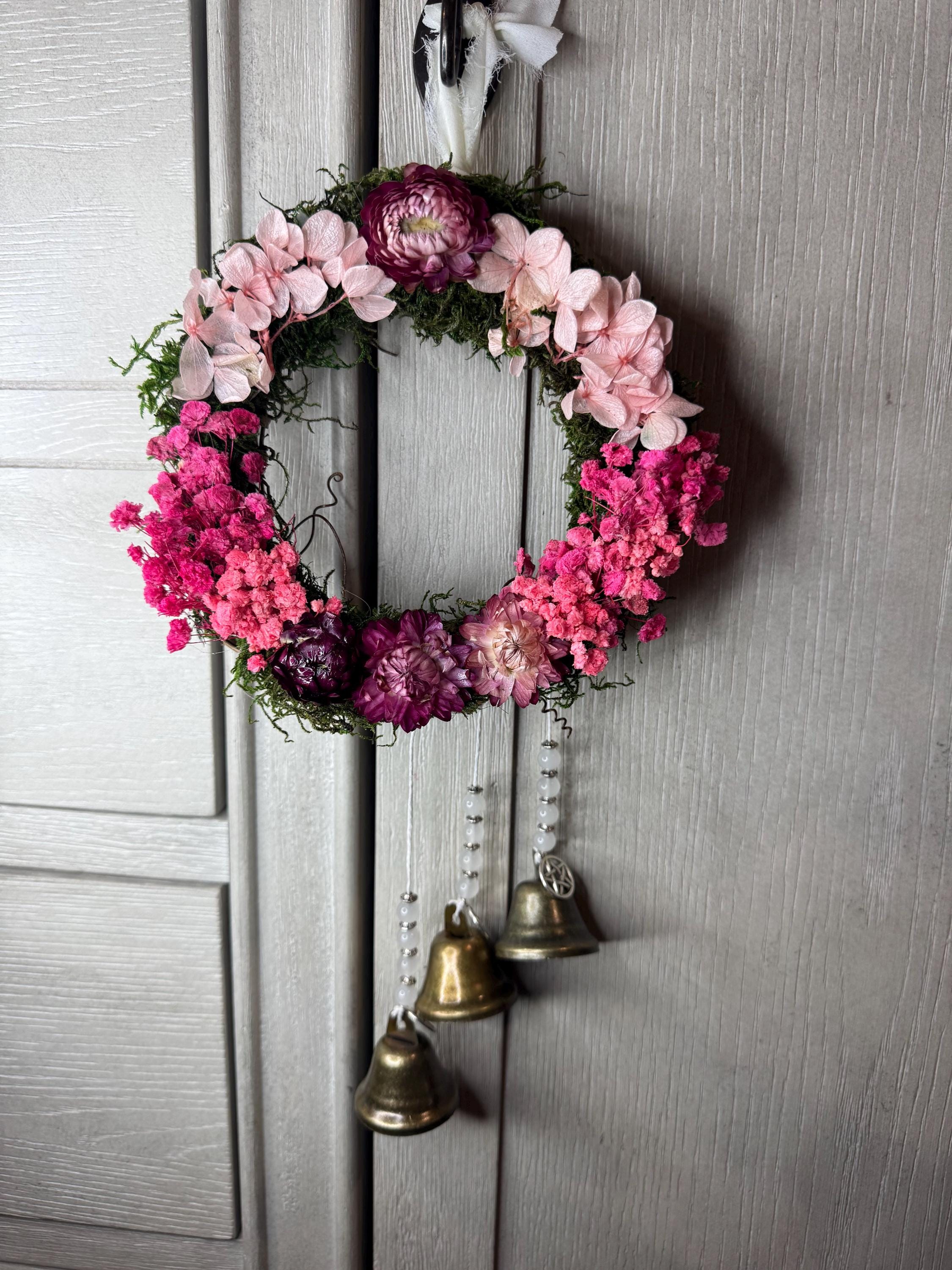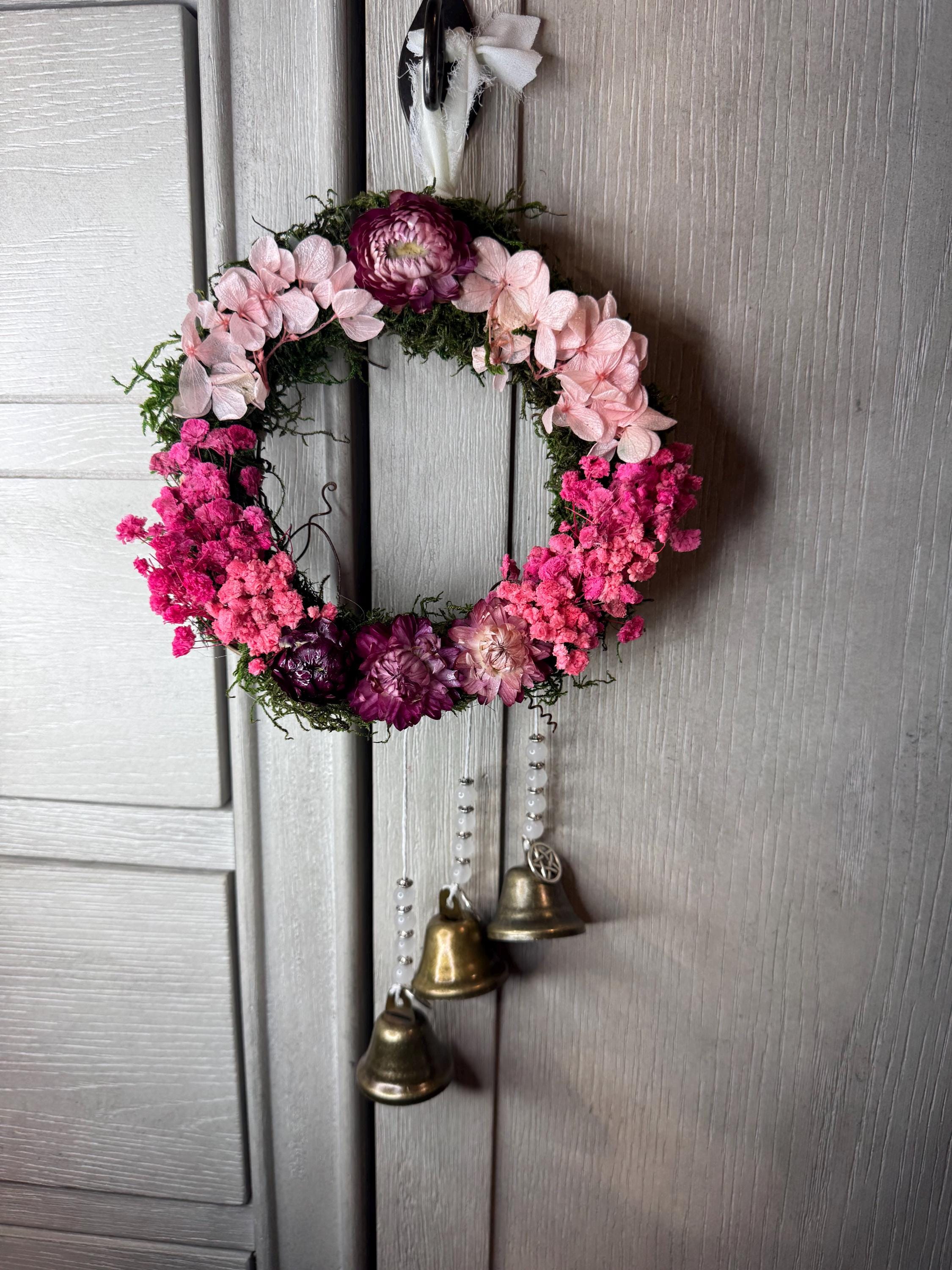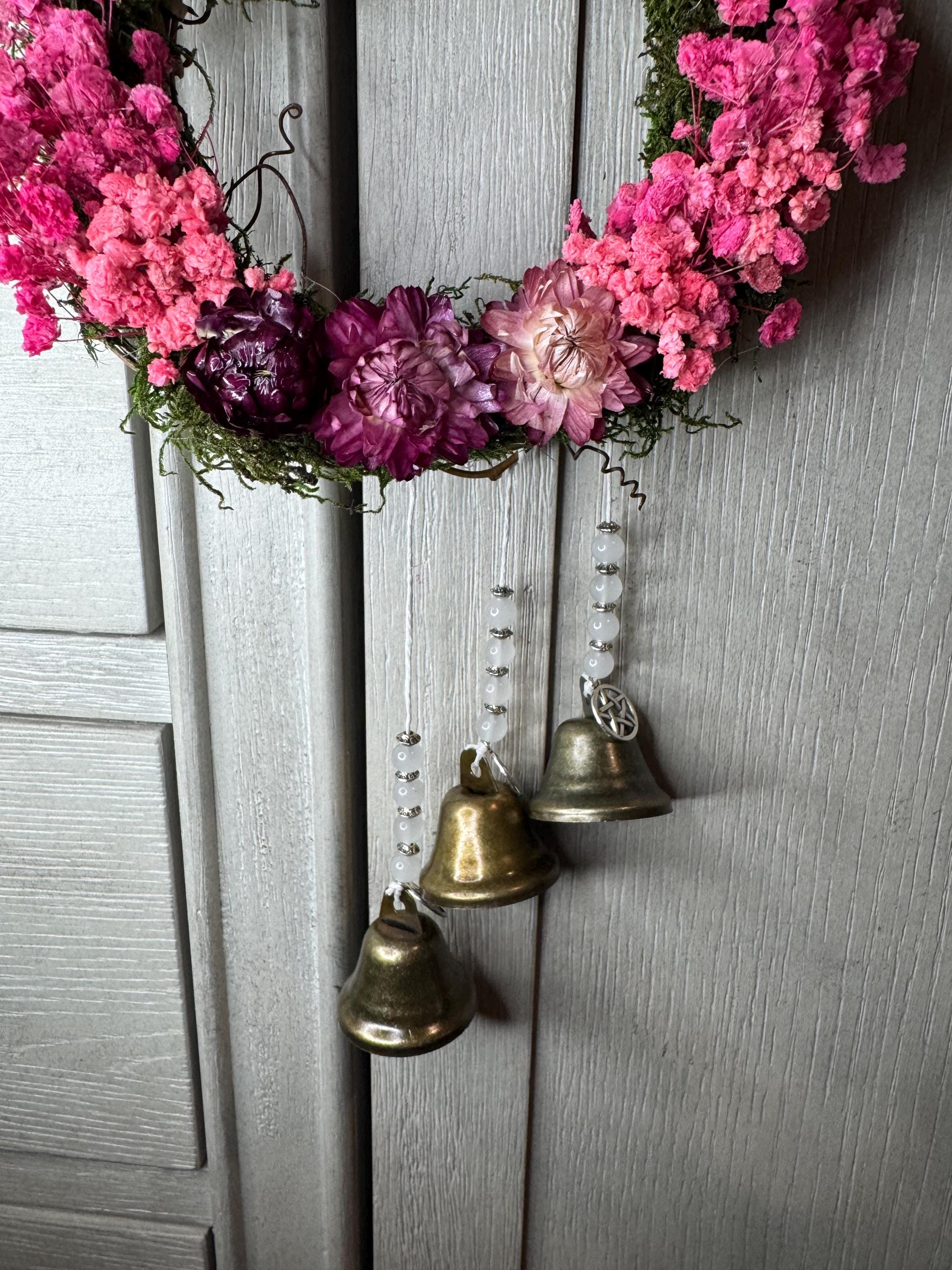 6" Grapevine Witch Bells. Made with real dried pink flowers, silver charms, bronze bells, beads. Witches' bells are primarily used for protection and clearing negative energy from a home or sacred space. They are hung on doorknobs or near entrances to chime and ward off unwanted spirits or energy as the door opens and closes. Blessed Be!