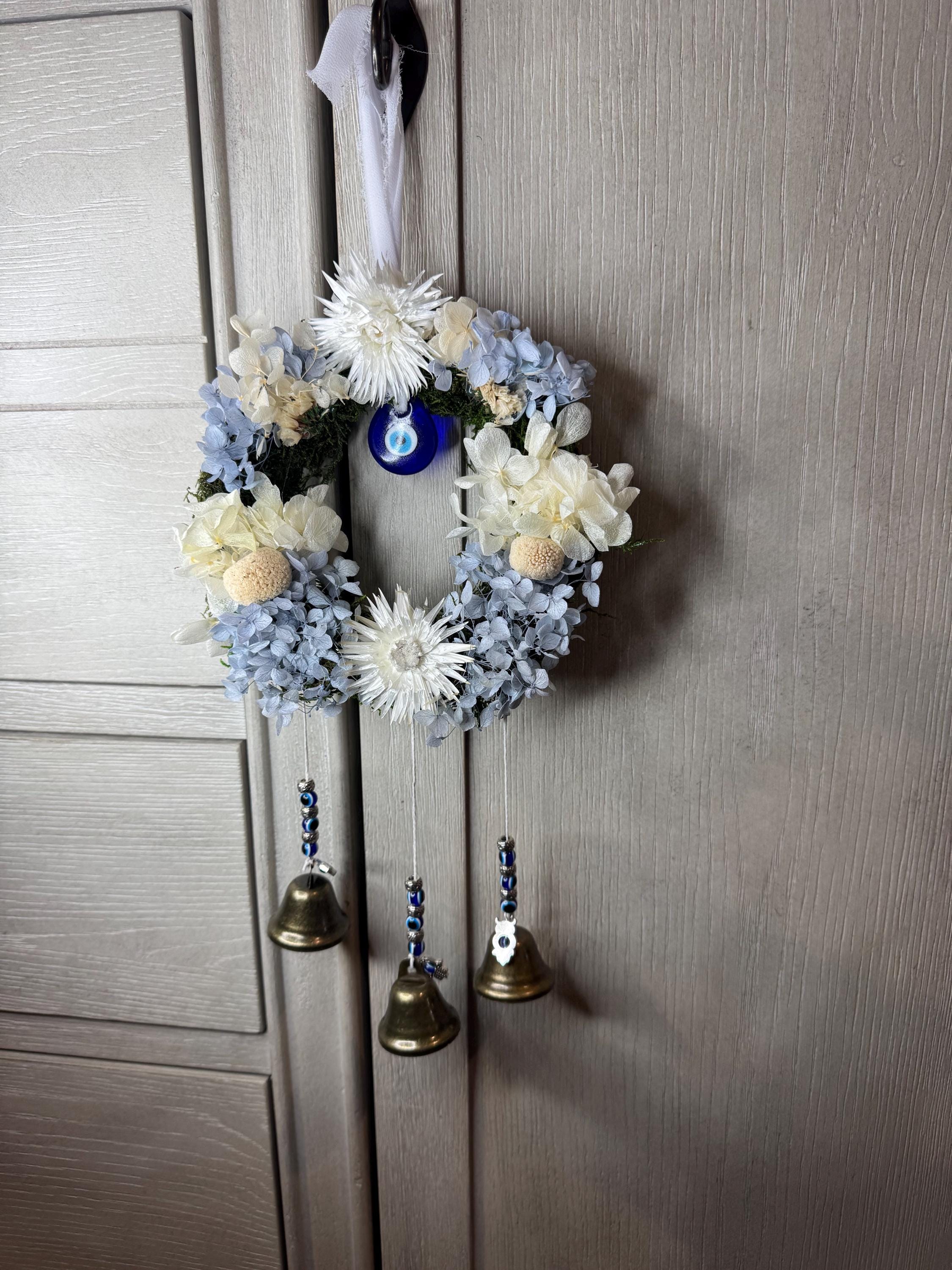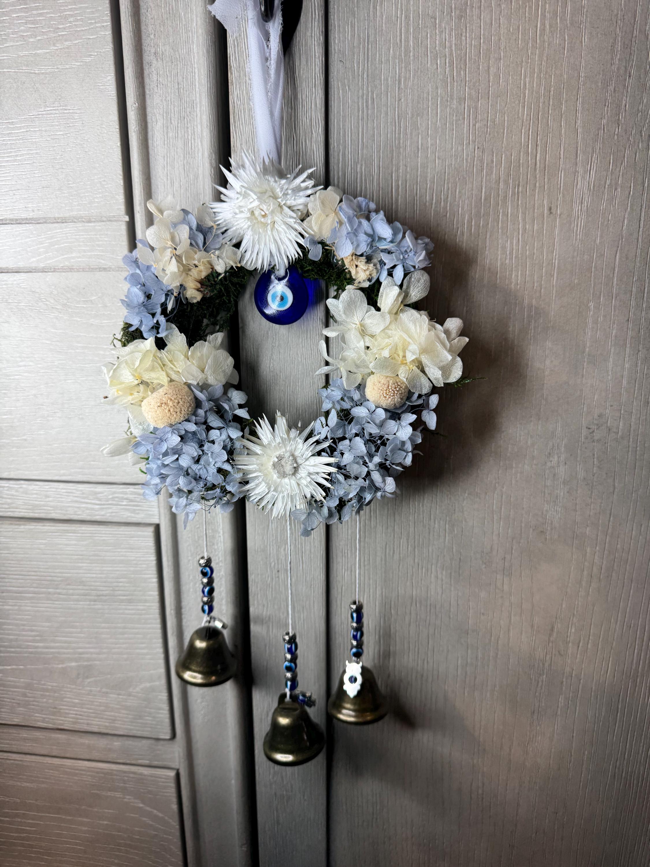 6" Grapevine Witch Bell Wreath made with real dried blue and cream flowers. Has evil eye beads, silver charms, bronze bells. Witches' bells are primarily used for protection and clearing negative energy from a home or sacred space. They are hung on doorknobs or near entrances to chime and ward off unwanted spirits or energy as the door opens and closes. Blessed BE!
