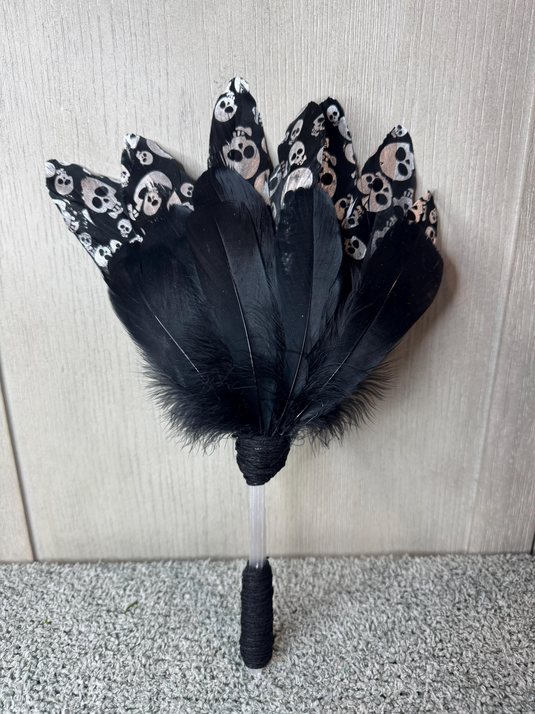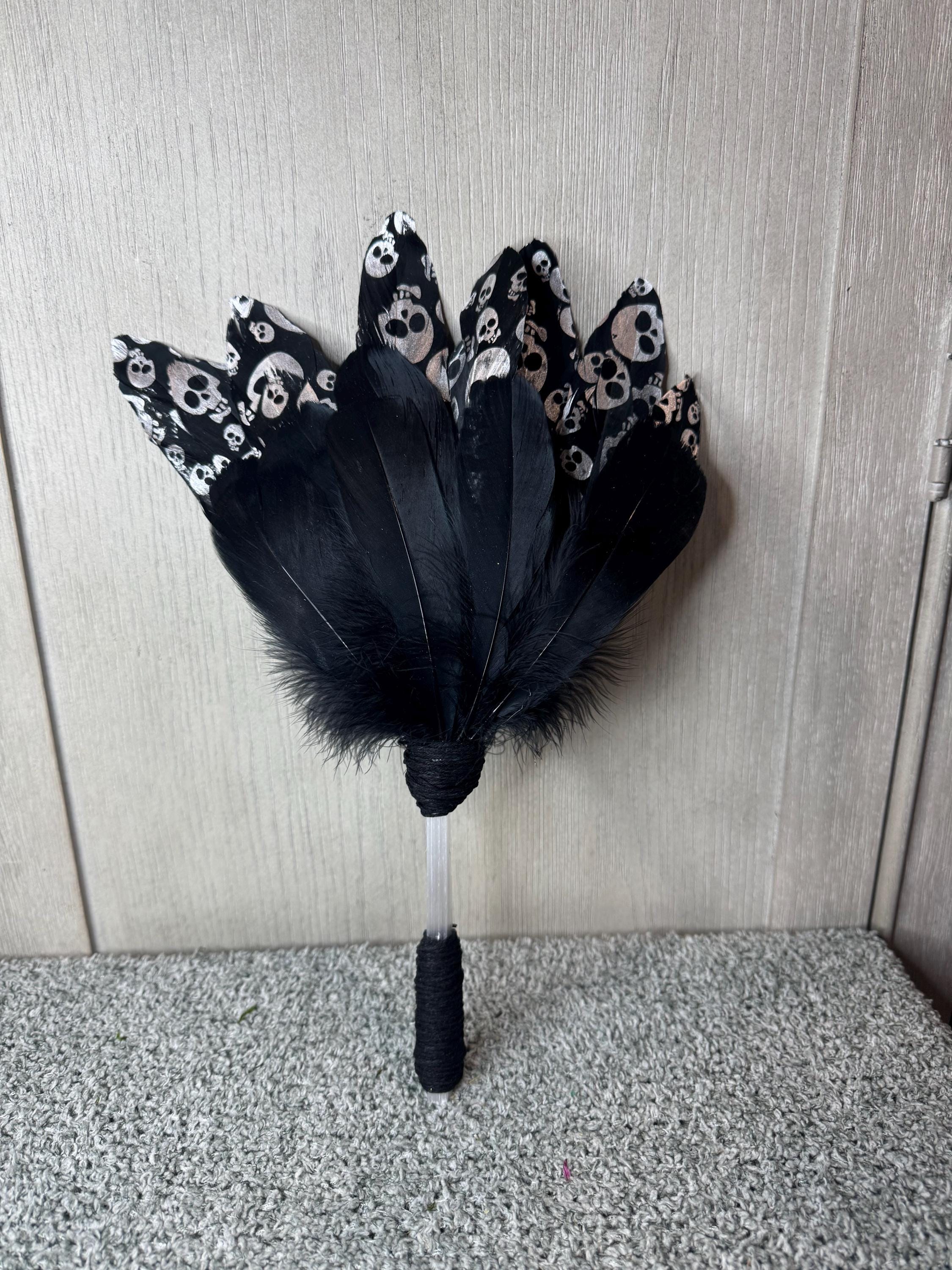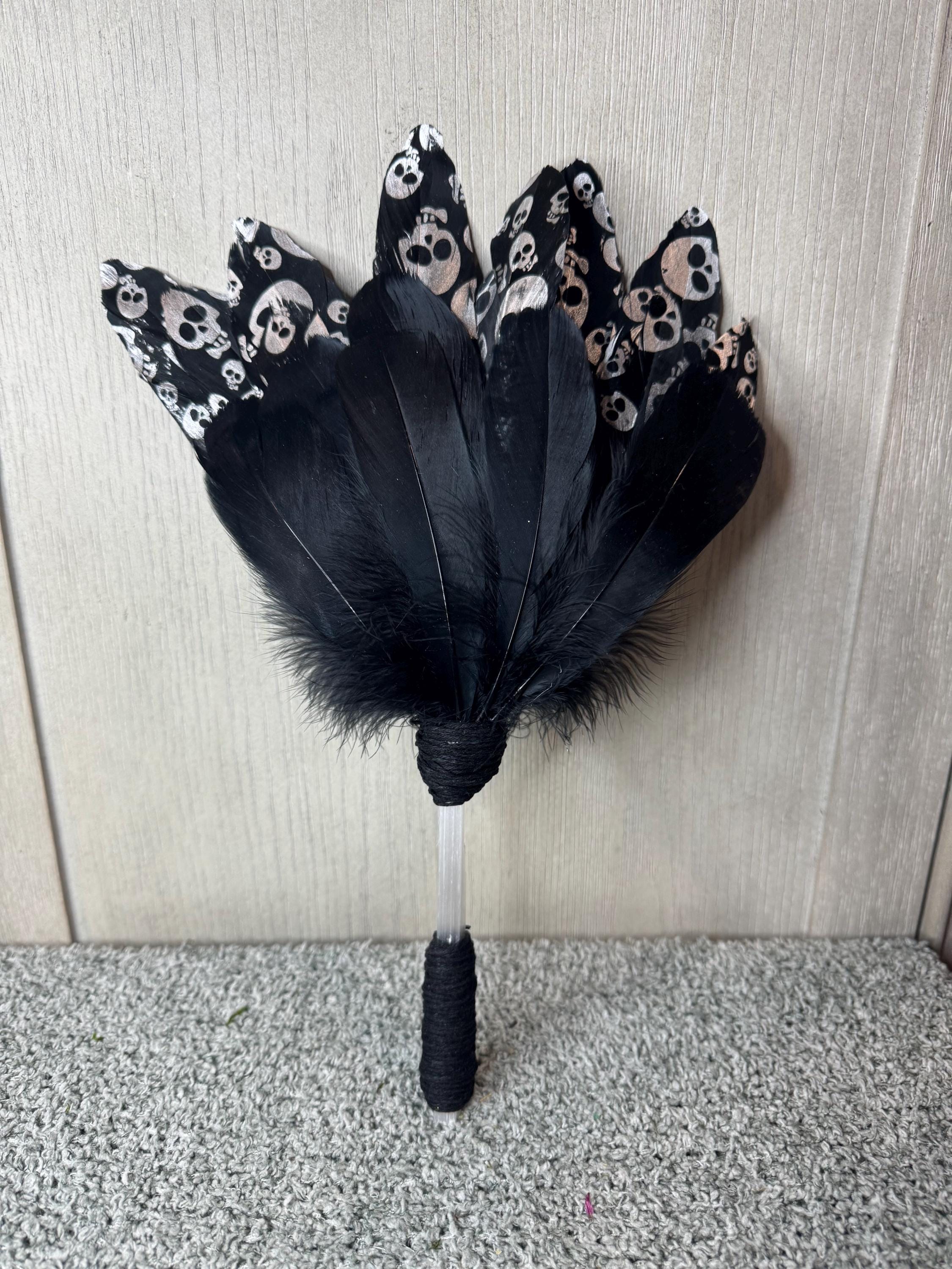 Smudging Fan. Made with Black feathers with silver Skulls, Black Feather, Selenite Handle, Wrapped with Black Hemp String and measures approximately 13" Tall. Feather fans are primarily used in smudging ceremonies, where sacred herbs like sage, cedar, sweetgrass, or copal are burned. The fan directs the smoke over people or sacred items, sweeping away negativity, calling in blessings, and balancing the spiritual body. Blessed Be!