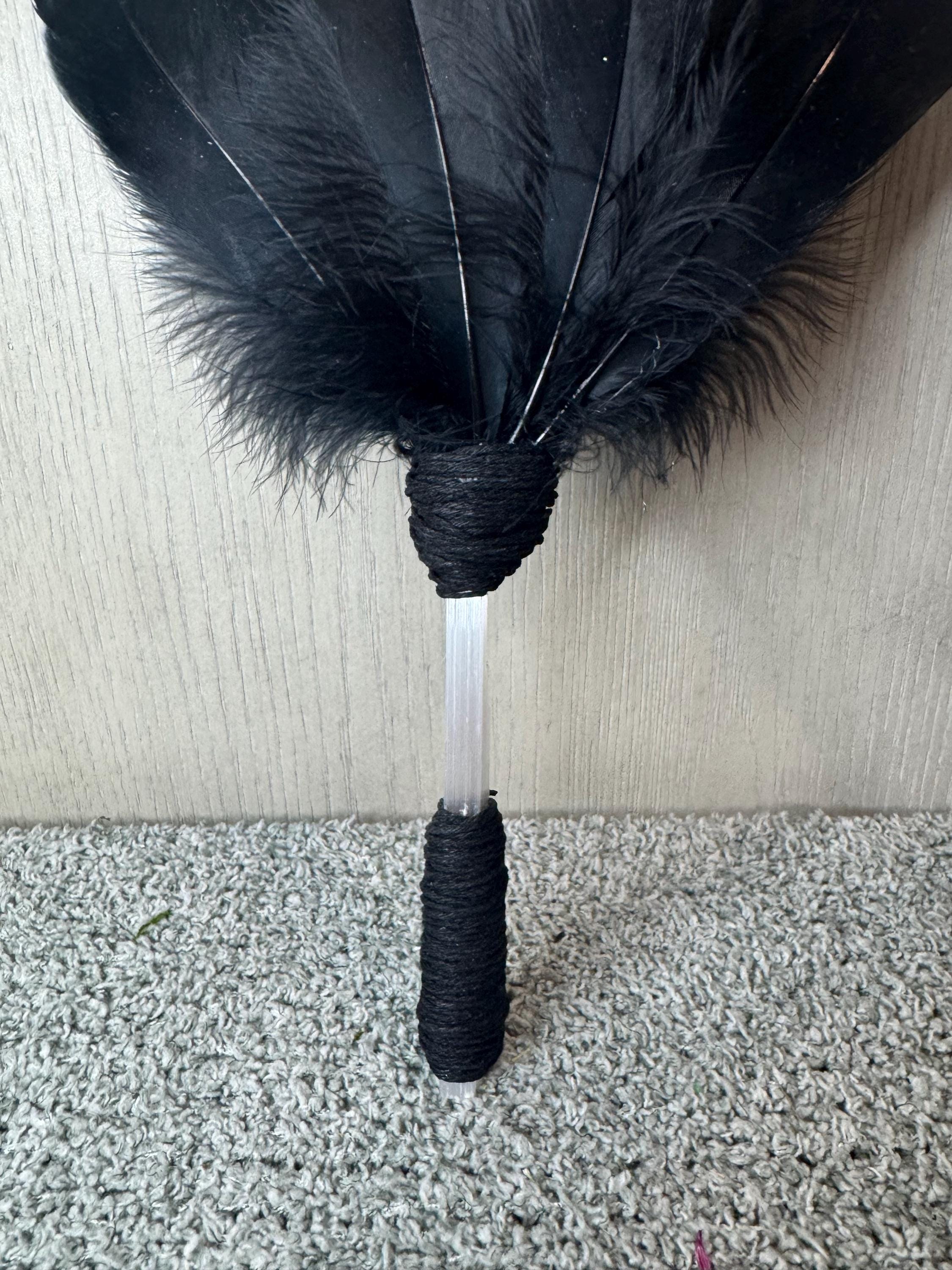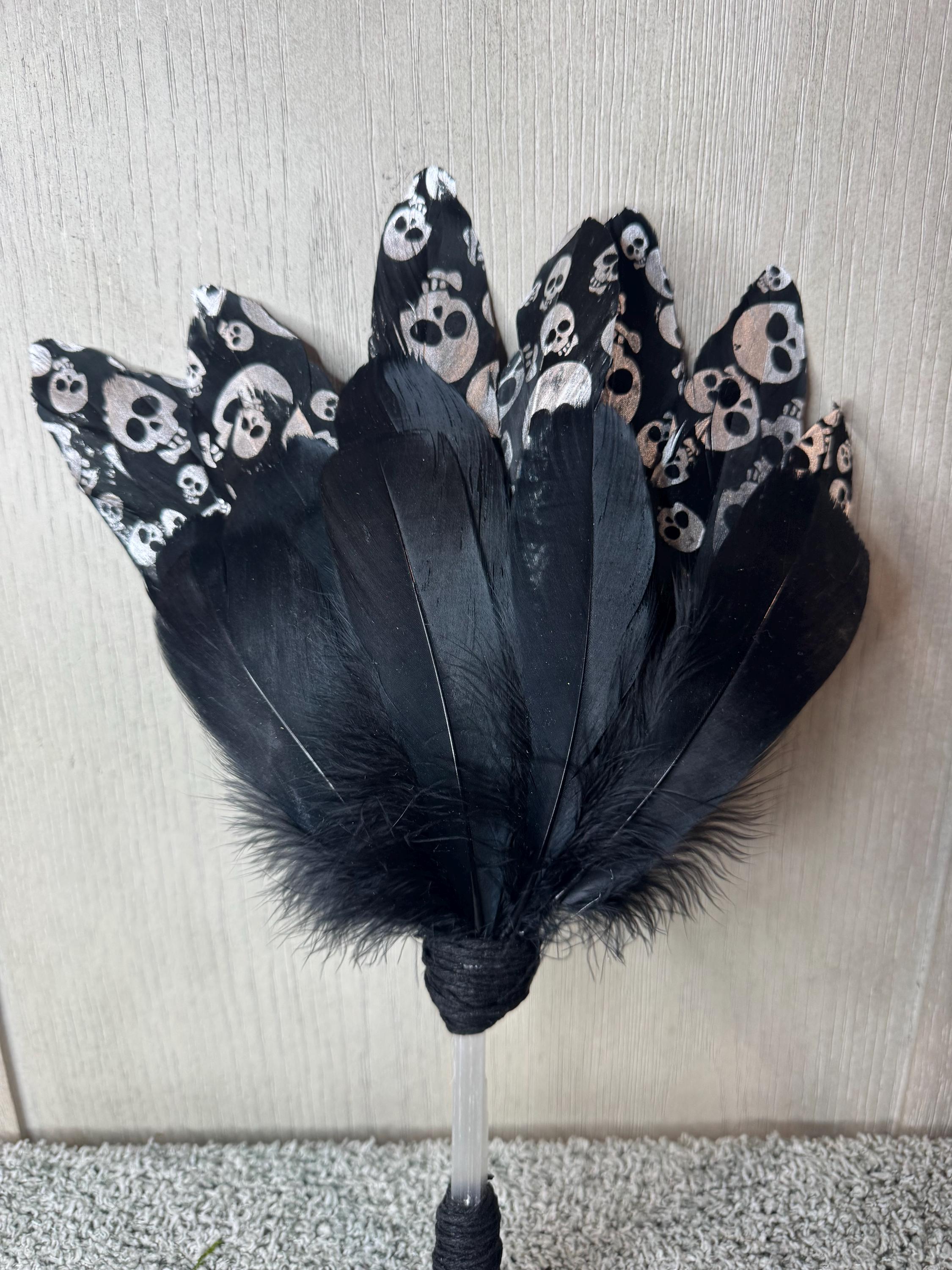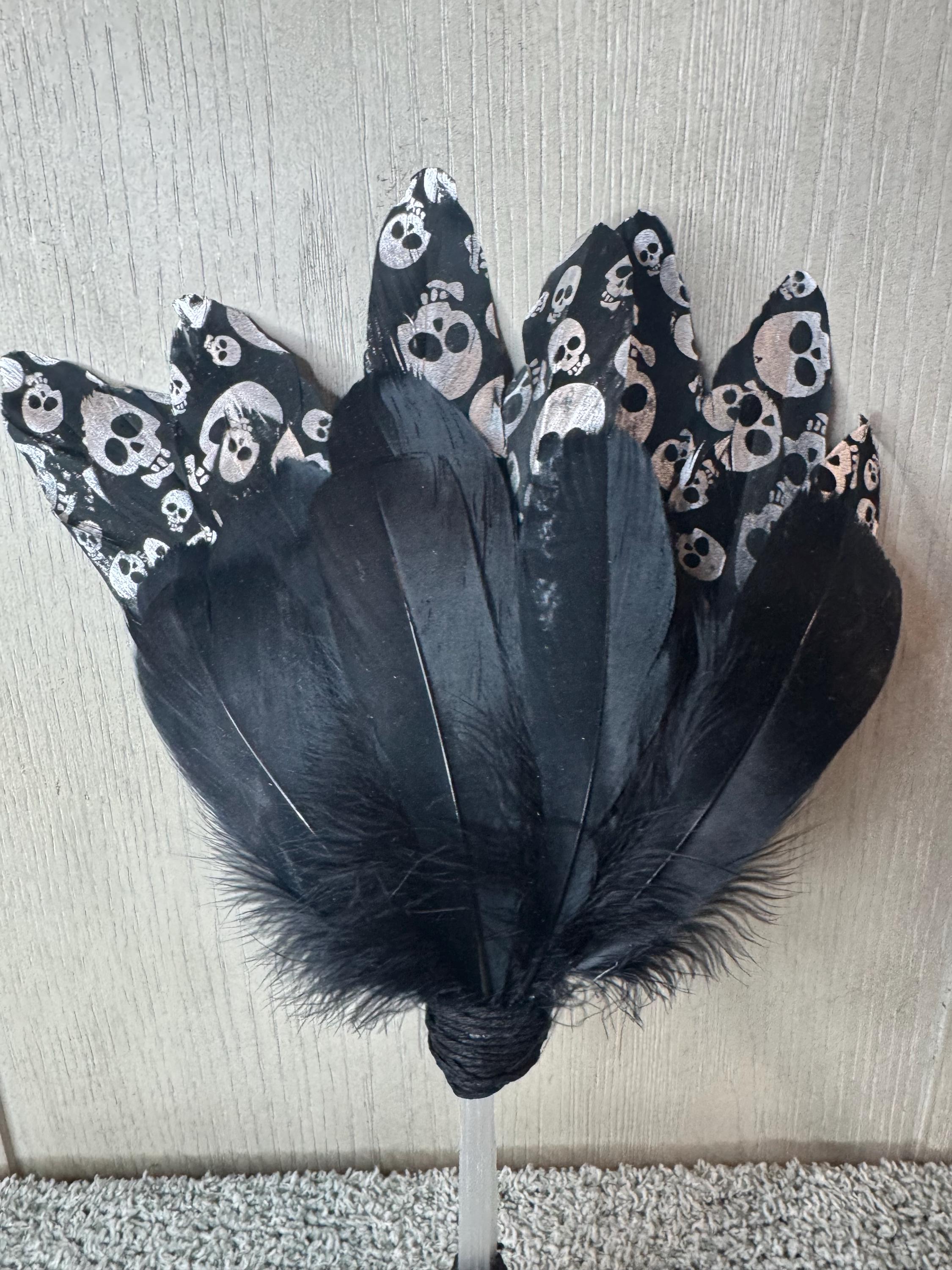 Smudging Fan. Made with Black feathers with silver Skulls, Black Feather, Selenite Handle, Wrapped with Black Hemp String and measures approximately 13" Tall. Feather fans are primarily used in smudging ceremonies, where sacred herbs like sage, cedar, sweetgrass, or copal are burned. The fan directs the smoke over people or sacred items, sweeping away negativity, calling in blessings, and balancing the spiritual body. Blessed Be!