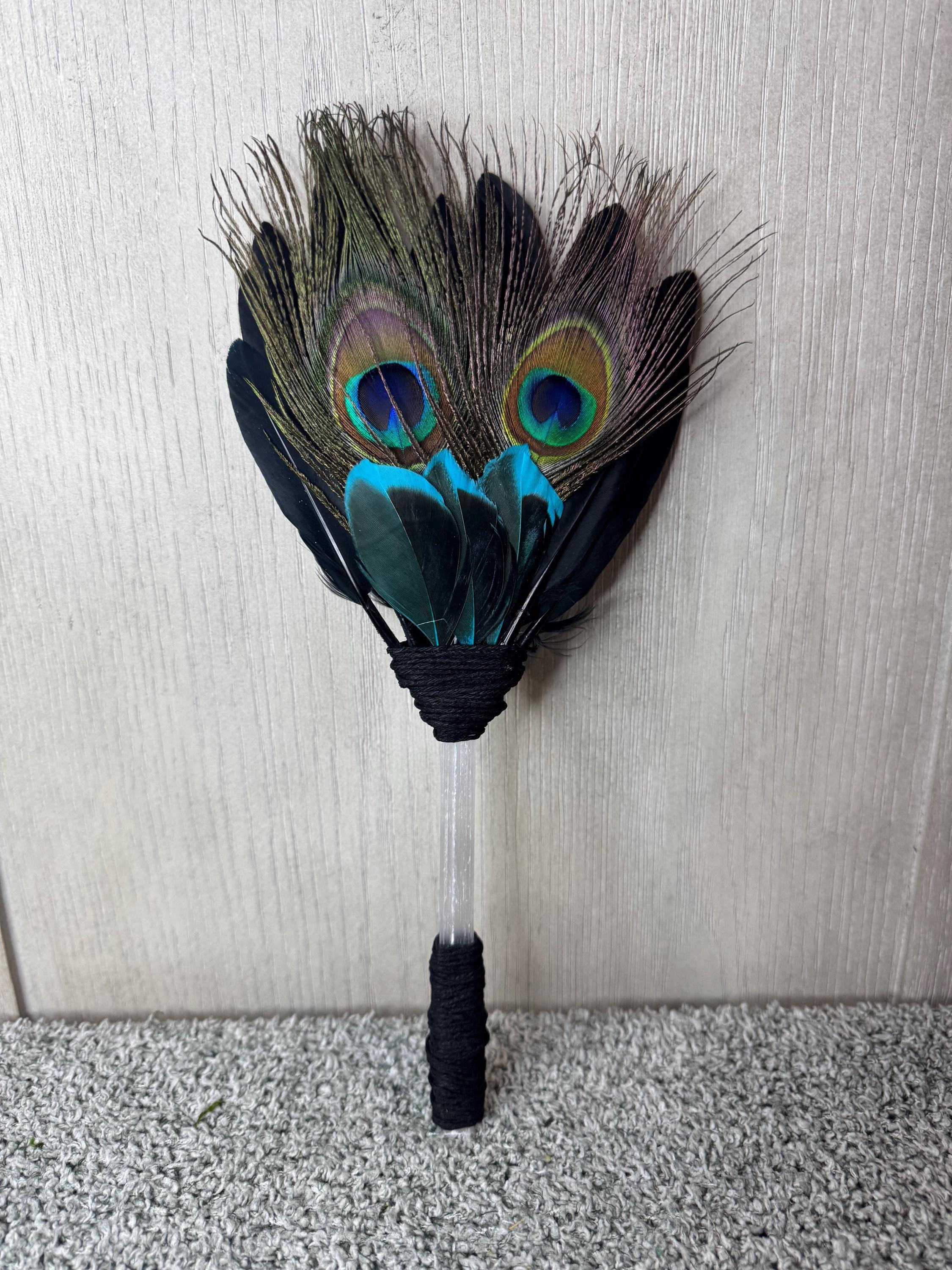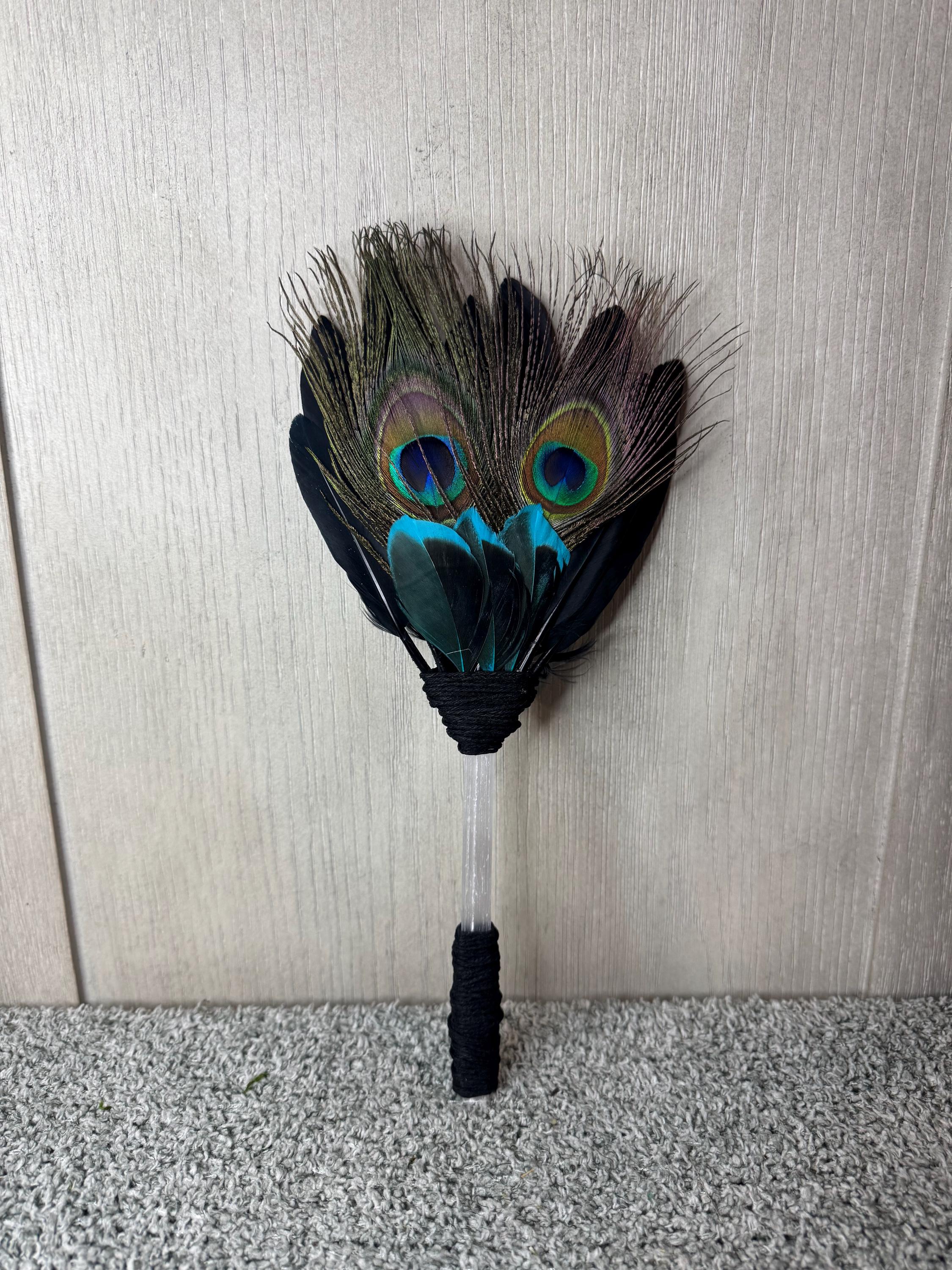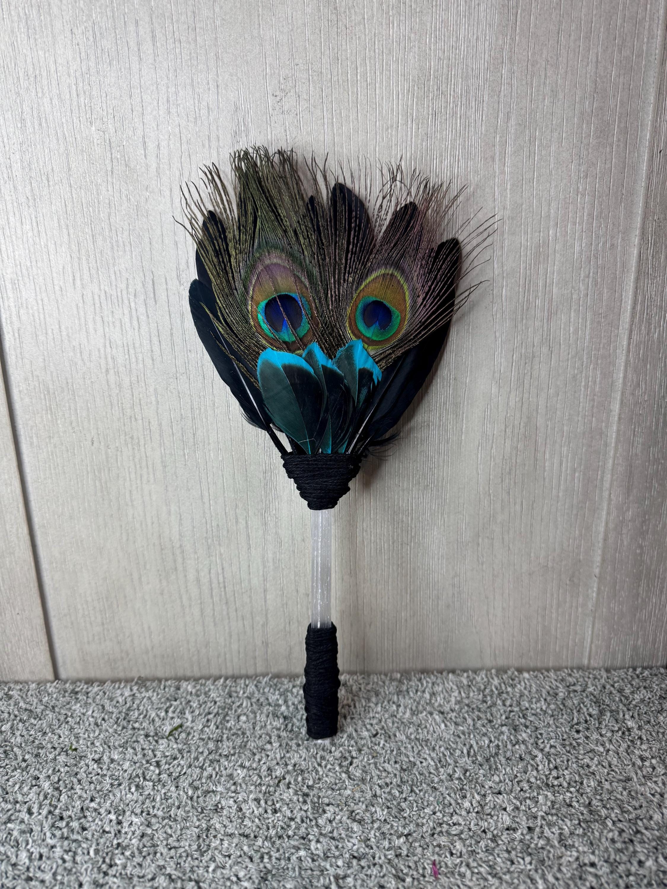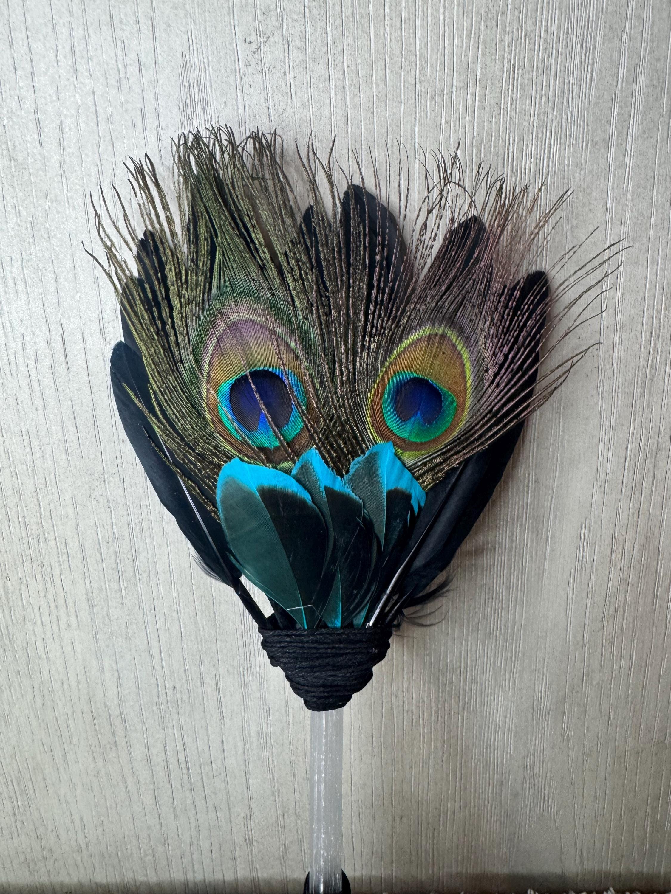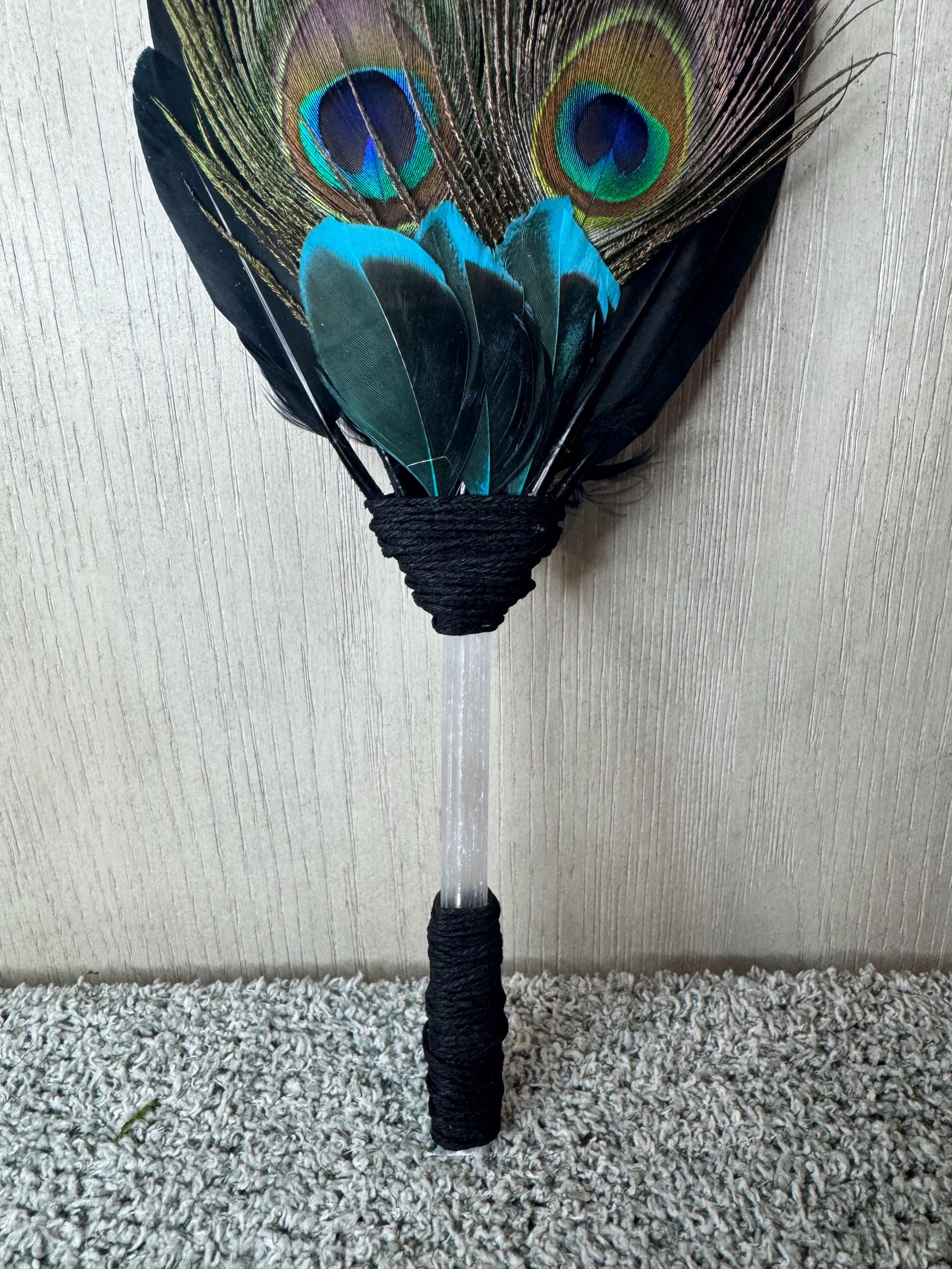 Smudging Ceremony Fan made from Selenite (Handle), Peacock Feathers, Black Feathers, and blue & black feathers, Handle and around feathers its wrapped with black hemp string. Feather fans are primarily used in smudging ceremonies, where sacred herbs like sage, cedar, sweetgrass, or copal are burned. The fan directs the smoke over people or sacred items, sweeping away negativity, calling in blessings, and balancing the spiritual body. Blessed Be!