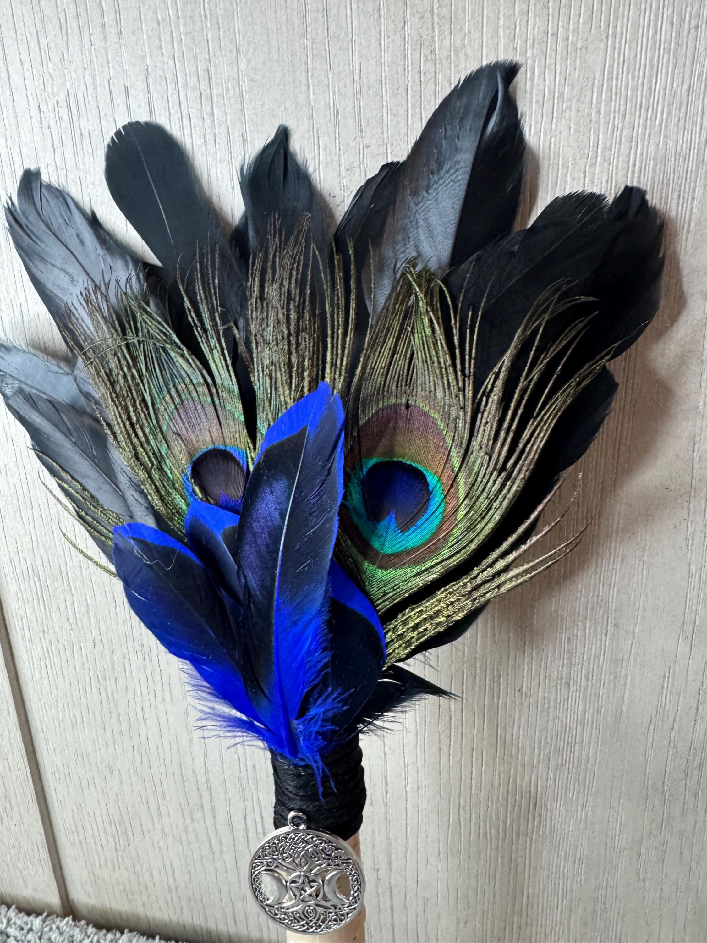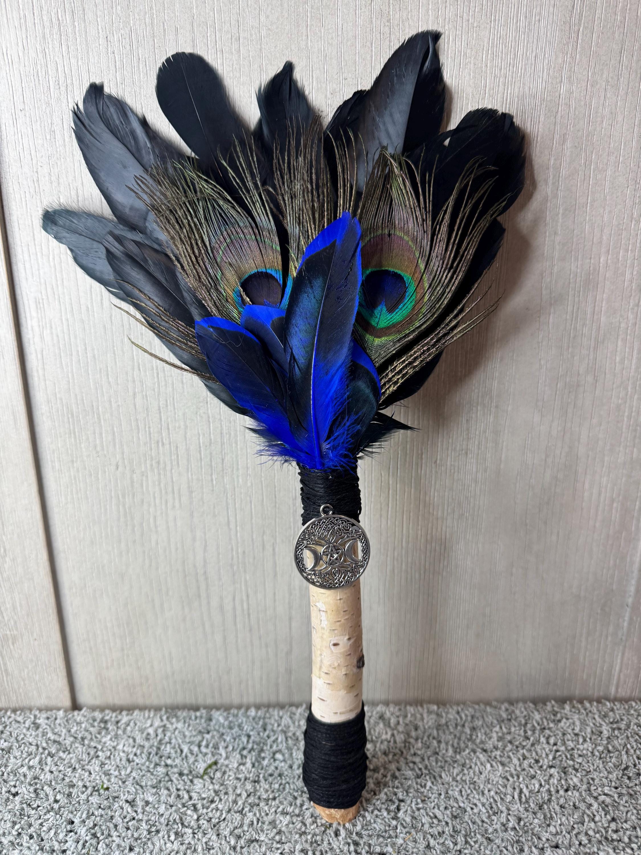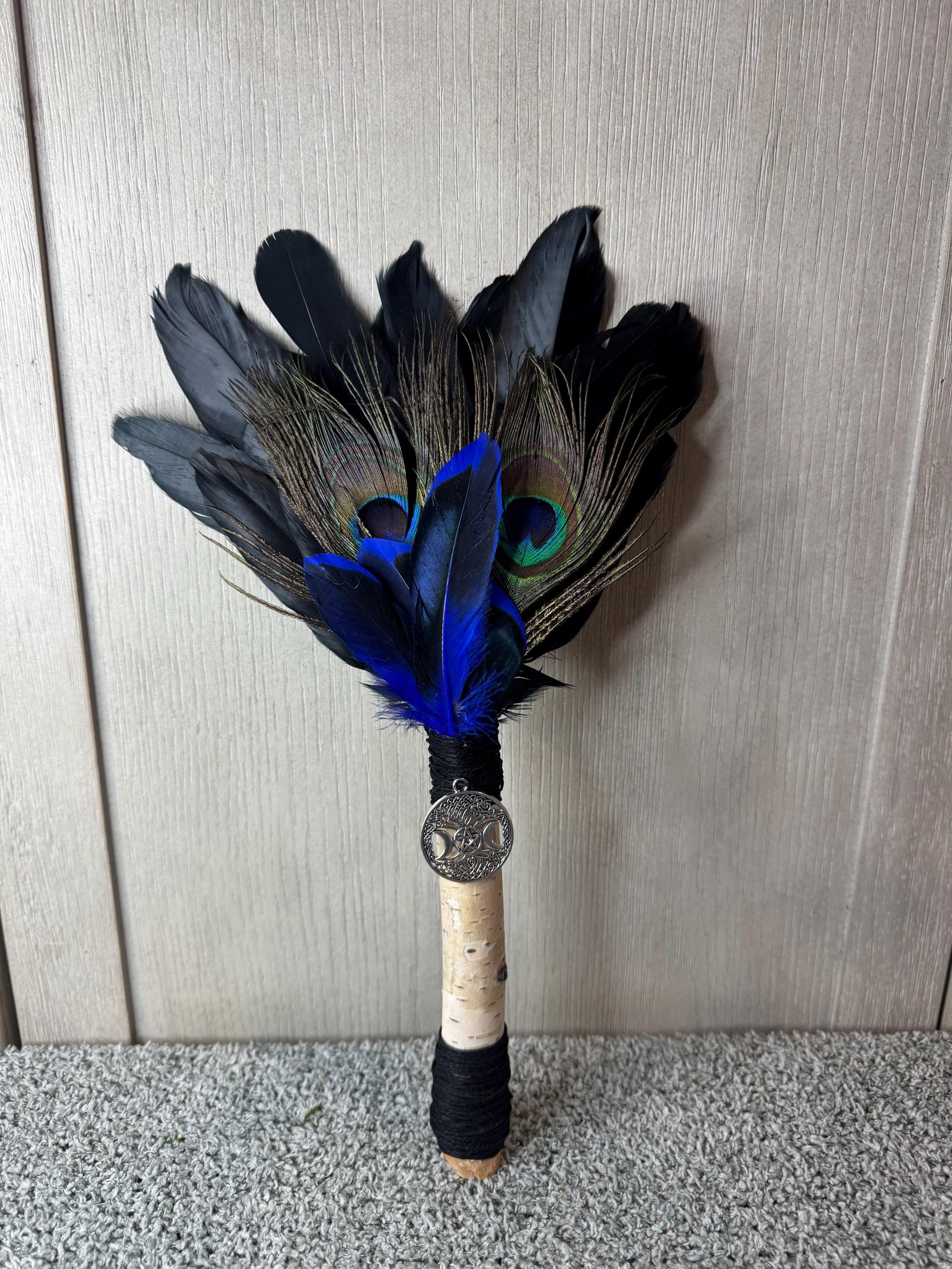 Smudging Feather Fan for magical ceremonies and smudging spaces. Made with Peacock and various feathers, White Birch Tree Handle with a tree of life charm. White Birch wood is versatile and stands for new beginnings in many cultures due to its role as a pioneer species, and it also symbolizes purification, renewal, and resilience. NO trees were damaged for the handle; handle was made by fallen branches from our farm. Fan measures approximately `5" tall and wrapped with black hemp string. Feathers are all harvested FALLEN feathers, NOT PLUCKED. Blessed Be!