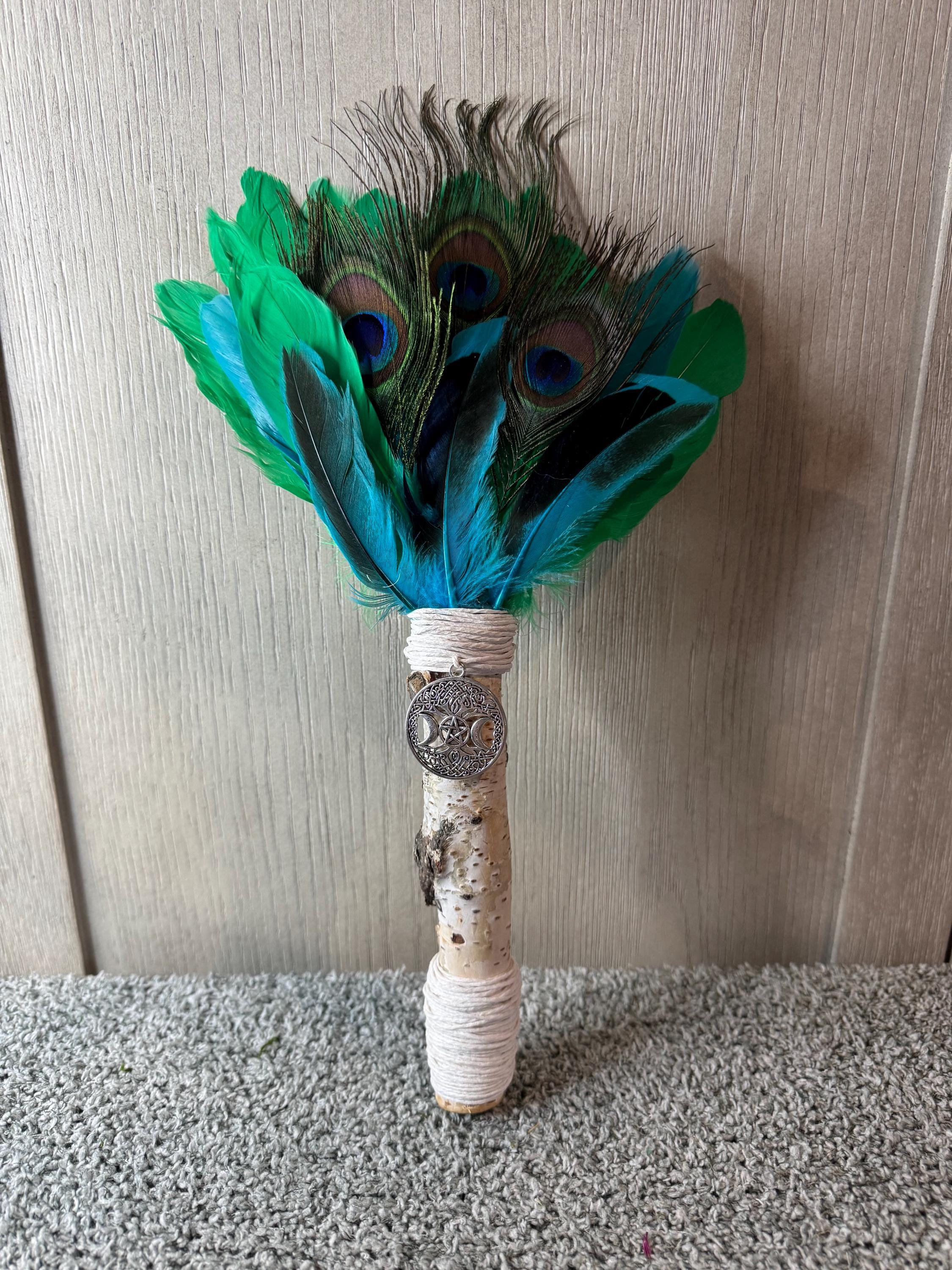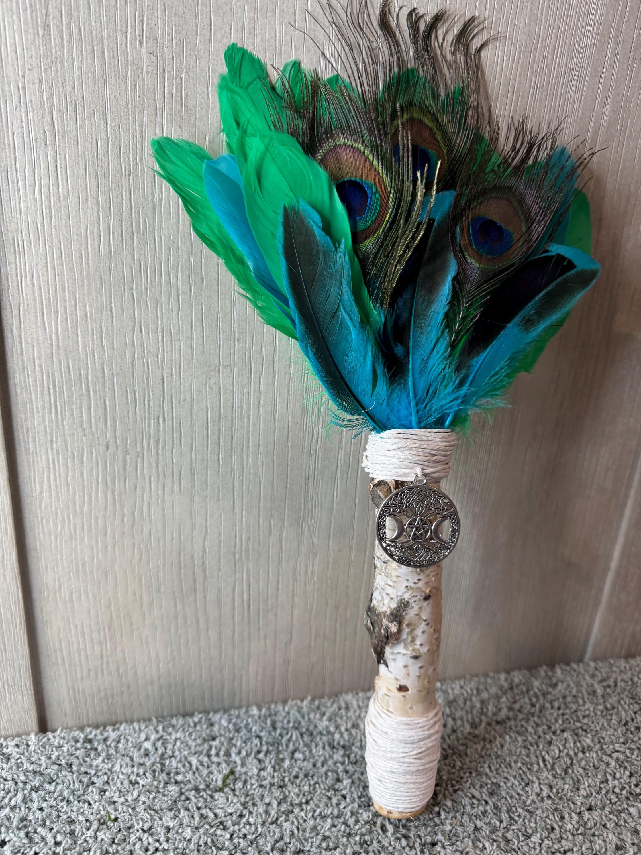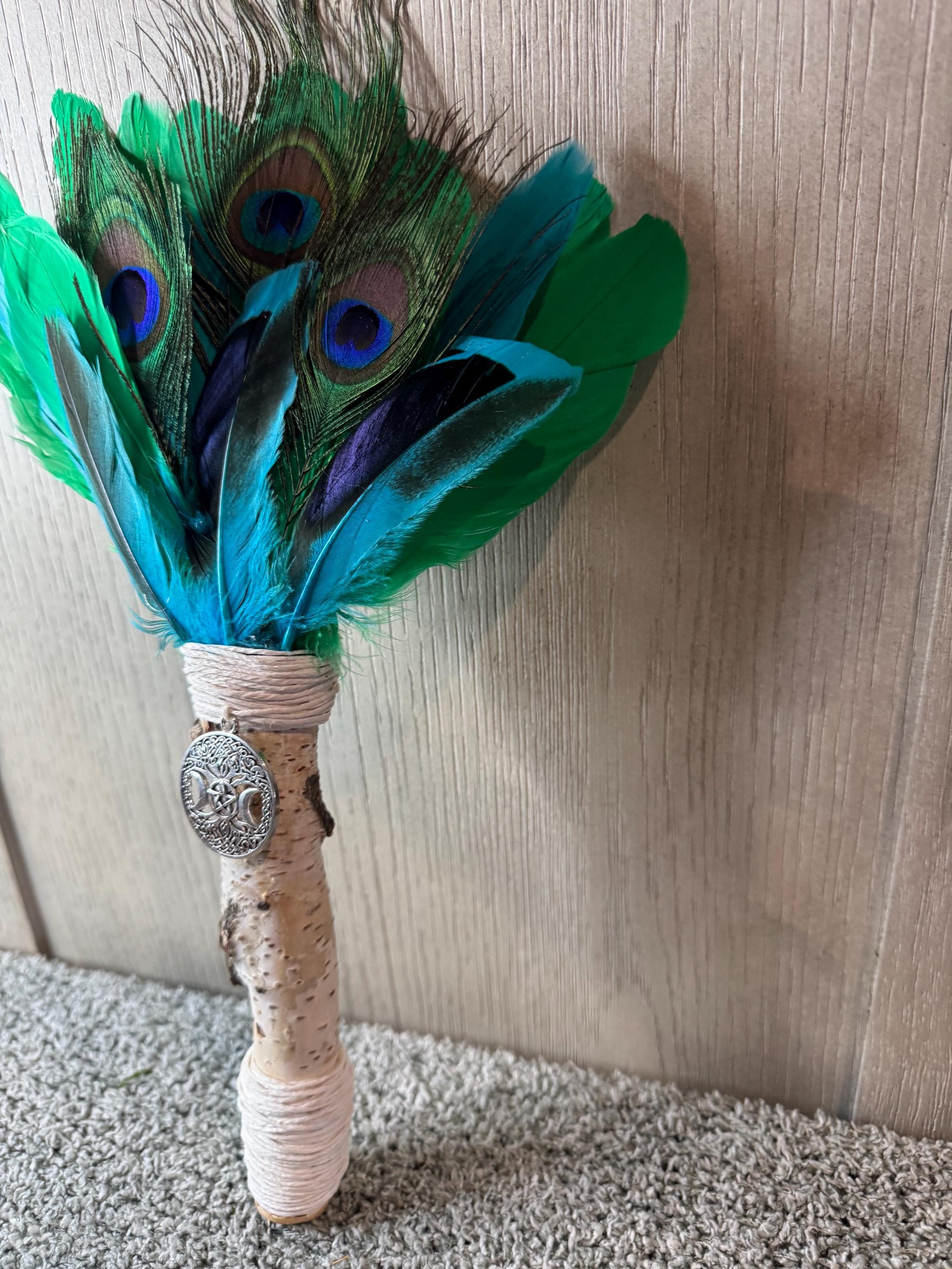 Smudge Feather Fan for magical ceremonies and smudging spaces. Made of White Birch Wood Handle, Peacock feathers and various feathers (The feathers are all harvested FALLEN feathers, NOT PLUCKED. The BIRCH WOOD are FALLEN branches on the farm). The feathers and handle are securely wrapped with white hemp string and has a silver Tree of Life charm. White Birch wood is versatile and stands for new beginnings in many cultures due to its role as a pioneer species, and it also symbolizes purification, renewal, and resilience. Blessed Be!
