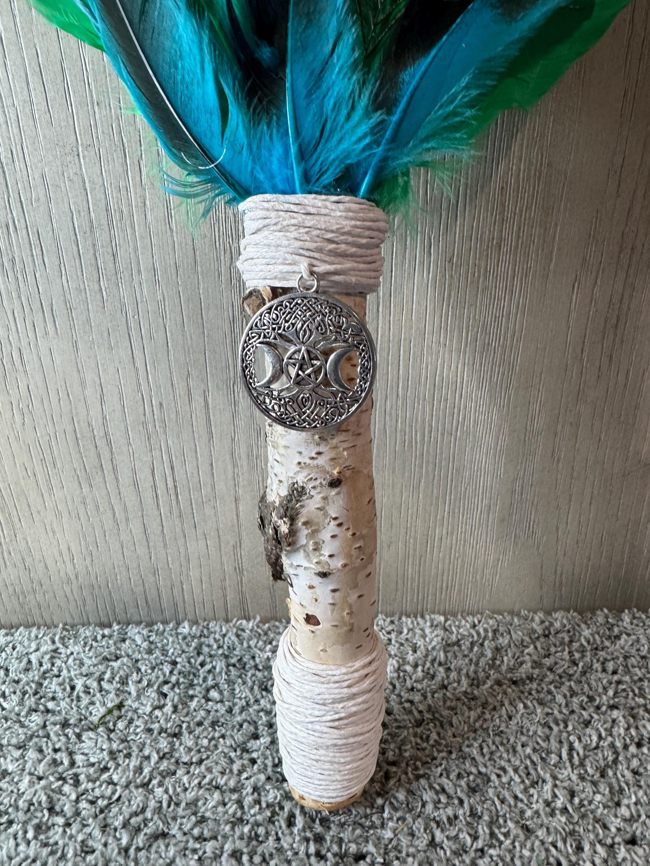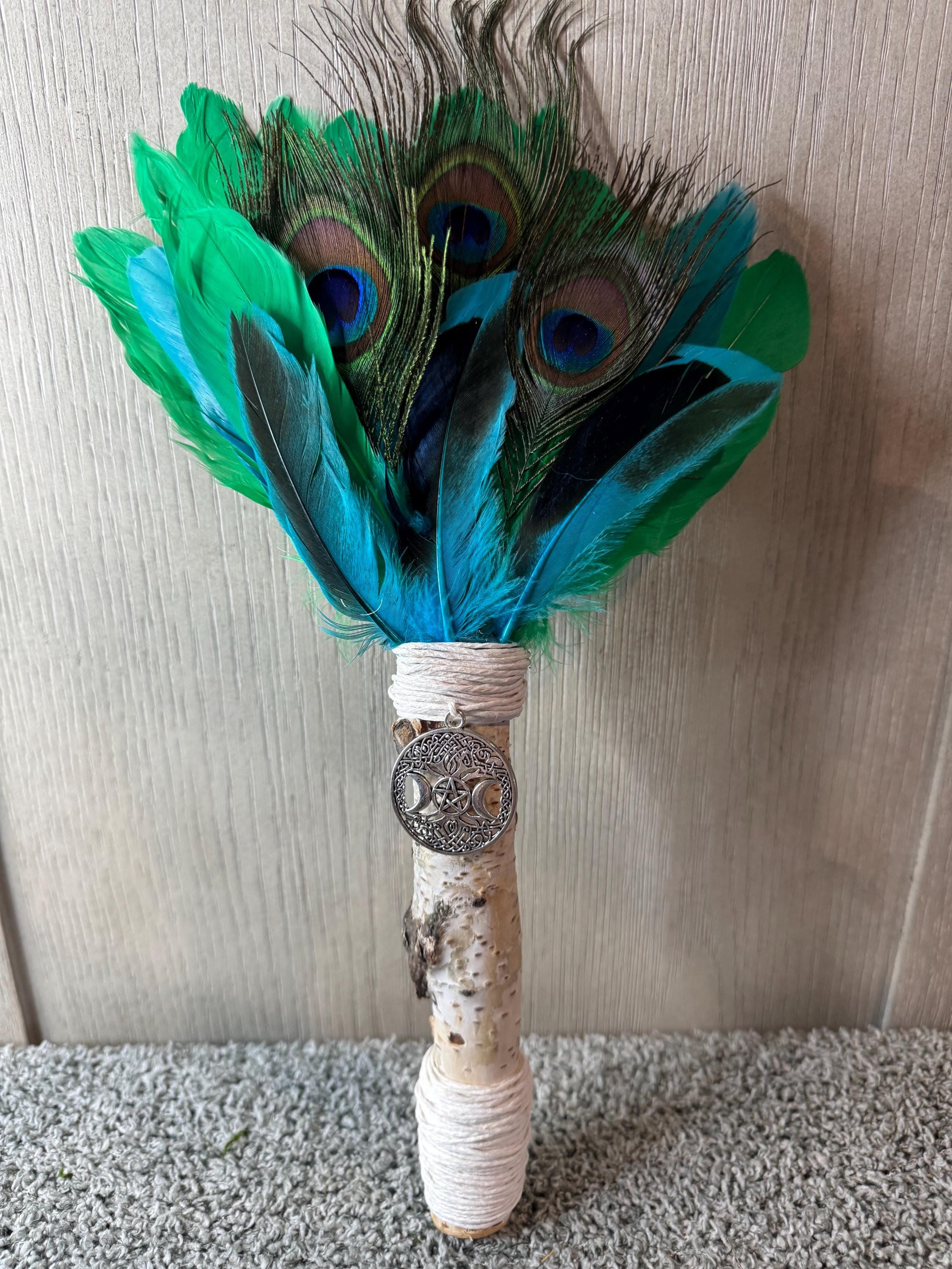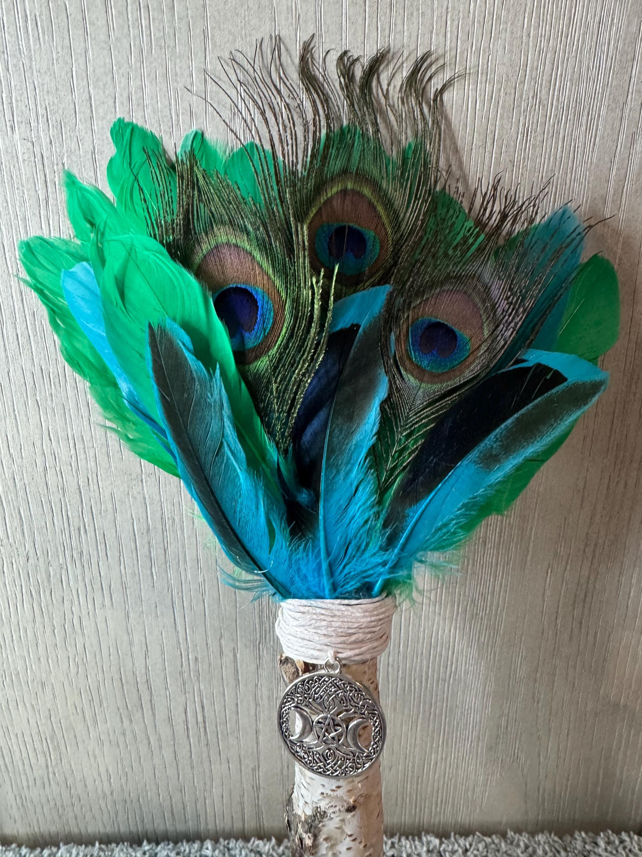 Smudge Feather Fan for magical ceremonies and smudging spaces. Made of White Birch Wood Handle, Peacock feathers and various feathers (The feathers are all harvested FALLEN feathers, NOT PLUCKED. The BIRCH WOOD are FALLEN branches on the farm). The feathers and handle are securely wrapped with white hemp string and has a silver Tree of Life charm. White Birch wood is versatile and stands for new beginnings in many cultures due to its role as a pioneer species, and it also symbolizes purification, renewal, and resilience. Blessed Be!