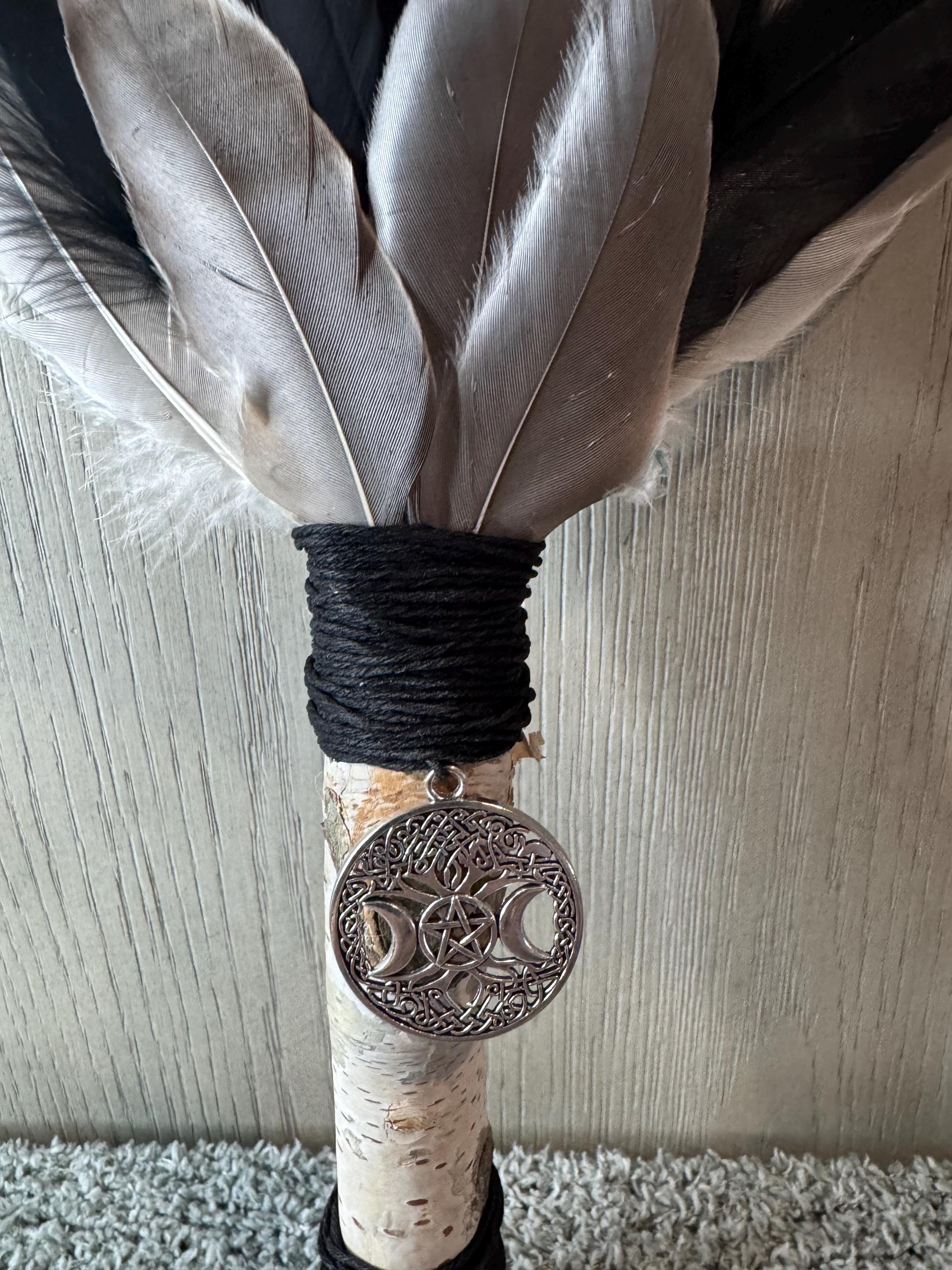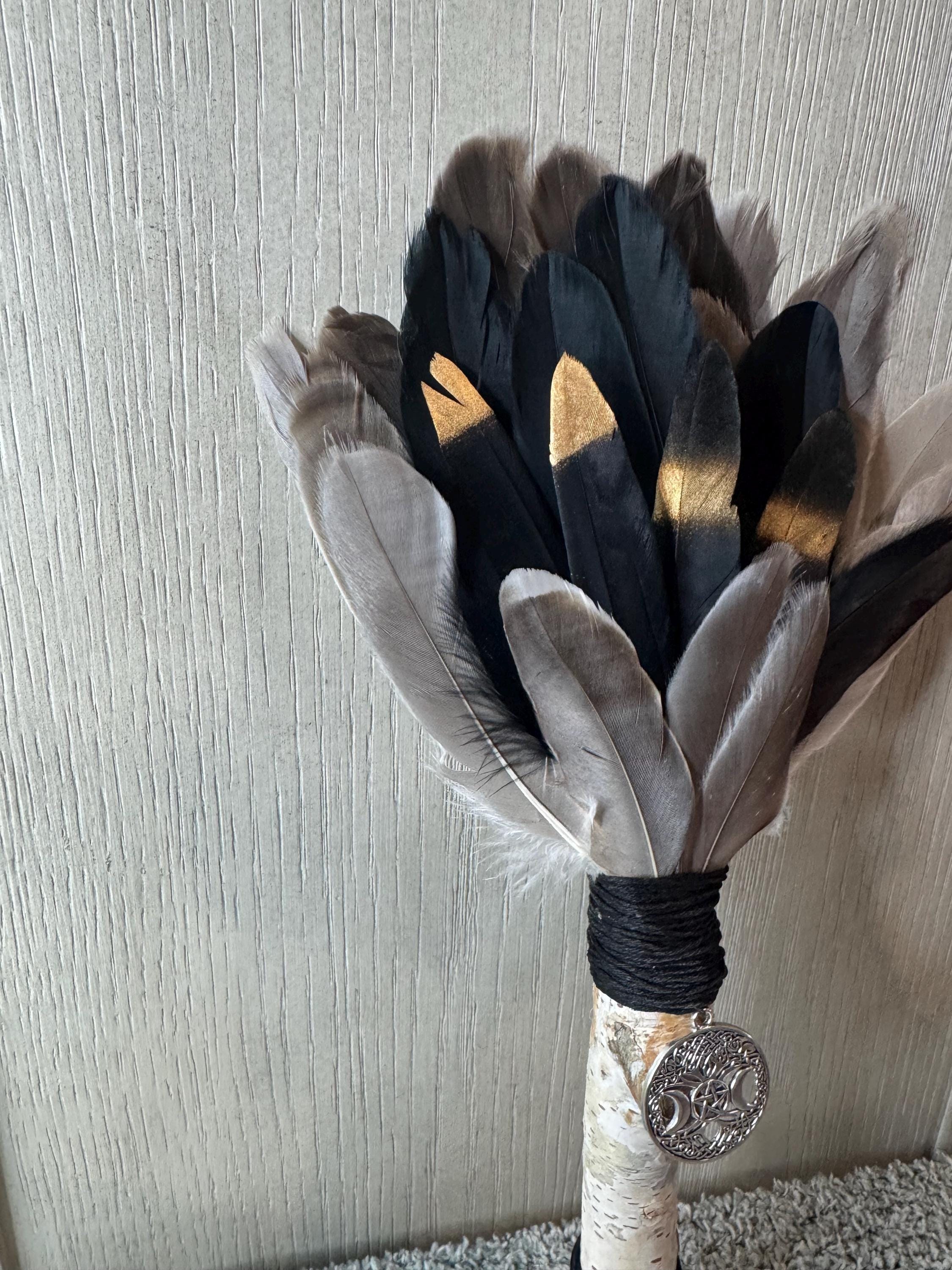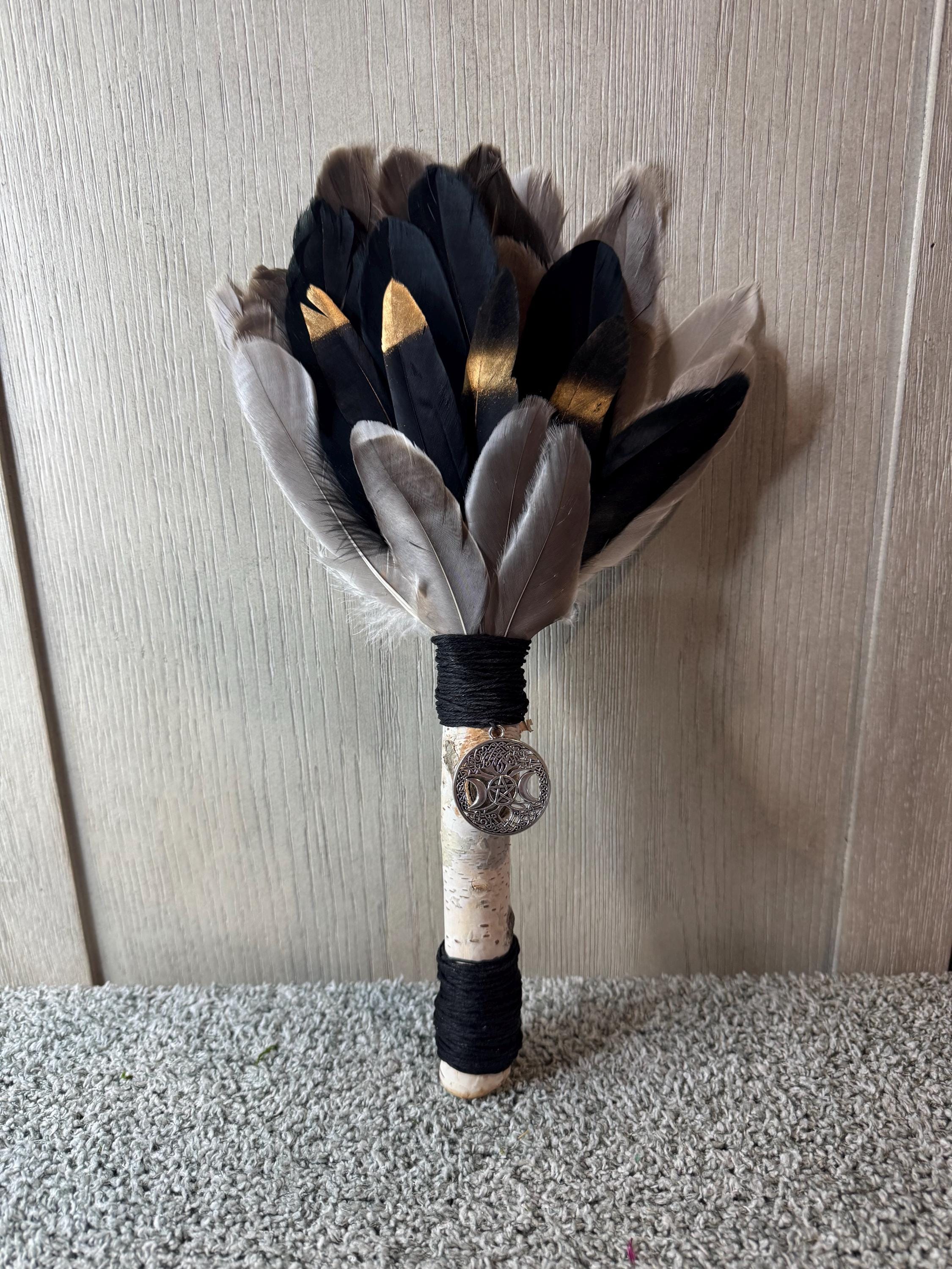 Smudge Feather Fan for magical ceremonies and smudging spaces. The handle is made of white birch wood, white birch wood is versatile and stands for new beginnings in many cultures due to its role as a pioneer species, and it also symbolizes purification, renewal, and resilience. The wood is NOT cut down it is fallen branches on the farm, and feathers are all harvested FALLEN feathers, NOT PLUCKED. The hand and feathers are securely wrapped in black hemp string. Blessed Be!