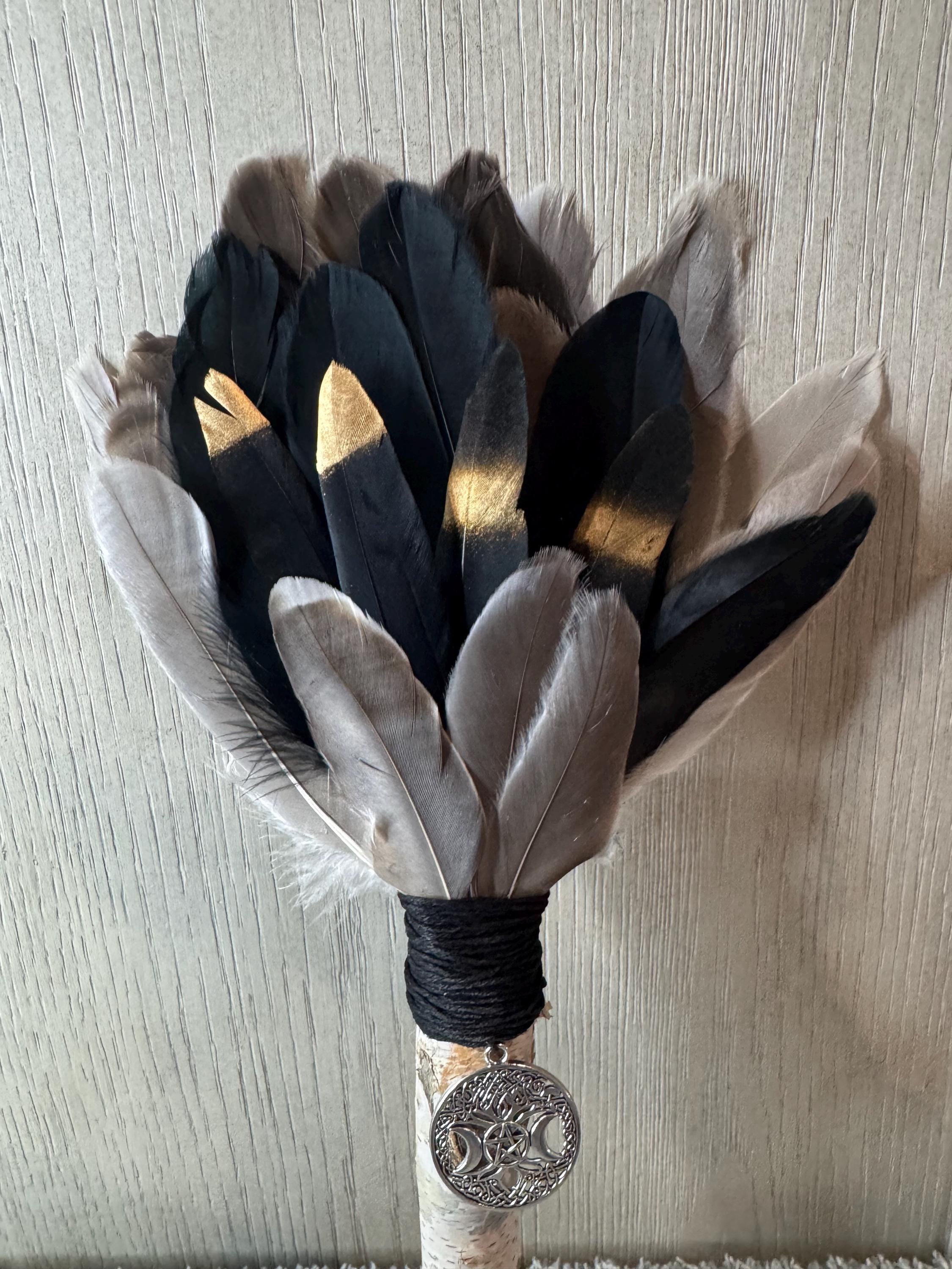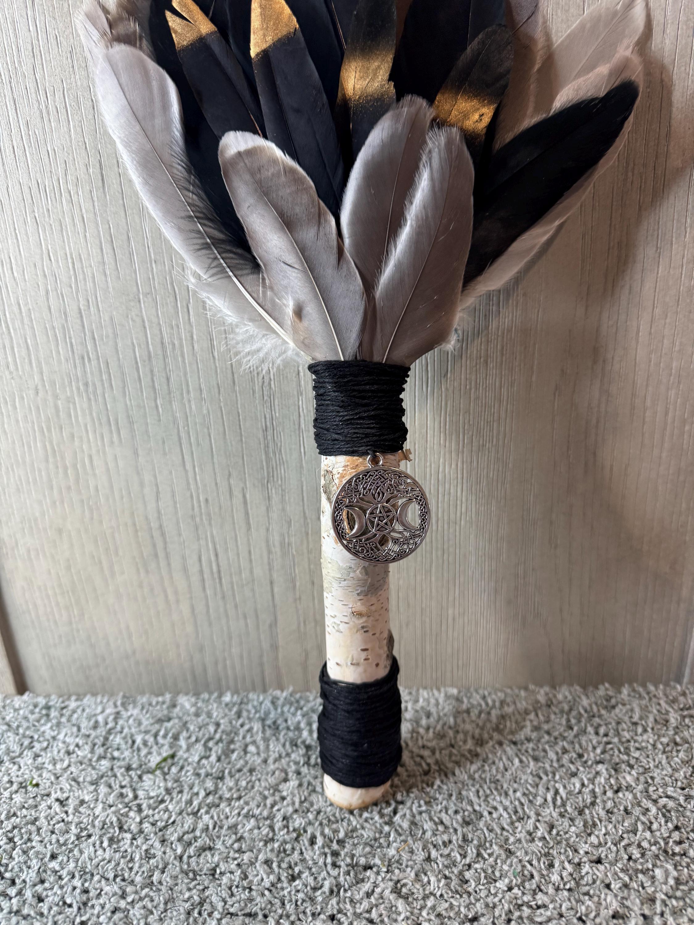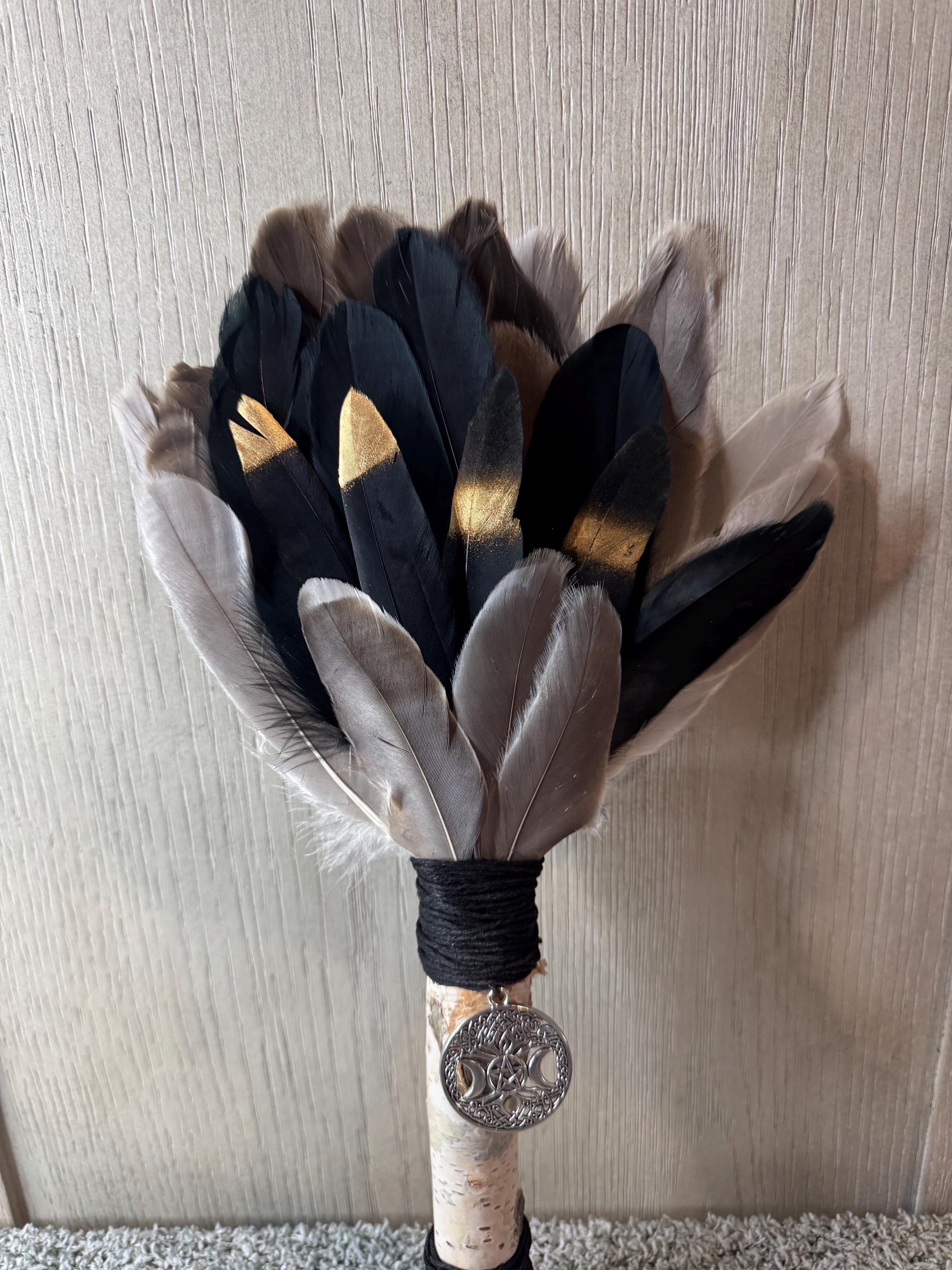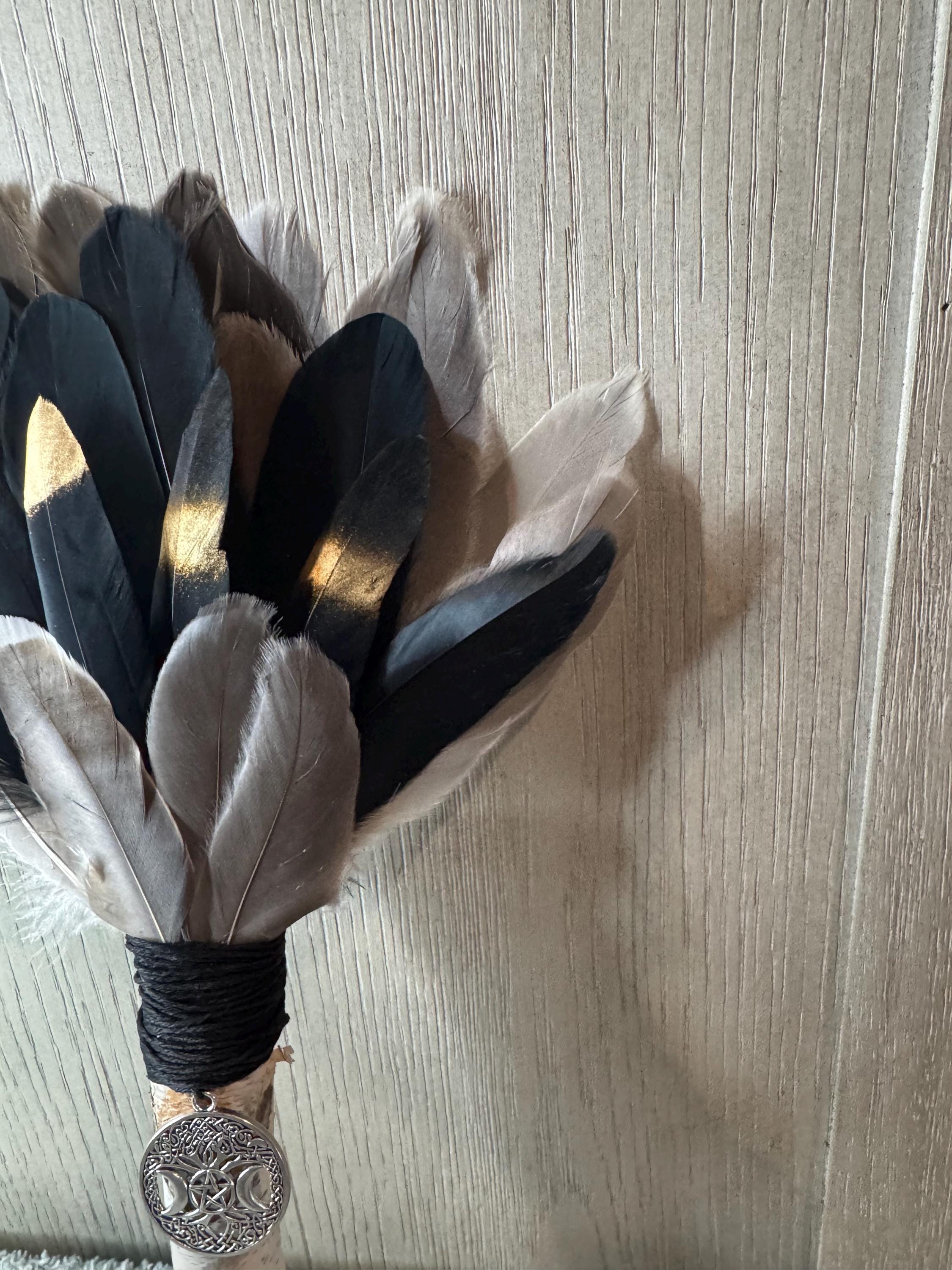 Smudge Feather Fan for magical ceremonies and smudging spaces. The handle is made of white birch wood, white birch wood is versatile and stands for new beginnings in many cultures due to its role as a pioneer species, and it also symbolizes purification, renewal, and resilience. The wood is NOT cut down it is fallen branches on the farm, and feathers are all harvested FALLEN feathers, NOT PLUCKED. The hand and feathers are securely wrapped in black hemp string. Blessed Be!