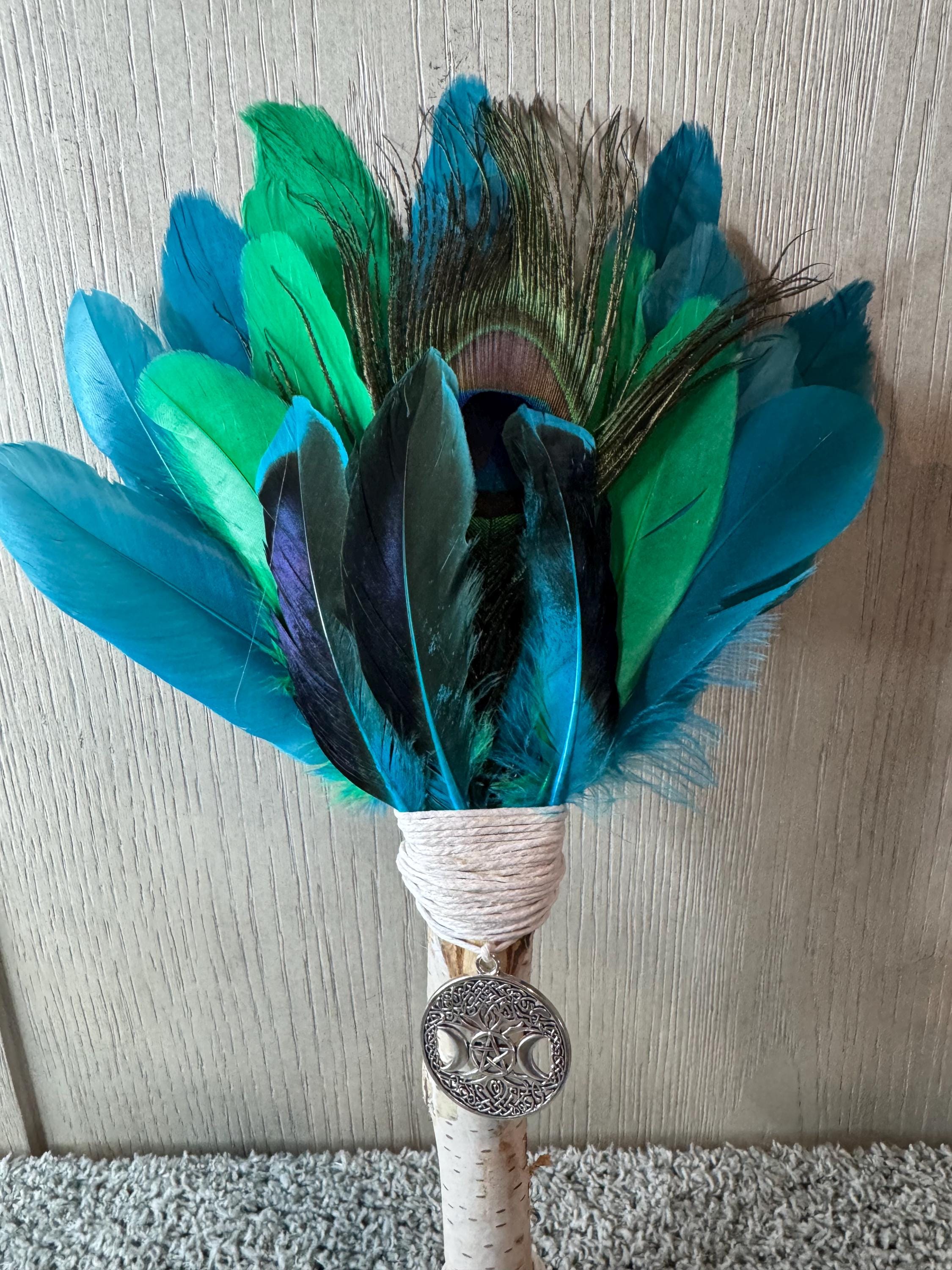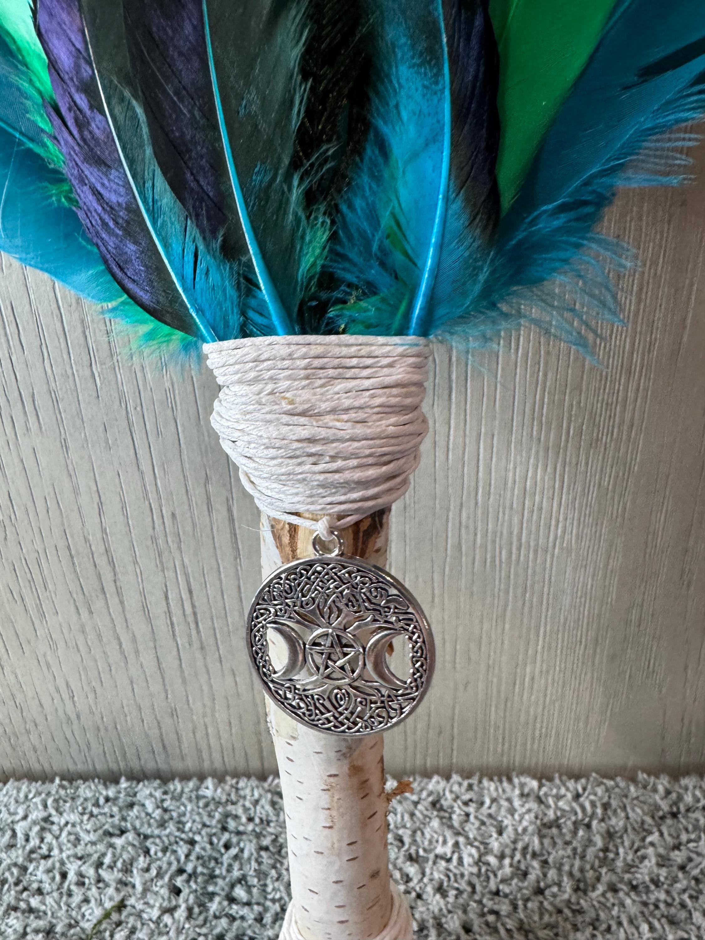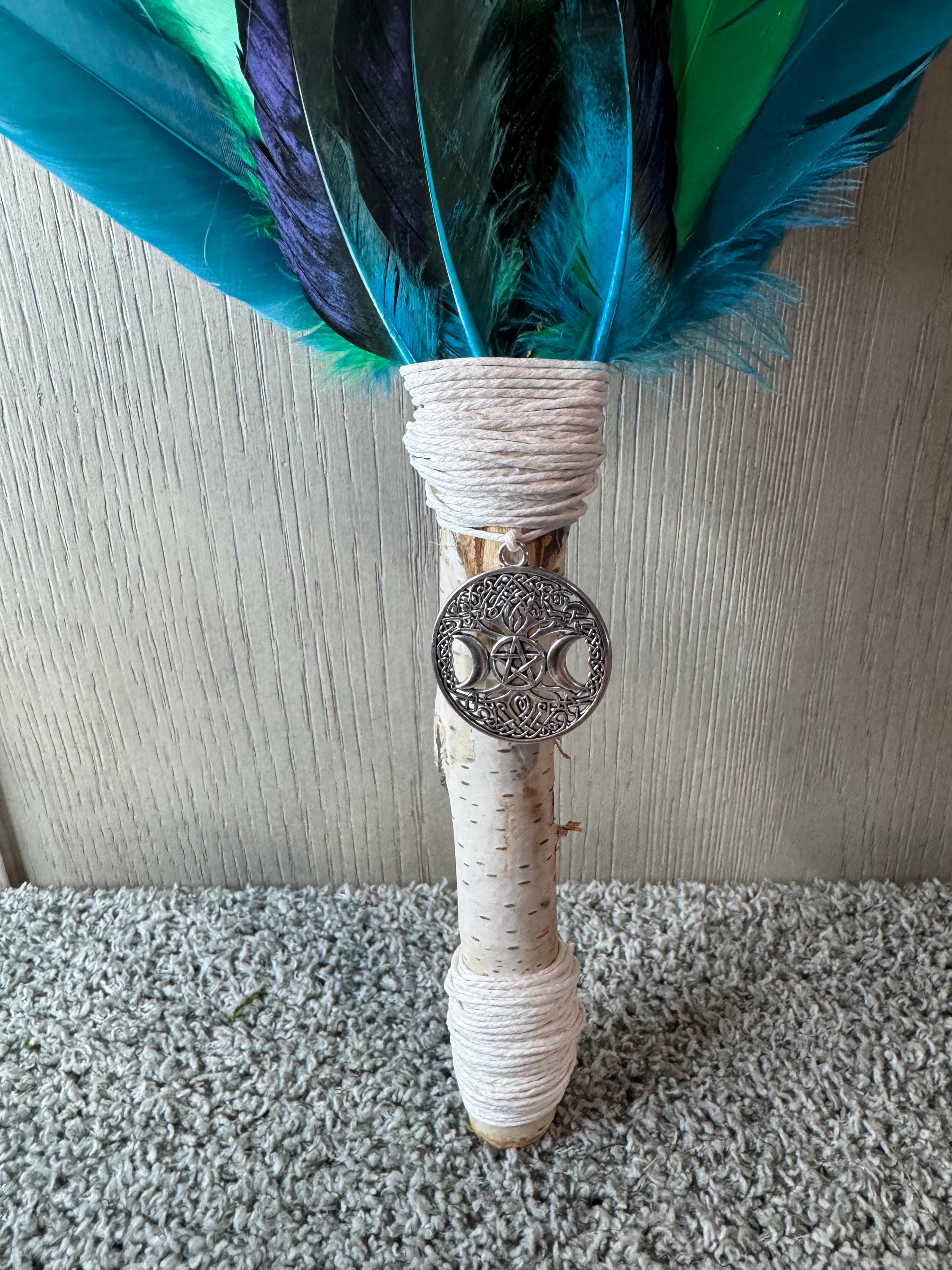 Smudge feather fan for magical ceremonies and smudging spaces. Made of Birch Wood, feathers, hemp string. The handle is white birch wood which stands for new beginnings and it also symbolizes purification, renewal, and resilience. I use branches that have fallen on the farm no trees are cut down. Feathers are all harvested FALLEN feathers, NOT PLUCKED. Handle and feathers are securely wrapped with hemp string and a silver Tree of Life charm is attached. Blessed Be!