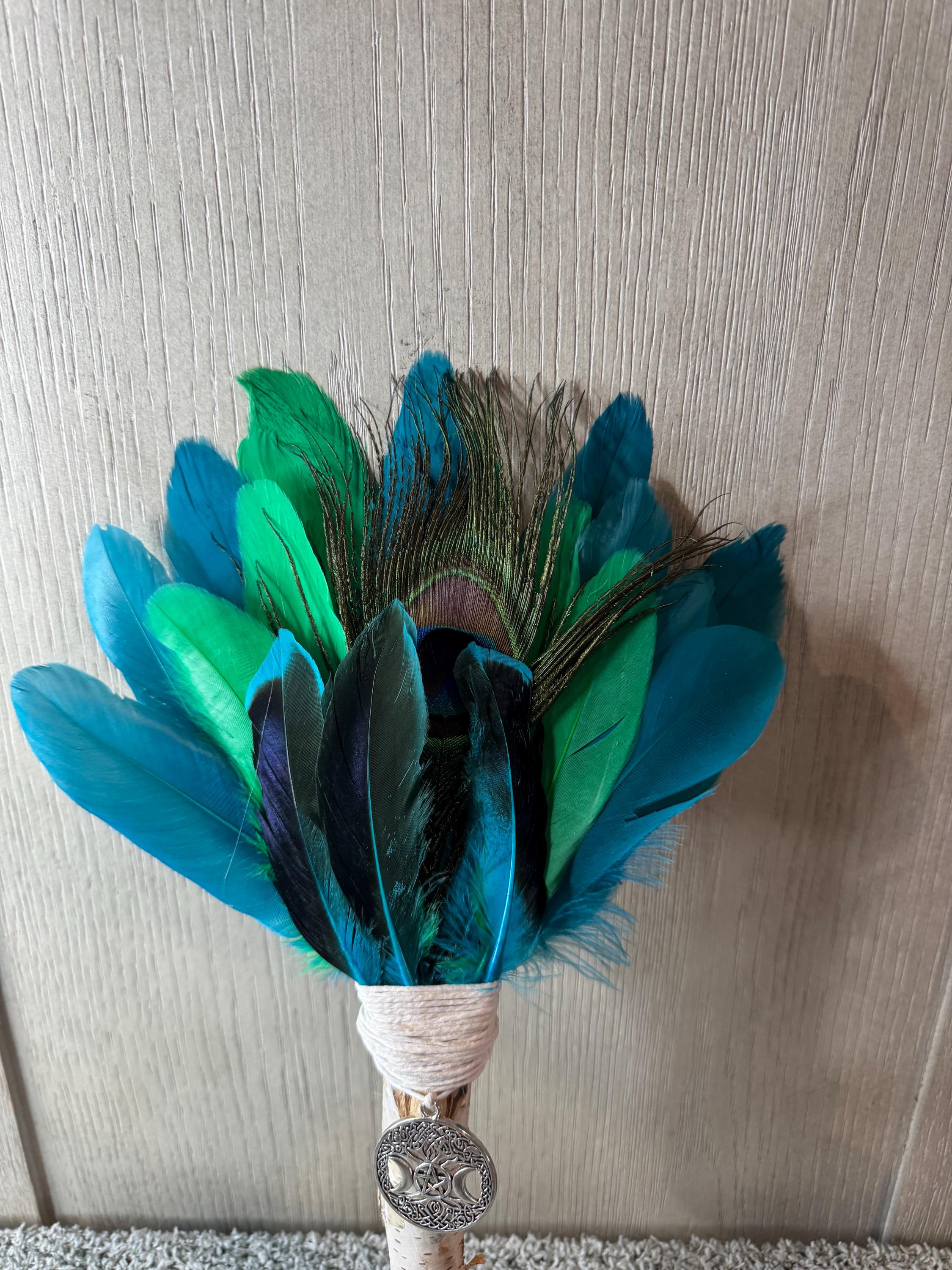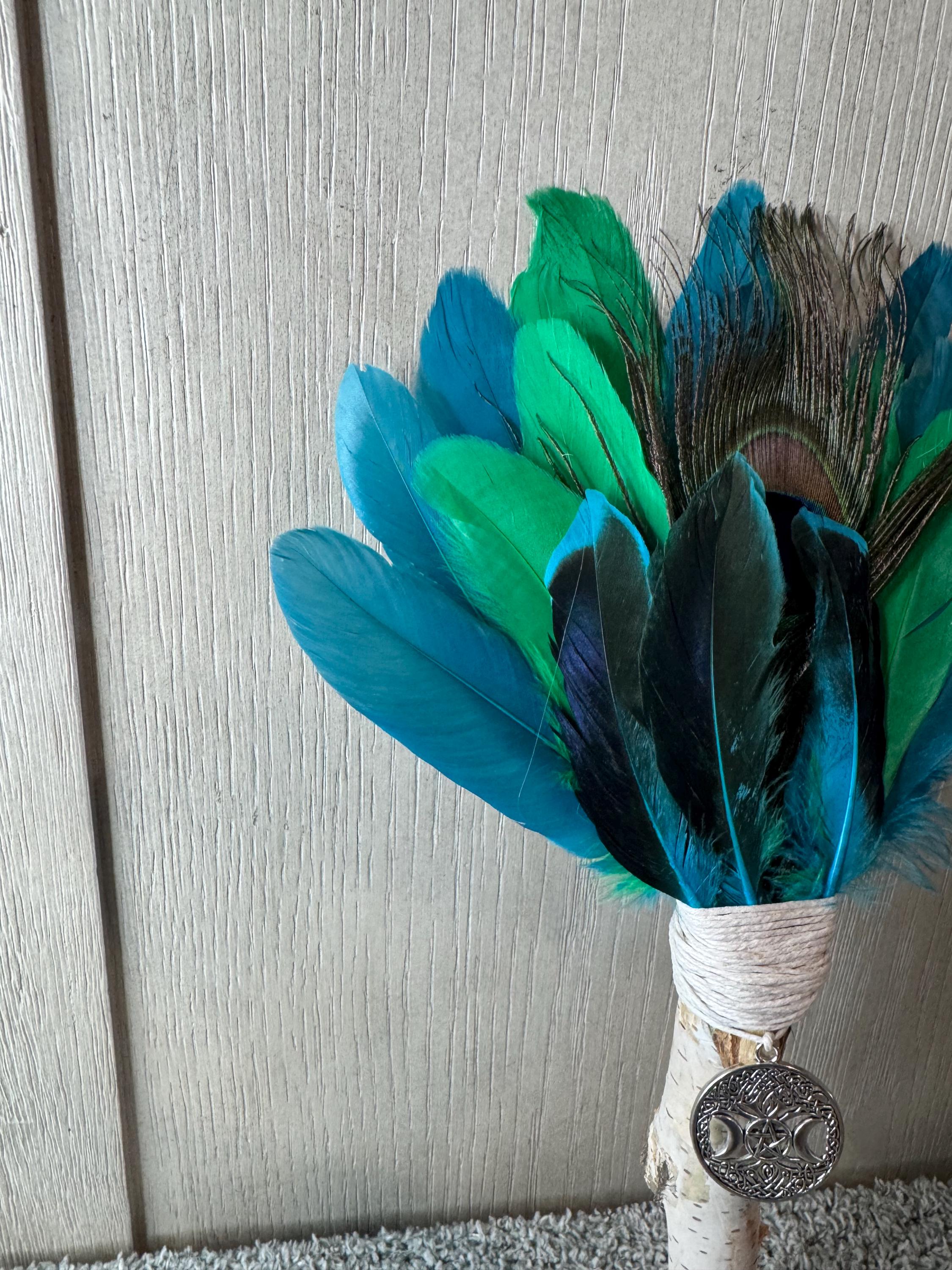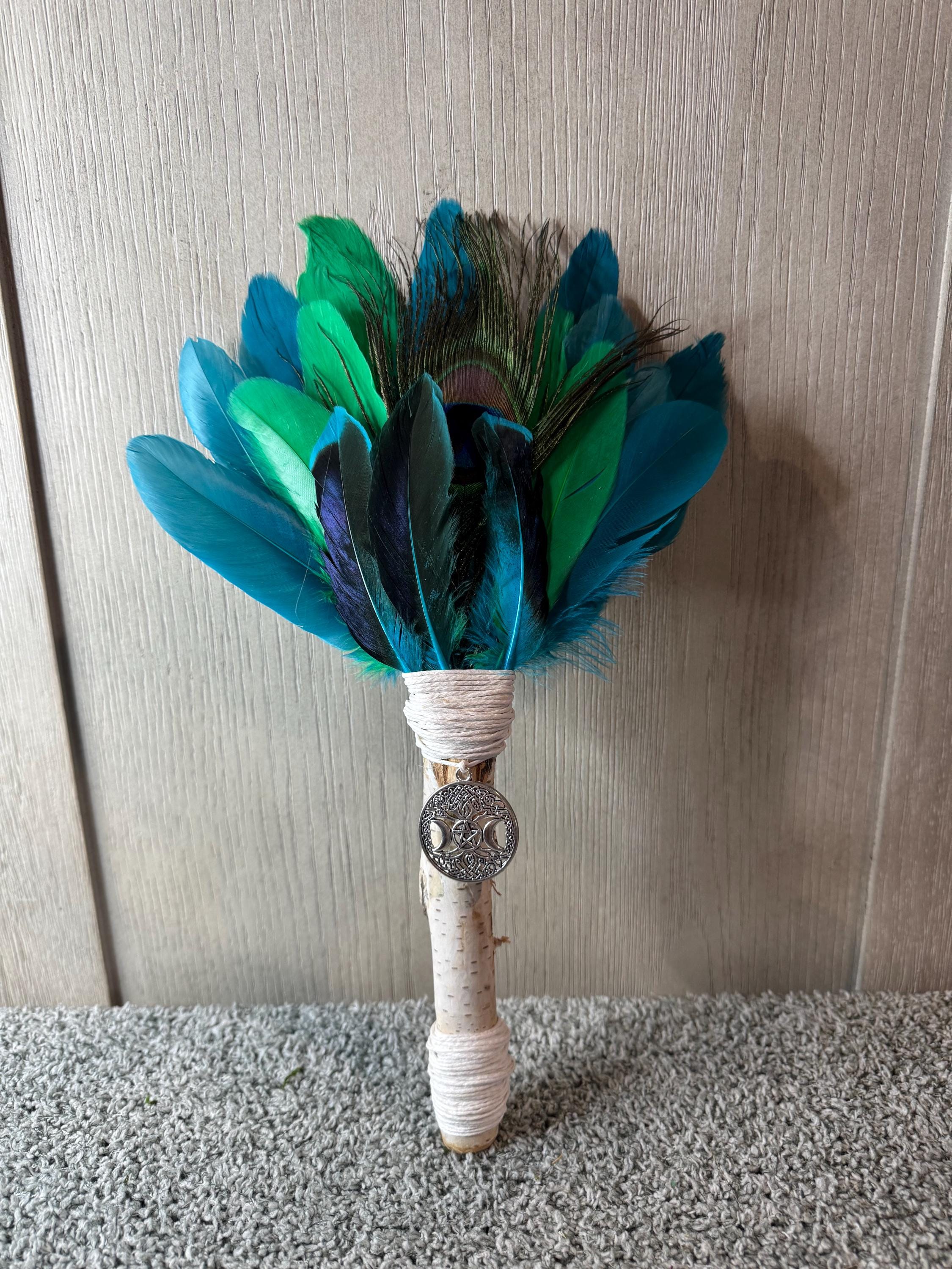 Smudge feather fan for magical ceremonies and smudging spaces. Made of Birch Wood, feathers, hemp string. The handle is white birch wood which stands for new beginnings and it also symbolizes purification, renewal, and resilience. I use branches that have fallen on the farm no trees are cut down. Feathers are all harvested FALLEN feathers, NOT PLUCKED. Handle and feathers are securely wrapped with hemp string and a silver Tree of Life charm is attached. Blessed Be!