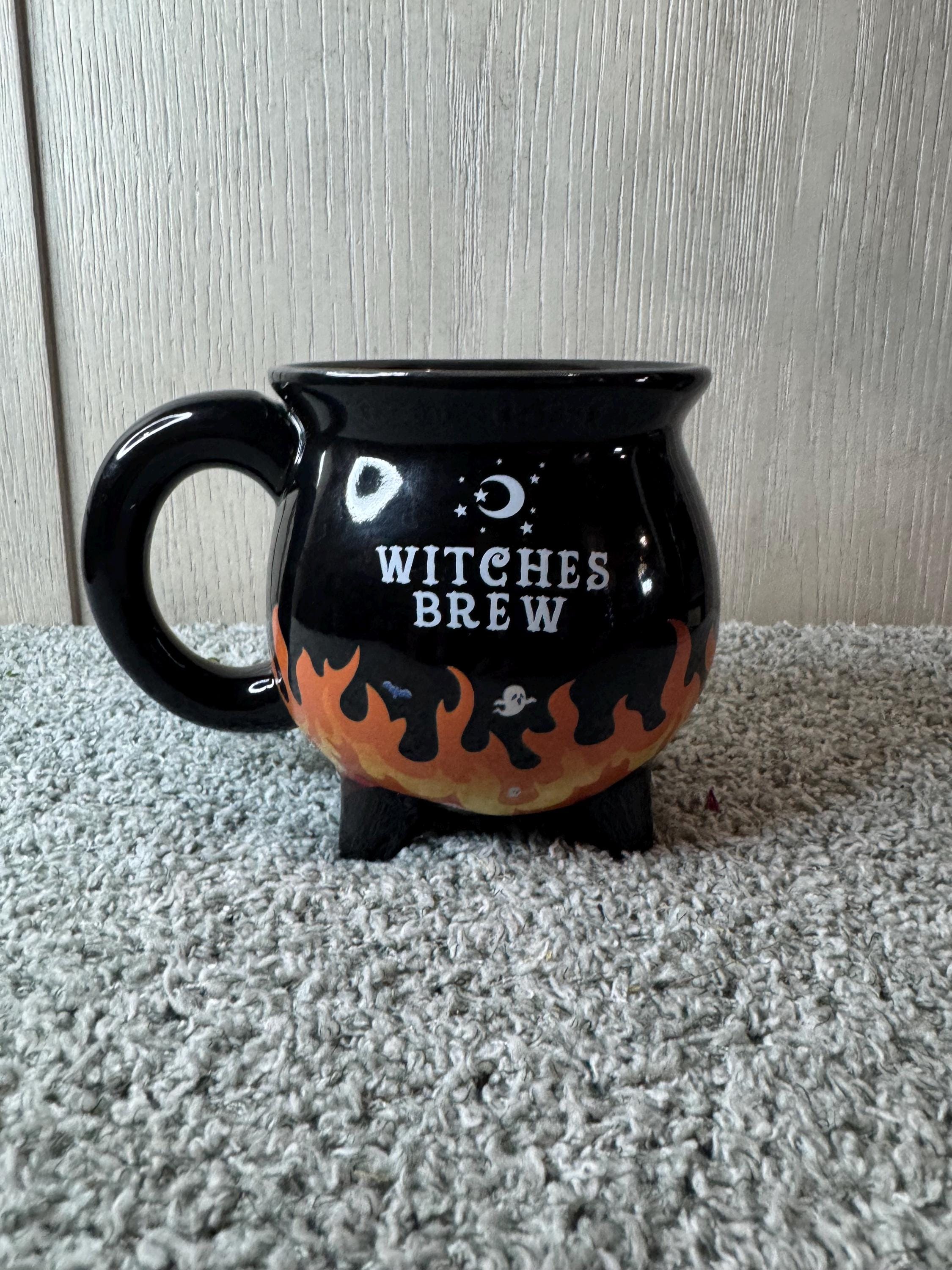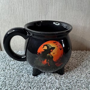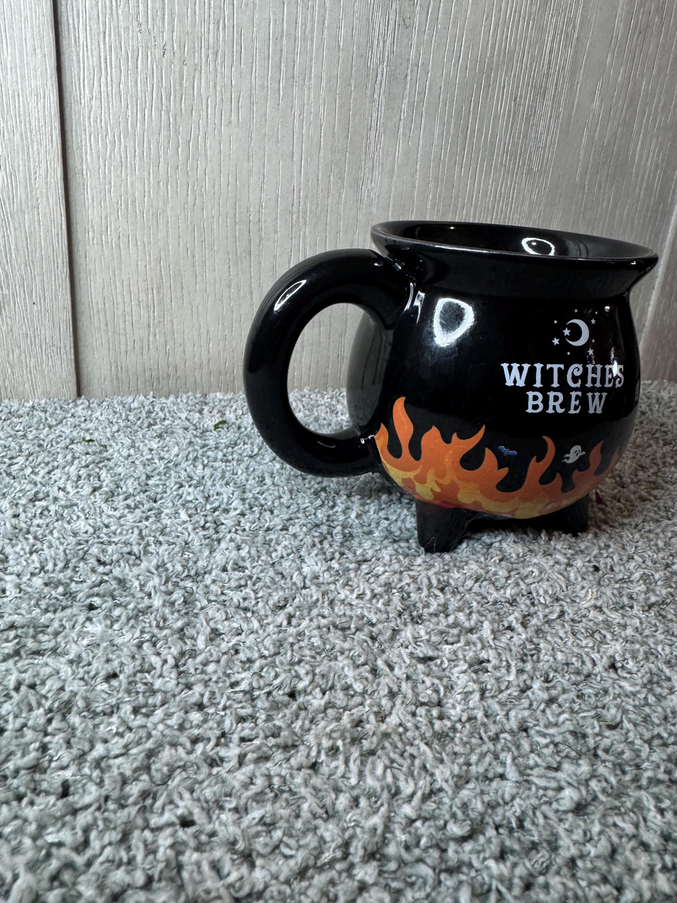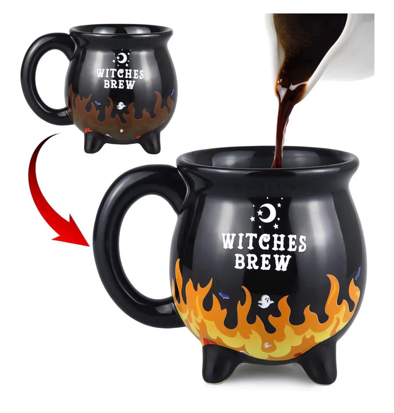 Heat changing Ceramic coffee mug, before pouring hot drink, the mug looks like a normal mug. After you pour hot liquid above 140 degrees F, at which temperature the flame on the cup will change color, deepening to an orange-yellow color. The mug holds 10oz of liquid. Hand wash only to maintain quality. Very nice gift for a witch or anyone! I love mine! Blessed Be!