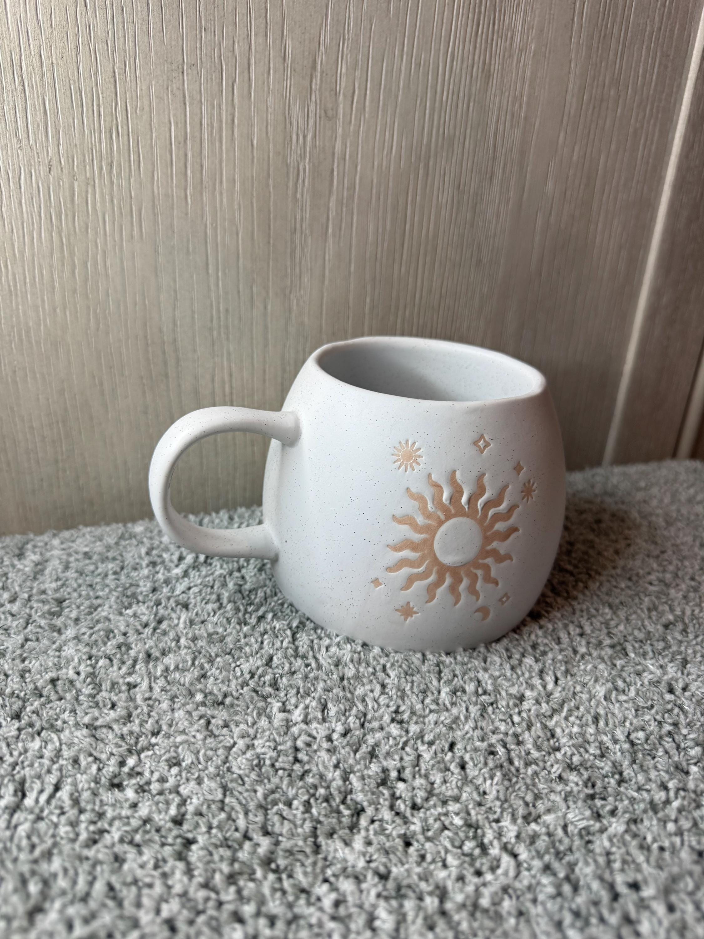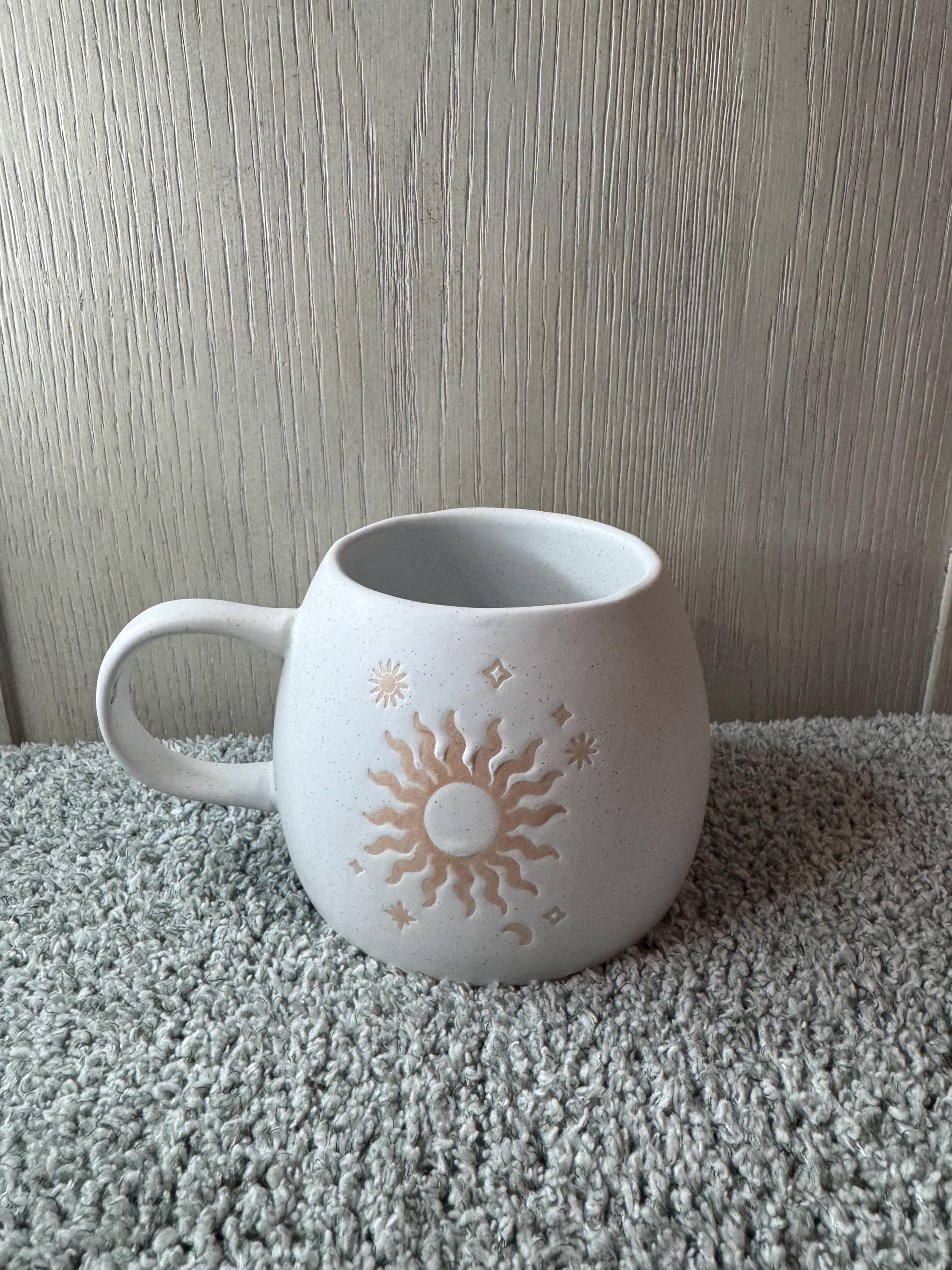 White Ceramic Coffee Mug with sun on the front, holds 12oz. Very nice NEW