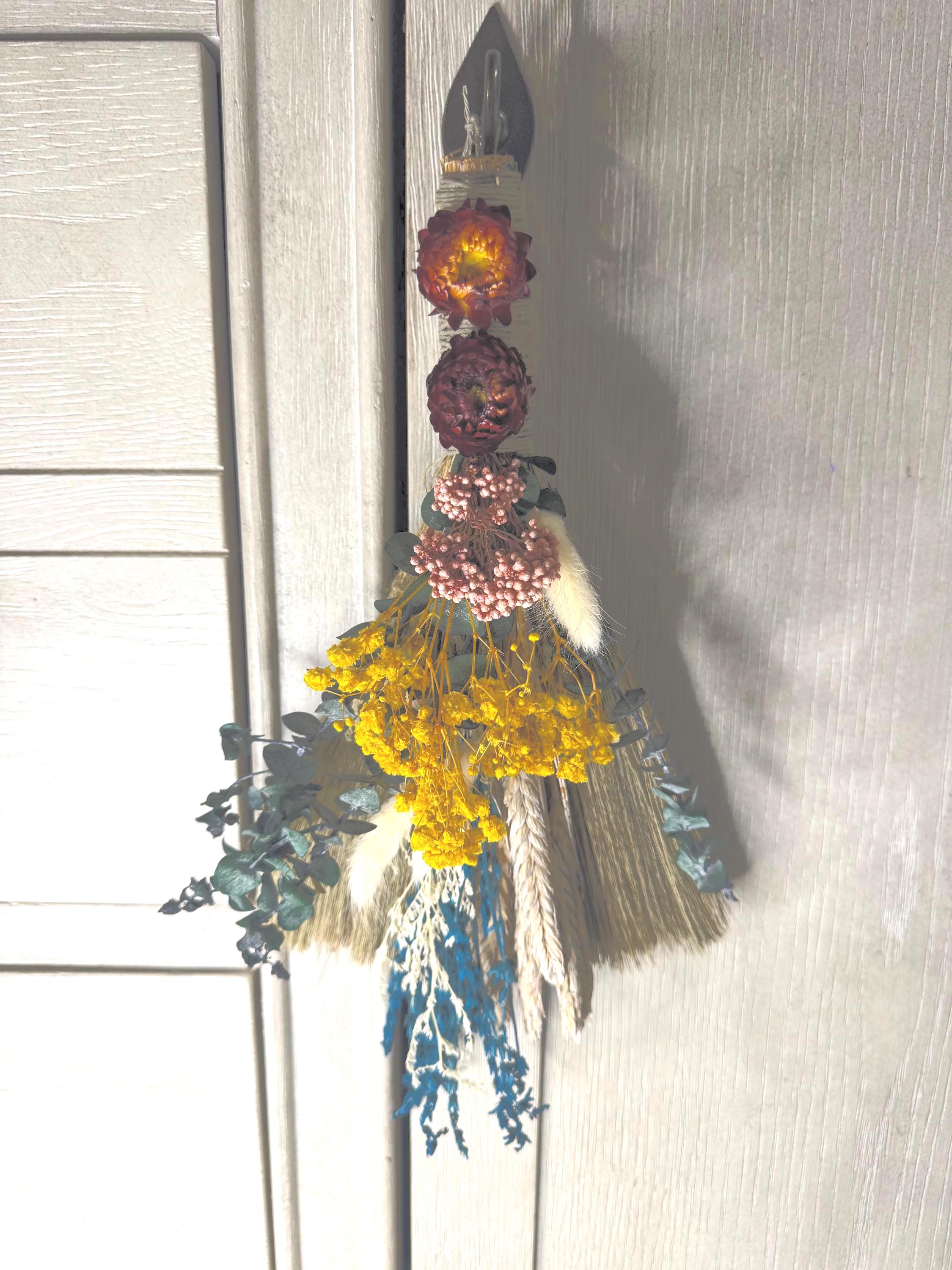 11" Altar Besom/ Broom made with real dried flowers and handle wrapped in hemp. Brooms and besoms are used for protection, to ward off evil spirits, and cleansing of ritual spaces. Usually held a few inches above the floor or altar, a special broom is used to cleanse a space of negative energies or "energetic clutter" before creating a ritual or a magic circle. Blessed Be!