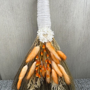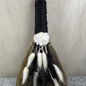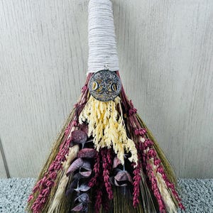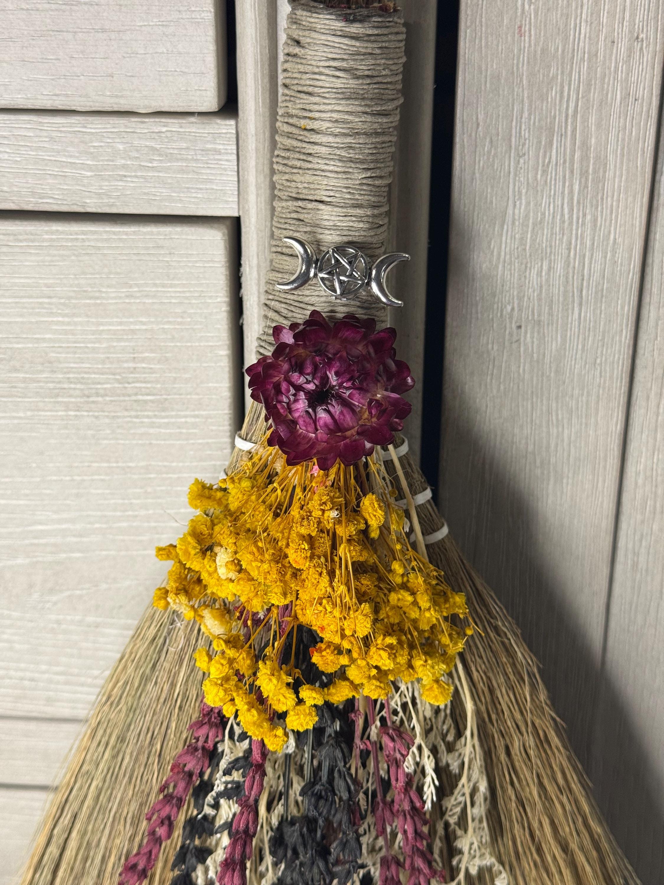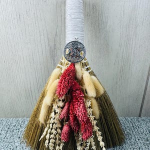 12" Altar Besom/Broom made with real dried flowers and handle wrapped in hemp. Brooms and besoms are used for protection, to ward off evil spirits, and cleansing of ritual space. Usually held a few inches above the floor or altar, a special broom is used to cleanse a space of negative energies or "energetic clutter" before creating a magic circle or ritual. Blessed Be!