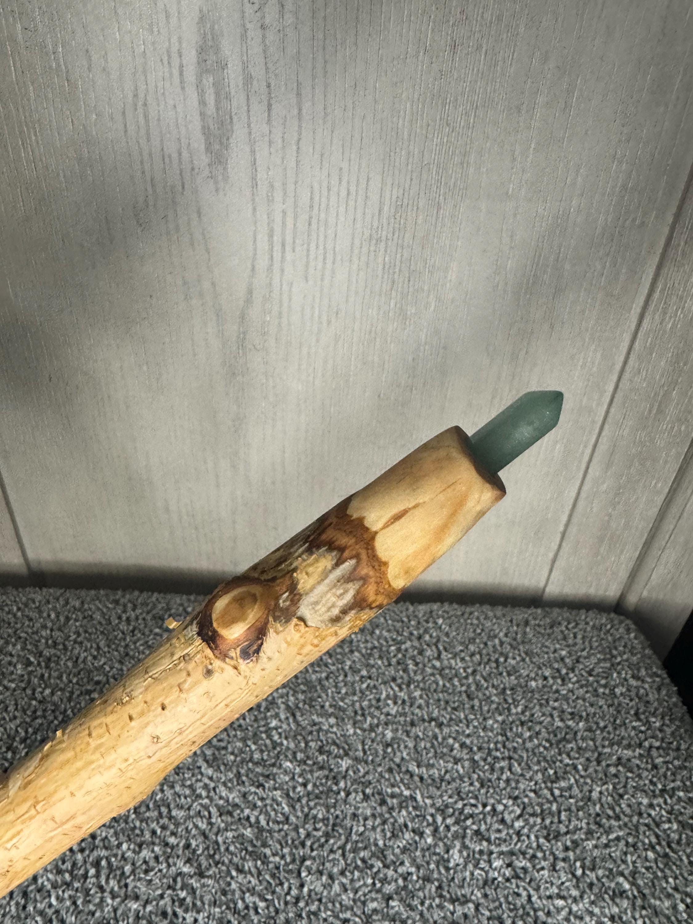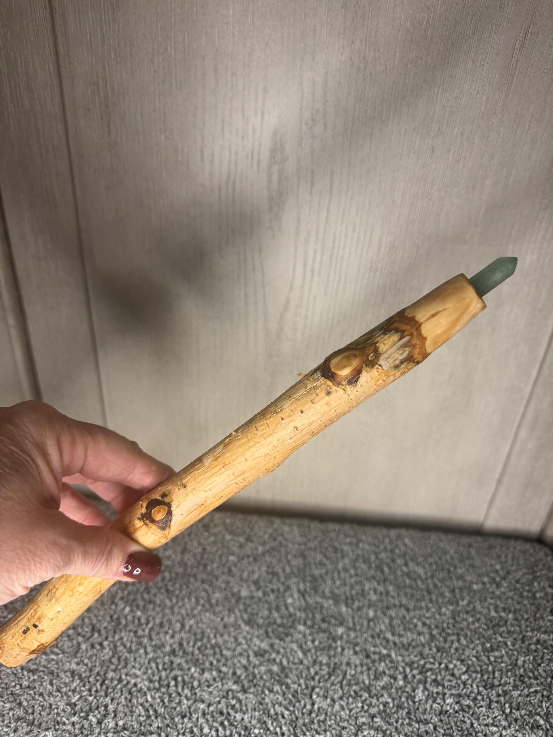 12.2" White Birch Wand with Green Aventurine Point. Birch Wood also known as "Lady of the Woods" birch is a sacred symbol of renewal, purification, and new beginnings. This graceful wood carries a gently yet potent energy, perfect for clearing away negativity and making space for fresh opportuniti3es. Birch enhances protective magic, promotes creativity, and aids in rituals focused on growth and transformation. Tipped with Green Aventurine crystal point, this wand amplifies its magical potential. Green Aventurine is known as the Stone of Luck, abundance, and heart-centered energy. No trees were harmed to make this wand; I use tree branches that have fallen on the farm to make all wands.