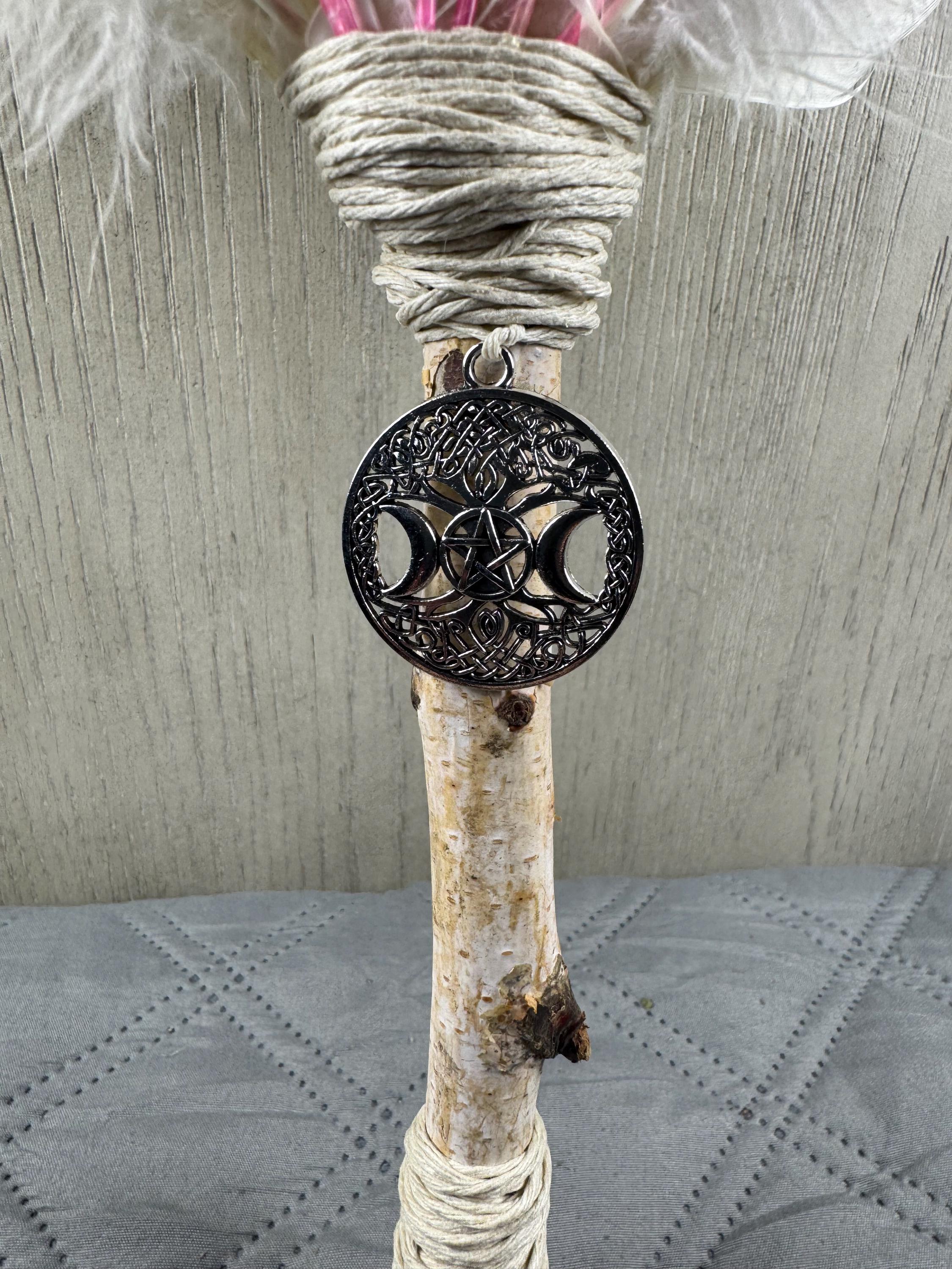 15" Smudging Feather Fan/Ceremonial. Made with 3 Different types of feathers, White Birch Tree Handle, Tree of Life Triple Moon Charm it is a symbol of beauty, health, and good luck, and wrapped with hemp. The feathers are not plucked they are harvested FALLEN feathers. The Birch Wood is also fallen from birch trees on the farm. The ritual feather fan is used to smudge spaces with Palo Santo, Sage and other incenses. When smudging, use the feather fan to softly direct the smoke to the desired direction. Keep it in a sacred place like an altar. Blessed Be!