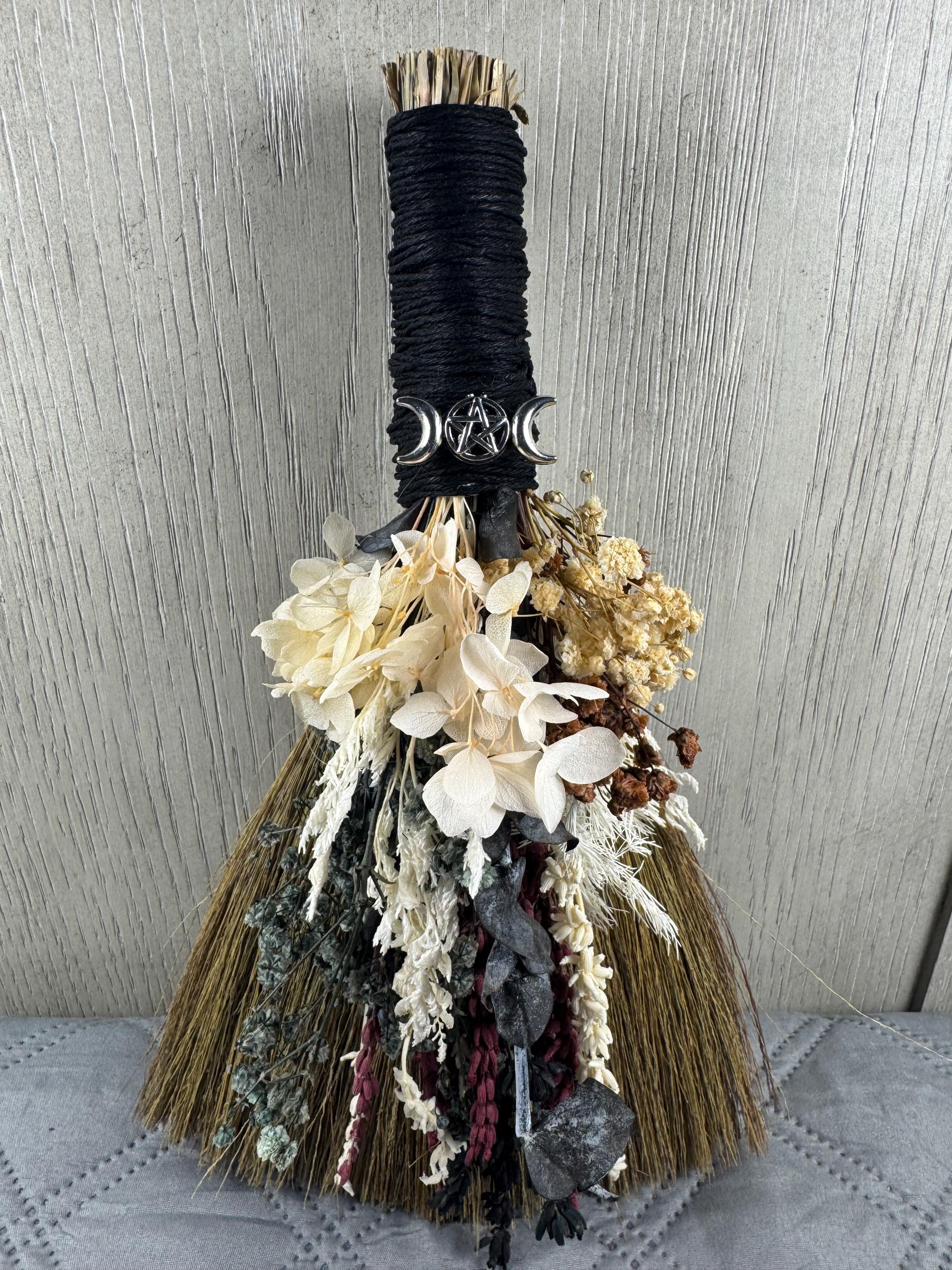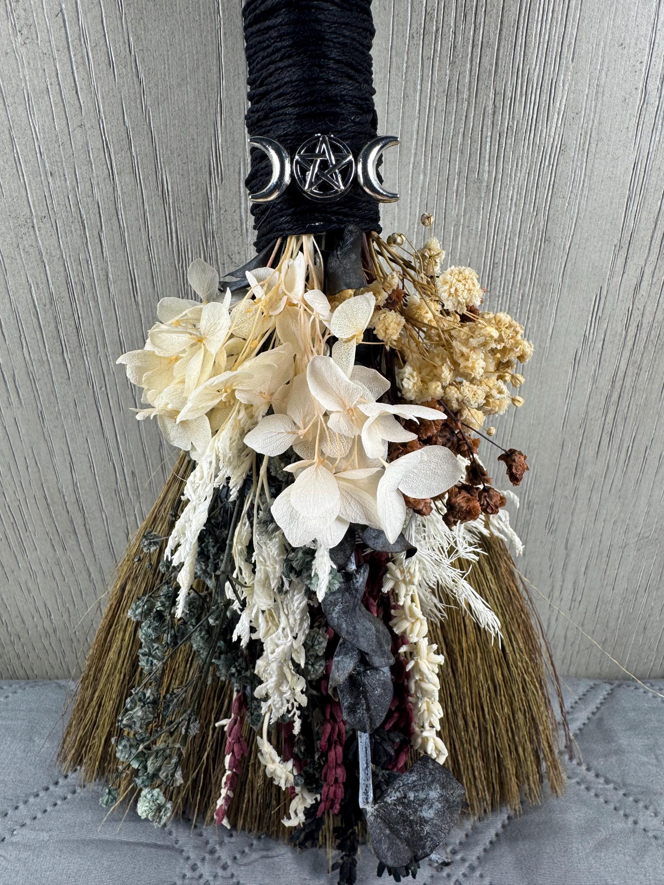 Brooms and besoms are used for protection, to ward off evil spirits, and cleansing of ritual spaces. Usually help a few inches above the floor, a special broom is used to cleanse a space of negative energies or "energetic clutter" before creating a ritual or magic circle. Made with real dried preserved flowers and wrapped with hemp. Blessed Be!