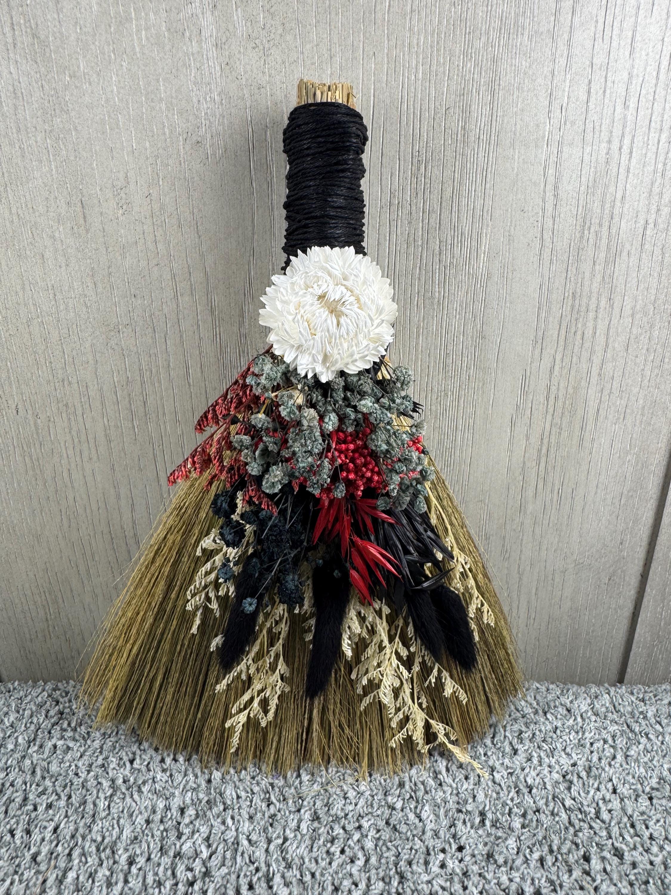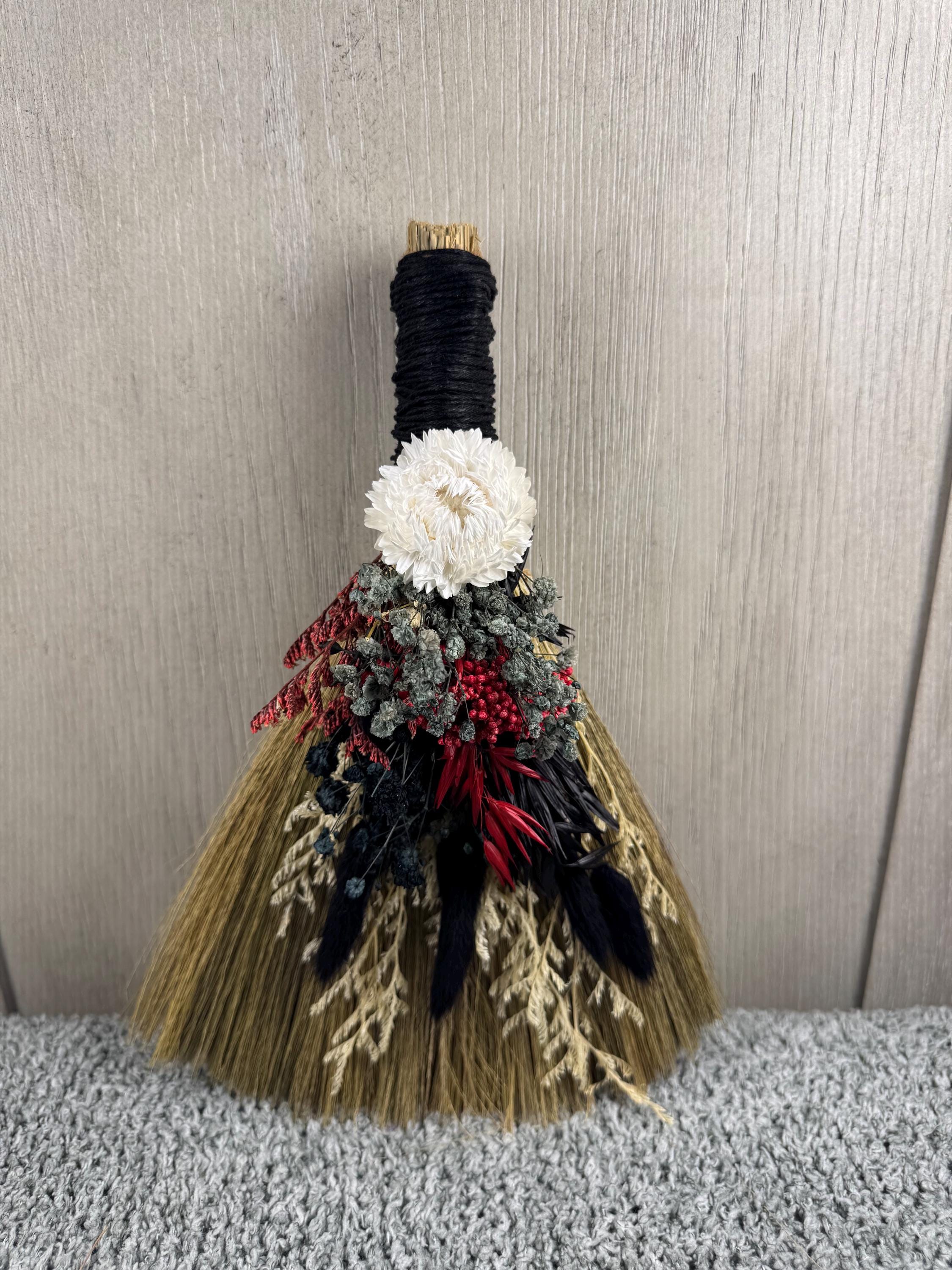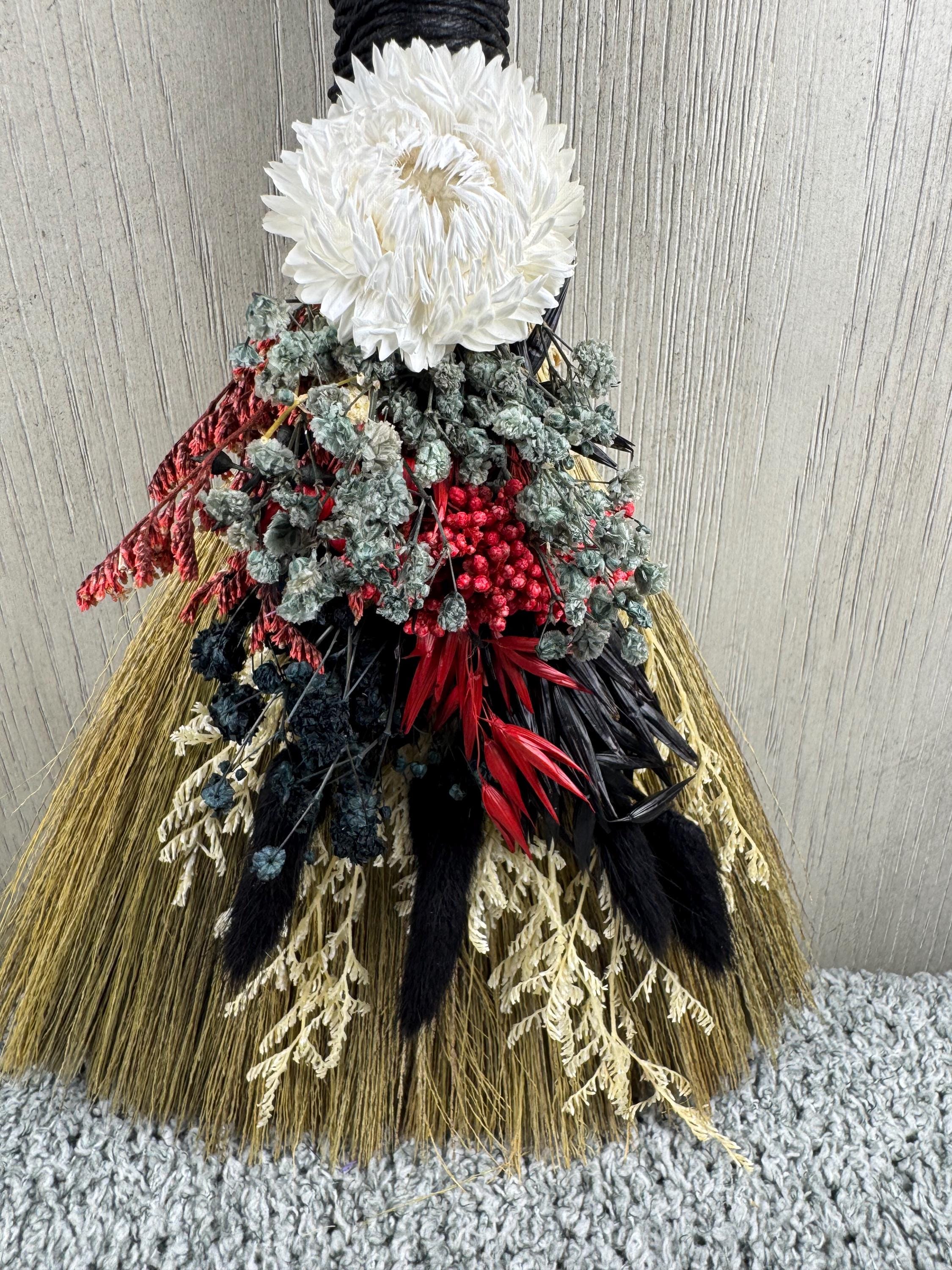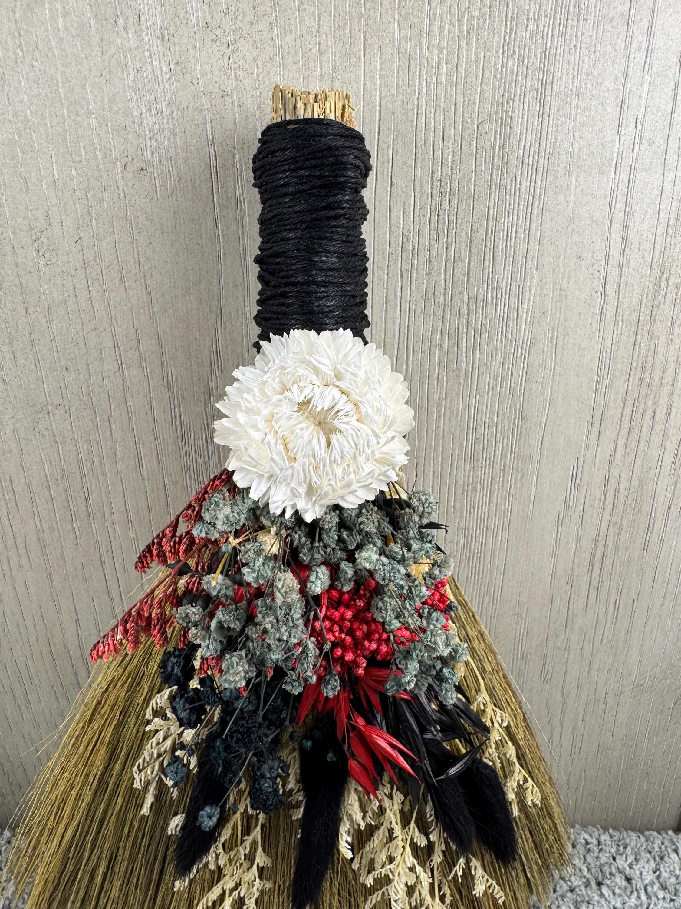 Brooms and besoms are used for protection, to ward off evil spirits, and cleansing of ritual spaces. Usually help a few inches above the floor, a special broom is used to cleanse a space of negative energies or "energetic clutter" before creating a ritual or magic circle. Made with real dried preserved flowers and wrapped with hemp. Blessed Be!