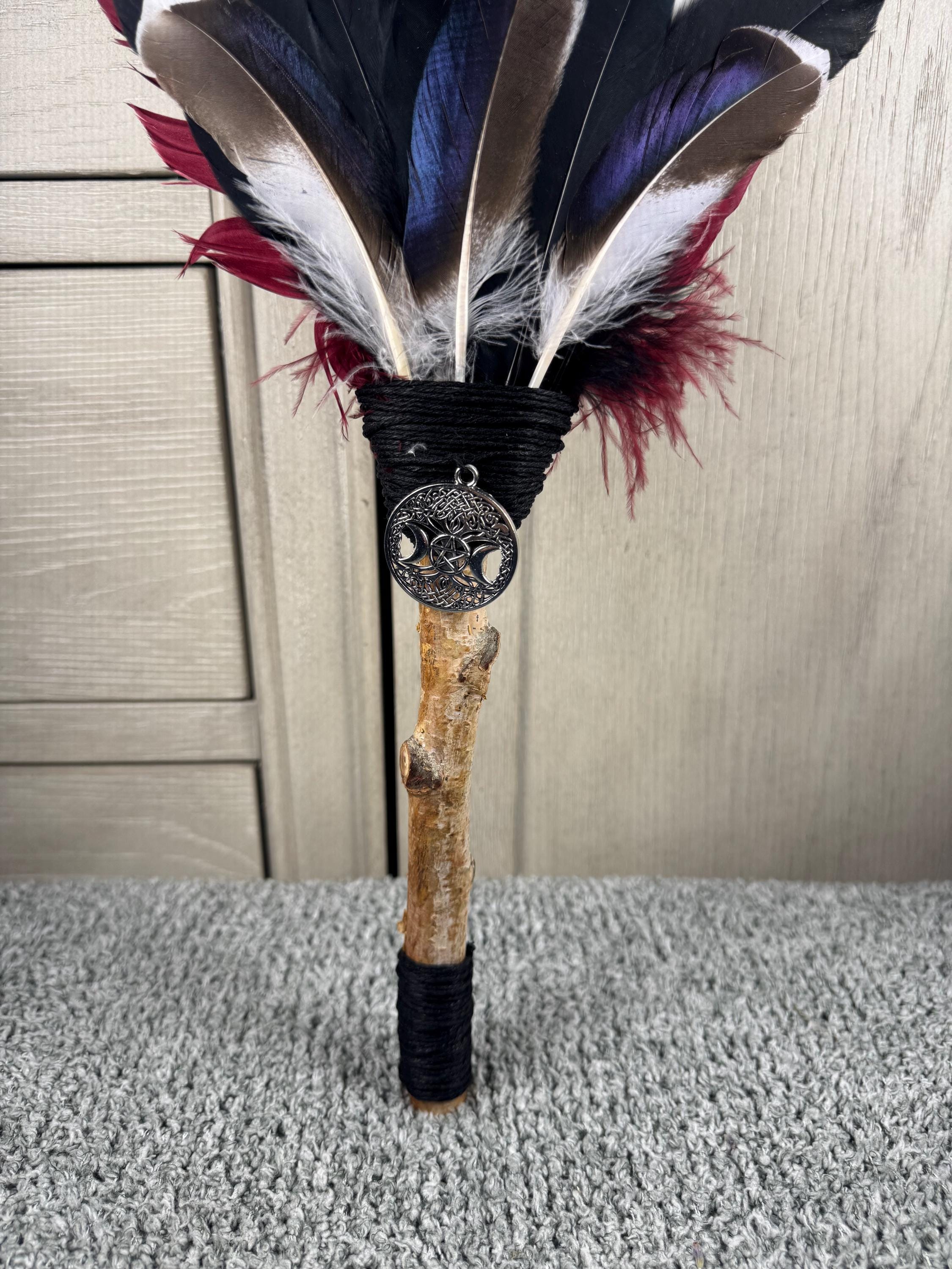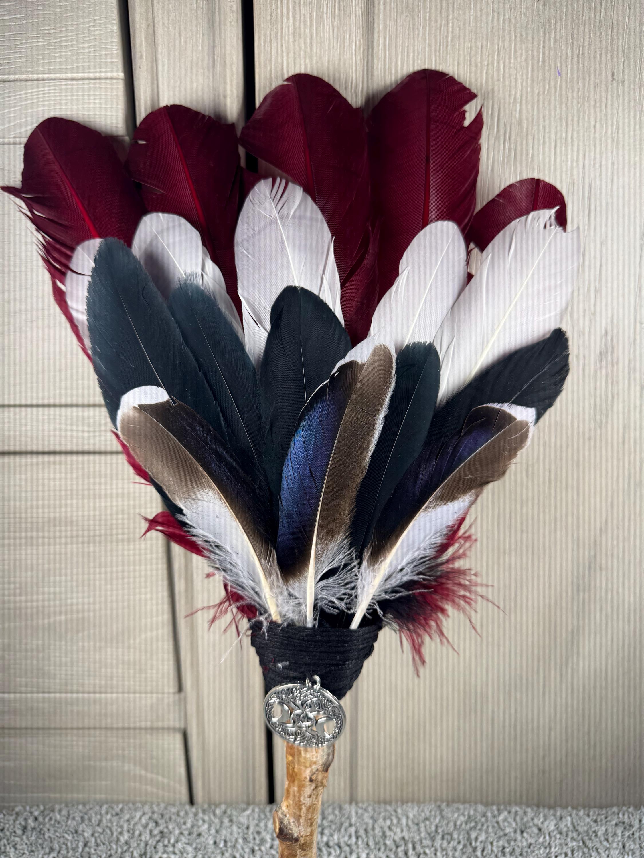 18" Smudging Feather Fan/Ceremonial. Made with 4 Different types of feathers, White Birch Tree Handle, Tree of Life Triple Moon Charm it is a symbol of beauty, health, and good luck, and wrapped with hemp. The feathers are not plucked they are harvested FALLEN feathers. The Birch Wood is also fallen from birch trees on the farm. The ritual feather fan is used to smudge spaces with Palo Santo, Sage and other incenses. When smudging, use the feather fan to softly direct the smoke to the desired direction. Keep it in a sacred place like an altar. Blessed Be!