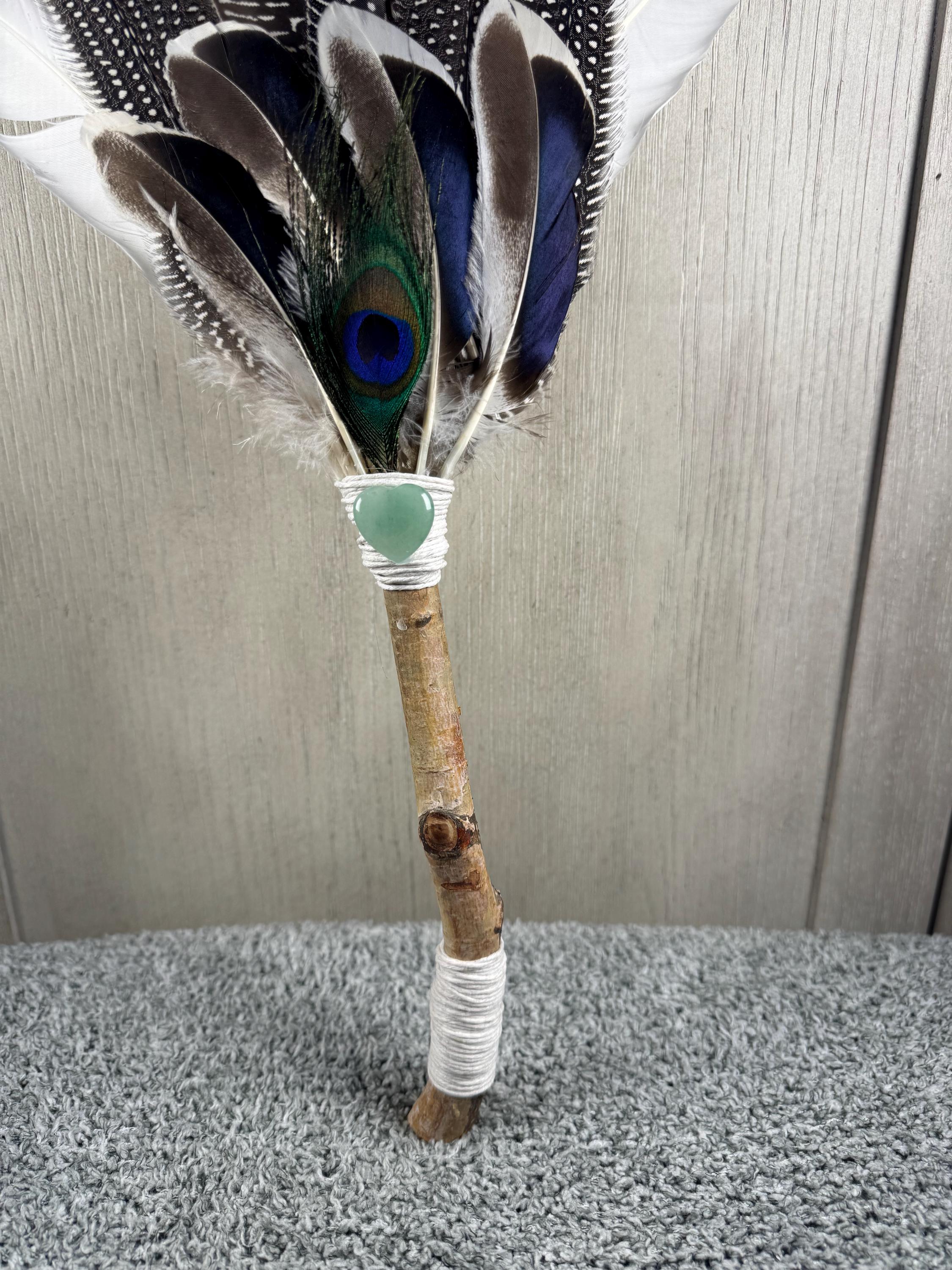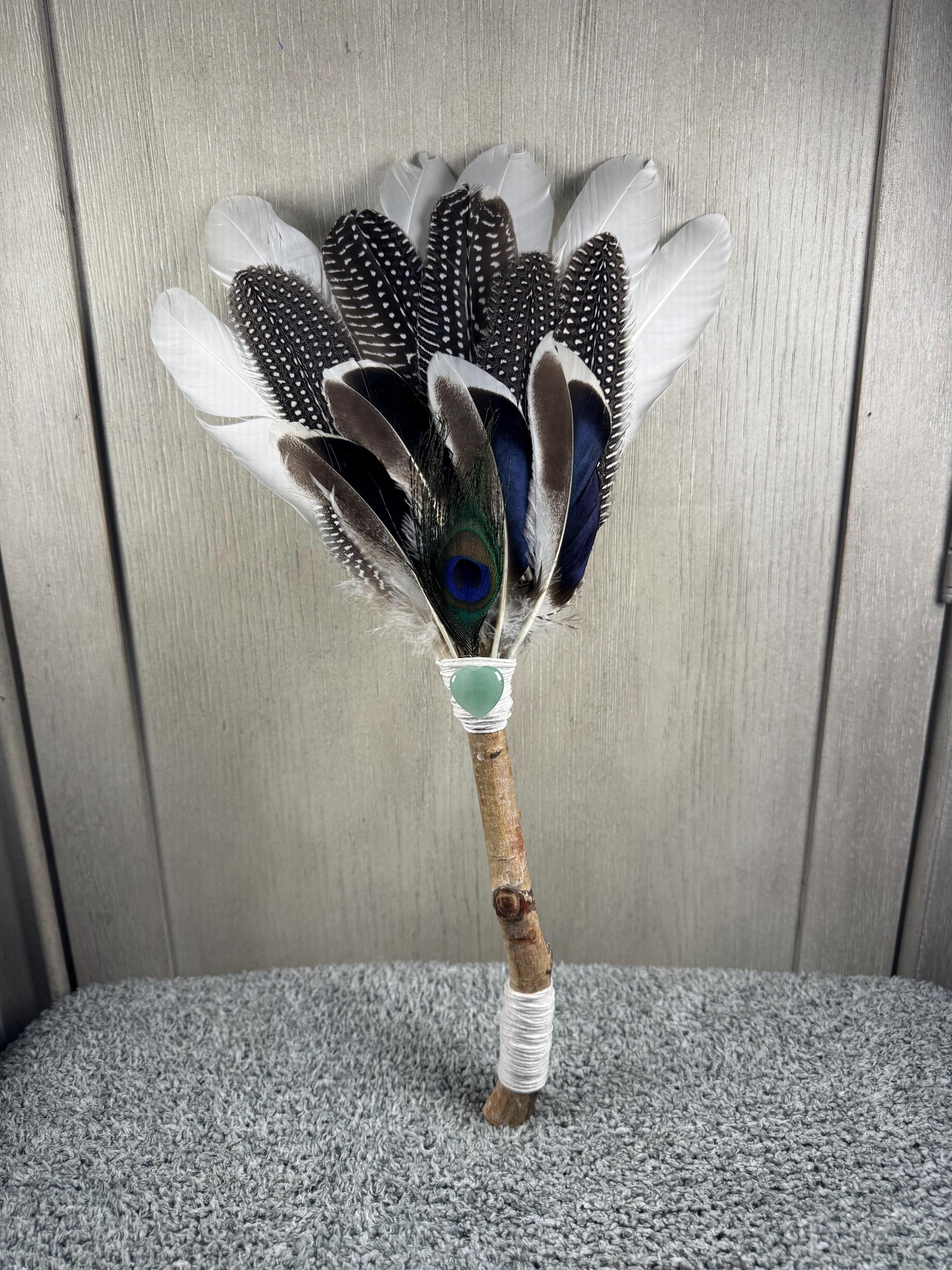 15" Smudging Feather Fan/Ceremonial. Made with 4 Different types of feathers, White Birch Tree Handle, Tree of Life Triple Moon Charm it is a symbol of beauty, health, and good luck, and wrapped with hemp and a crystal. The feathers are not plucked they are harvested FALLEN feathers. The Birch Wood is also fallen from birch trees on the farm. The ritual feather fan is used to smudge spaces with Palo Santo, Sage and other incenses. When smudging, use the feather fan to softly direct the smoke to the desired direction. Keep it in a sacred place like an altar. Blessed Be!