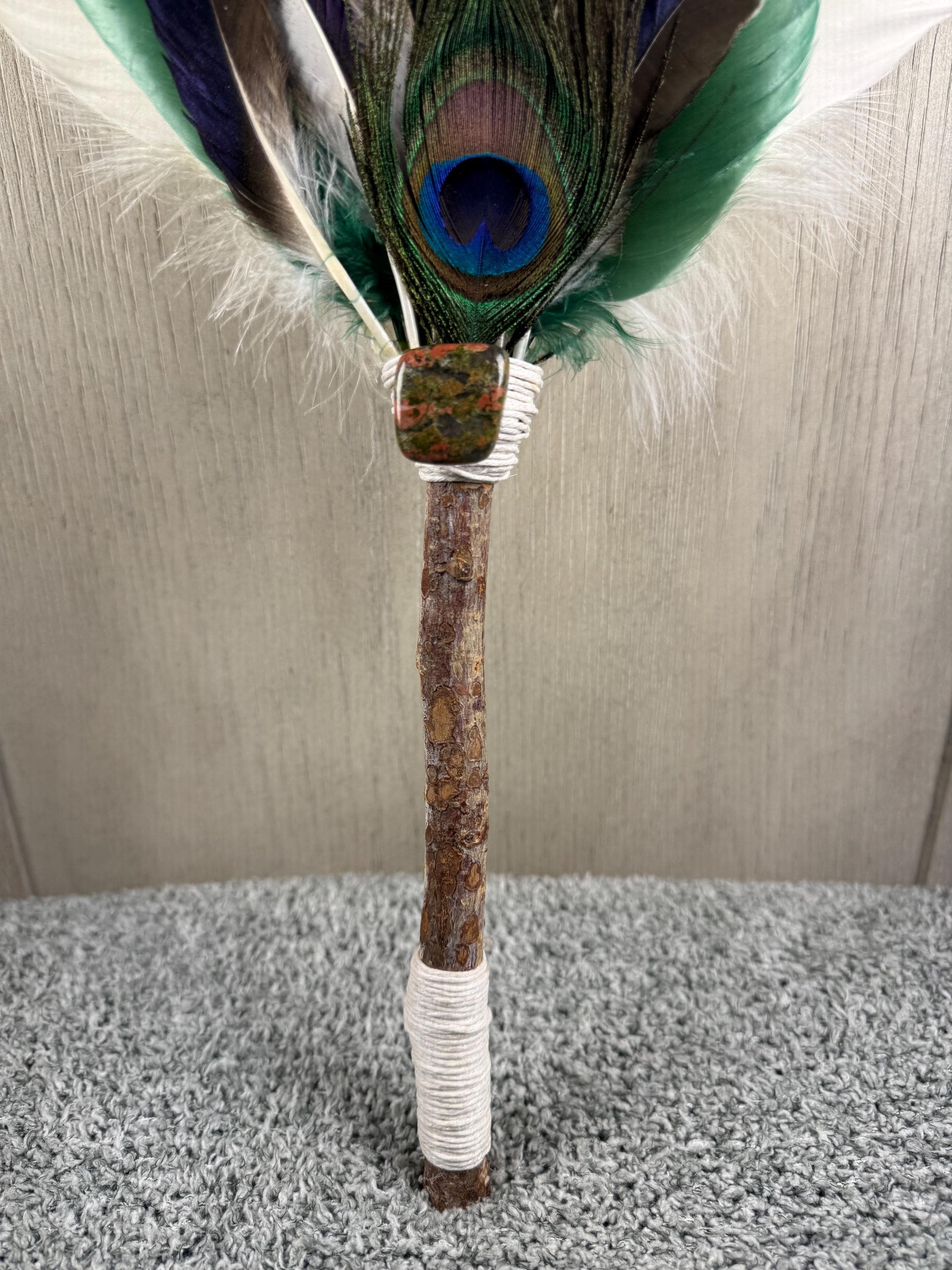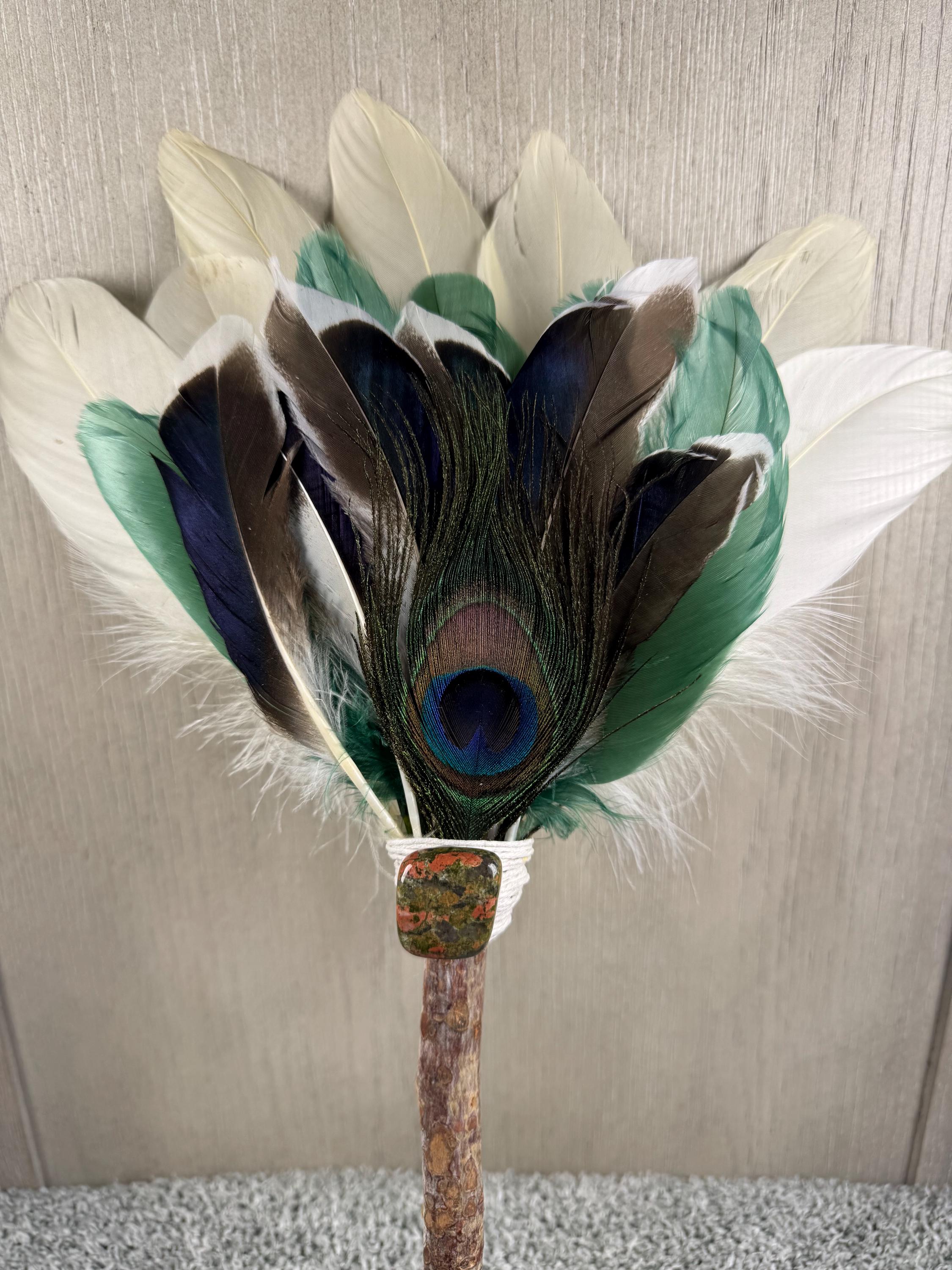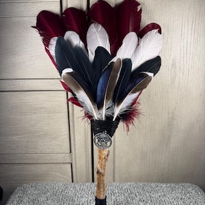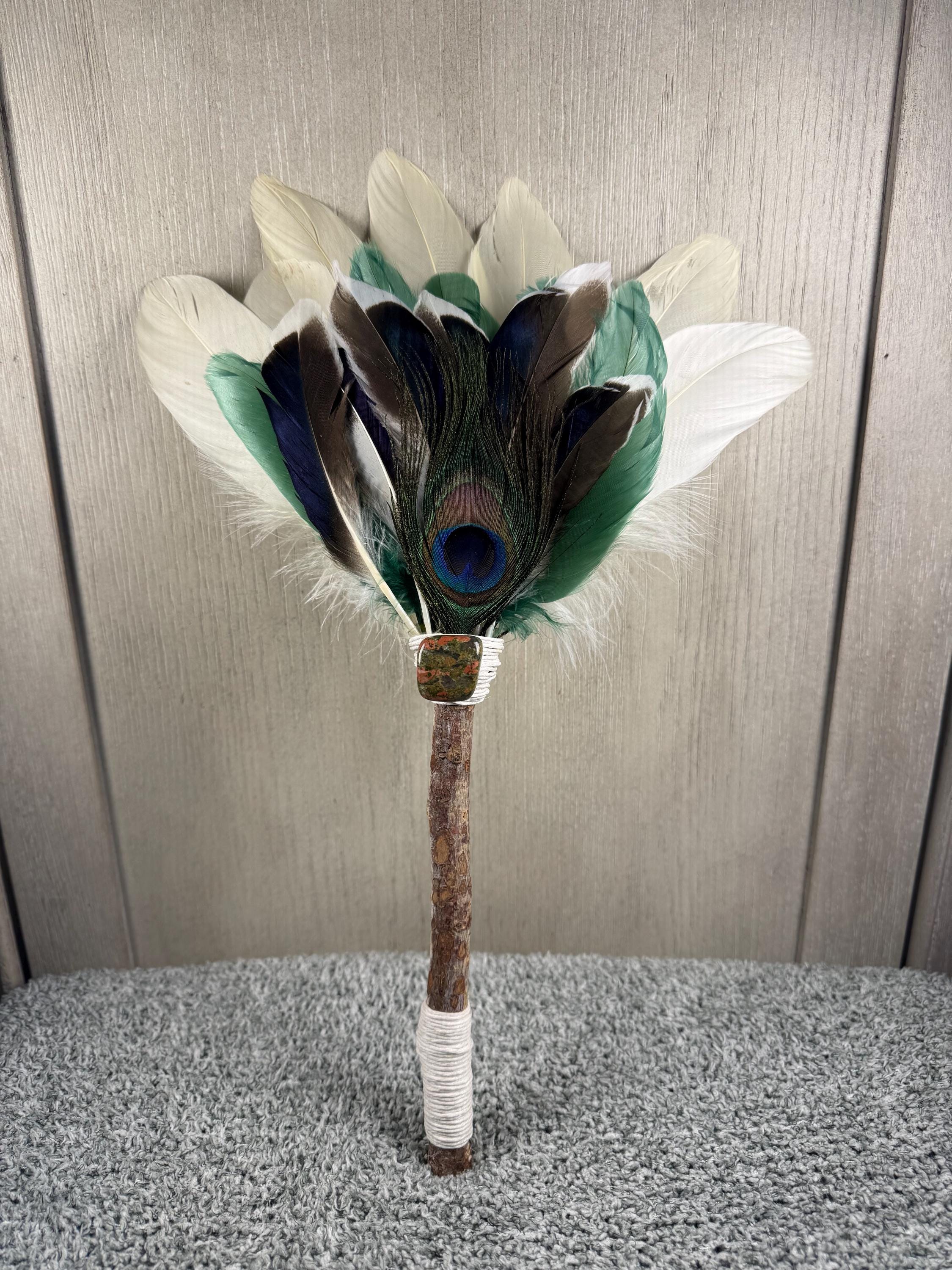 15" Smudging Feather Fan/Ceremonial. Made with 4 Different types of feathers, White Birch Tree Handle, Tree of Life Triple Moon Charm it is a symbol of beauty, health, and good luck, and wrapped with hemp and a crystal. The feathers are not plucked they are harvested FALLEN feathers. The Birch Wood is also fallen from birch trees on the farm. The ritual feather fan is used to smudge spaces with Palo Santo, Sage and other incenses. When smudging, use the feather fan to softly direct the smoke to the desired direction. Keep it in a sacred place like an altar. Blessed Be!