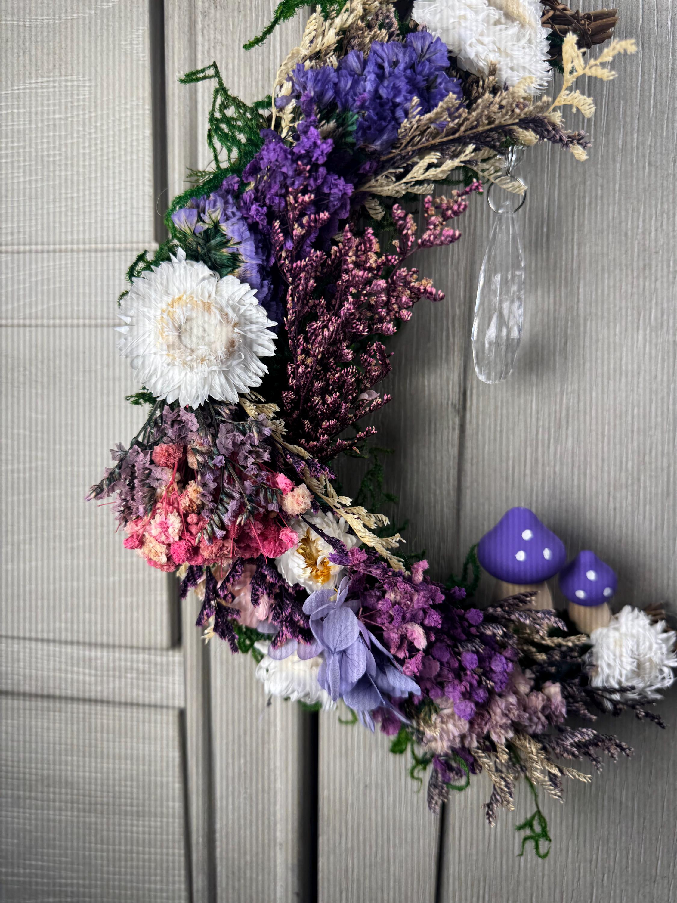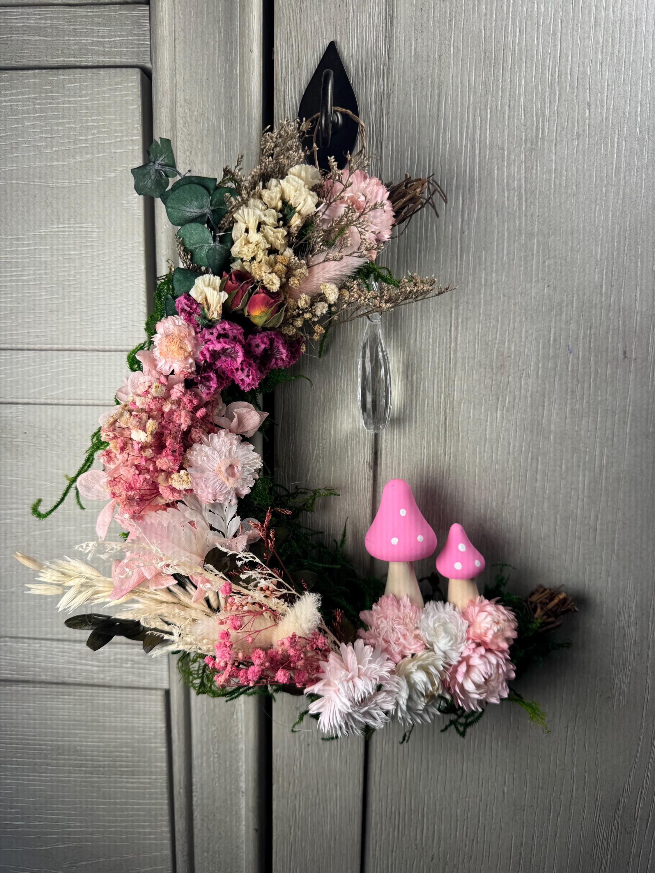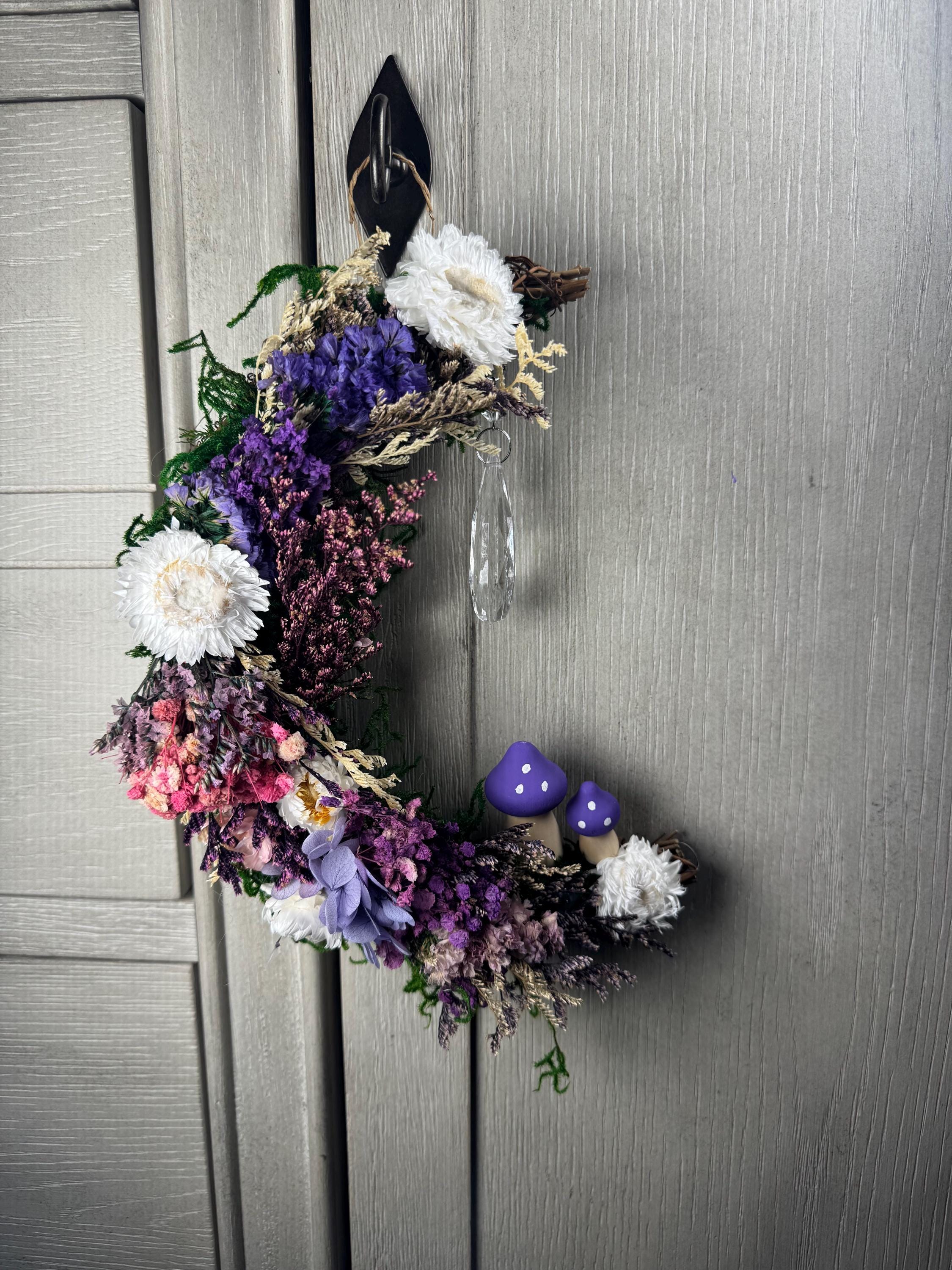 Half-Moon (Crescent Moon) Grapevine Wreath, made with real preserved dried flowers and 2 wooden mushrooms. Wreath Measures 8". The crescent moon symbolizes new beginnings, growth, and transformation across various cultures and spiritual traditions. It also represents cycles, the divine feminine, intuition, and transition. Blessed Be!