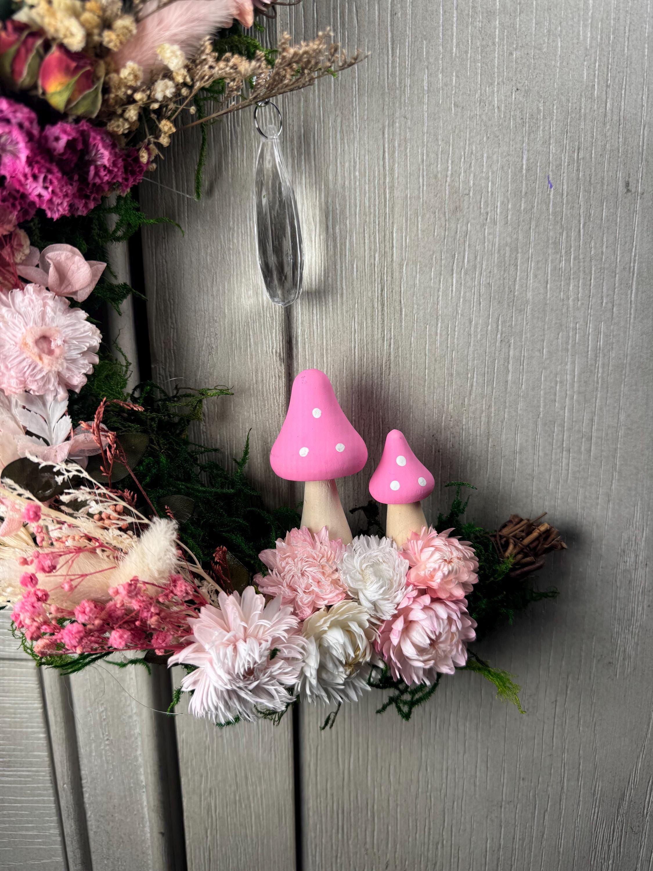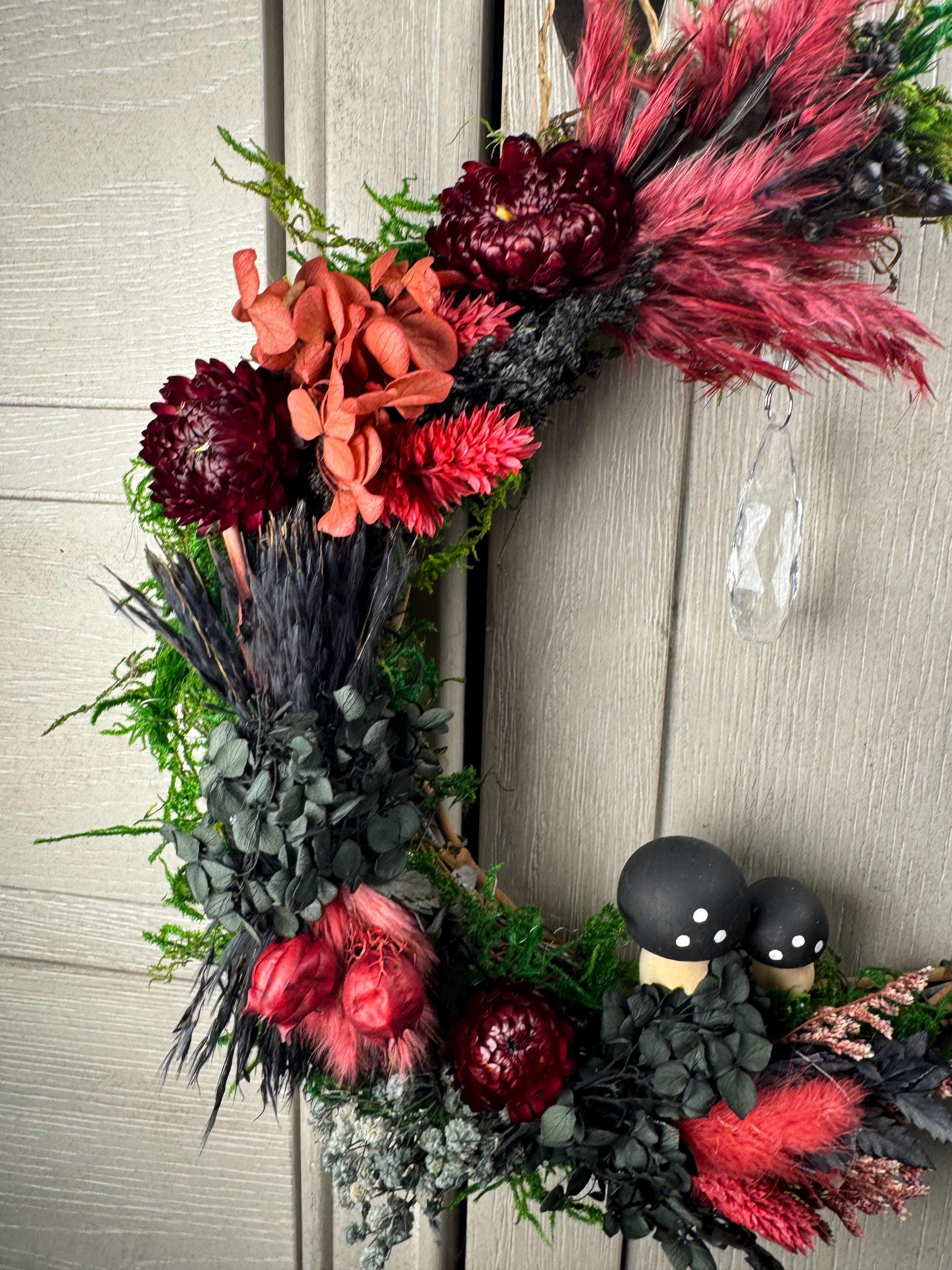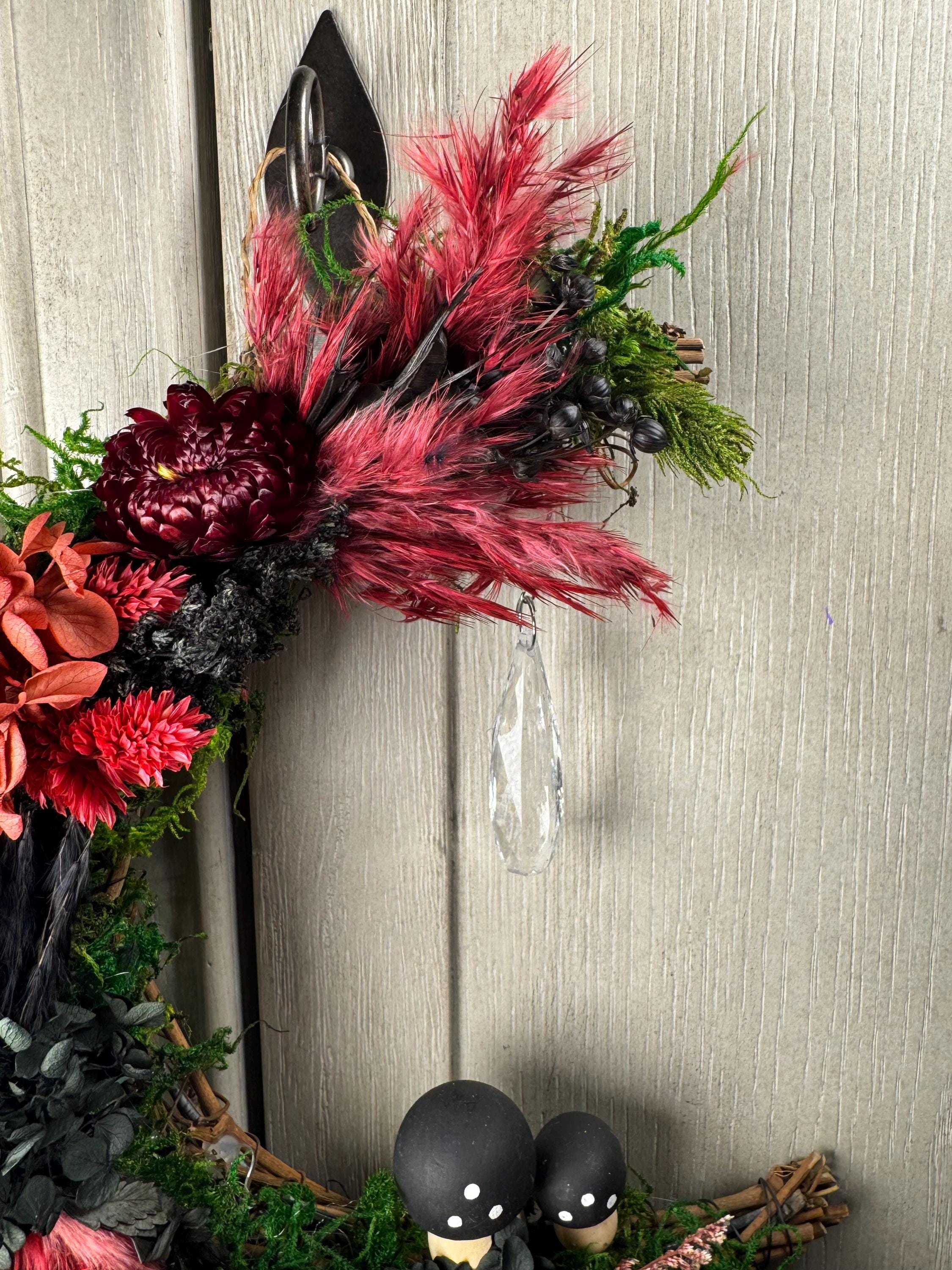 Half-Moon (Crescent Moon) Grapevine Wreath, made with real preserved dried flowers and 2 wooden mushrooms. Wreath Measures 8". The crescent moon symbolizes new beginnings, growth, and transformation across various cultures and spiritual traditions. It also represents cycles, the divine feminine, intuition, and transition. Blessed Be!
