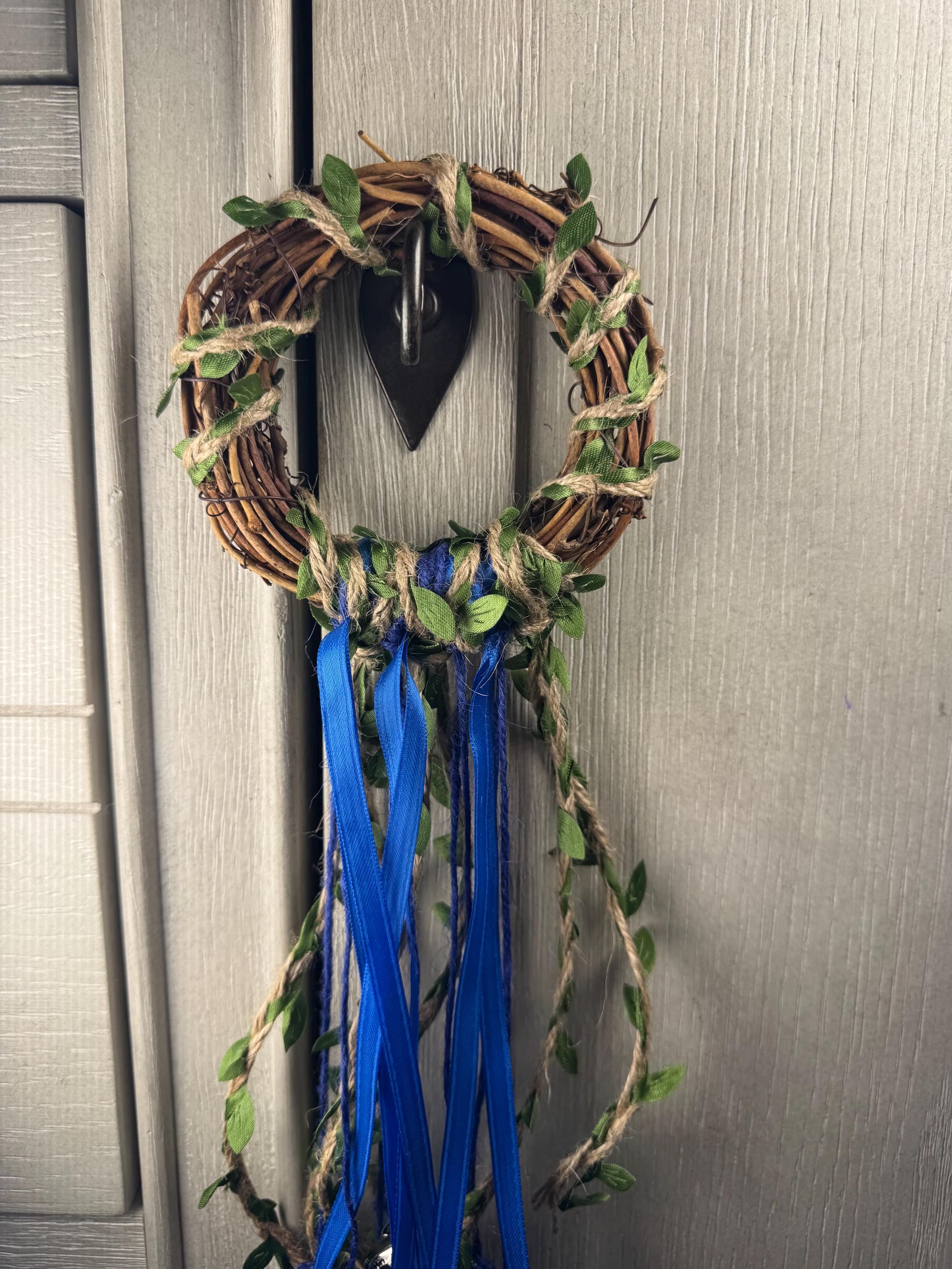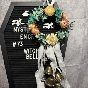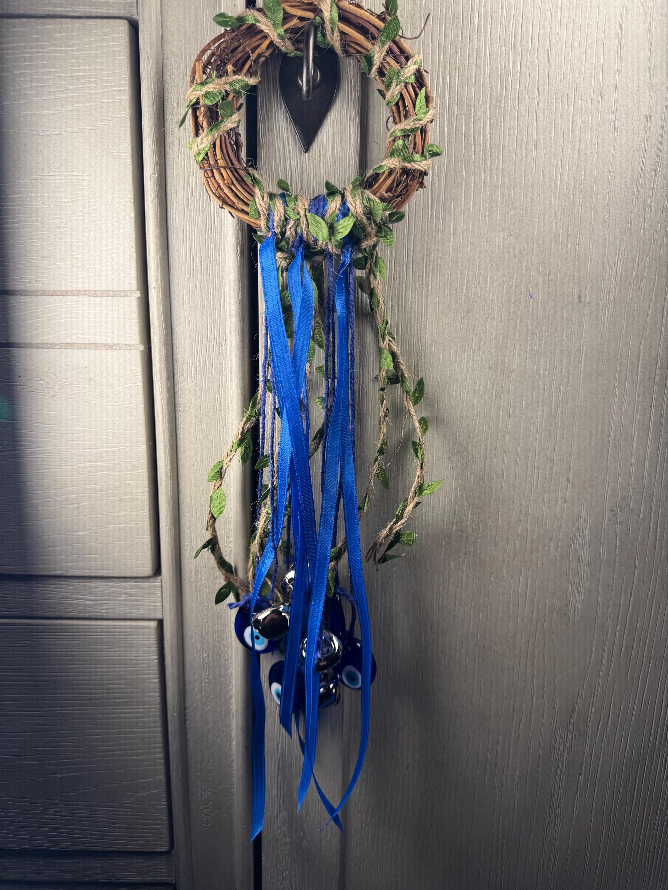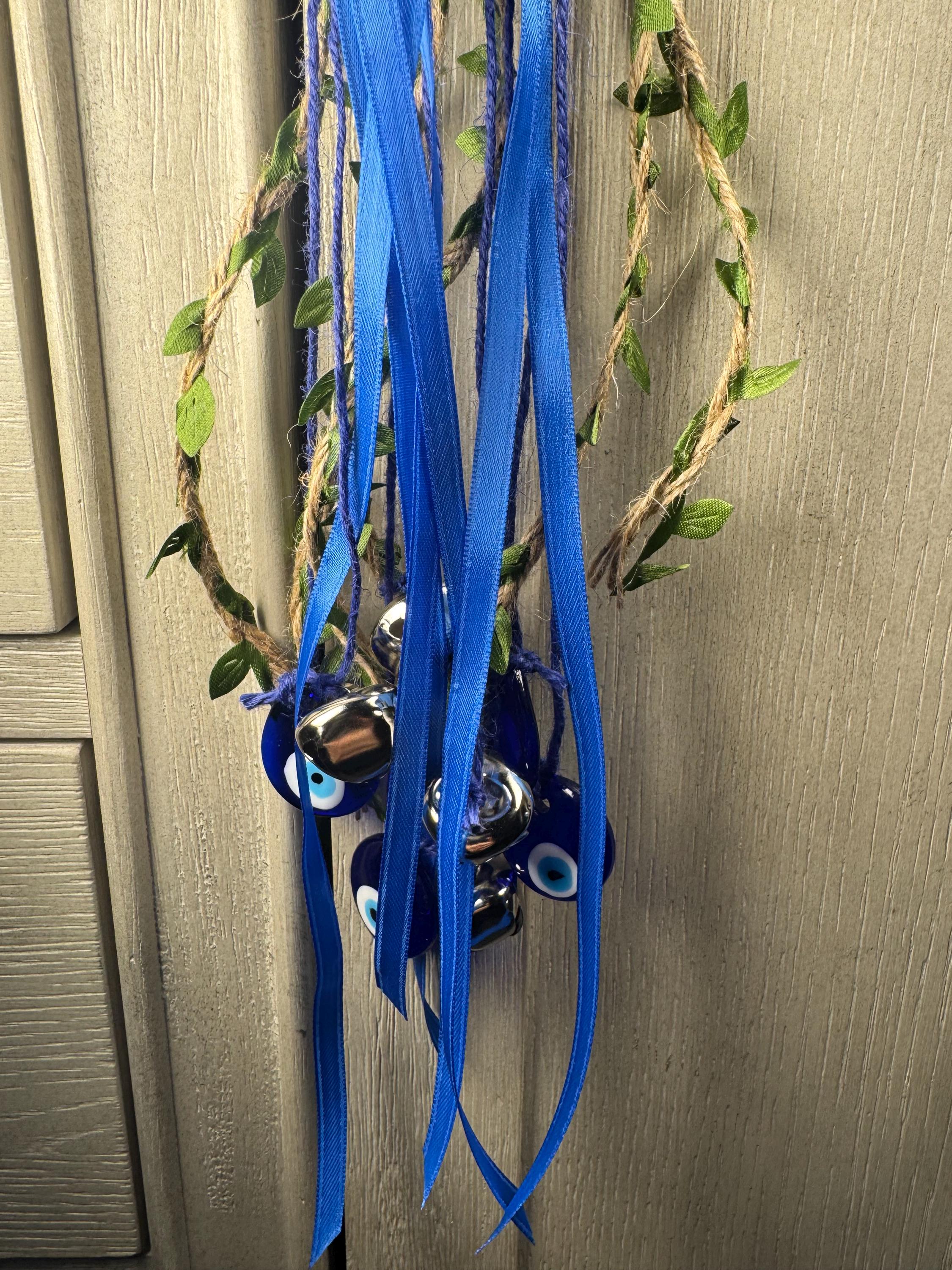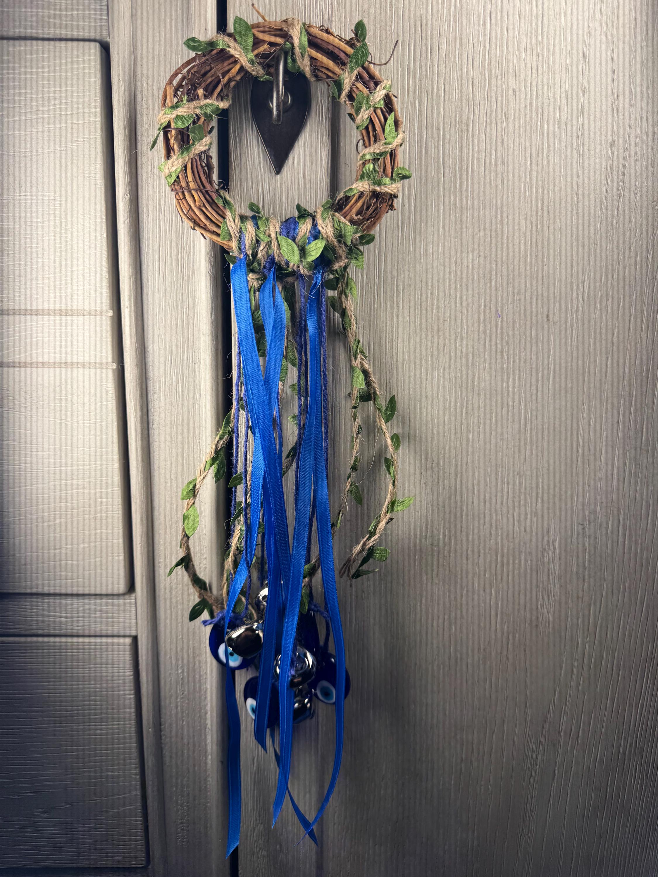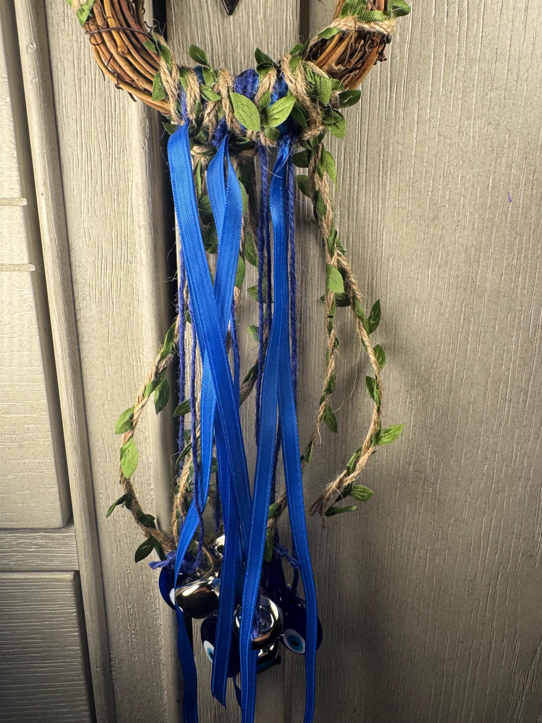 4" Grapevine Witch Bell Wreath made with 4 Bells, 4 Evil Eye Charms, Colored Ribbon, and Colored Jute Twine. Witches' Bells are primarily used for protection and clearing negative energy from a home or sacred space. They are hung on doorknobs or near entrances to chime and ward off unwanted spirits or energy as the door opens and closes. Blessed Be!