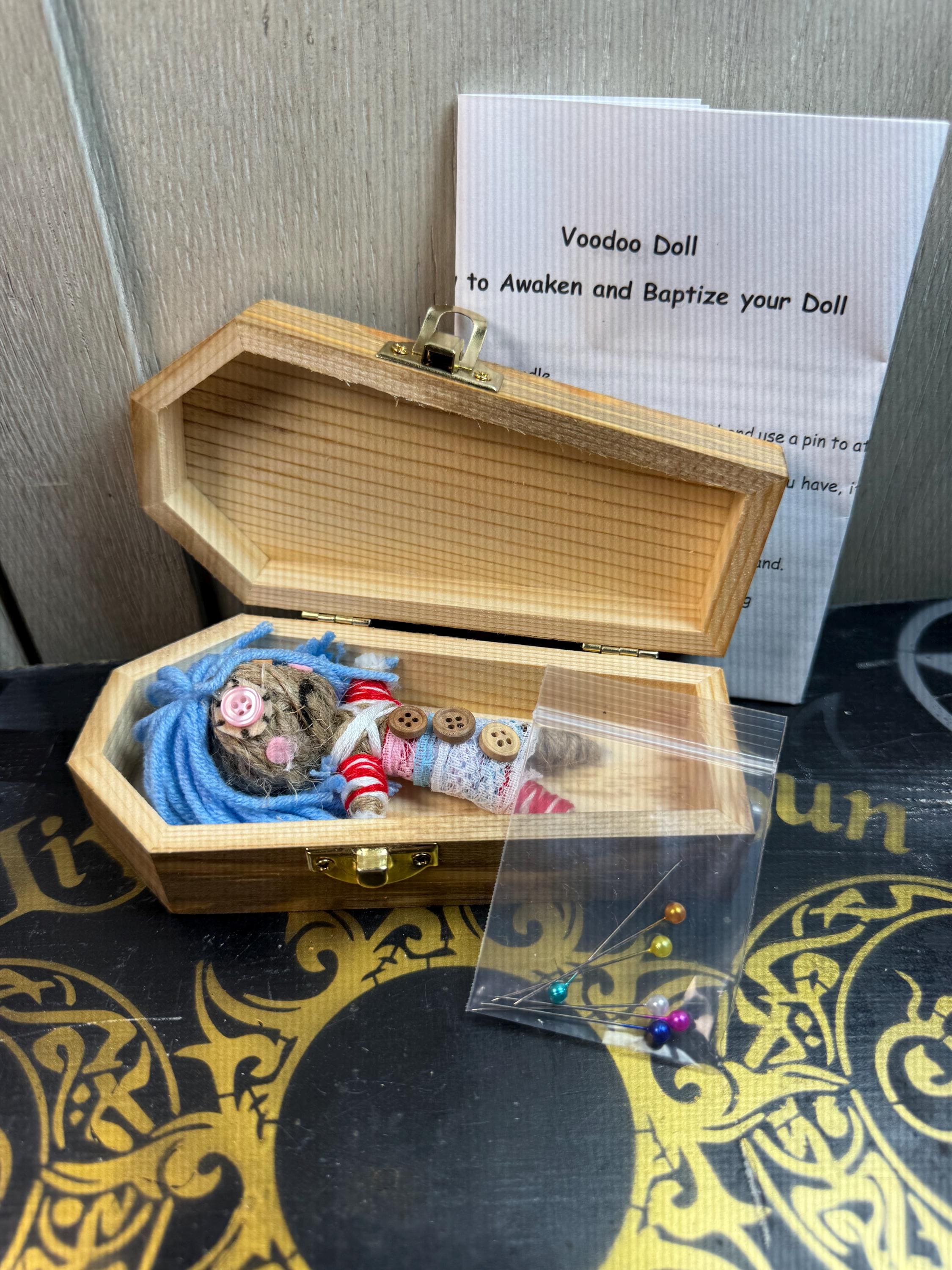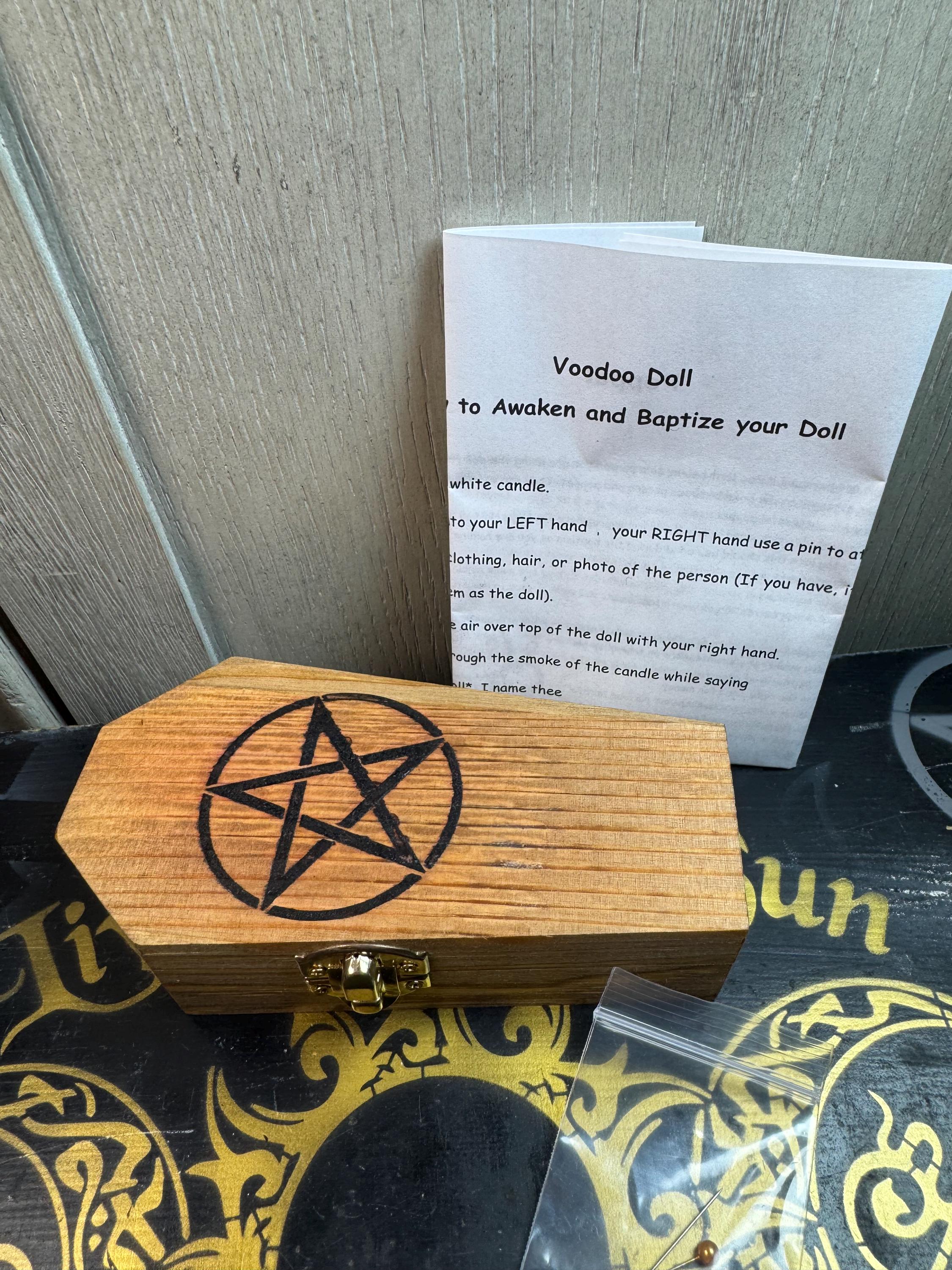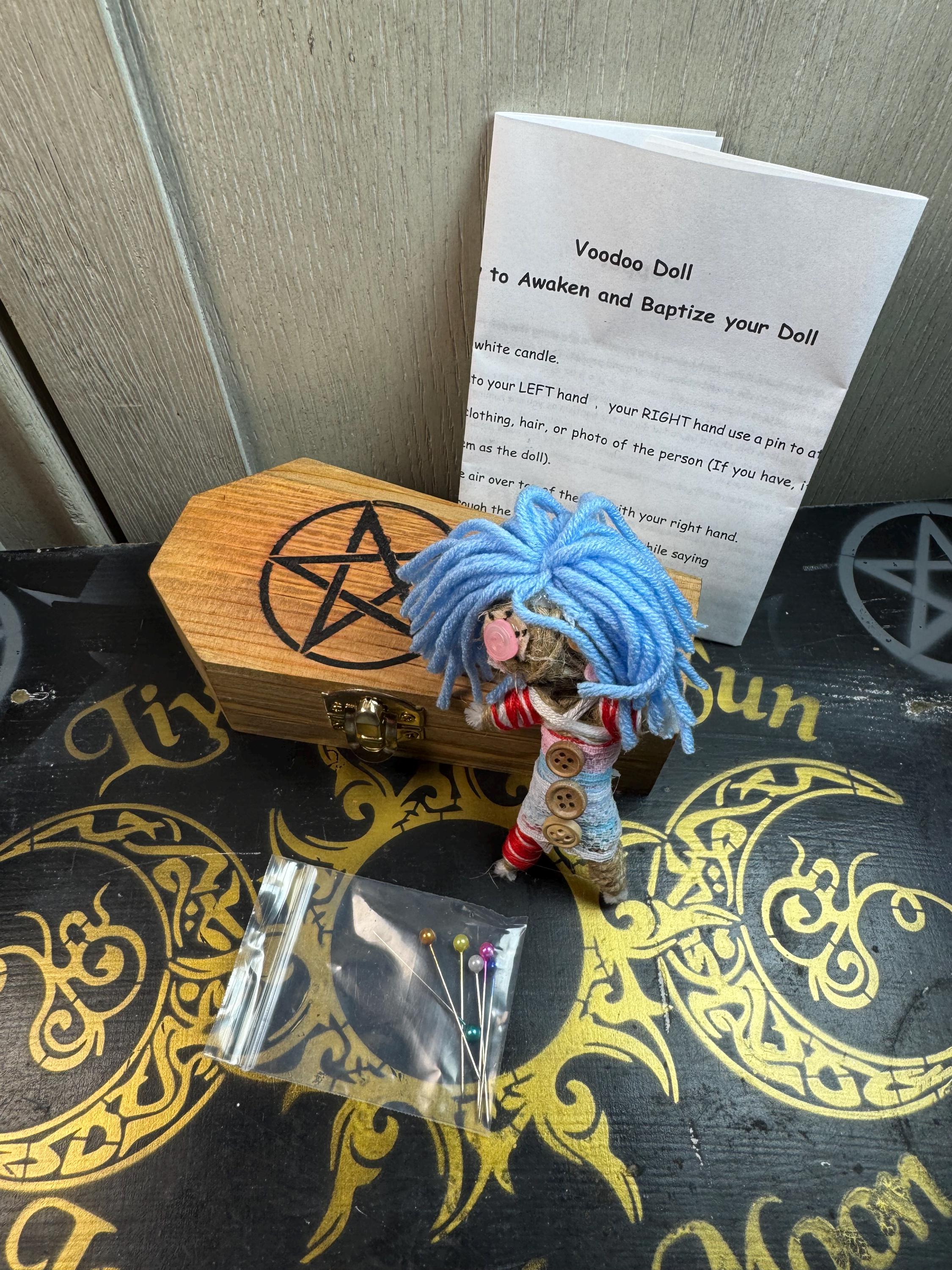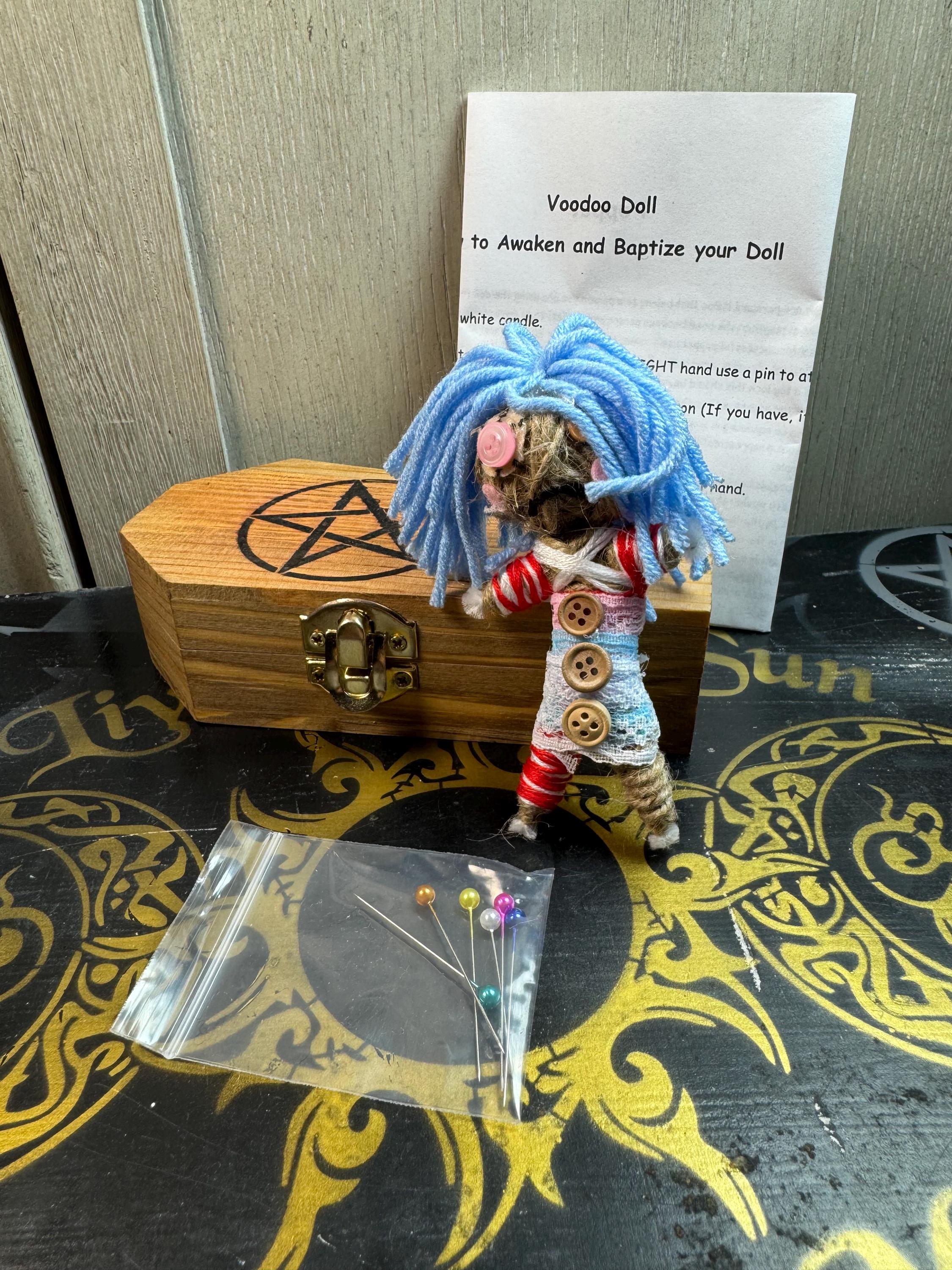 Can be used as a Voodoo Doll or a Poppet Doll Instructions for both are included. A Voodoo Doll is often associated with negative actions like curses, but in many traditions, it has a more neutral or positive purpose, representing a spiritual connection for healing, communication, or protection. The color specifically can be used in a variety of rituals, including banishing negativity or for connection to certain spirits or ancestors, but the meaning depends on the used and tradition. In Western popular culture, the doll has been sensationalized as a tool for harm, a narrative not rooted in the original practices of Vodou. Comes with instructions, straight pins and a necklace for you, and a wooden casket for doll. Blessed Be!
