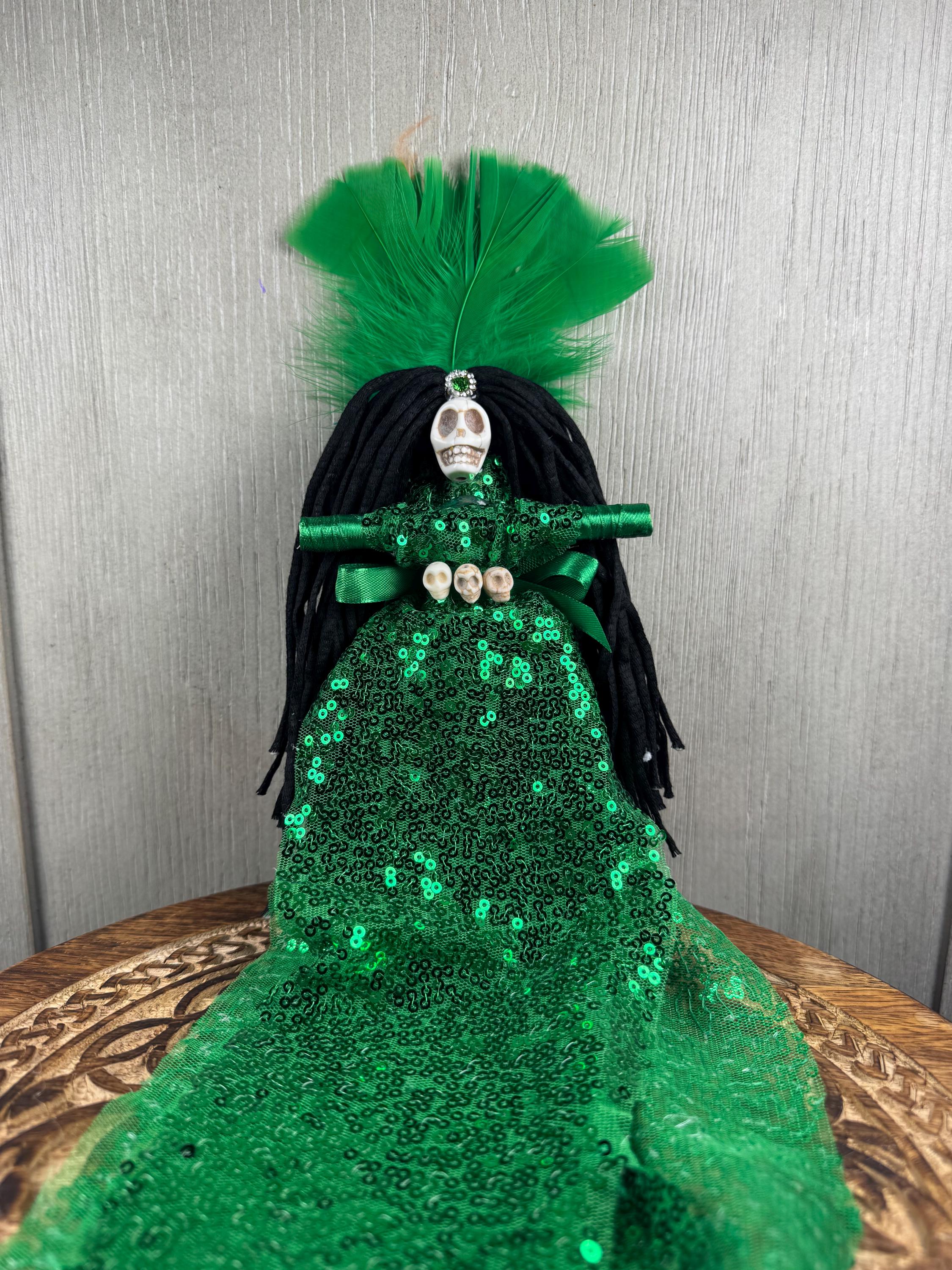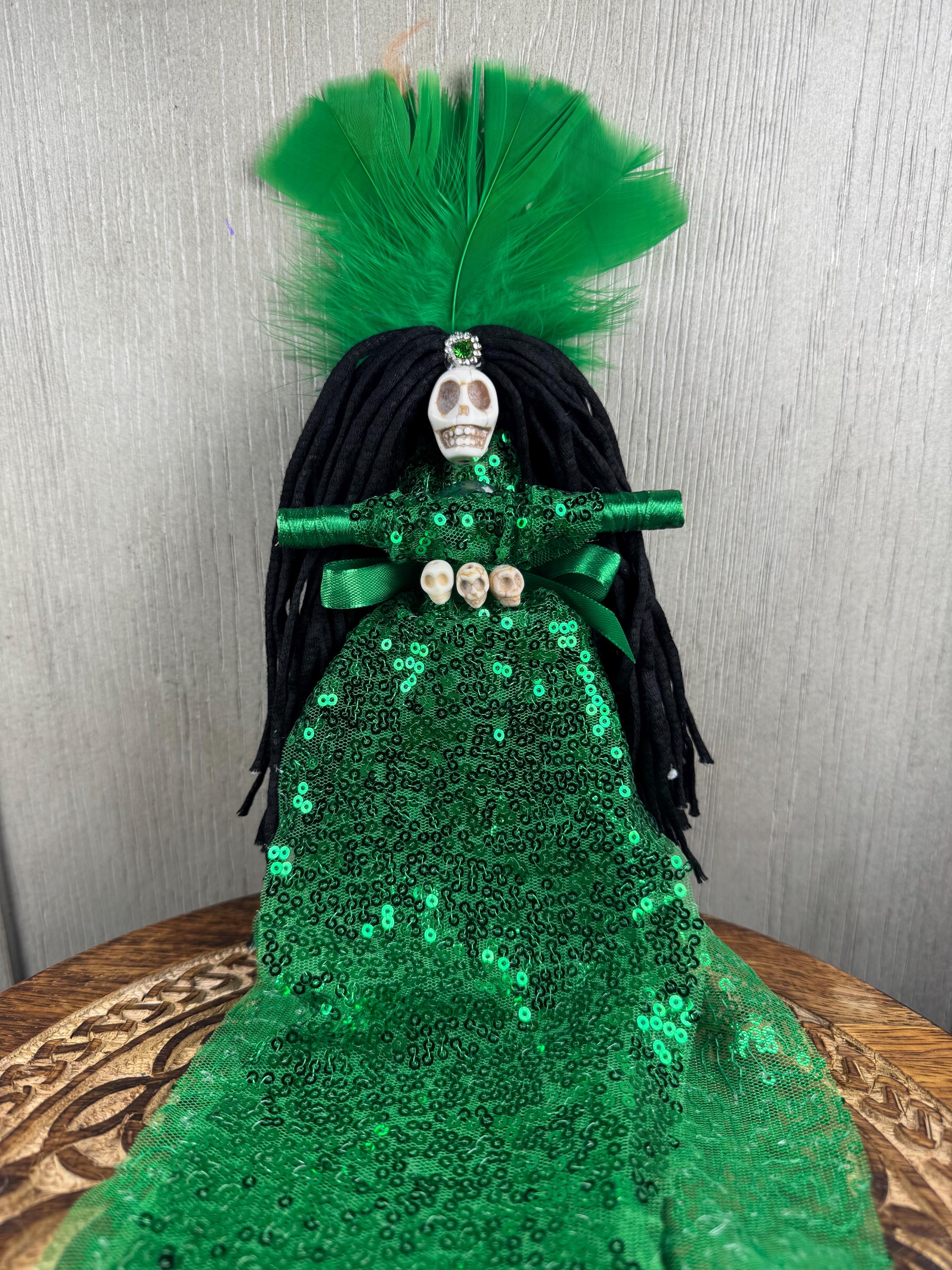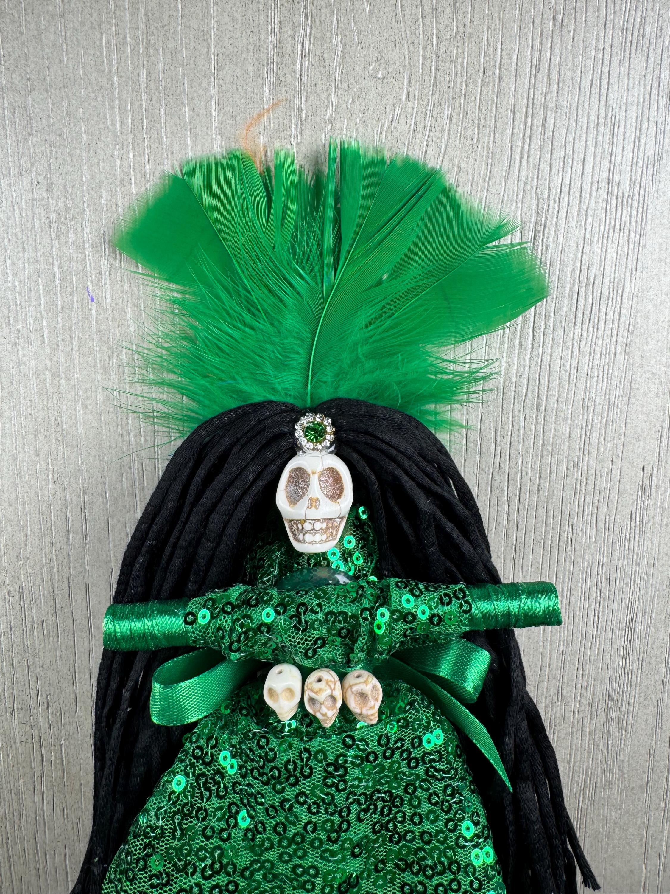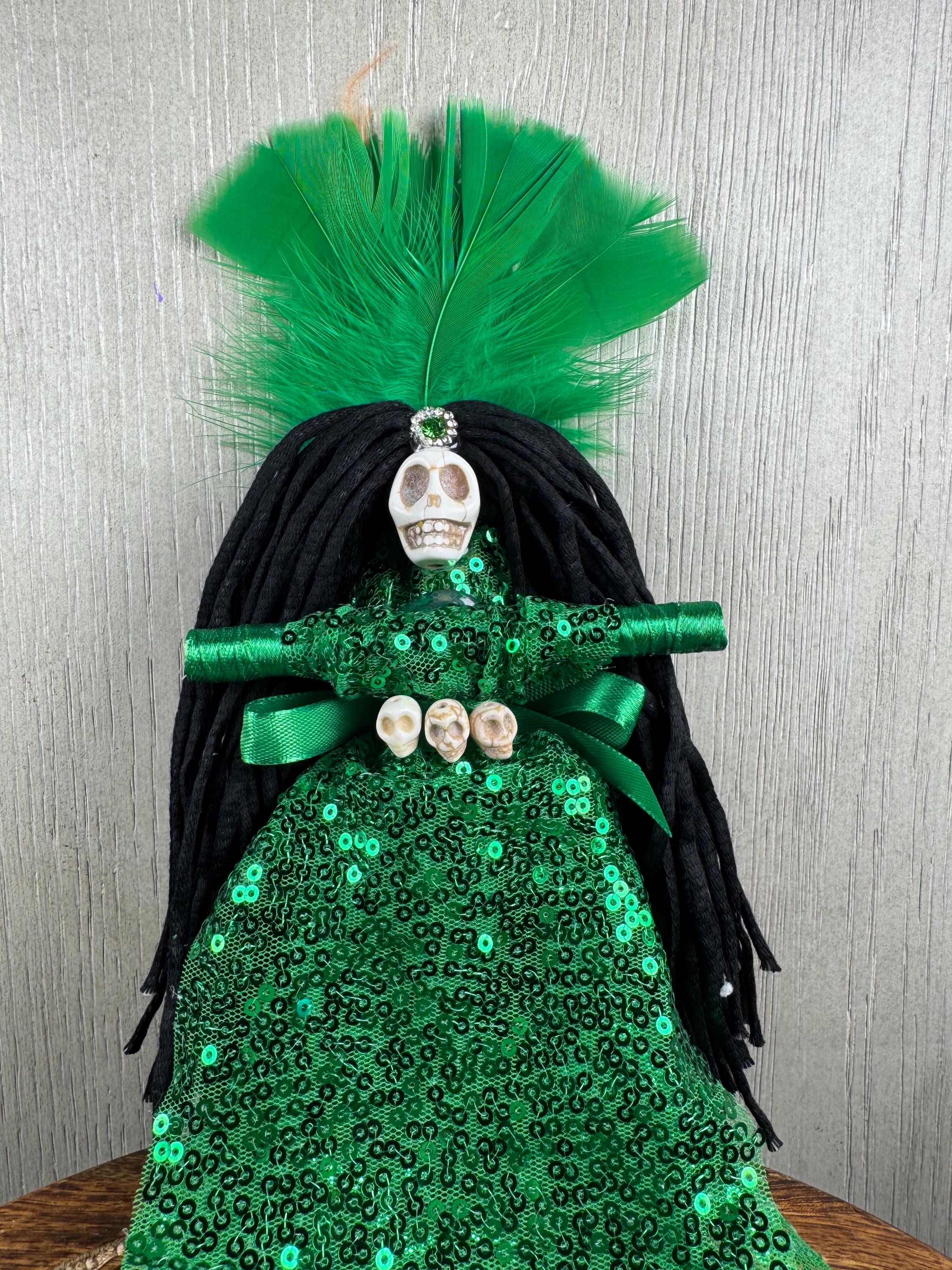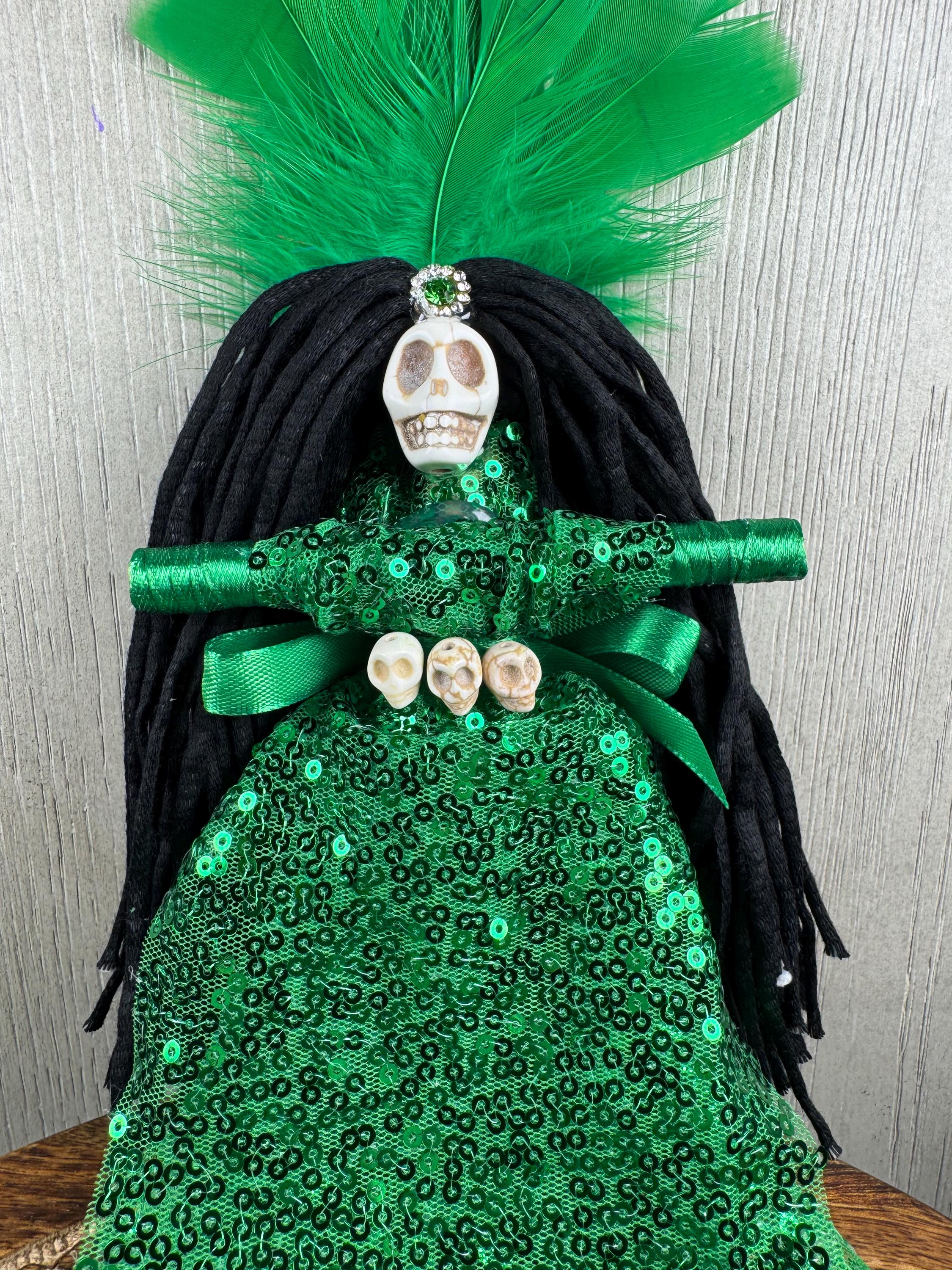 Green New Orlean's Style Voodoo Doll. In Voodoo and Hoodoo, a green doll is primarily used to attract money, prosperity, and financial success. It is associated with gambling luck, business growth, fertility, and general good fortune, acting as a focus for attracting abundance. It signifies material gain, financial growth, and positive energy. Blessed Be!