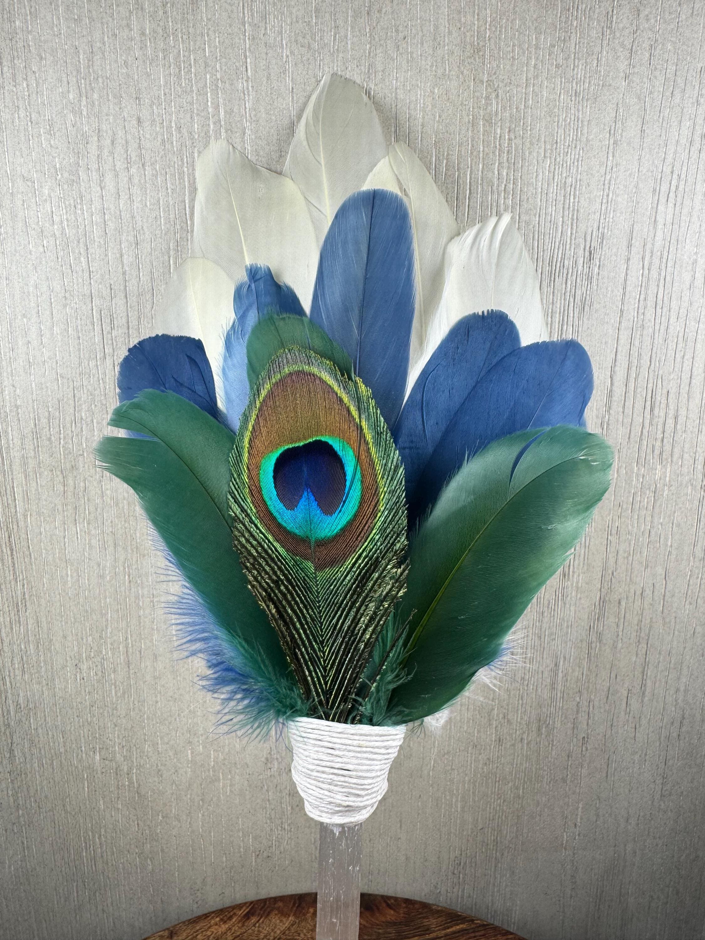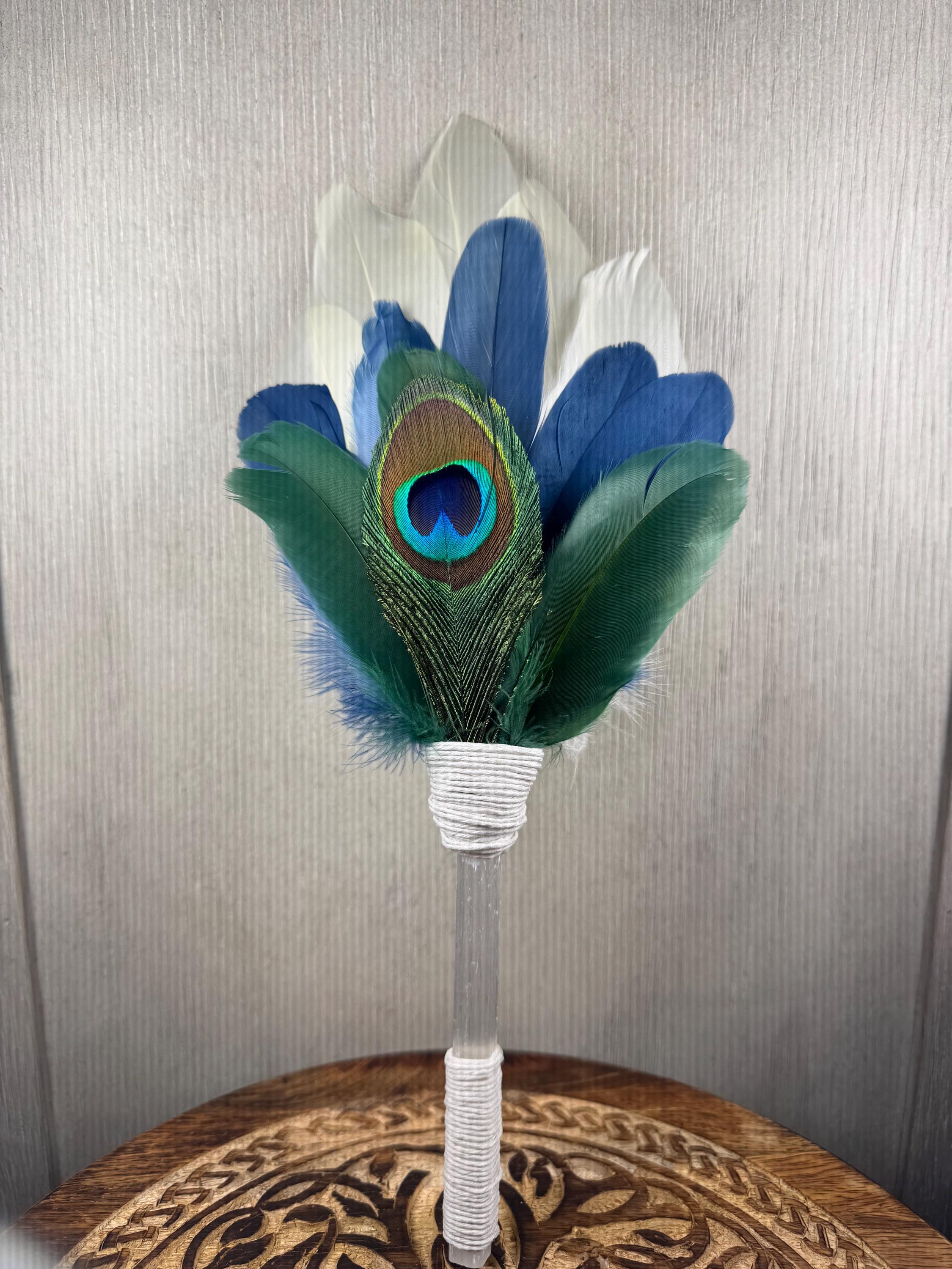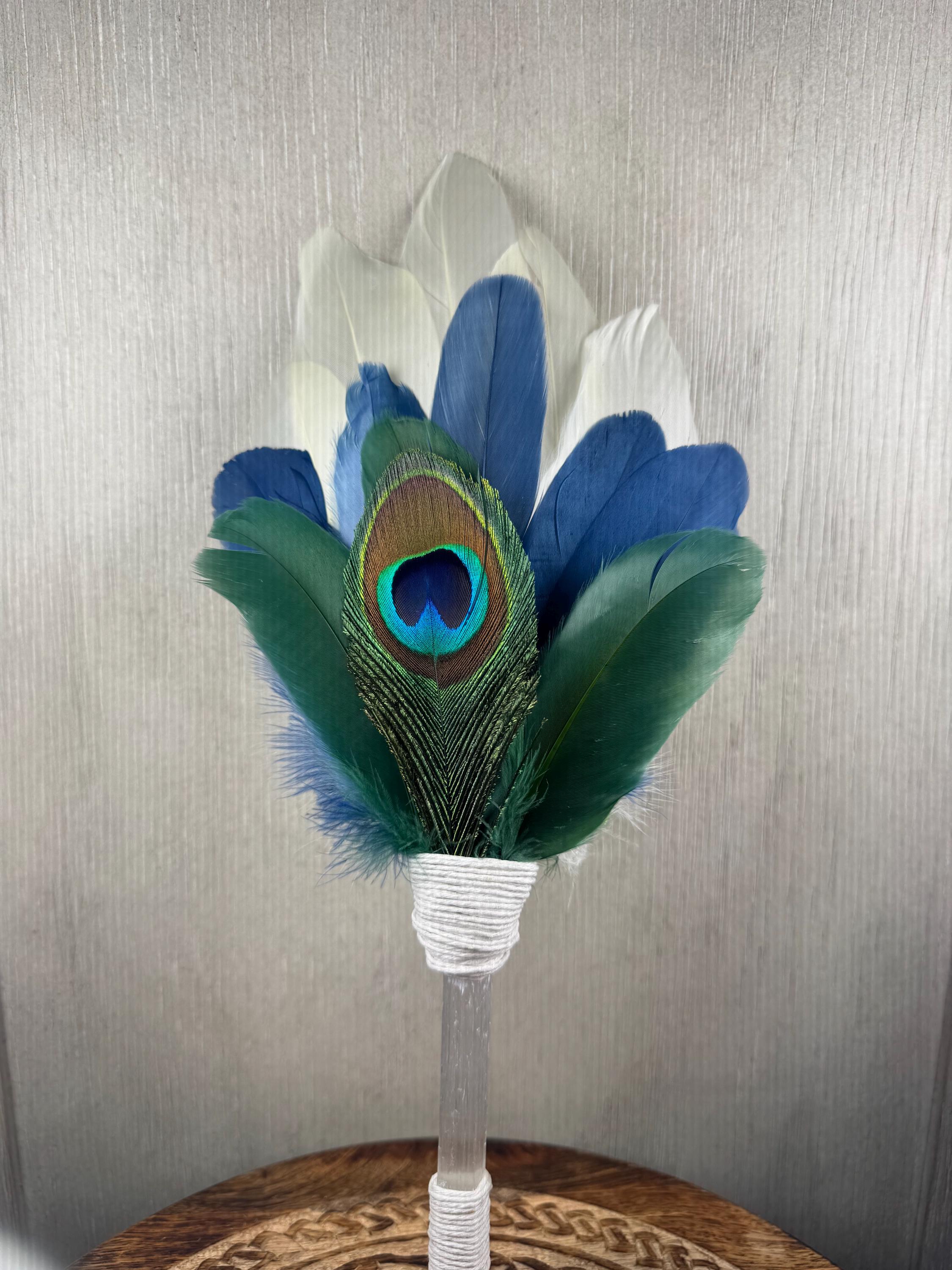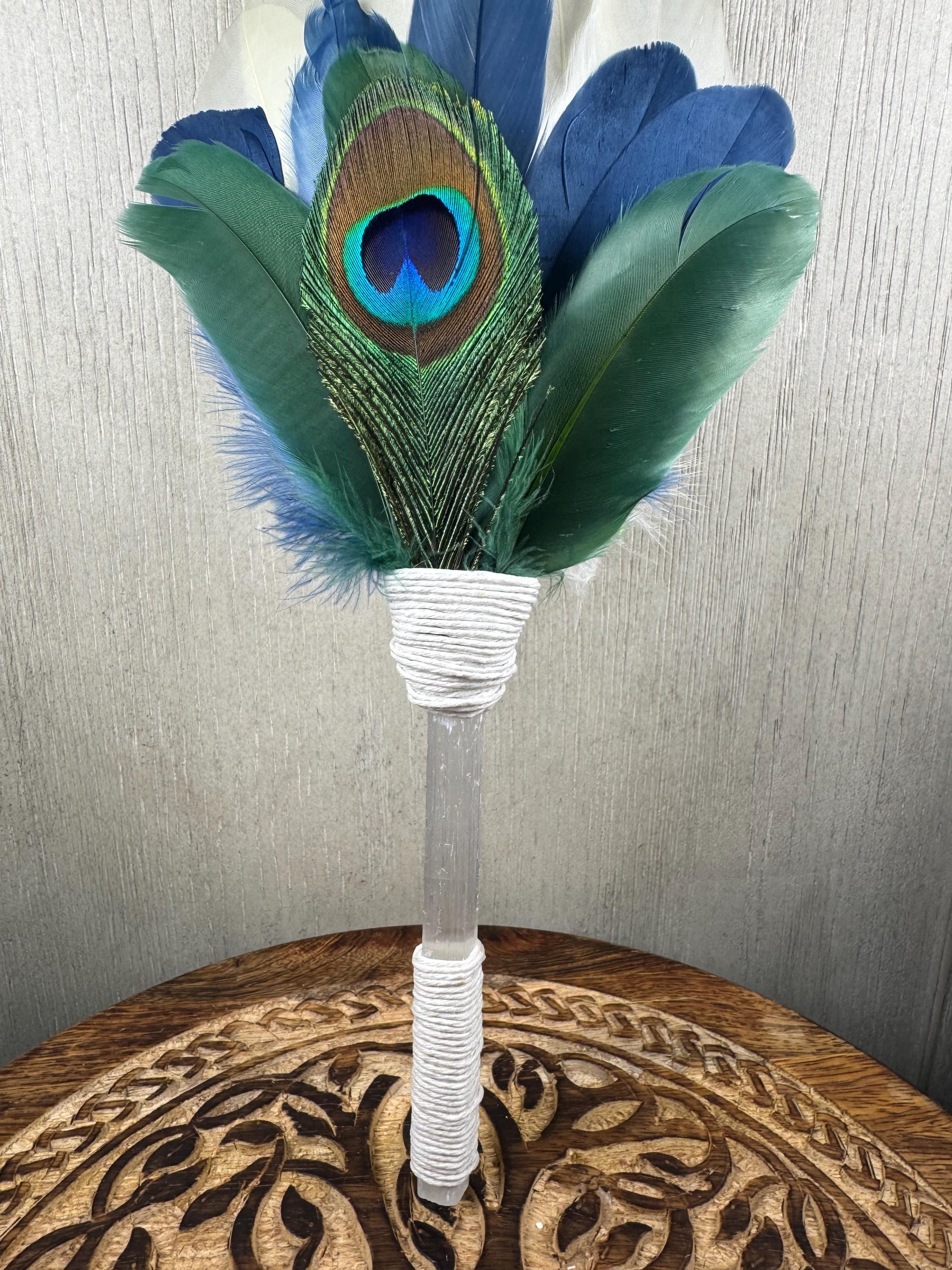 14" Smudging Feather Fan/Ceremonial. Made with 4 Different types of feathers, Selenite Handle, the feathers are not plucked they are harvested FALLEN feathers, handle and top where feathers are attached are wrapped with Hemp. The ritual feather fan is used to smudge spaces with Palo Santo, Sage and other incenses. When smudging, use the feather fan to softly direct the smoke to the desired direction. Keep it in a sacred place like an altar. Blessed Be!