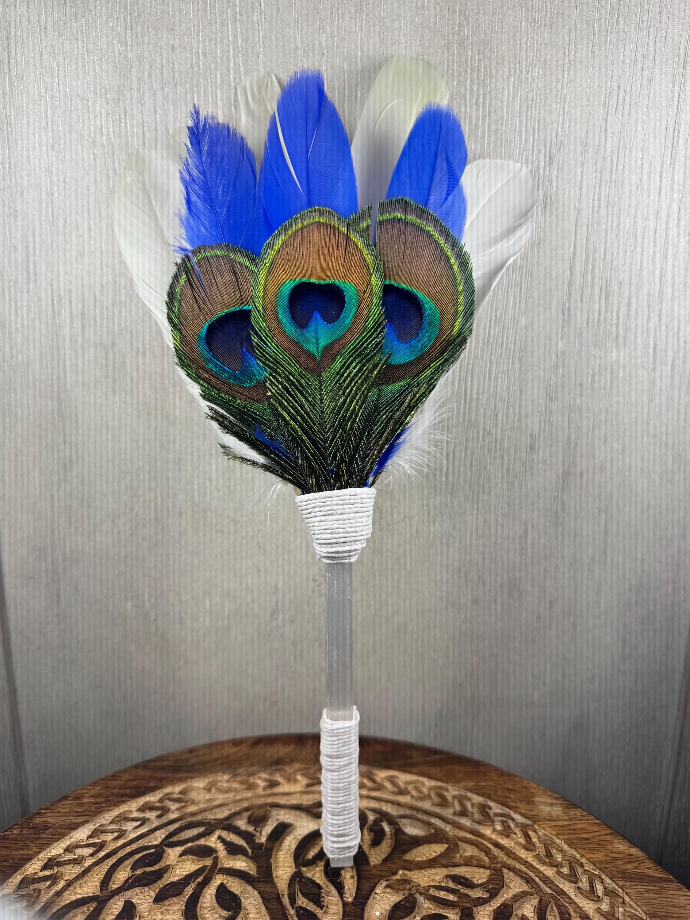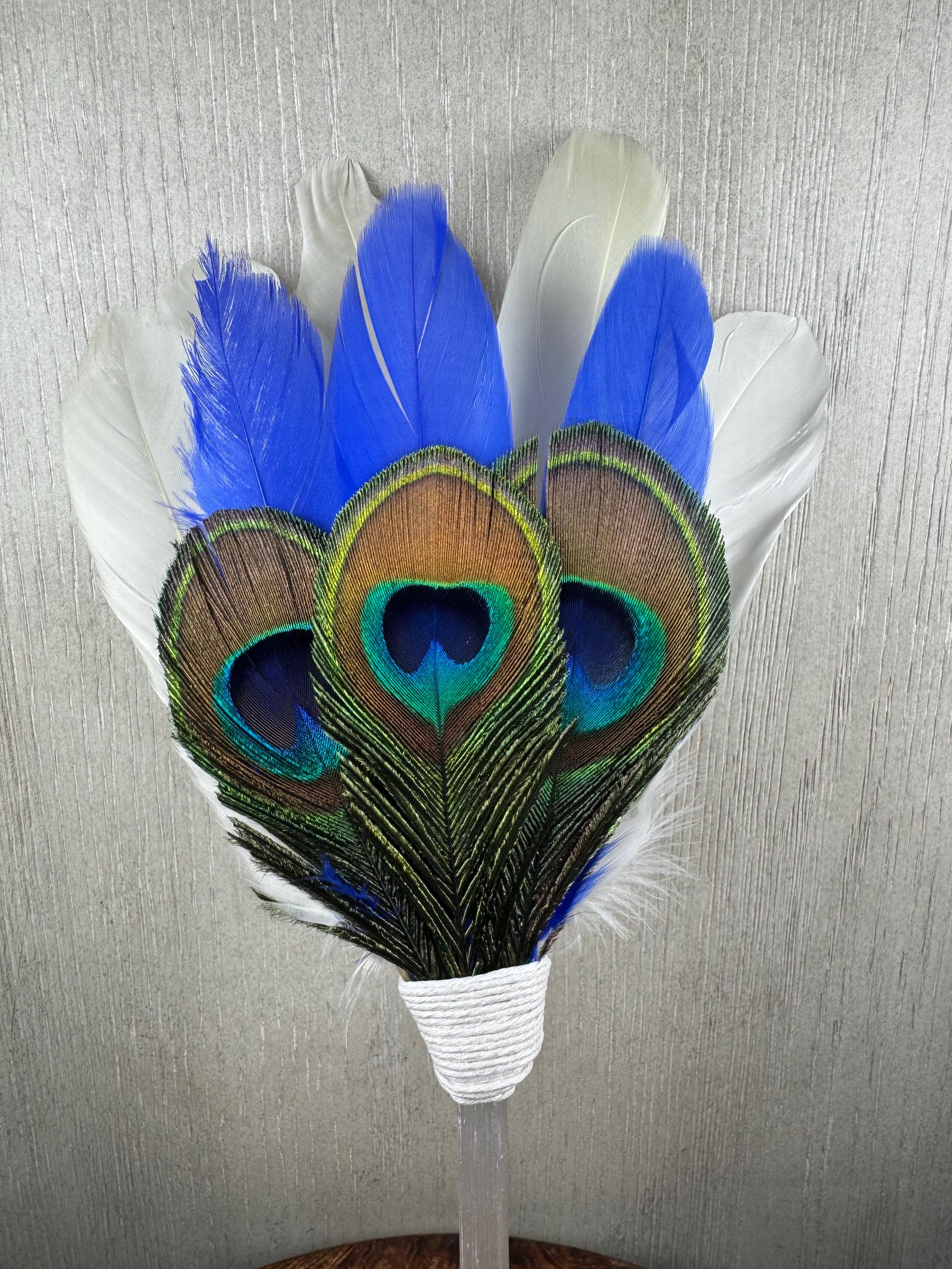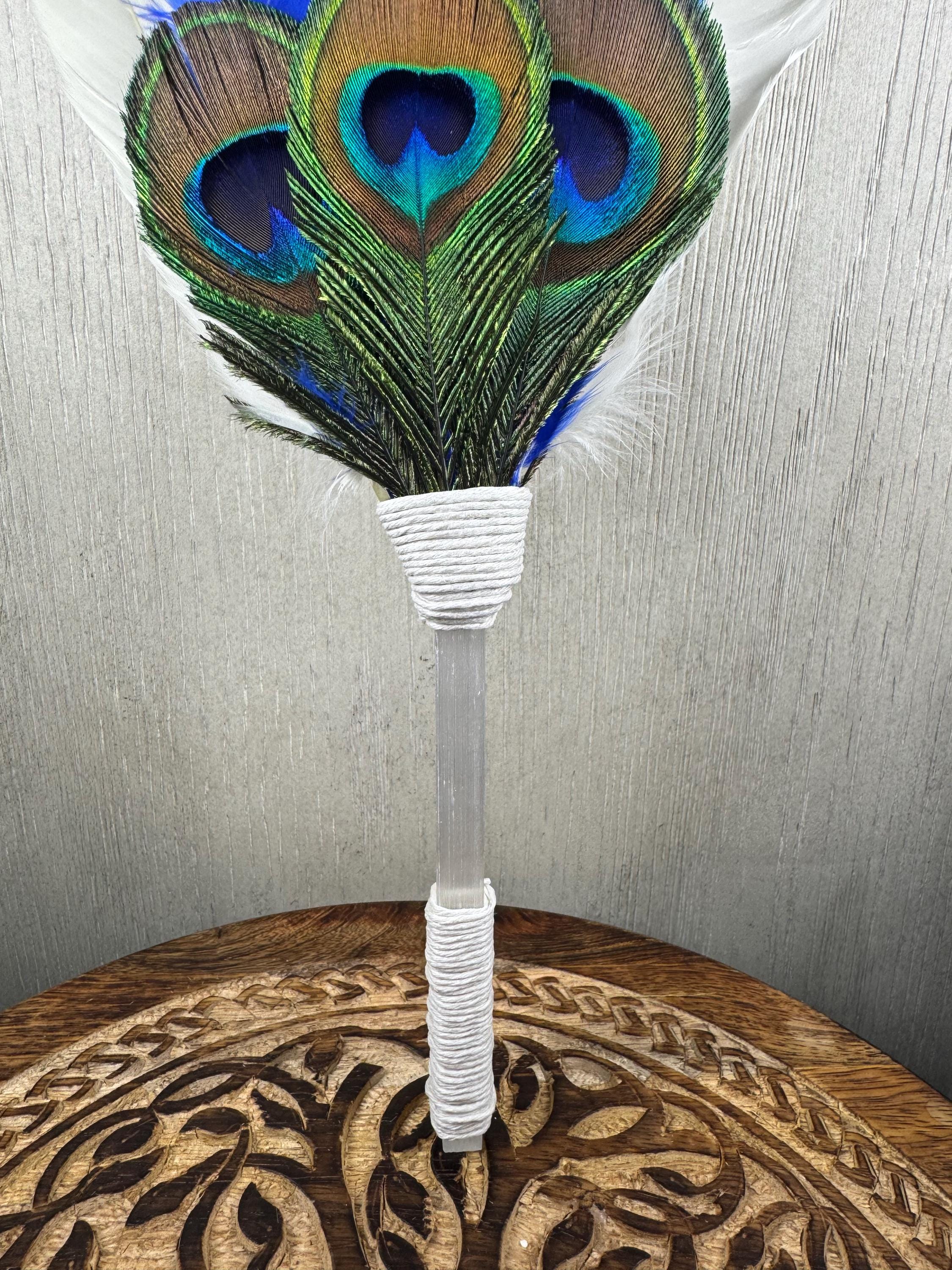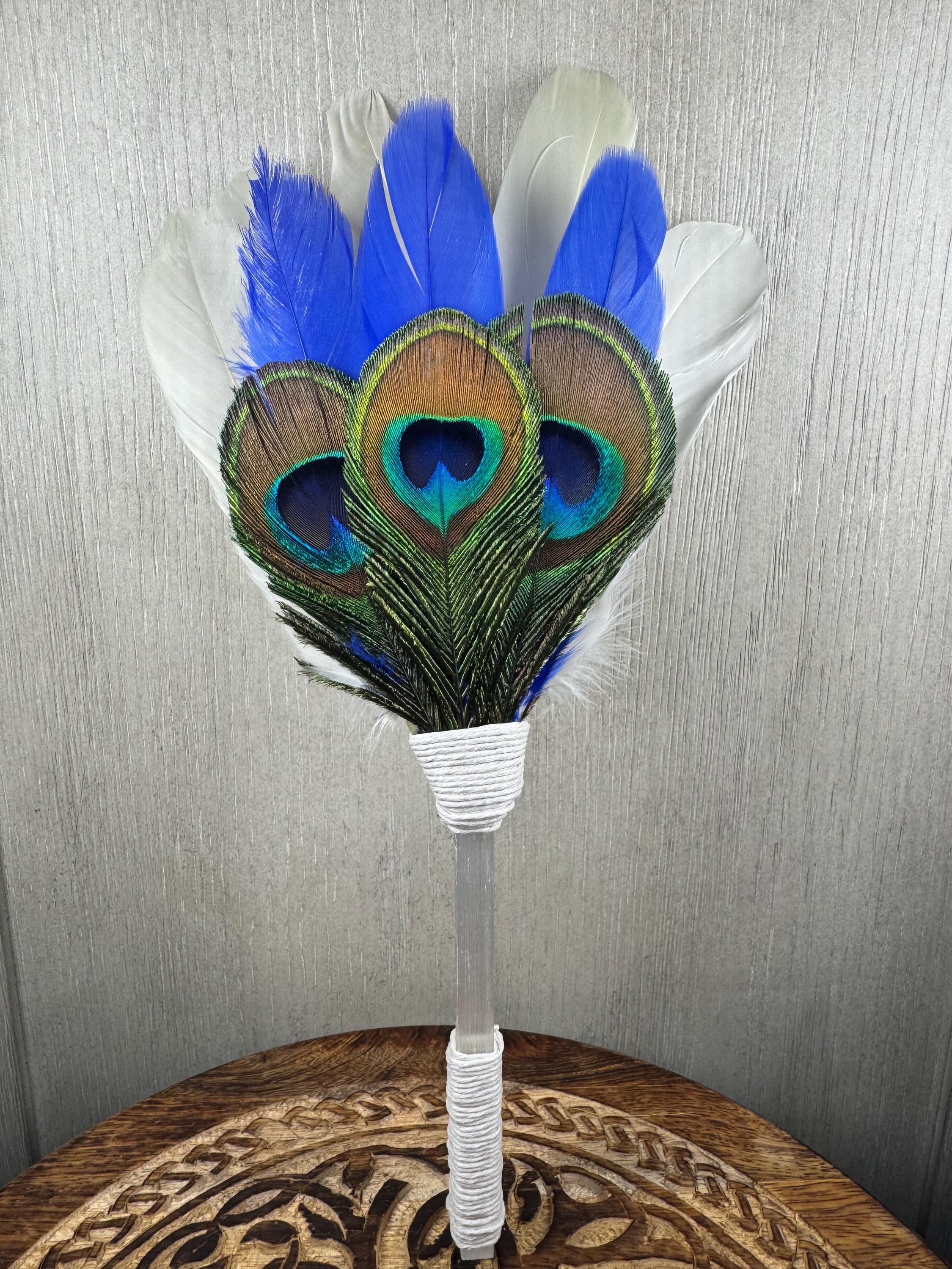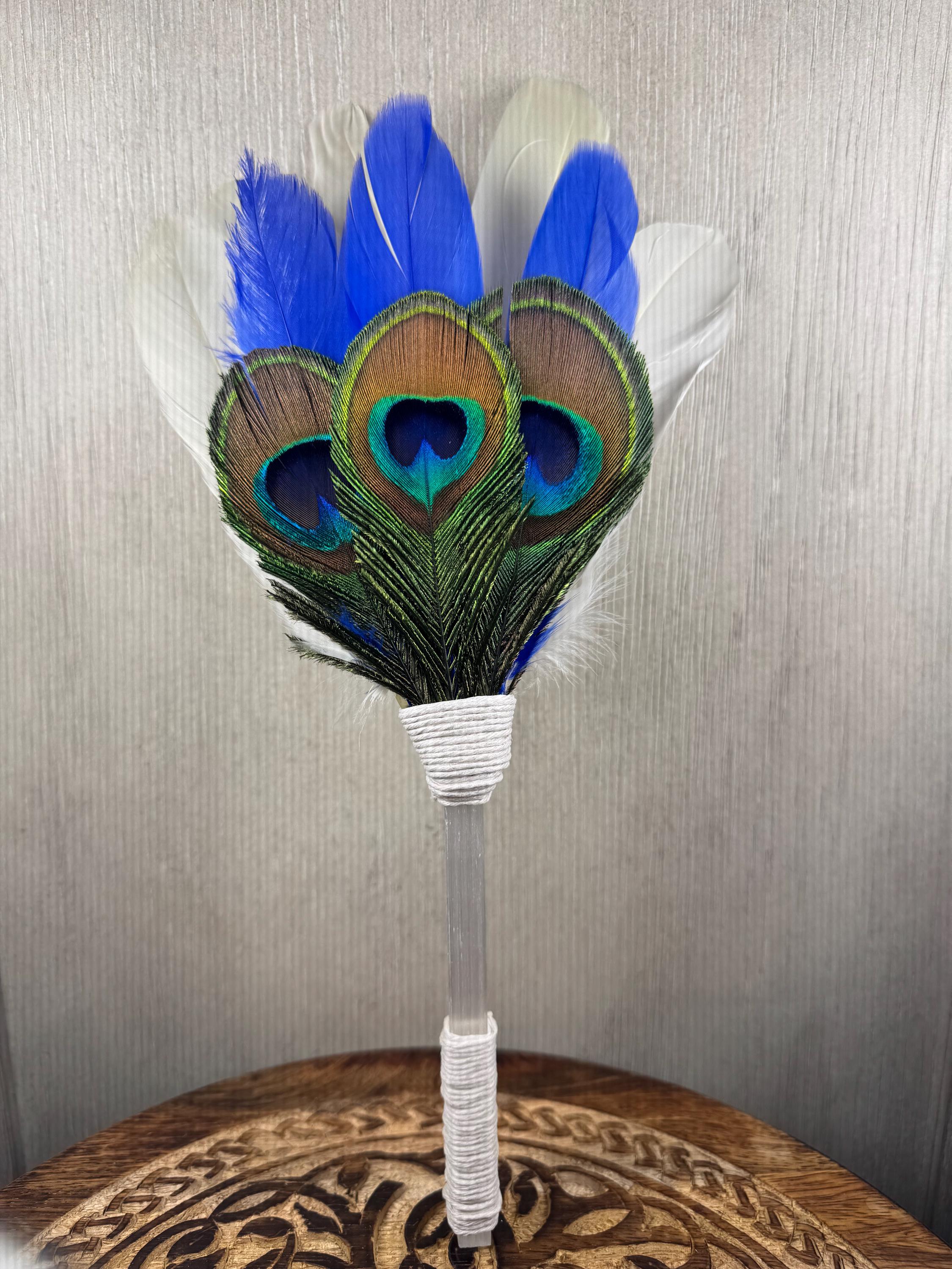 13" Smudging Feather Fan/Ceremonial. Made with 3 Different types of feathers, Selenite Handle, the feathers are not plucked they are harvested FALLEN feathers, handle and top where feathers are attached are wrapped with Hemp. The ritual feather fan is used to smudge spaces with Palo Santo, Sage and other incenses. When smudging, use the feather fan to softly direct the smoke to the desired direction. Keep it in a sacred place like an altar. Blessed Be!