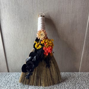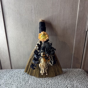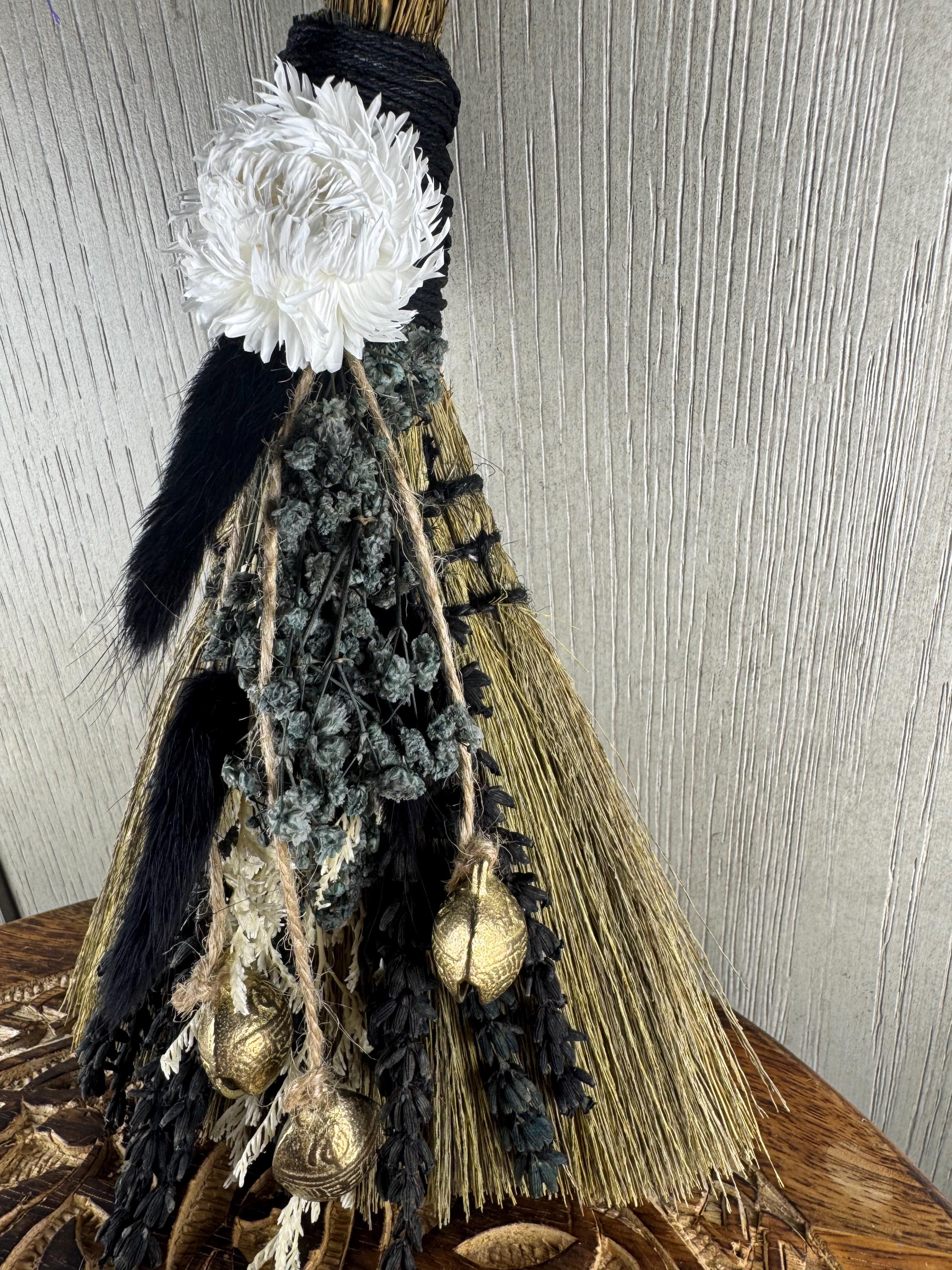 Brooms and besoms are used for protection, to ward off evil spirits, and cleansing of ritual spaces. Usually help a few inches above the floor, a special broom is used to cleanse a space of negative energies or "energetic clutter" before creating a ritual or magic circle. Made with real dried preserved flowers, 3 Brass Tibetan Bells 25mmx28mm, and wrapped with hemp. One of a kind! Blessed Be!