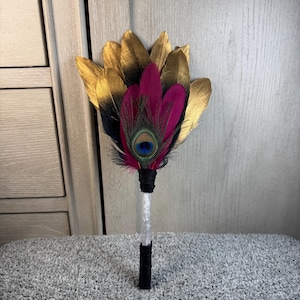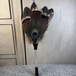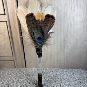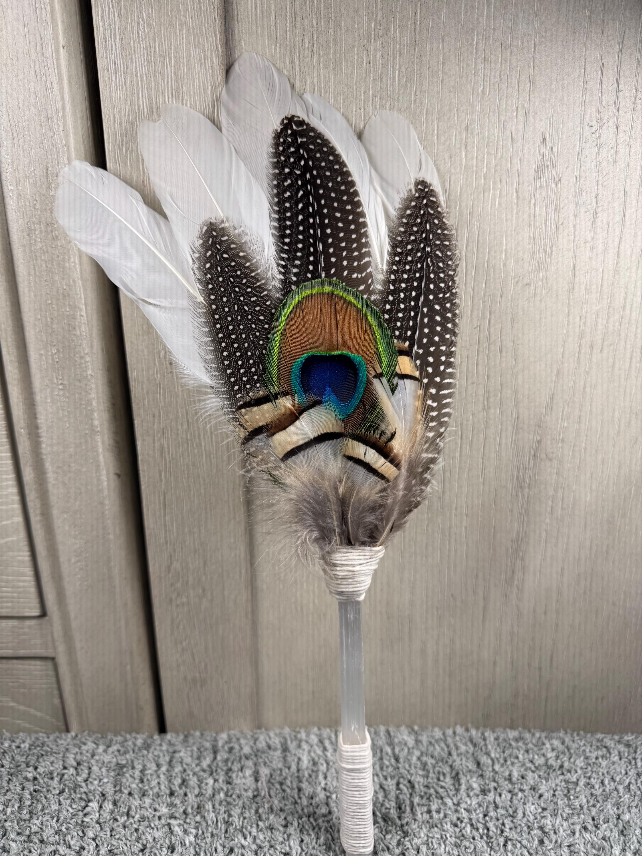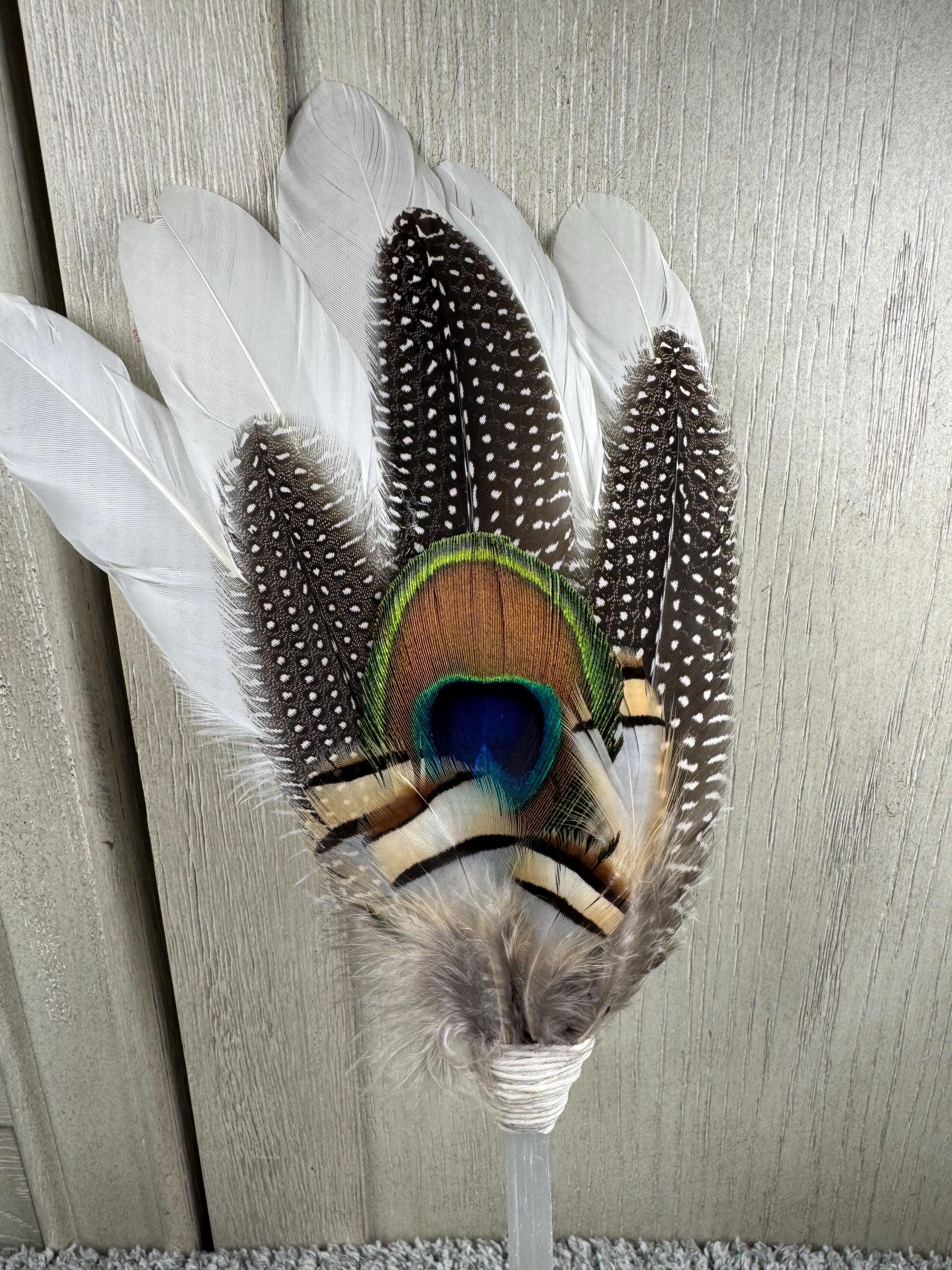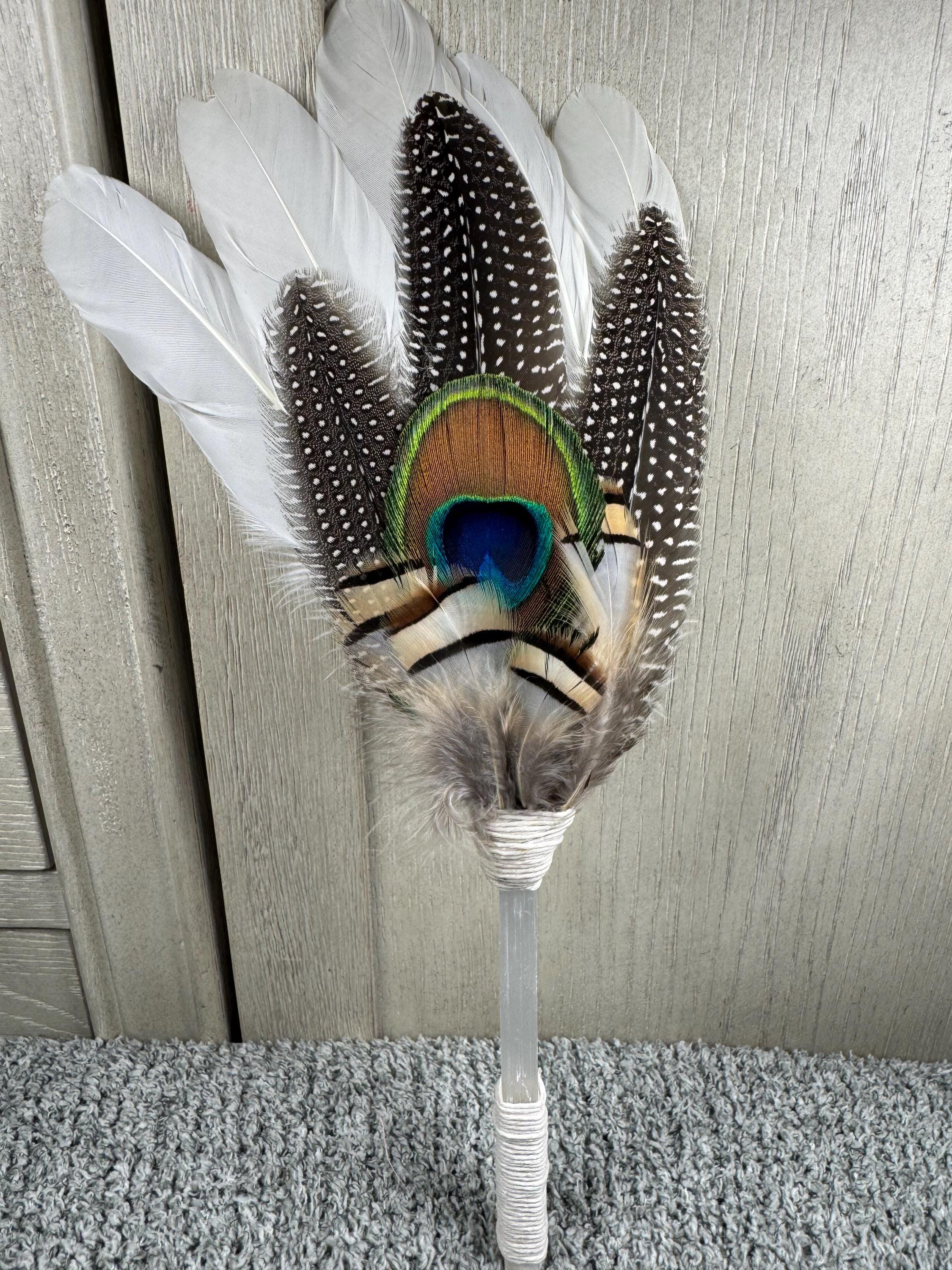 13" Smudging Feather Fan/Ceremonial. Made with 4 Different types of feathers, Selenite Handle, the feathers are not plucked they are harvested FALLEN feathers, handle and top where feathers are attached are wrapped with Hemp. The ritual feather fan is used to smudge spaces with Palo Santo, Sage and other incenses. When smudging, use the feather fan to softly direct the smoke to the desired direction. Keep it in a sacred place like an altar. Blessed Be!
