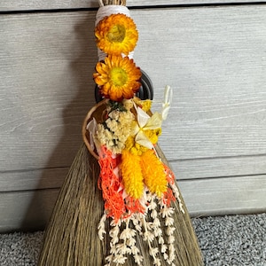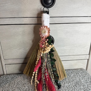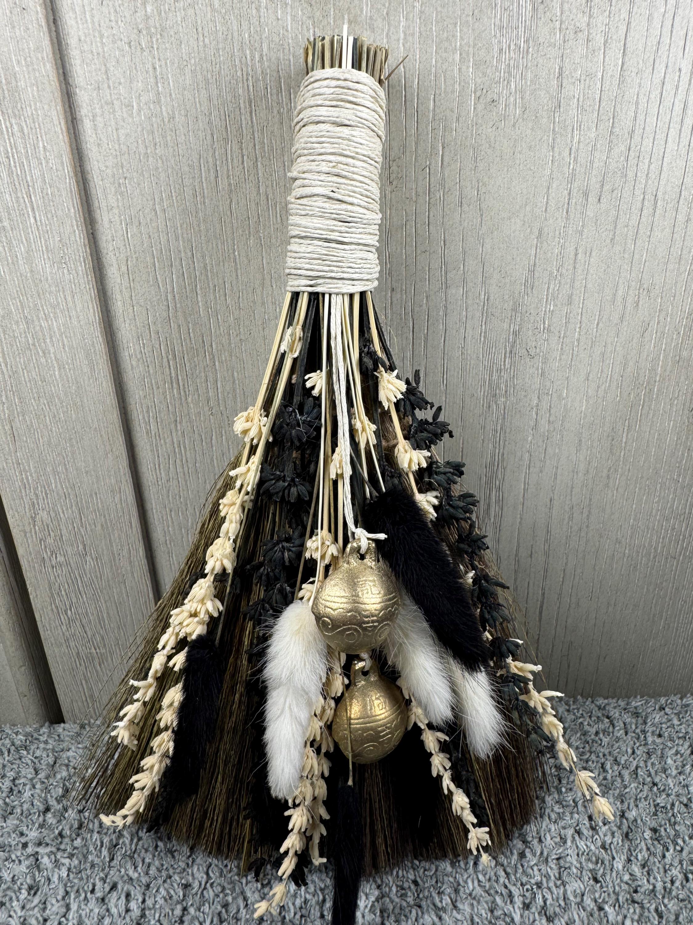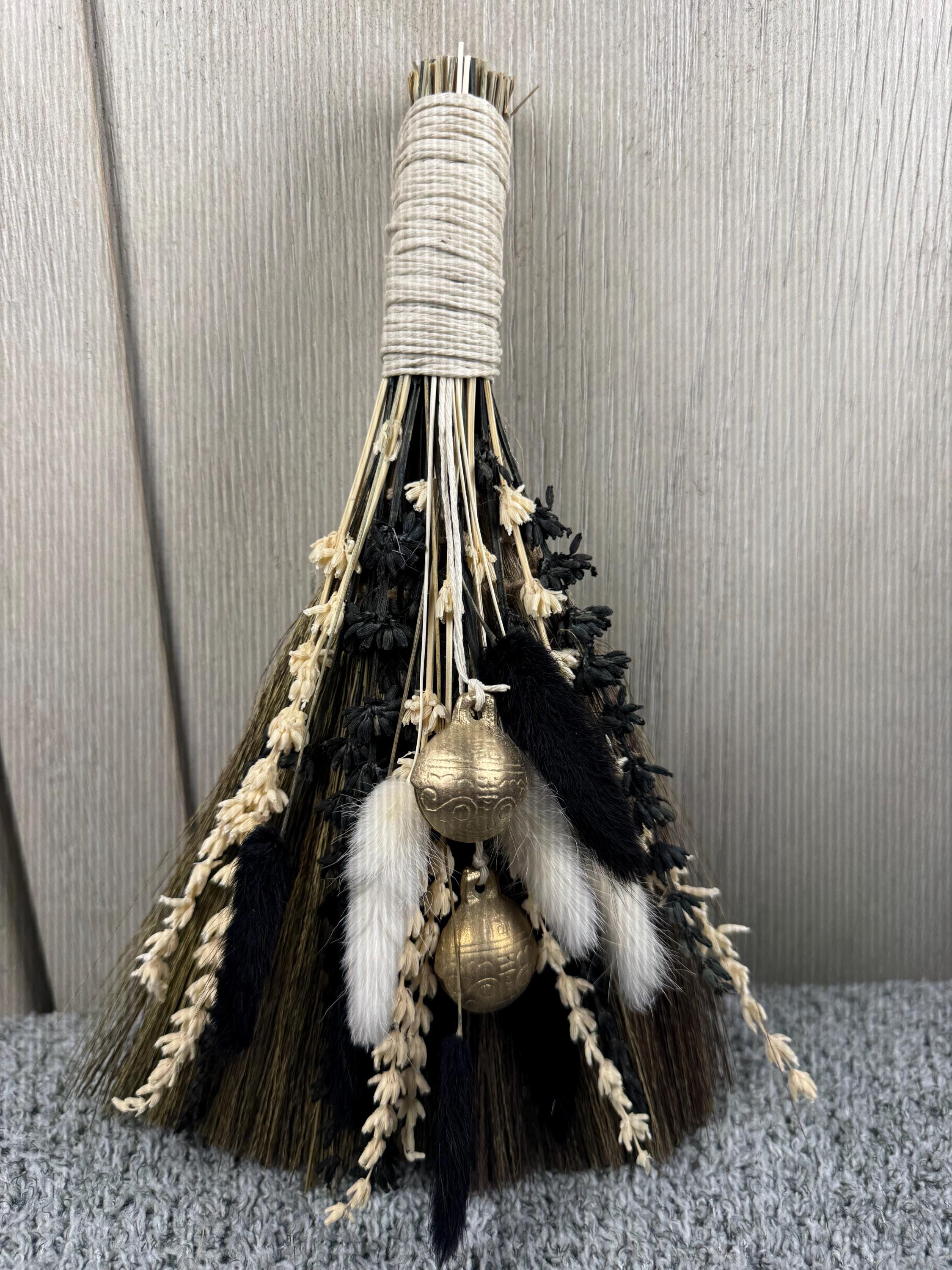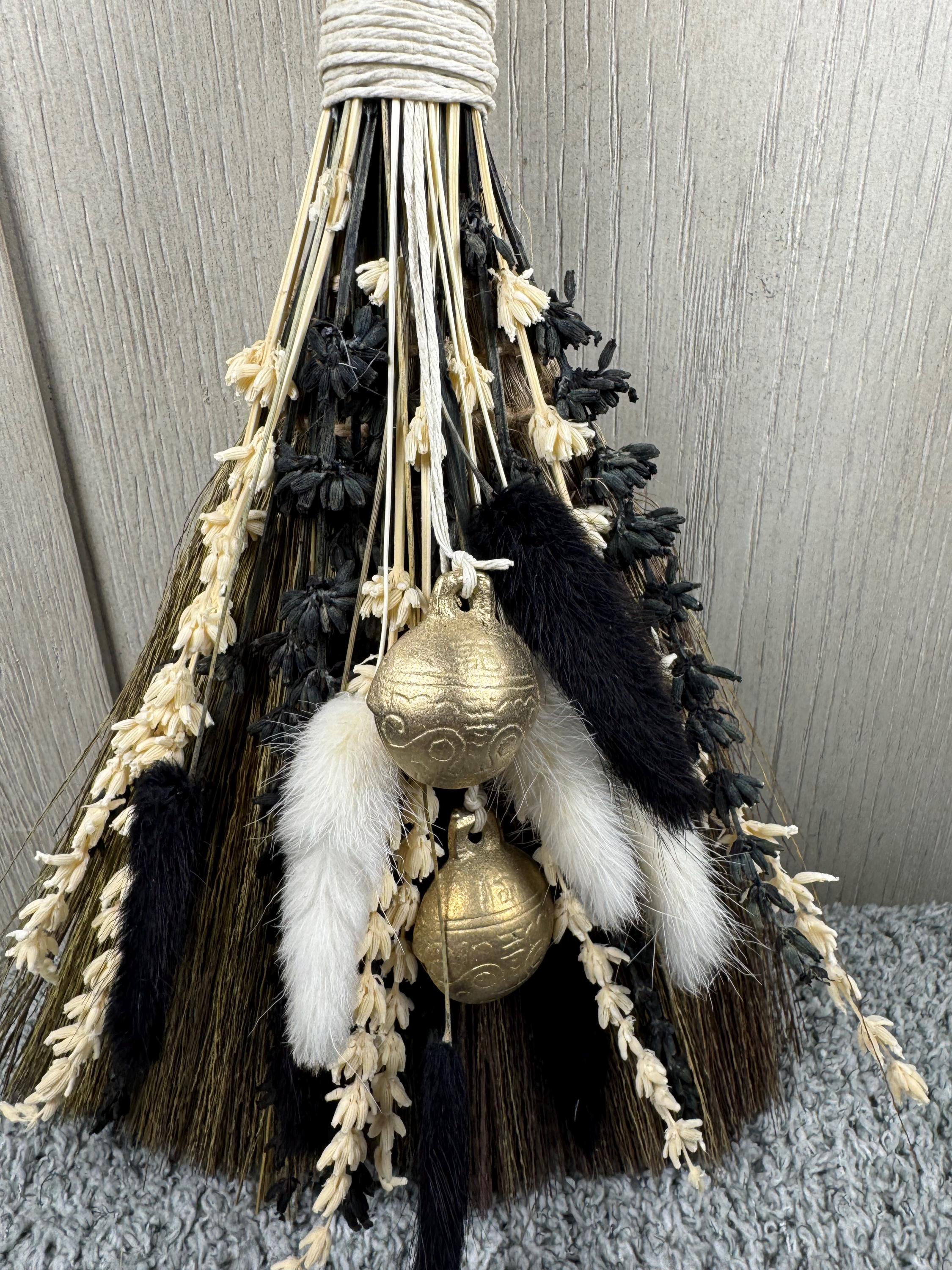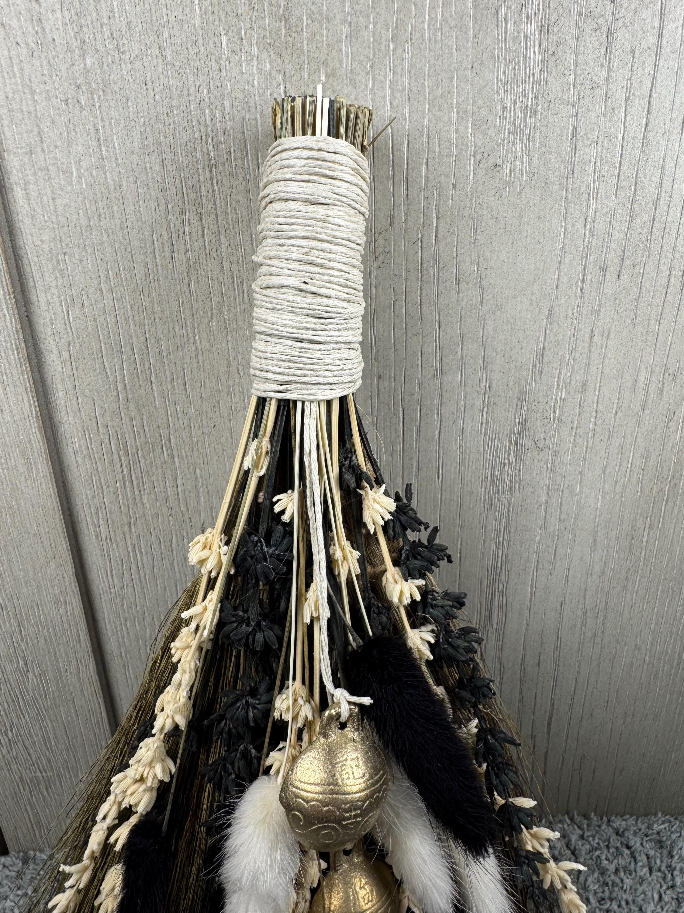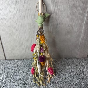 Brooms and besoms are used for protection, to ward off evil spirits, and cleansing of ritual spaces. Usually help a few inches above the floor, a special broom is used to cleanse a space of negative energies or "energetic clutter" before creating a ritual or magic circle. Made with real dried preserved flowers, 2 Brass Tibetan Bells 25mmx28mm, and wrapped with hemp. One of a kind! Blessed Be!