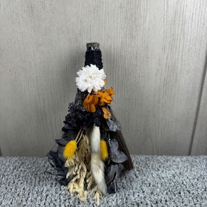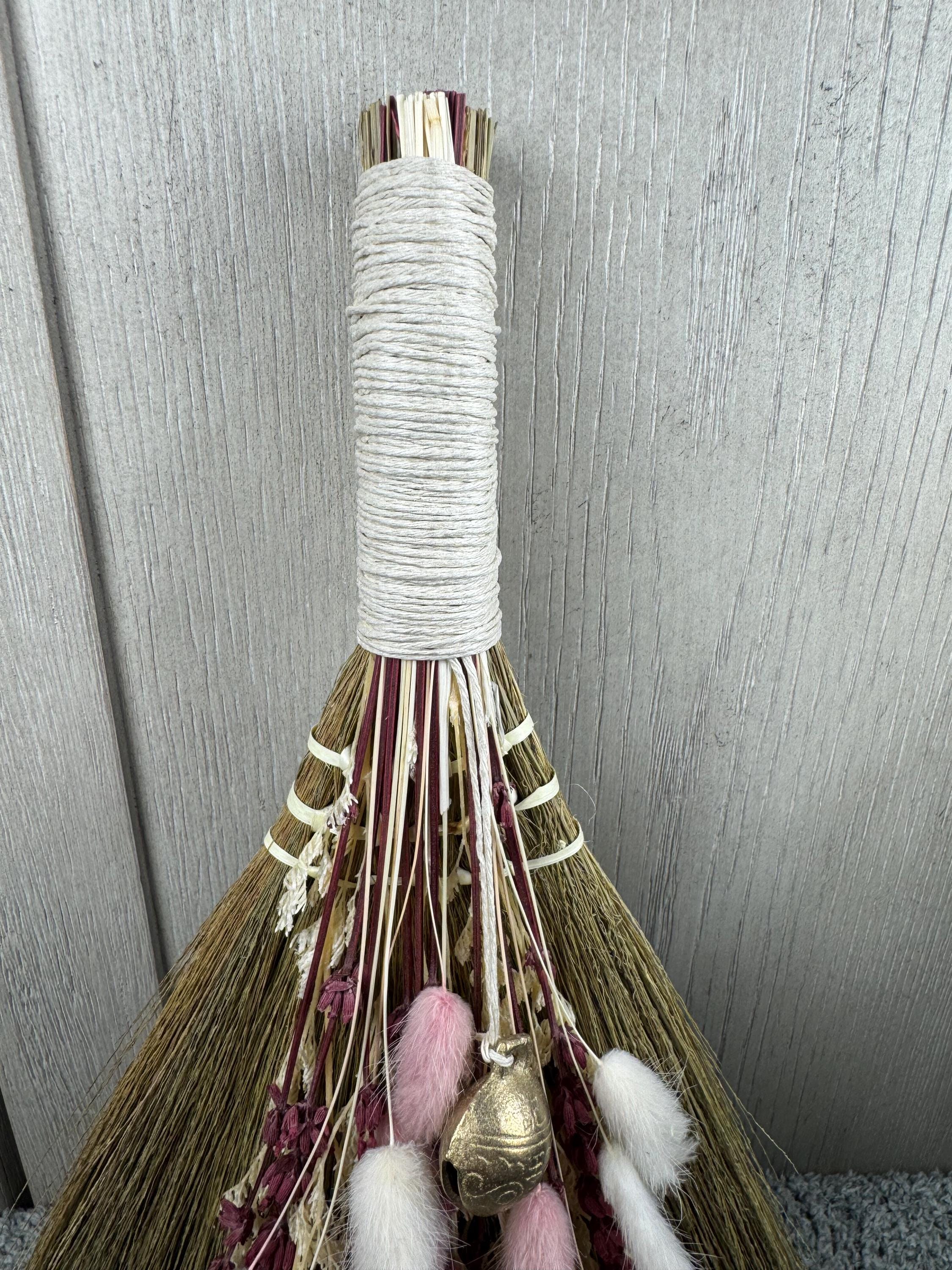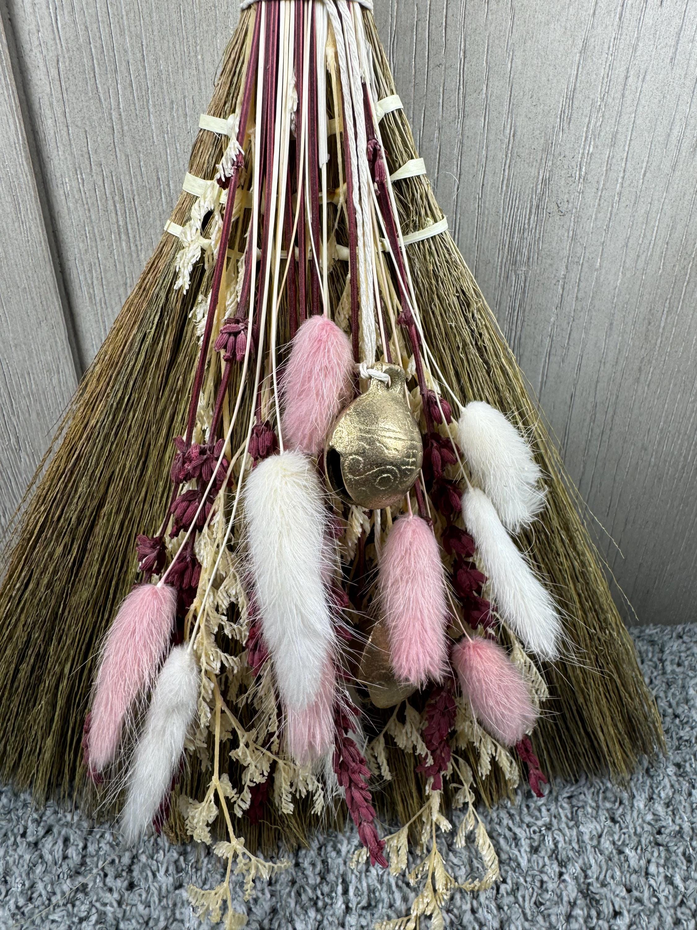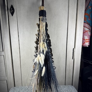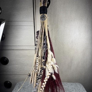 Brooms and besoms are used for protection, to ward off evil spirits, and cleansing of ritual spaces. Usually help a few inches above the floor, a special broom is used to cleanse a space of negative energies or "energetic clutter" before creating a ritual or magic circle. Made with real dried preserved flowers, 2 Brass Tibetan Bells, and wrapped with hemp. One of a kind! Blessed Be!