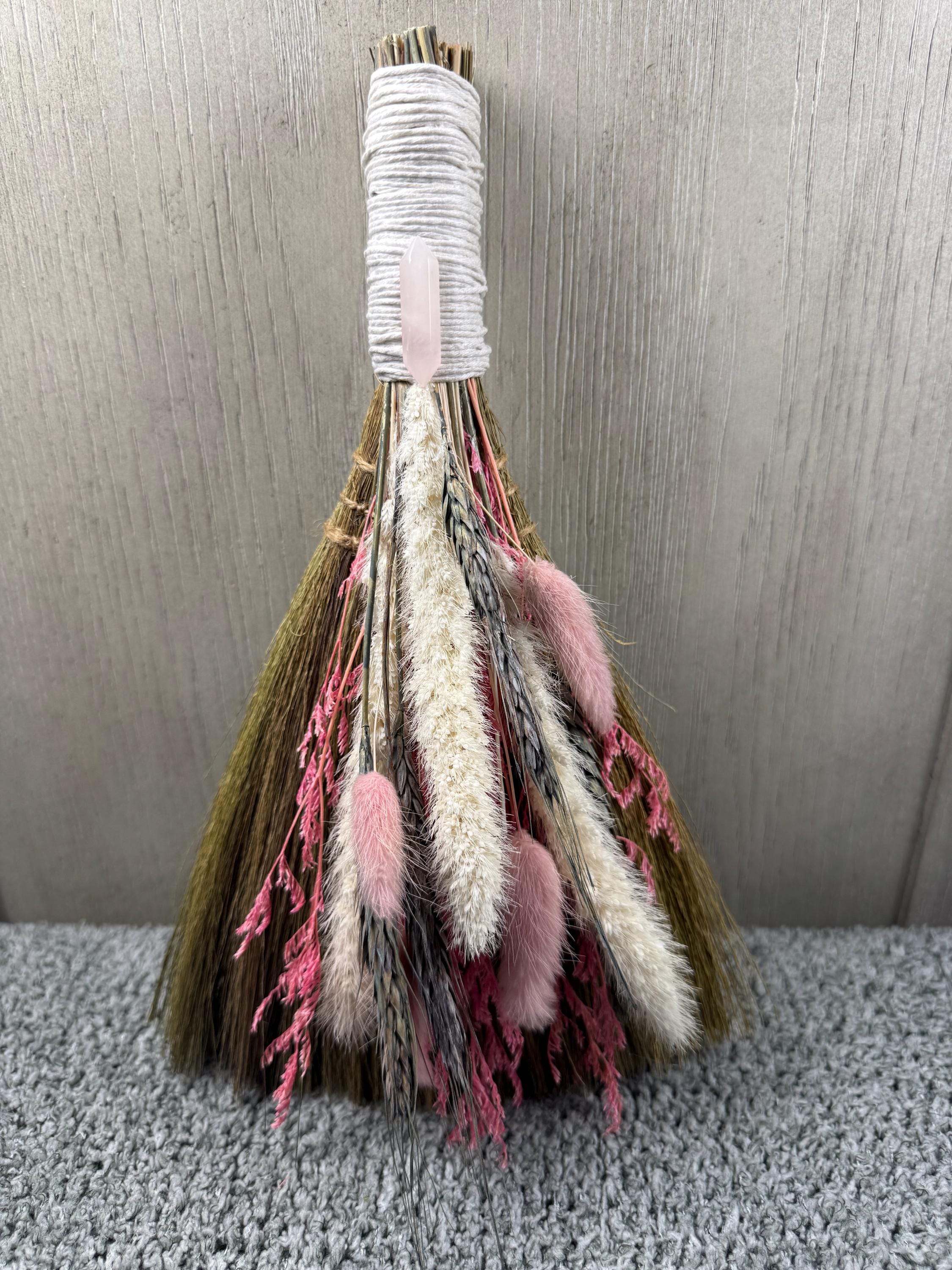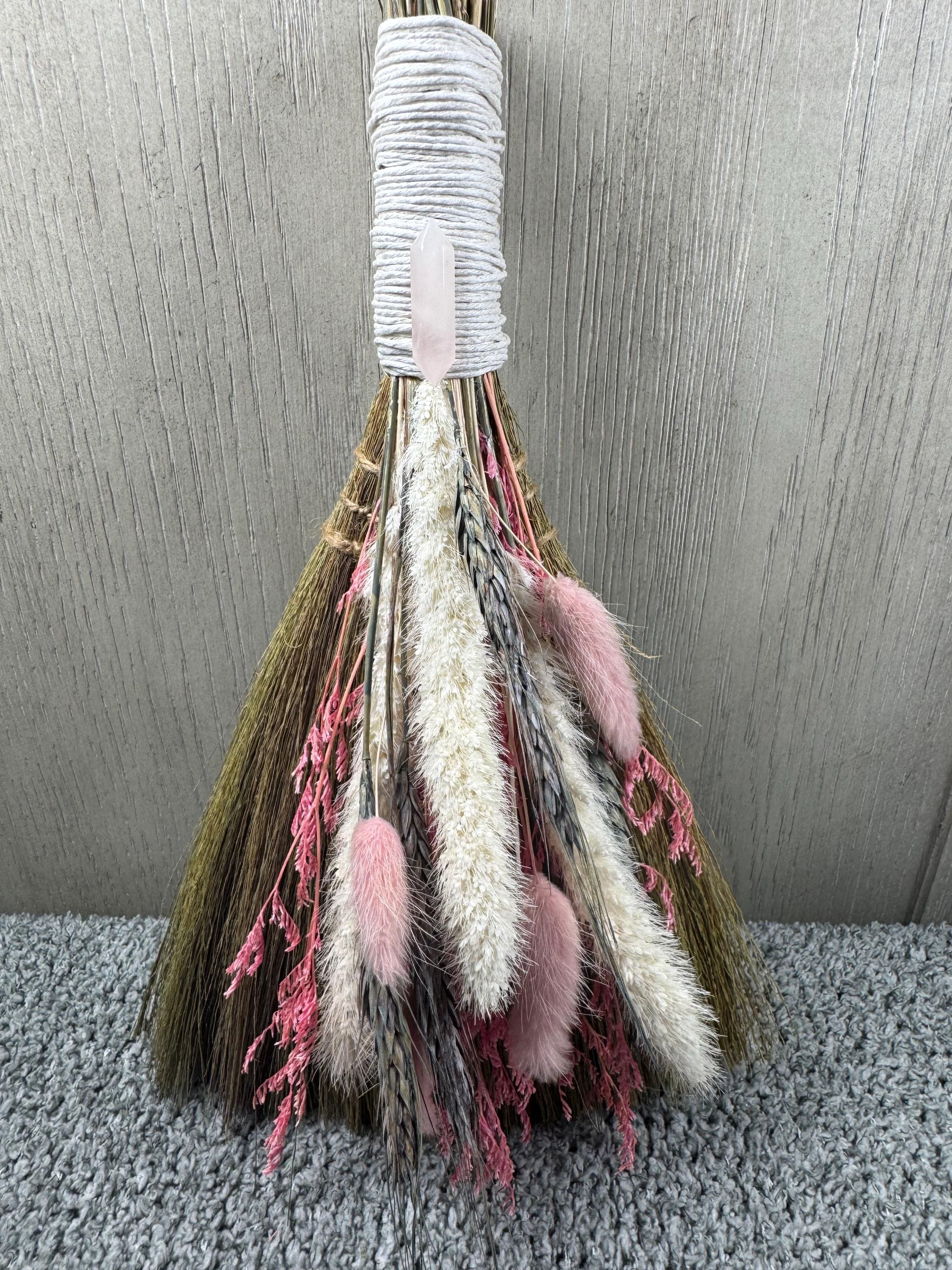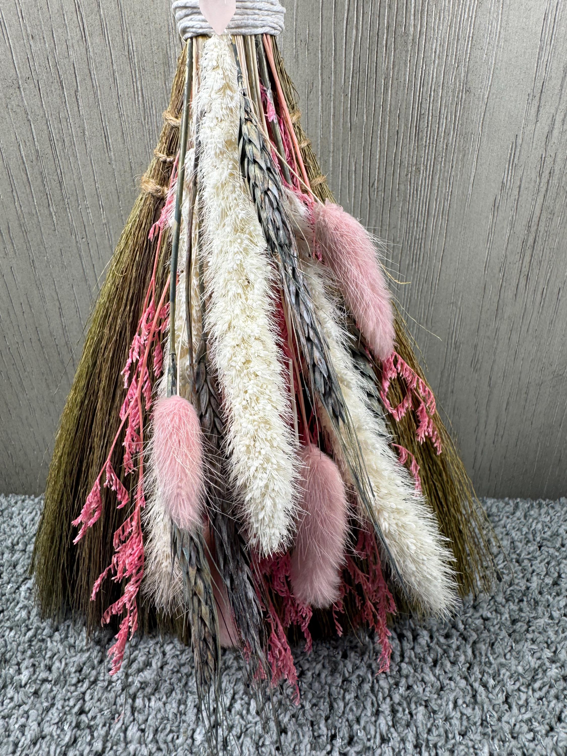 Brooms and besoms are used for protection, to ward off evil spirits, and cleansing of ritual spaces. Usually help a few inches above the floor, a special broom is used to cleanse a space of negative energies or "energetic clutter" before creating a ritual or magic circle. Made with real dried preserved flowers, Pink Quartz Crystal, and wrapped with hemp. One of a kind! Blessed Be!