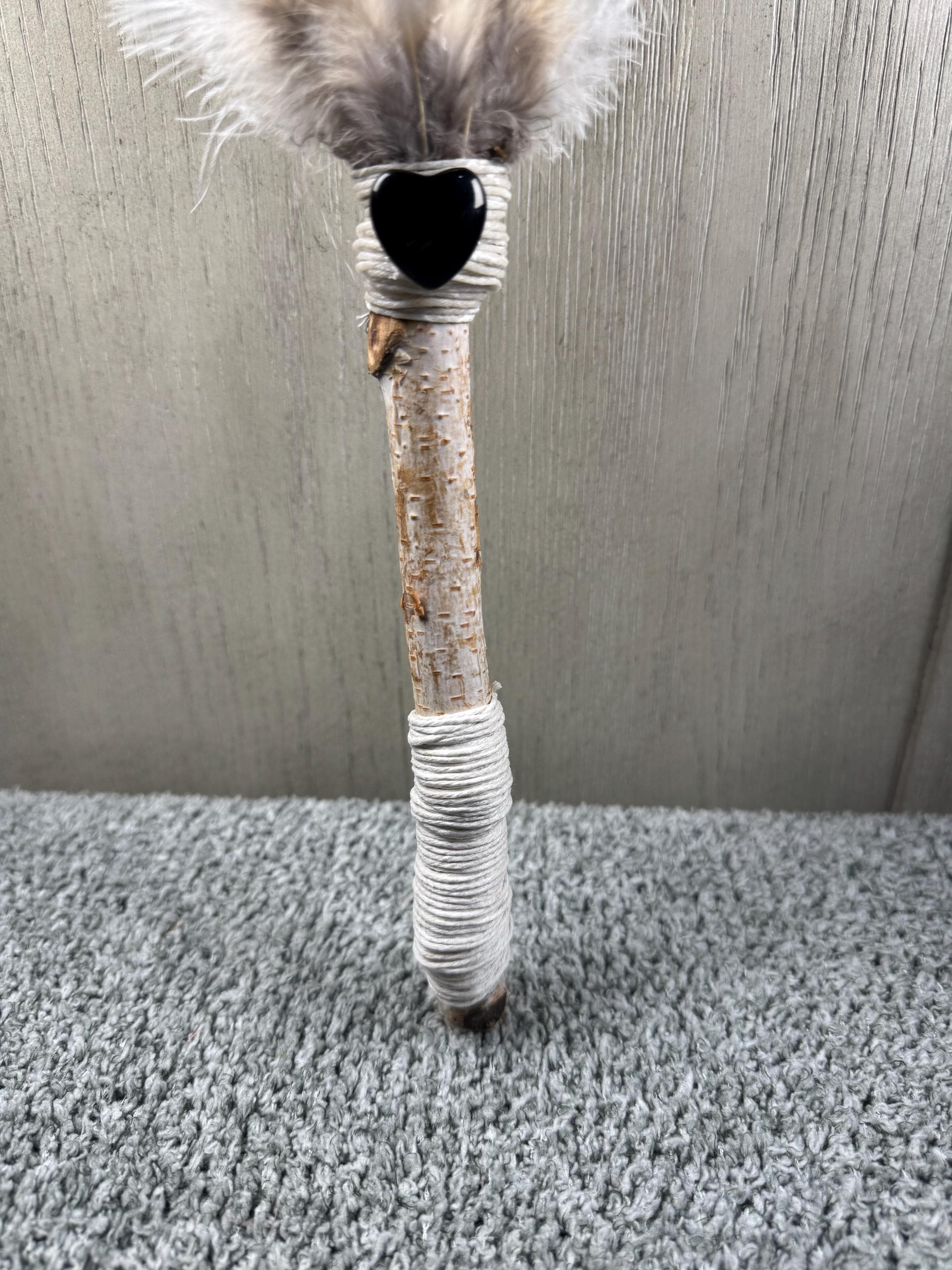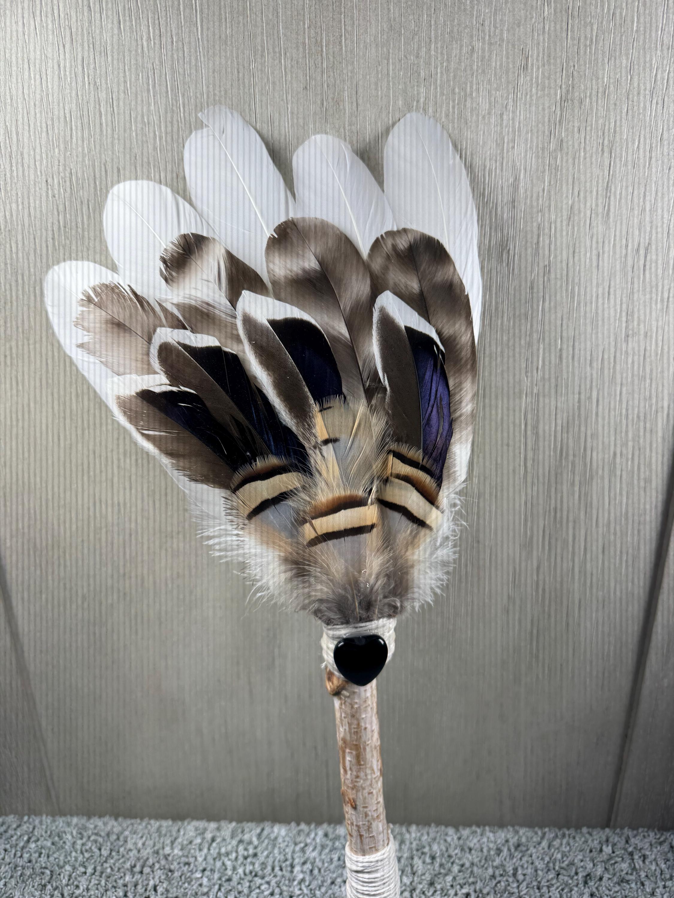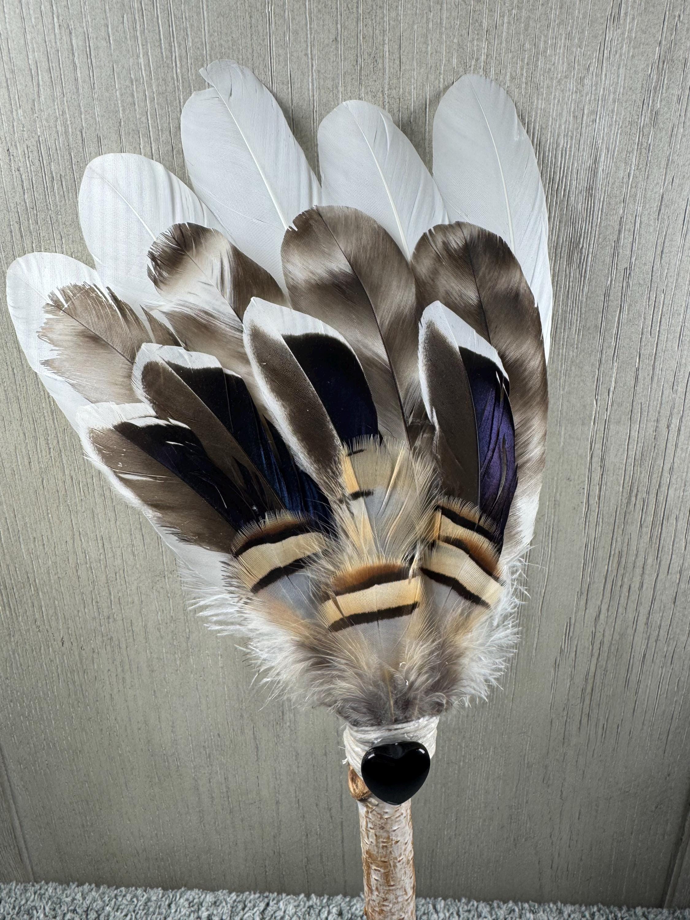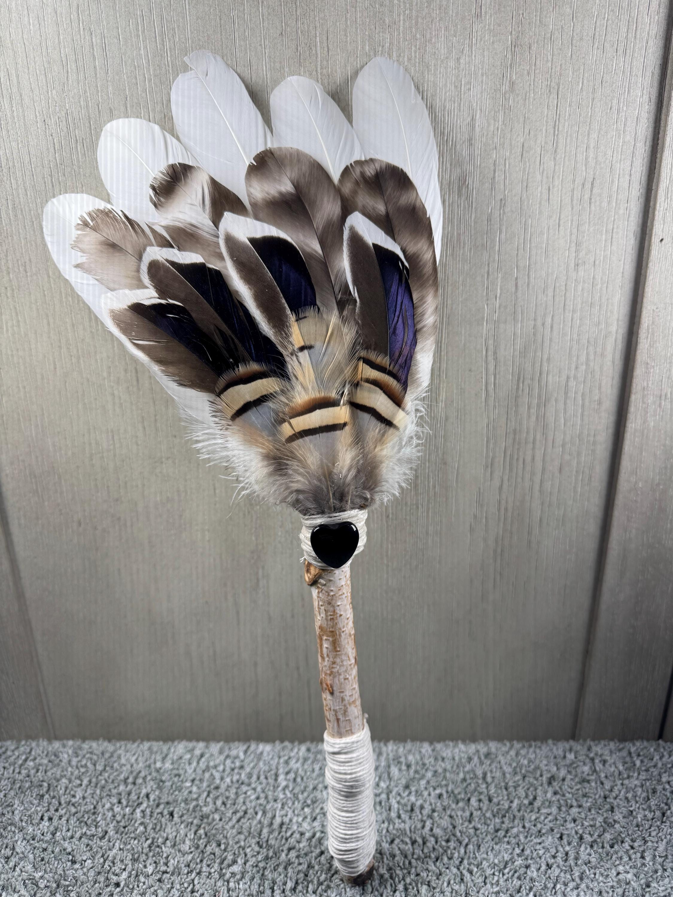 15" Smudging Feather Fan/Ceremonial. Made with 3 Different types of feathers, Birch Wood Handle, and has a Black Obsidian Crystal in a heart shape, the feathers are not plucked they are harvested FALLEN feathers, handle and top where feathers are attached are wrapped with Hemp. The ritual feather fan is used to smudge spaces with Palo Santo, Sage and other incenses. When smudging, use the feather fan to softly direct the smoke to the desired direction. Keep it in a sacred place like an altar. Blessed Be!