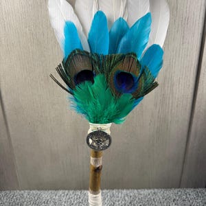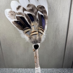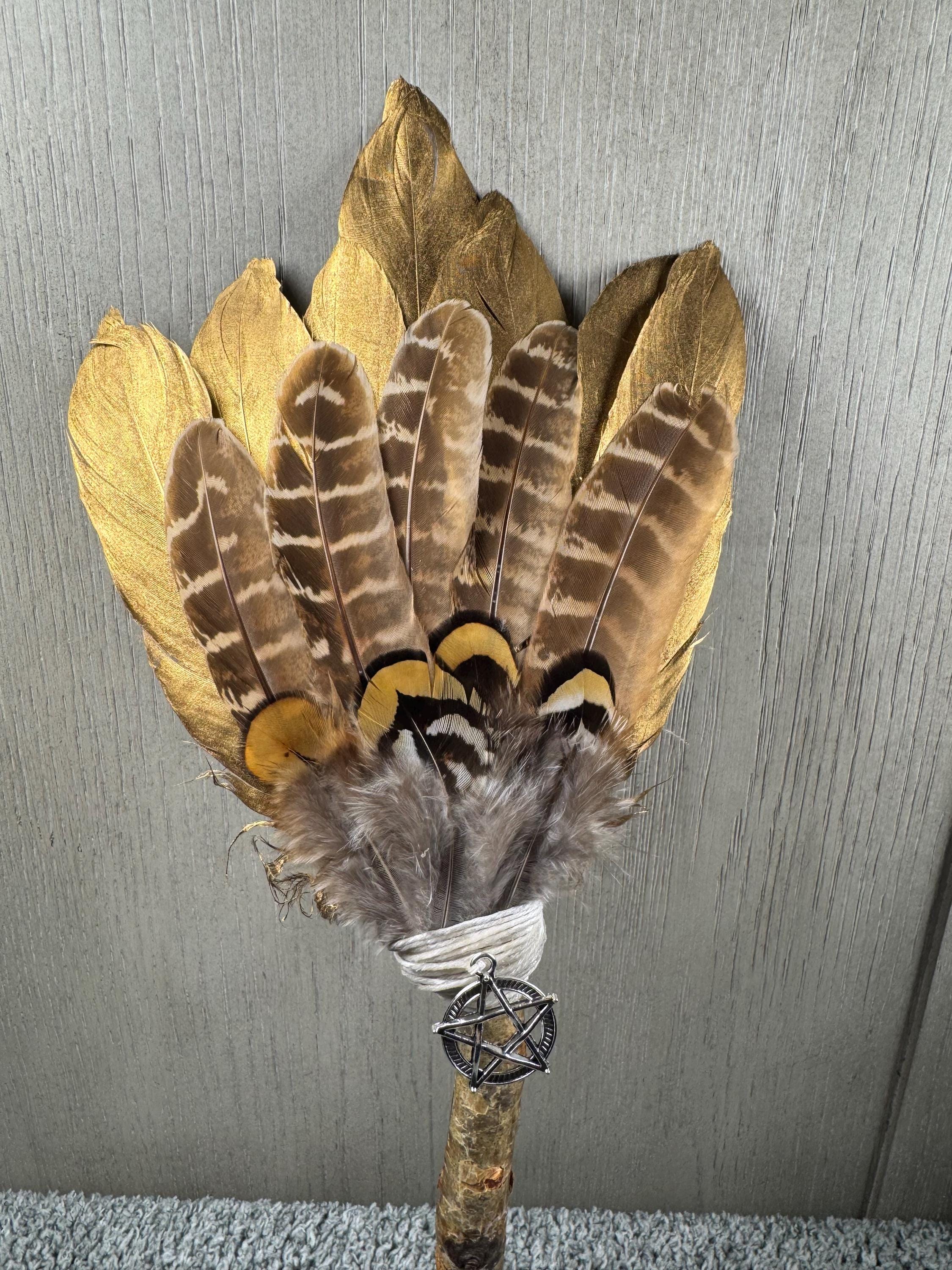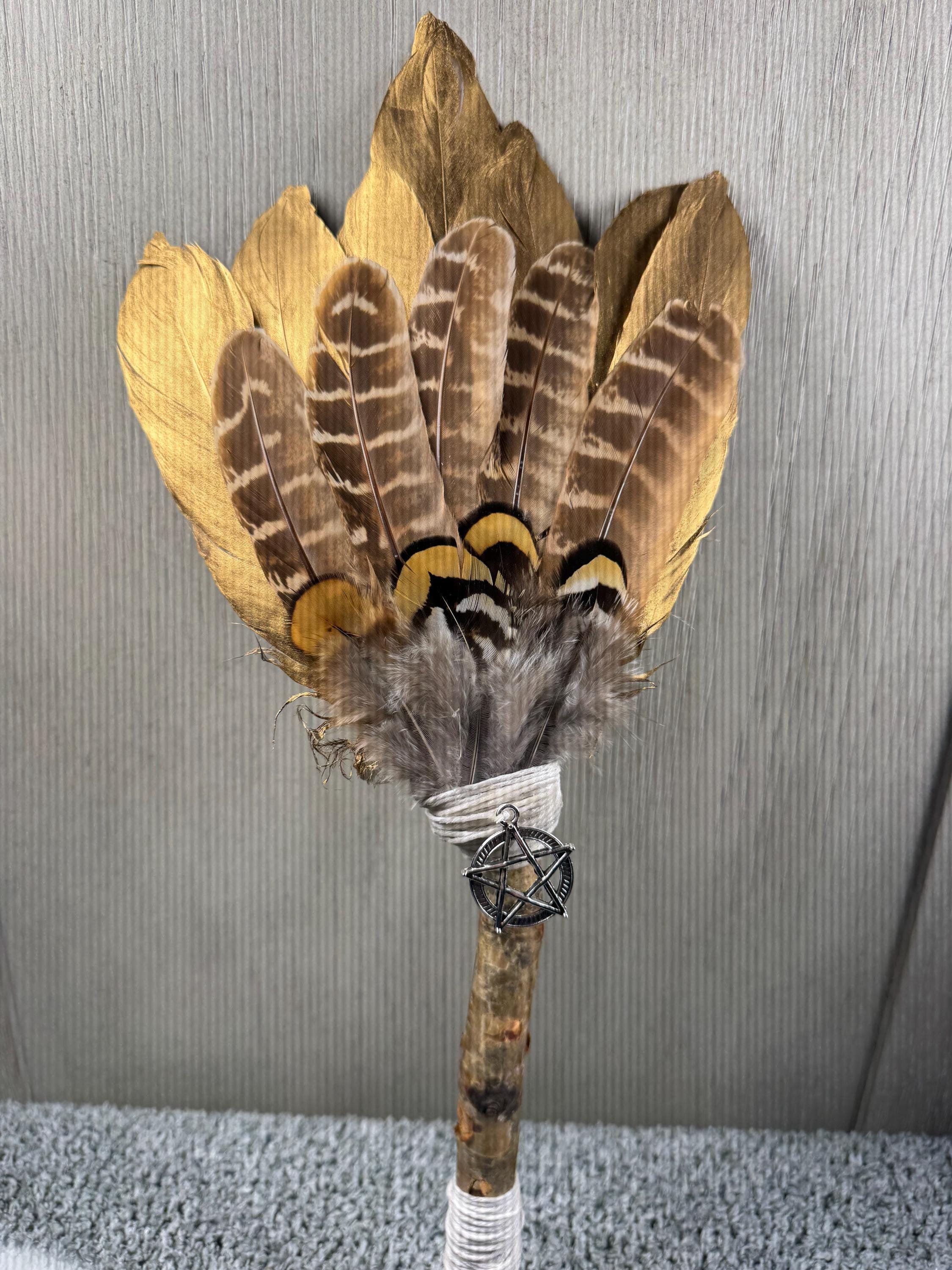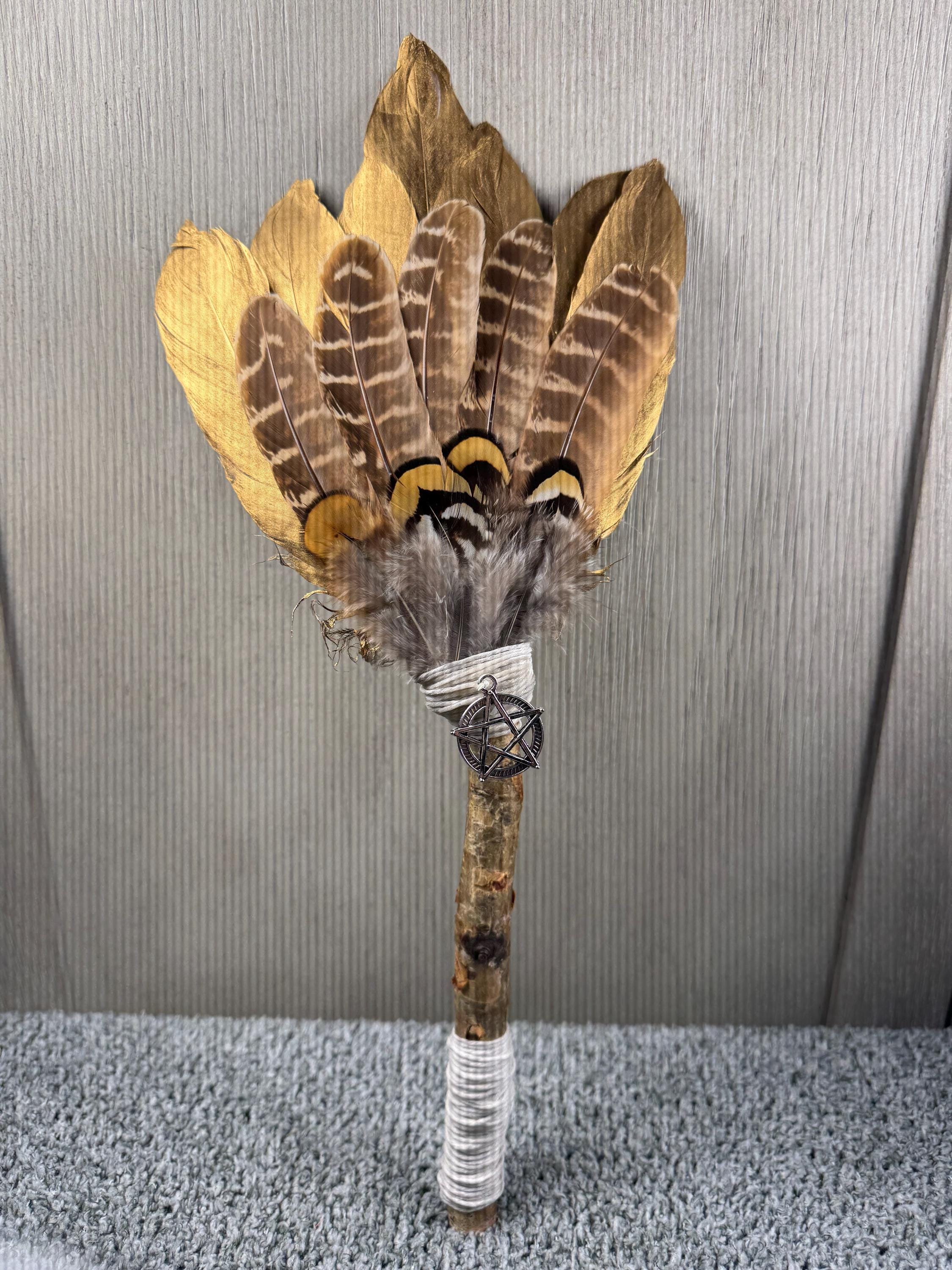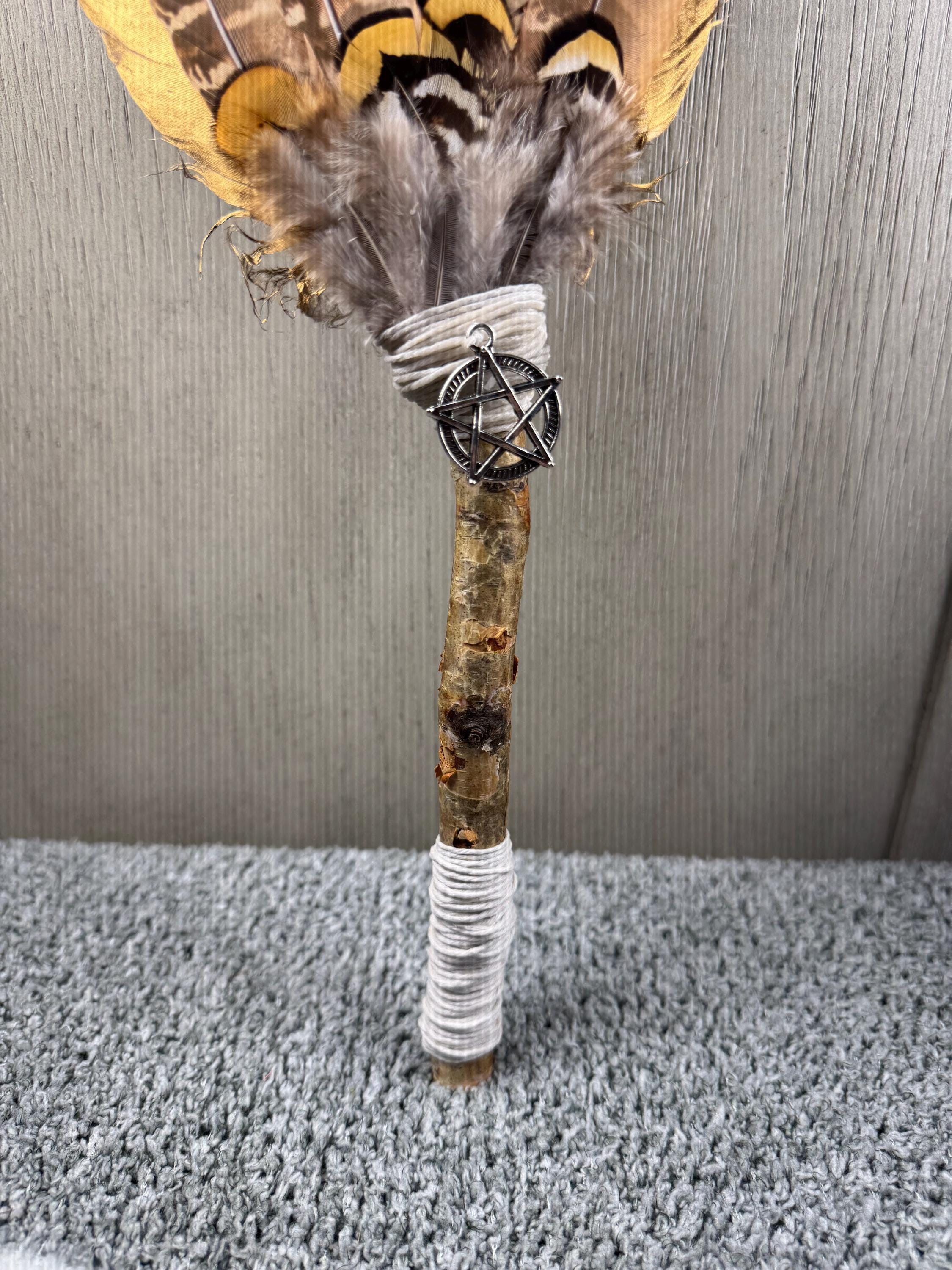 12" Smudging Feather Fan/Ceremonial. Made with 3 Different types of feathers, Birch Wood Handle, and Pentagram Charm, the feathers are not plucked they are harvested FALLEN feathers, handle and top where feathers are attached are wrapped with Hemp. The ritual feather fan is used to smudge spaces with Palo Santo, Sage and other incenses. When smudging, use the feather fan to softly direct the smoke to the desired direction. Keep it in a sacred place like an altar. Blessed Be!