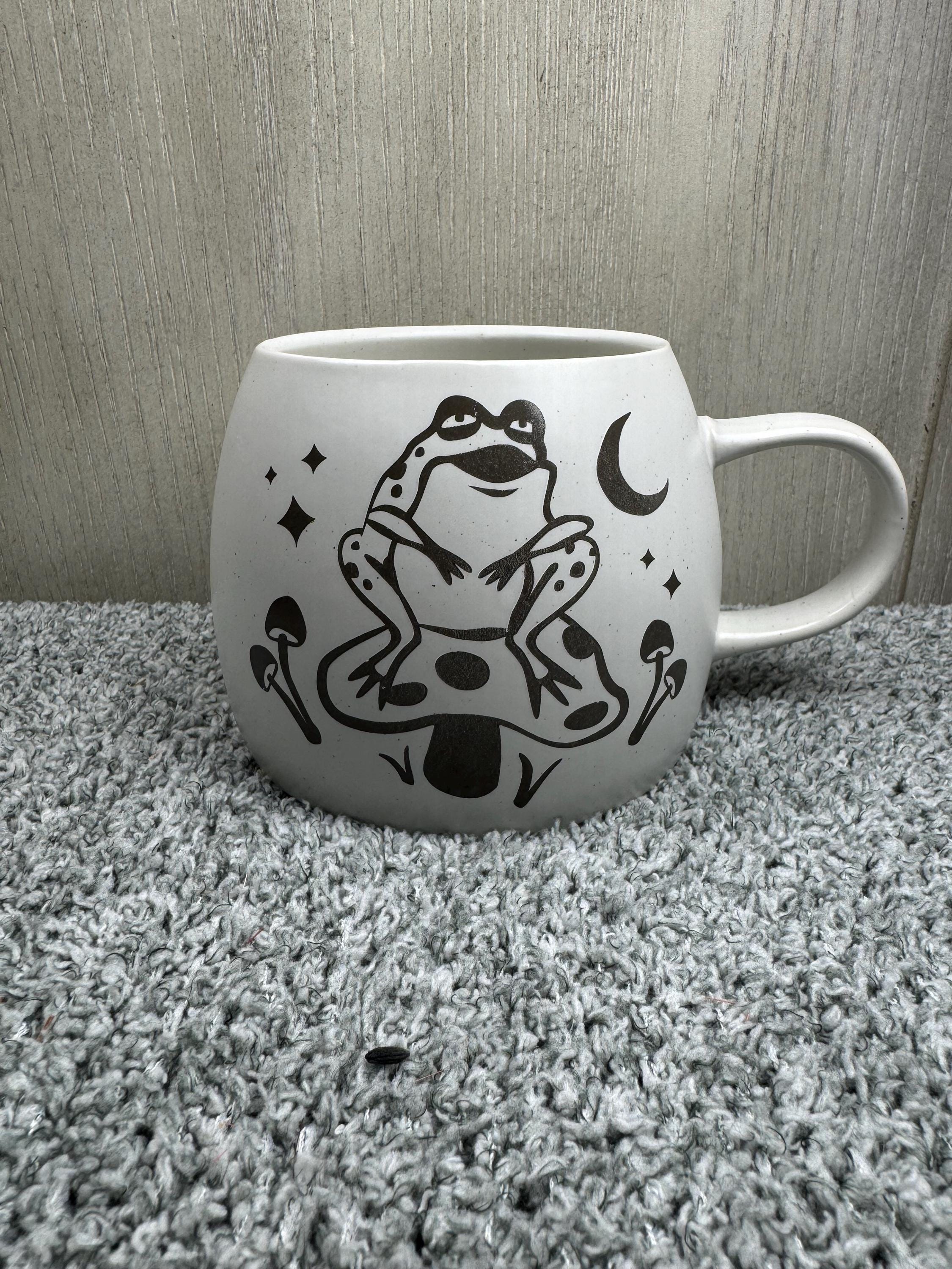 12oz Ceramic Frog Mushroom Mug. White Mug with Army Green Frog & Mushroom on both sides of mug. Great for coffee or tea!