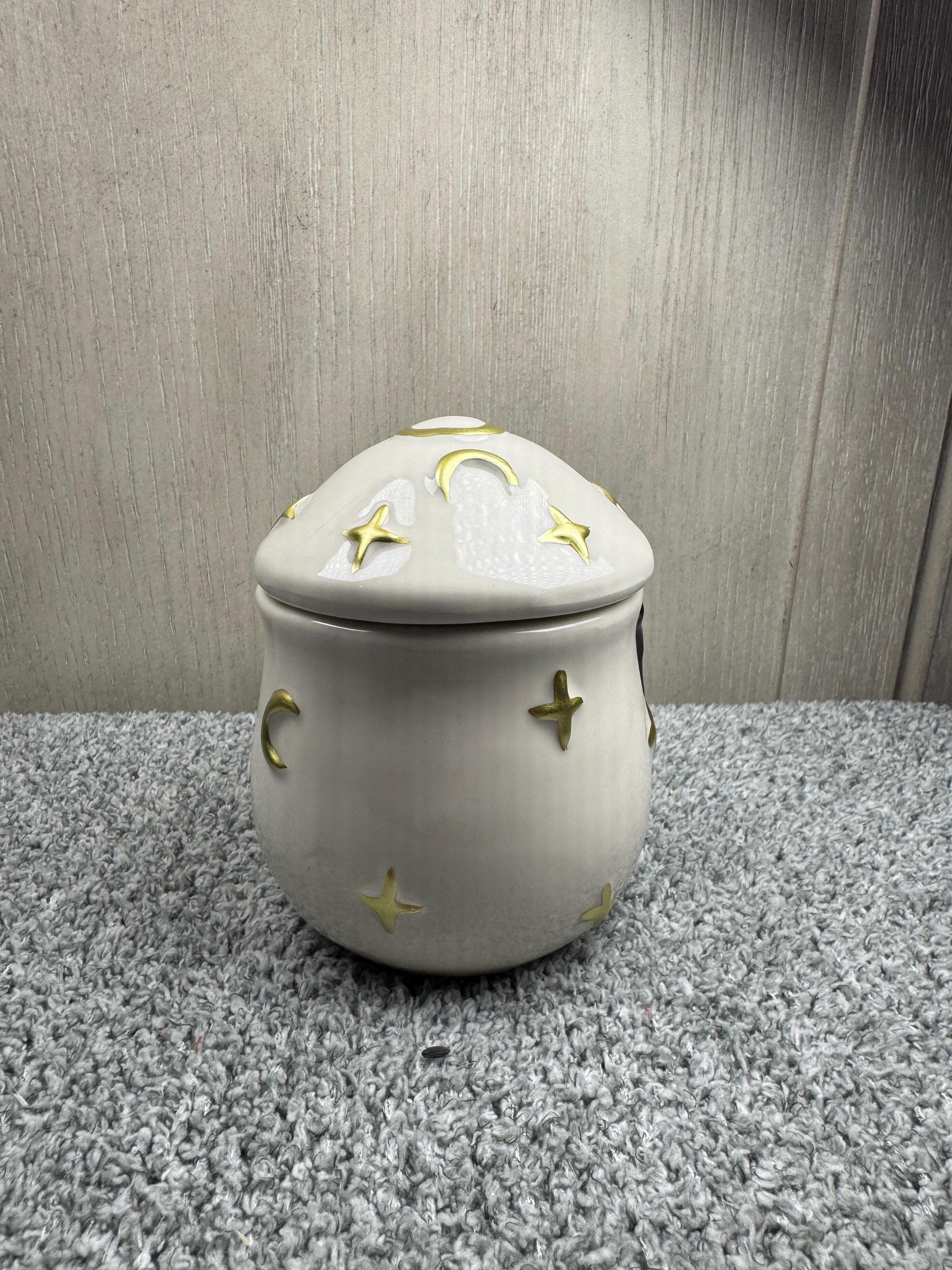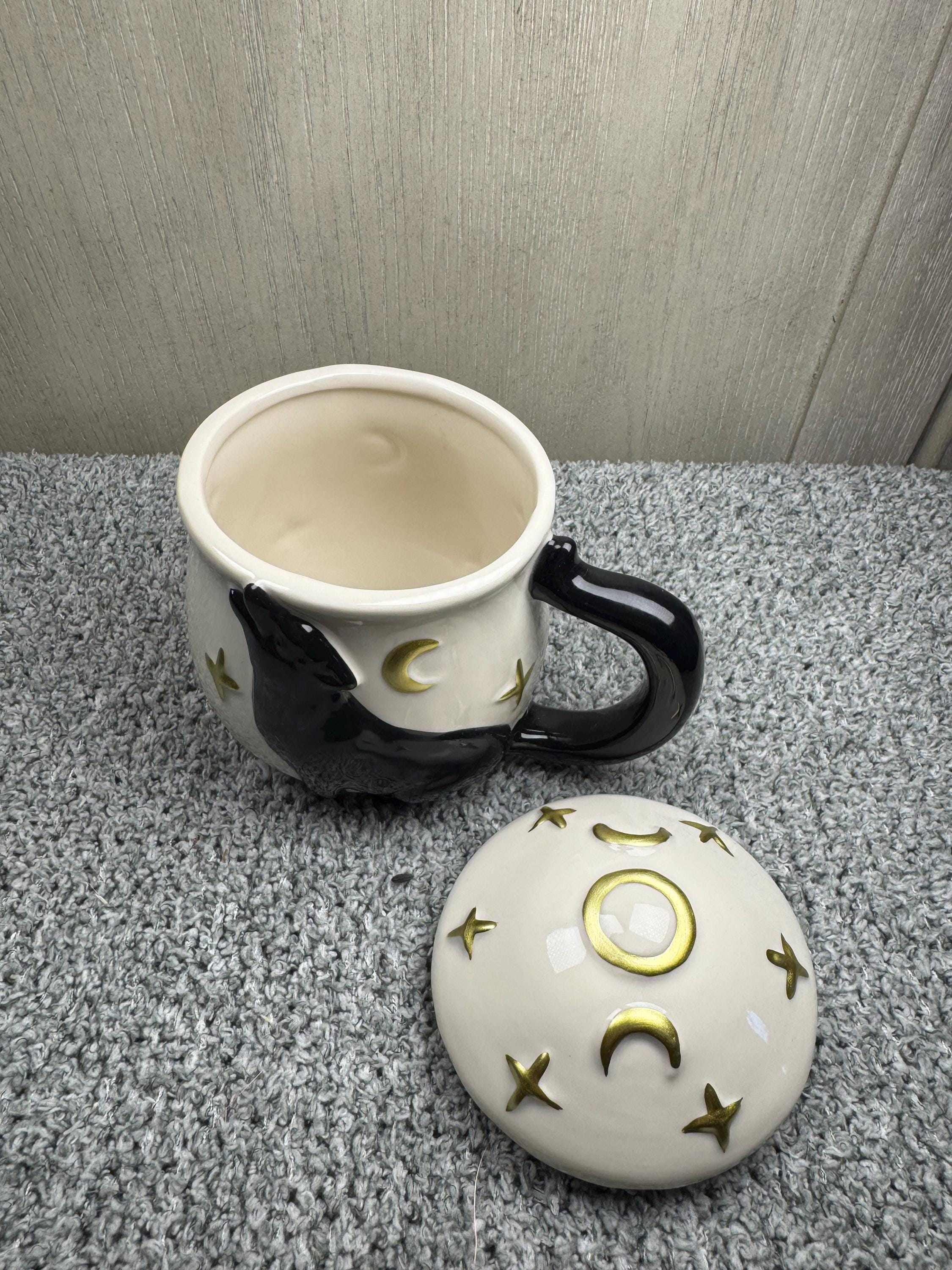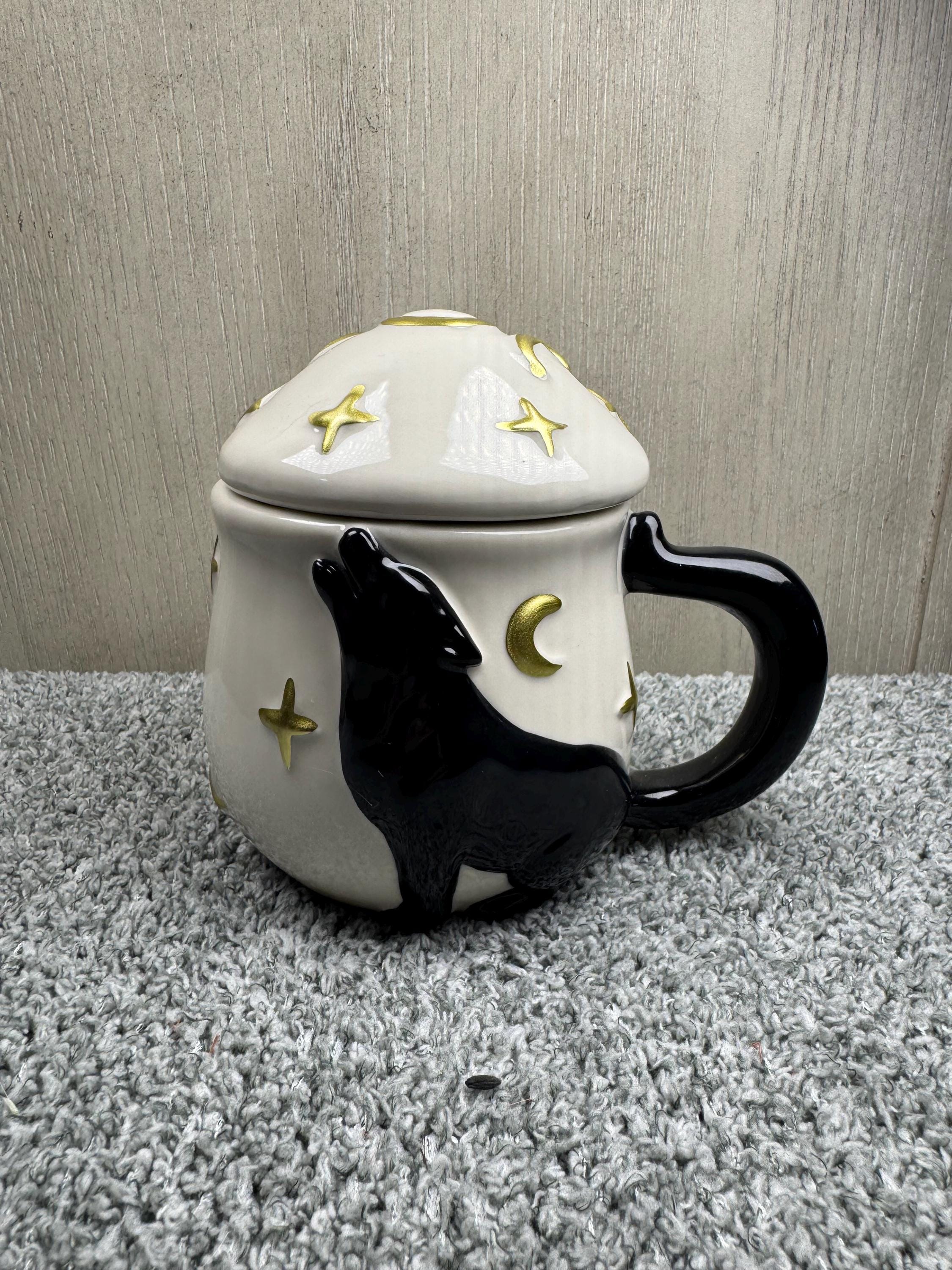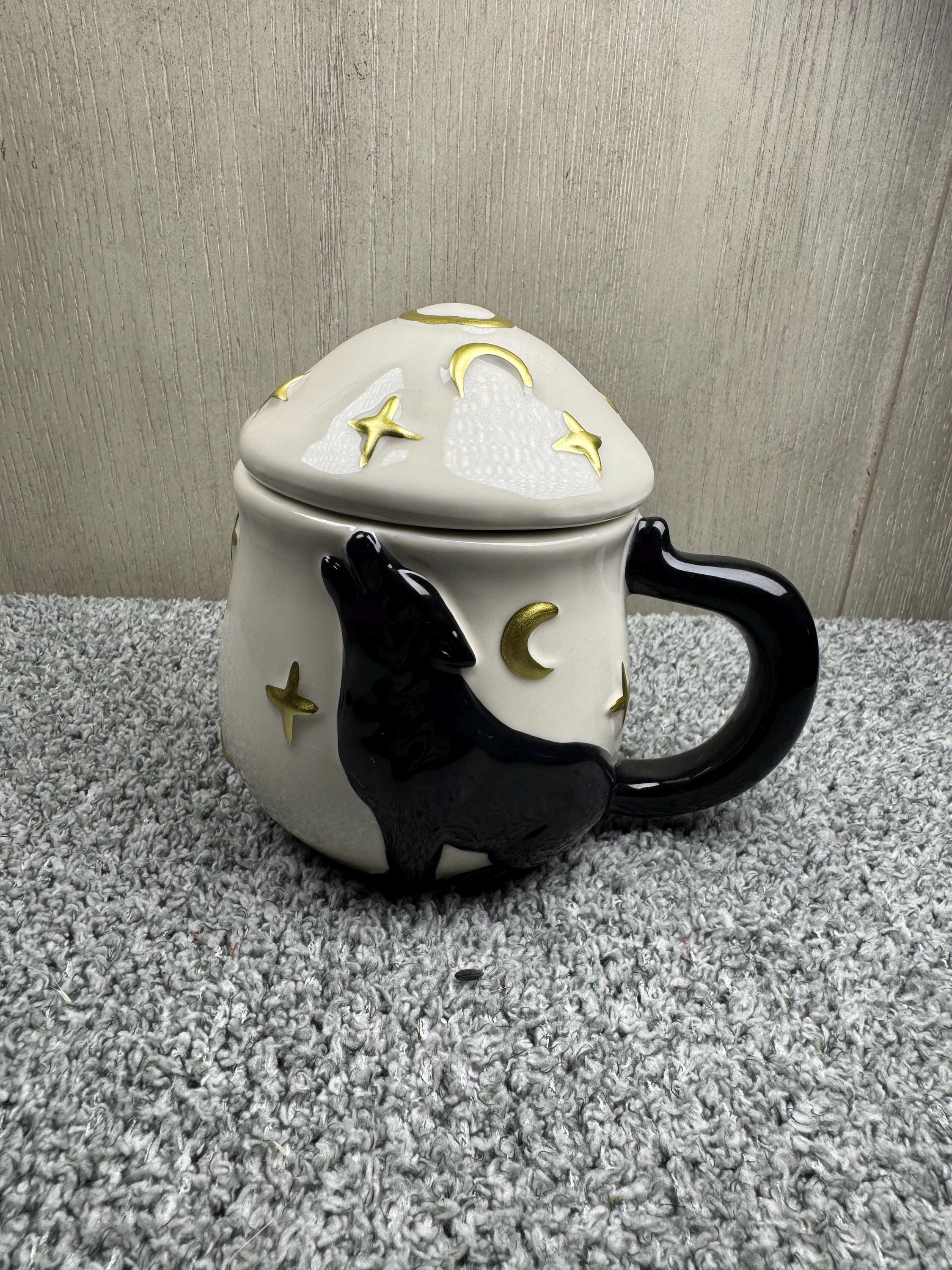 12oz Black & White Ceramic Wolf & Moon Mug. Dishwasher & Microwave safe. Great to simmer tea in with top on.